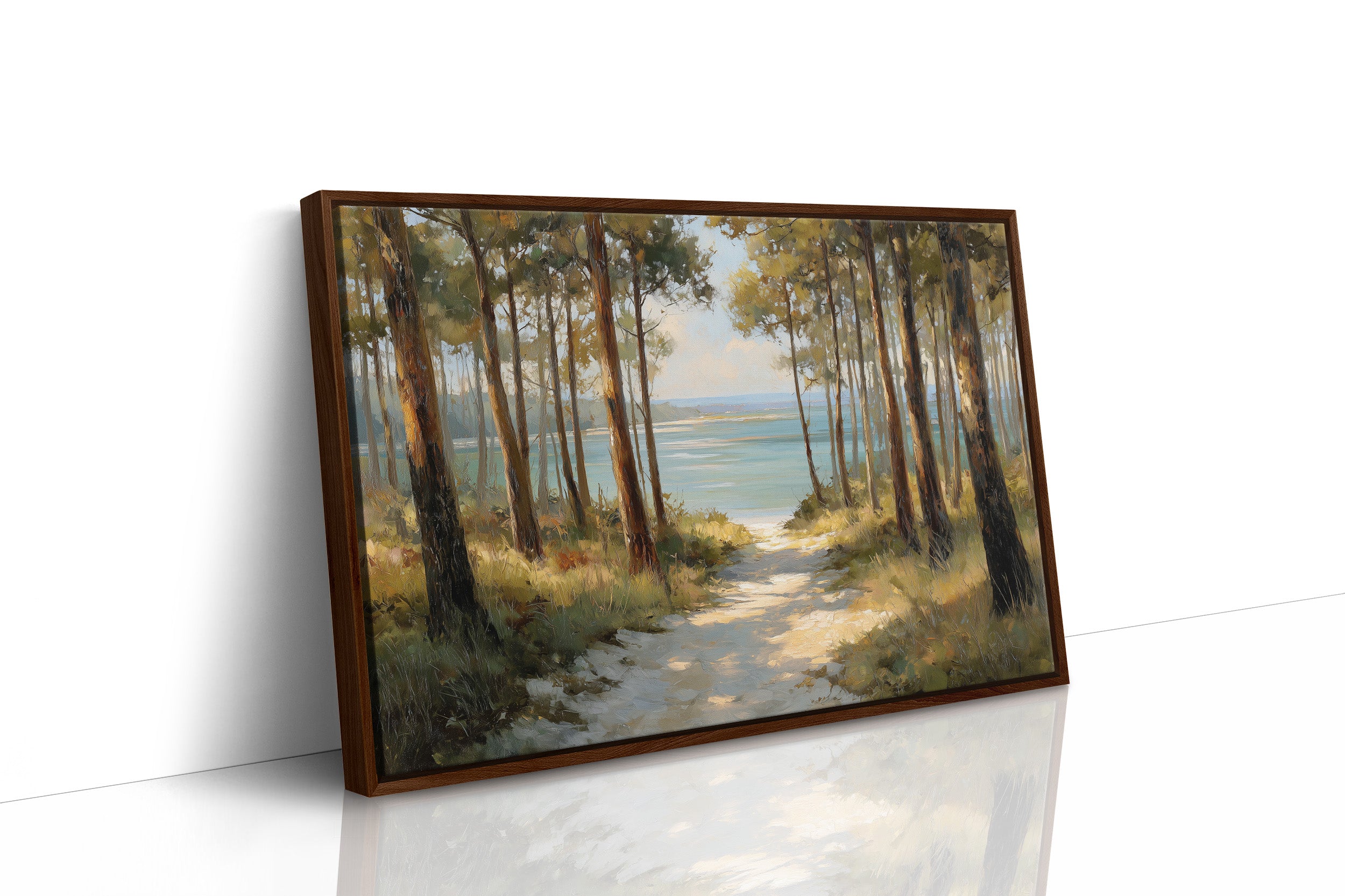 Sunlight filters through tall pines, casting dappled gold along a sandy path that beckons toward azure waters beyond. The forest stands as gentle sentinels, their amber-touched trunks creating natural corridors that frame the tranquil bay waiting in the distance. The painting captures that perfect balance between shelter and openness, where woodland meets shoreline in a harmonious transition. This serene coastal landscape brings a sense of escape to living rooms and sitting areas where moments of reflection are cherished.
