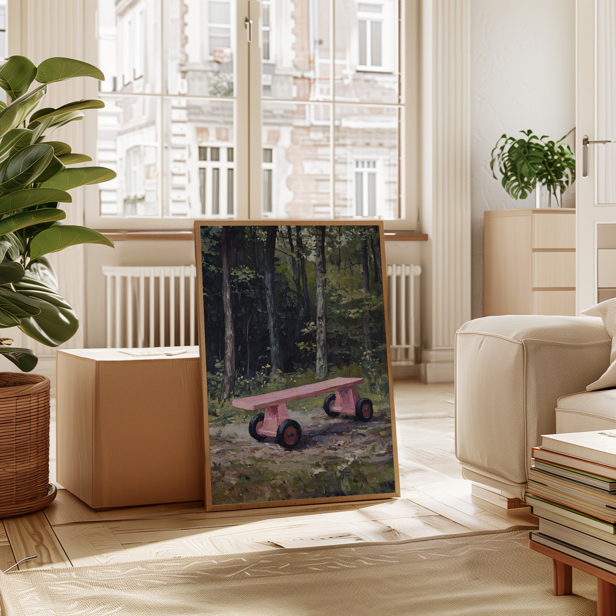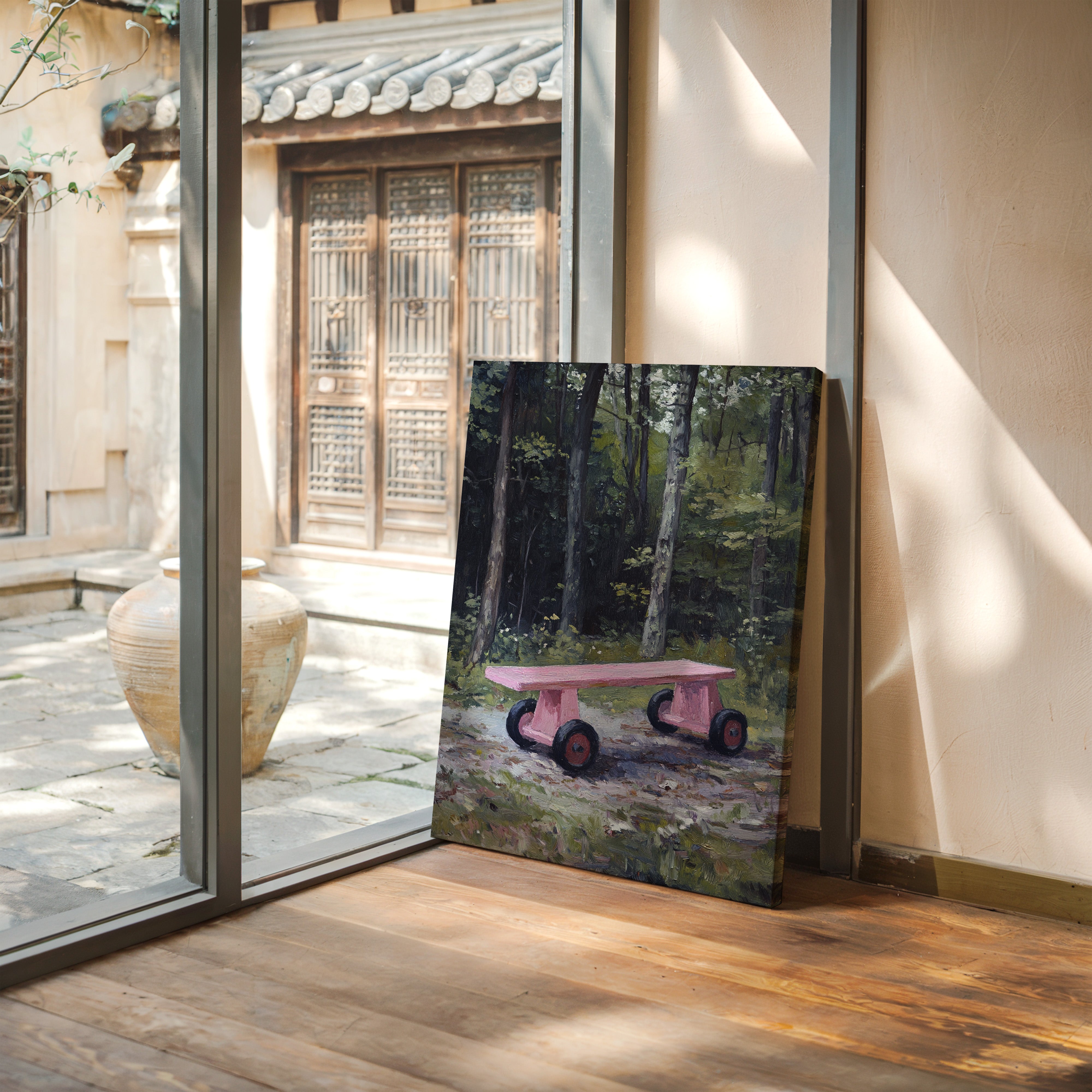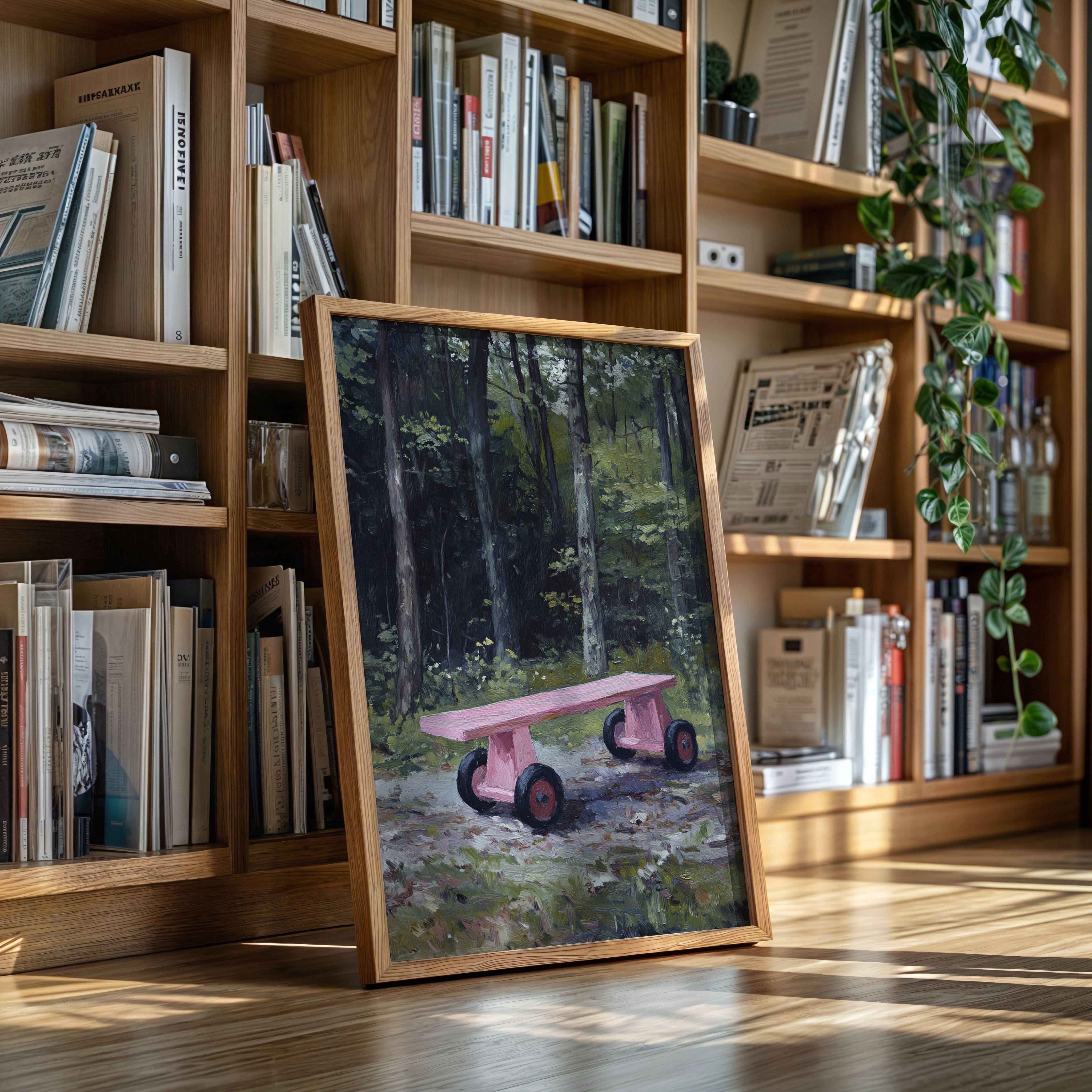 A whimsical pink rolling bench stands as a cheerful surprise against the deep forest backdrop. The playful contrast between the bench's bubblegum hue and the moody emerald woods creates an enchanting narrative of childhood memories meeting wilderness. Thick tree trunks rise like silent guardians while dappled sunlight filters through the canopy, casting gentle shadows on the forest floor. This contemporary piece brings a touch of joy and nostalgia to modern interiors, perfect for spaces that celebrate the intersection of playful design and natural elements.