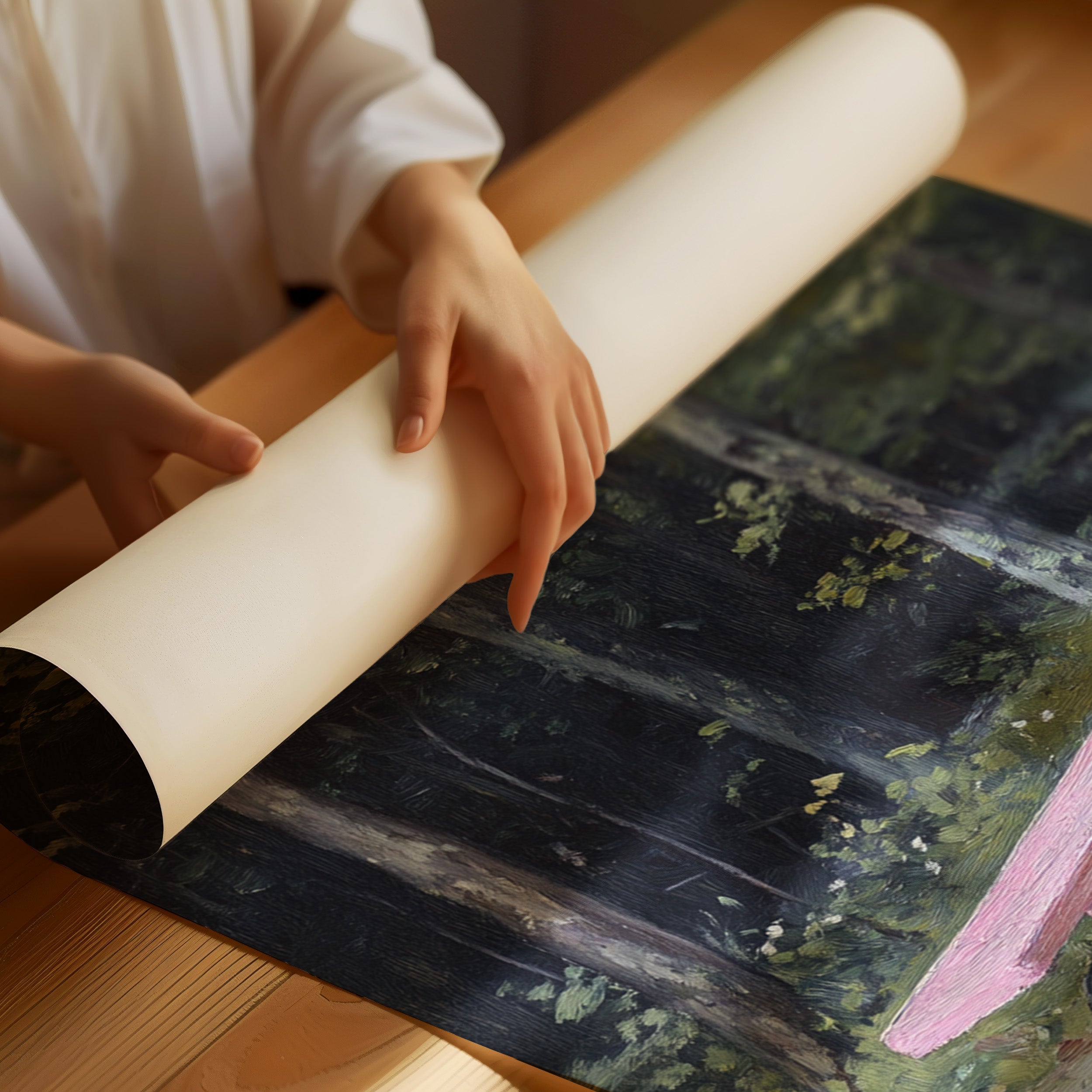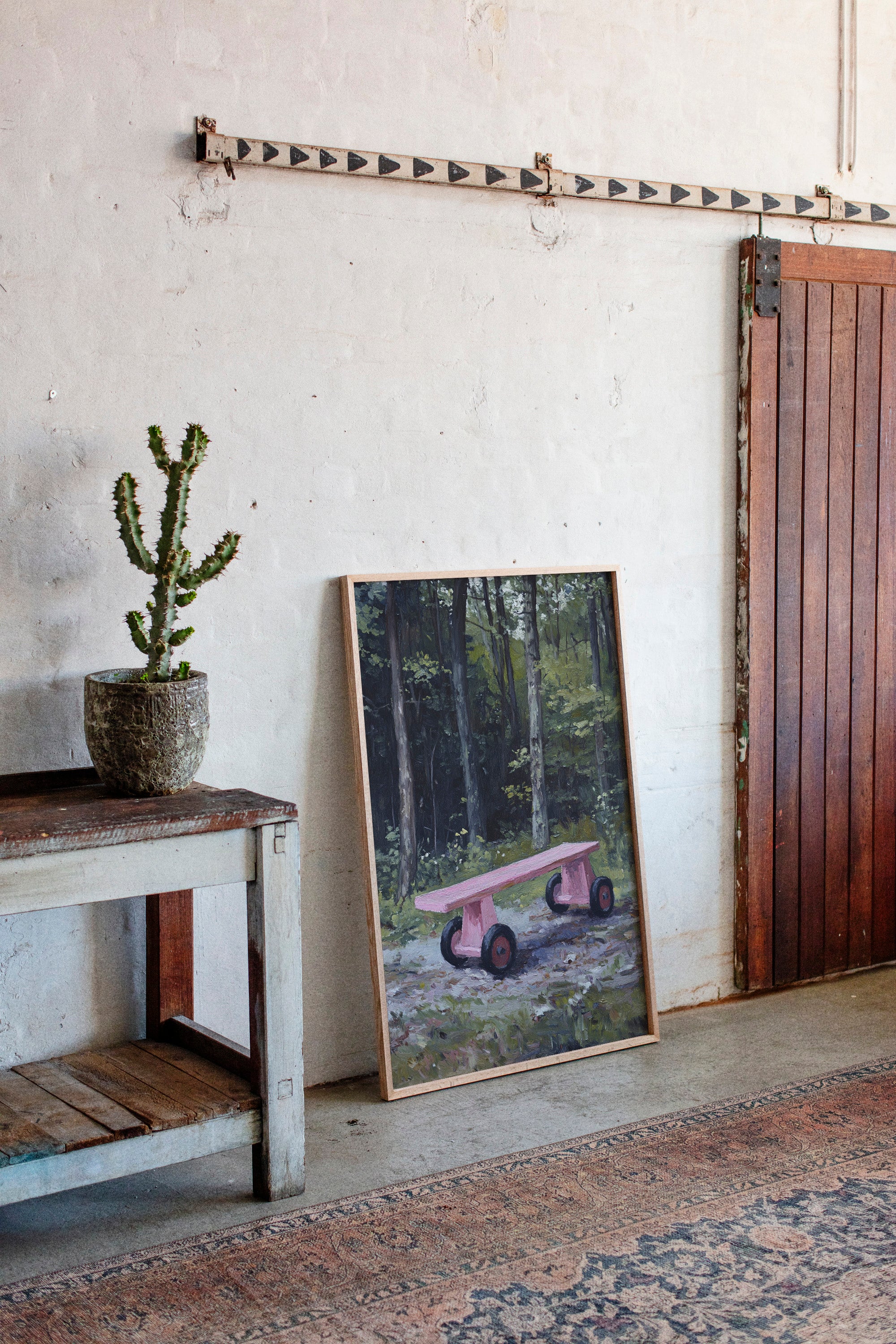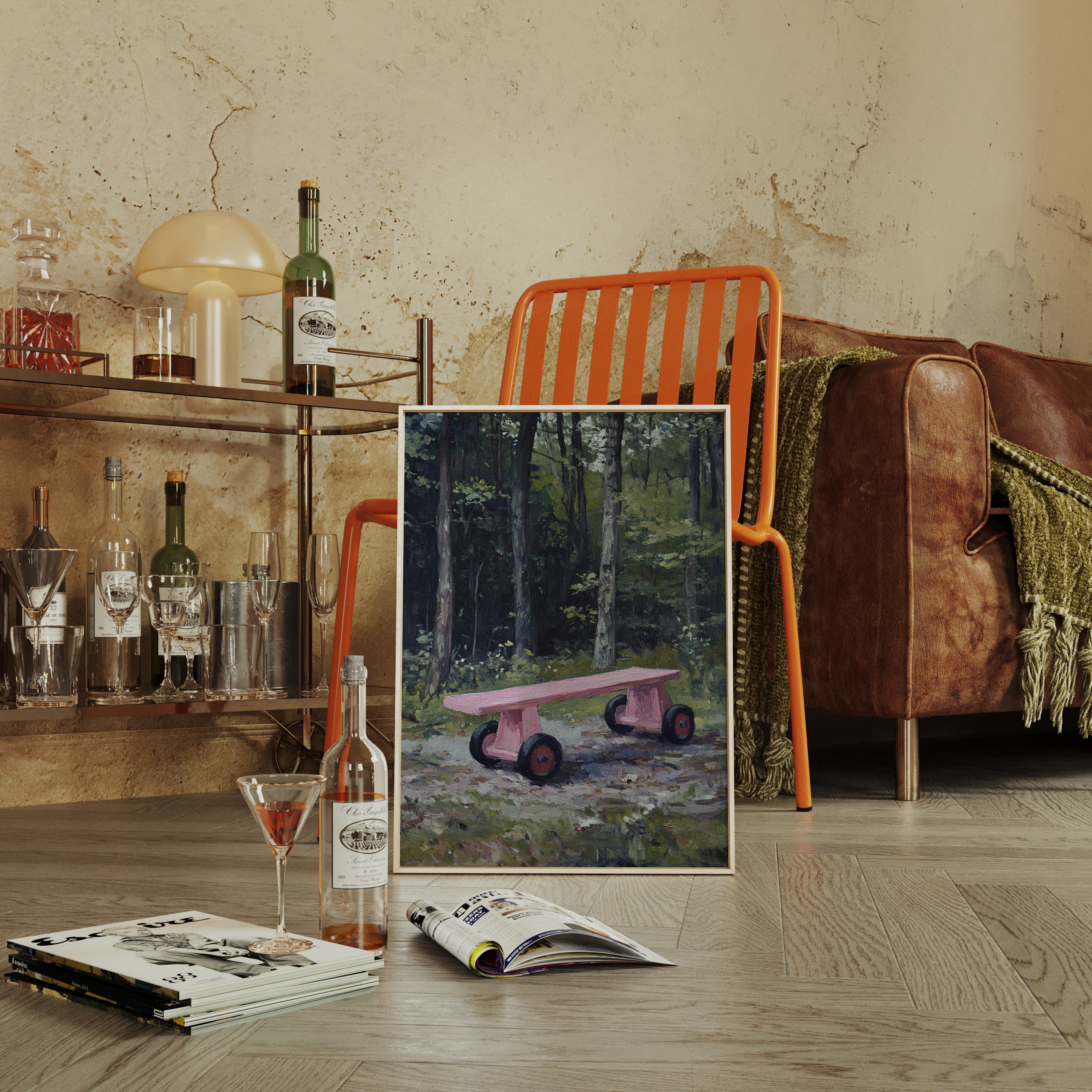 A whimsical pink rolling bench stands as a cheerful surprise against the deep forest backdrop. The playful contrast between the bench's bubblegum hue and the moody emerald woods creates an enchanting narrative of childhood memories meeting wilderness. Thick tree trunks rise like silent guardians while dappled sunlight filters through the canopy, casting gentle shadows on the forest floor. This contemporary piece brings a touch of joy and nostalgia to modern interiors, perfect for spaces that celebrate the intersection of playful design and natural elements.