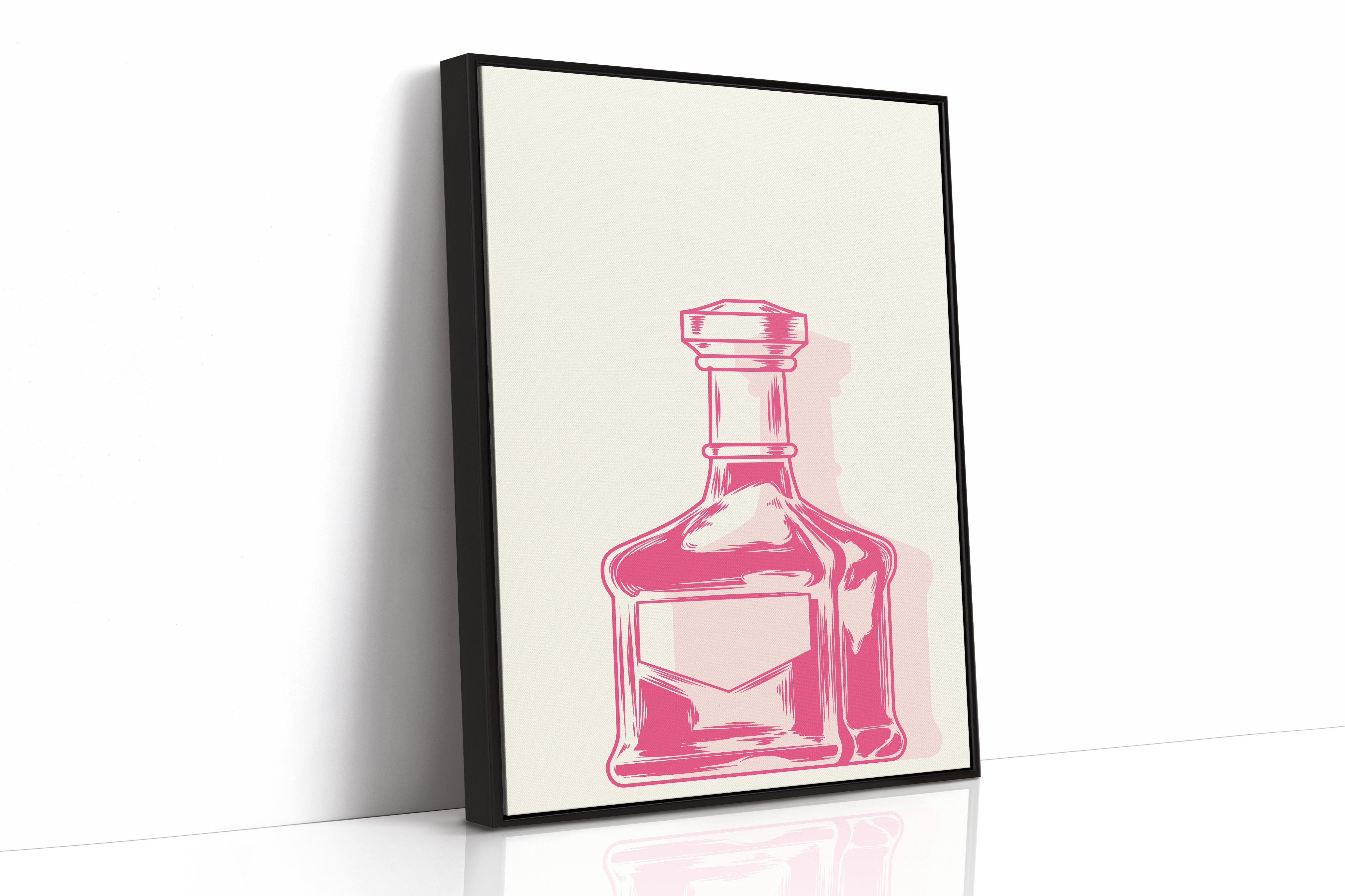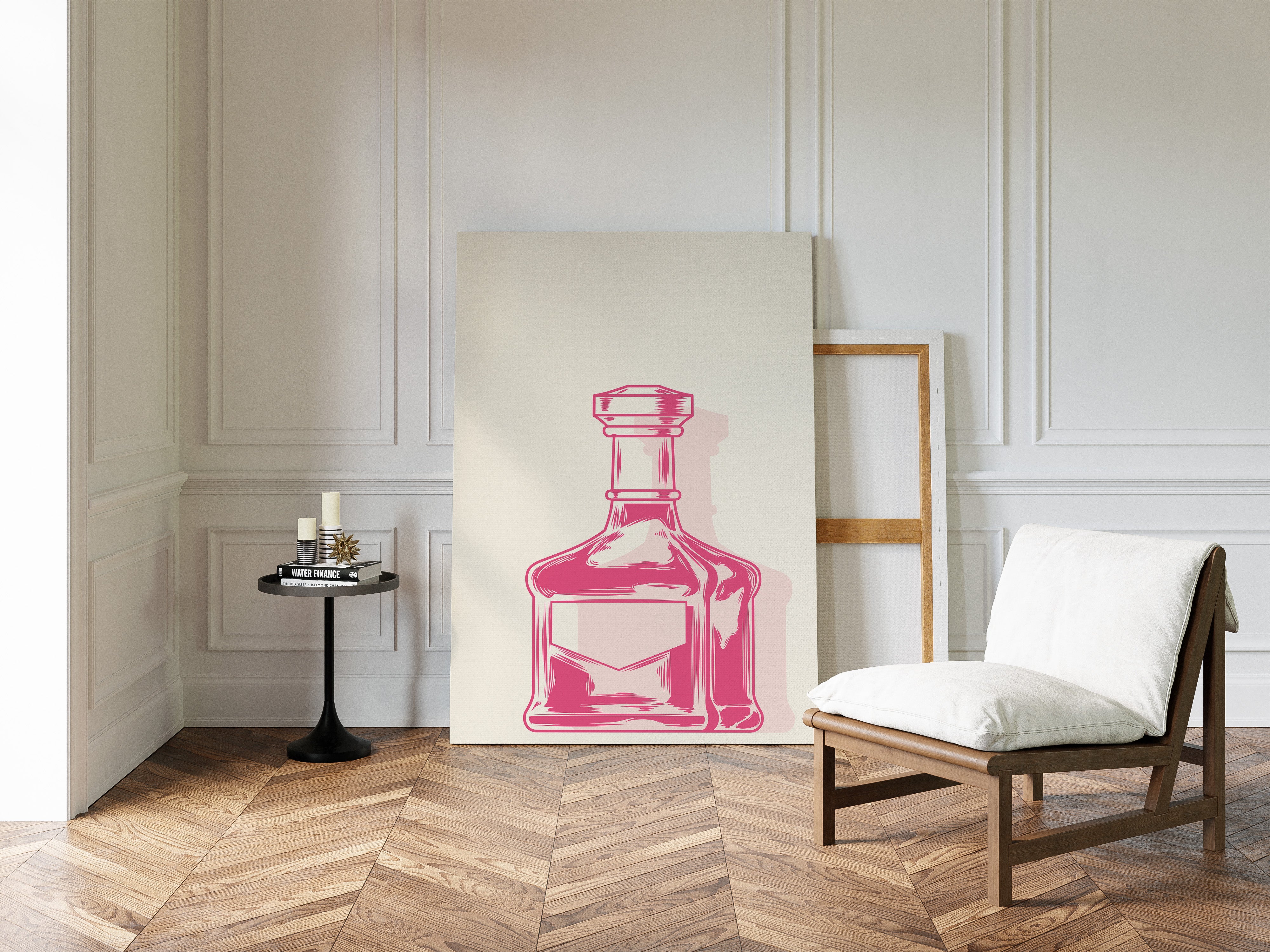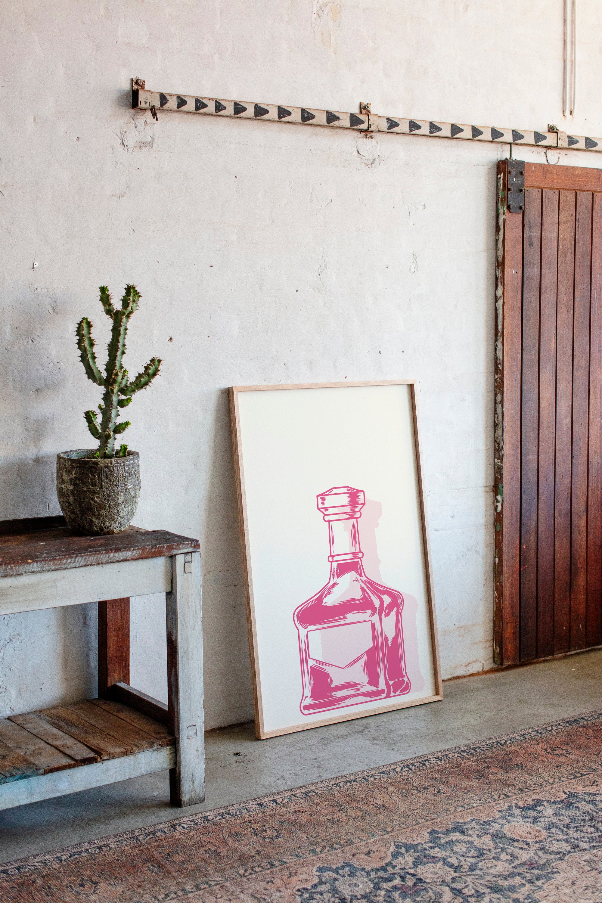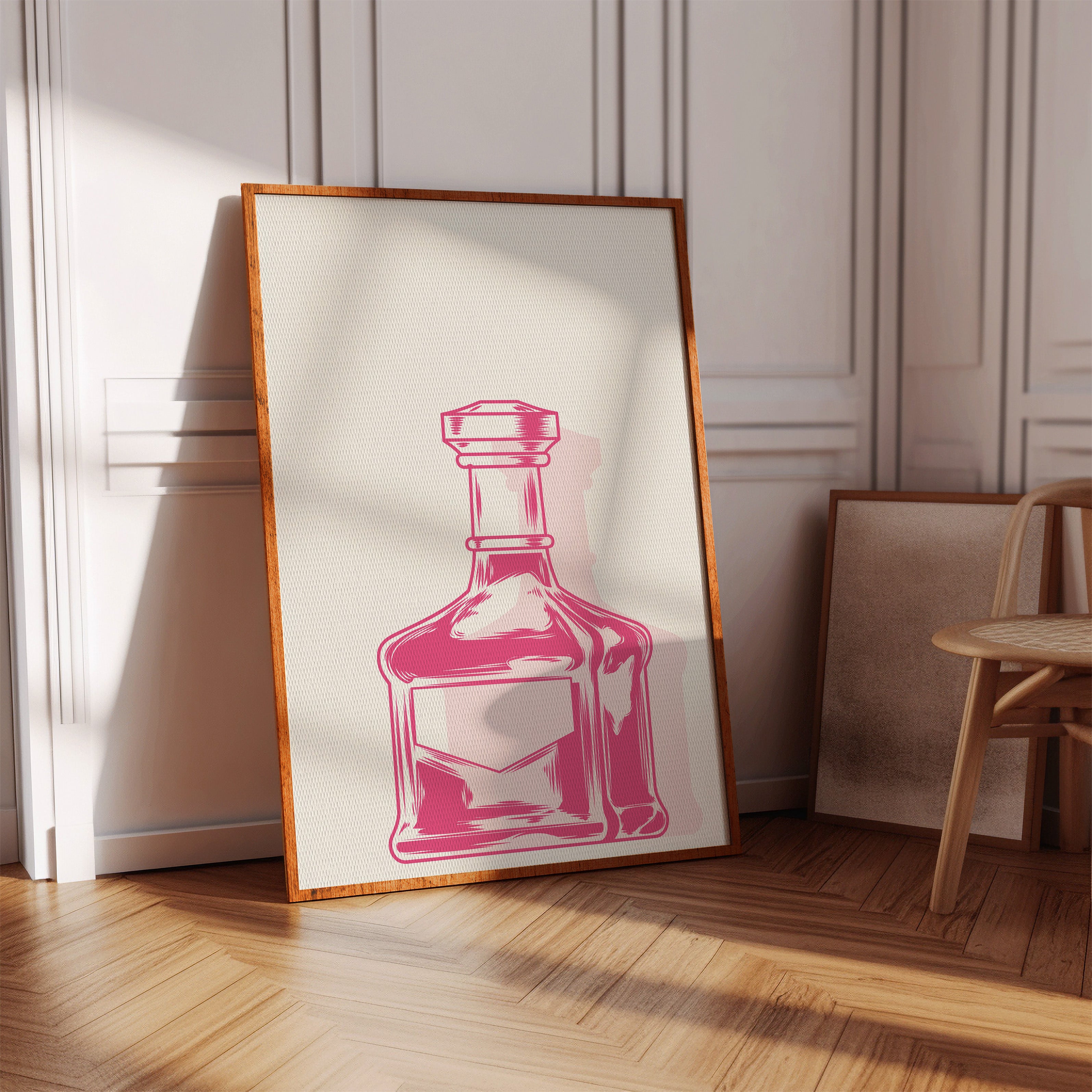 A delicate glass decanter catches light like spun sugar, its rosy silhouette casting gentle shadows against cream-colored walls. This piece from the Contemporary collection marries classic form with modern pop art sensibility. The bold pink hue transforms a traditional liquor bottle into an artful statement, while clean lines and careful shading create an almost architectural presence. Perfect for adding a sophisticated yet playful touch to a home bar area or dining room. The piece invites conversation while elevating any space with its refined whimsy.