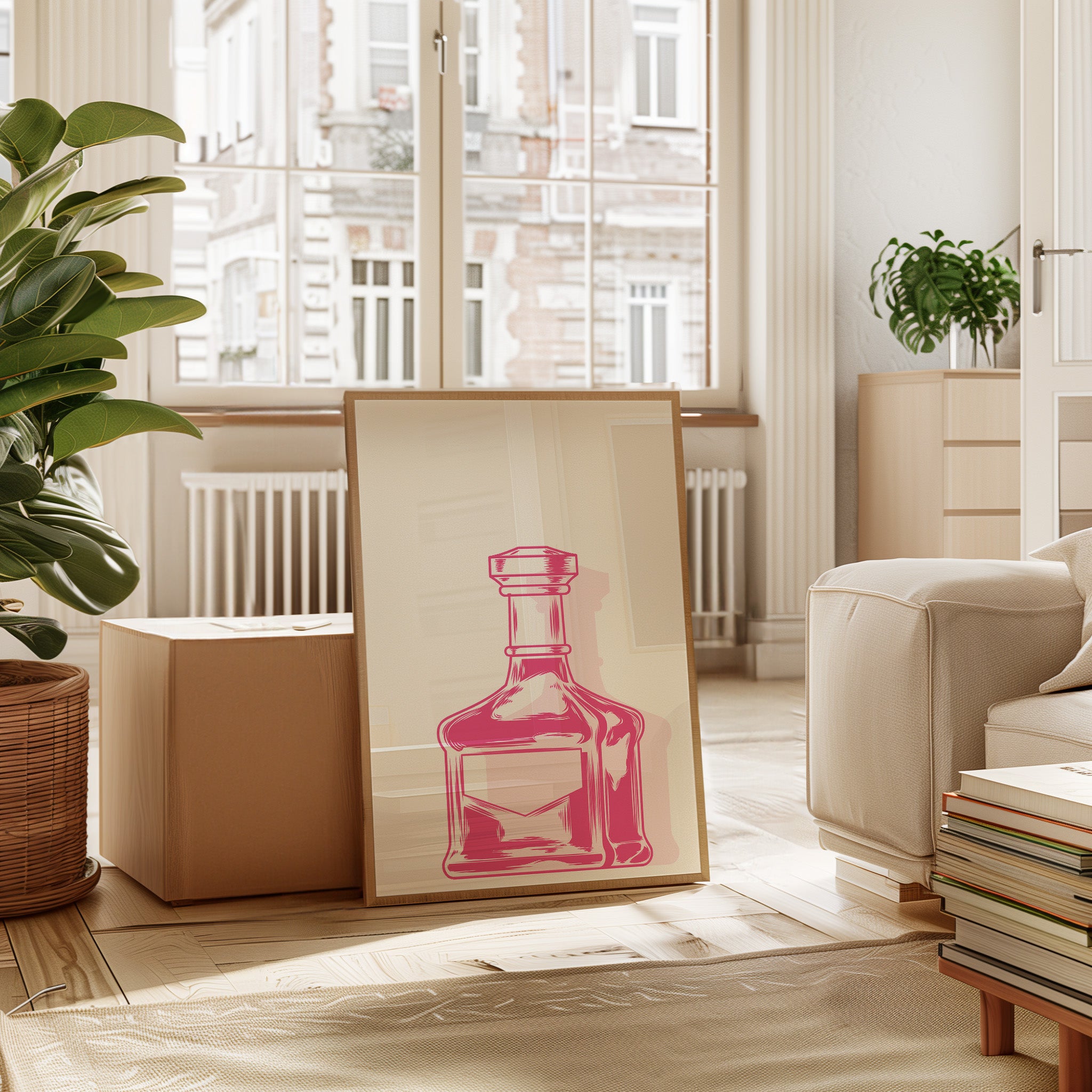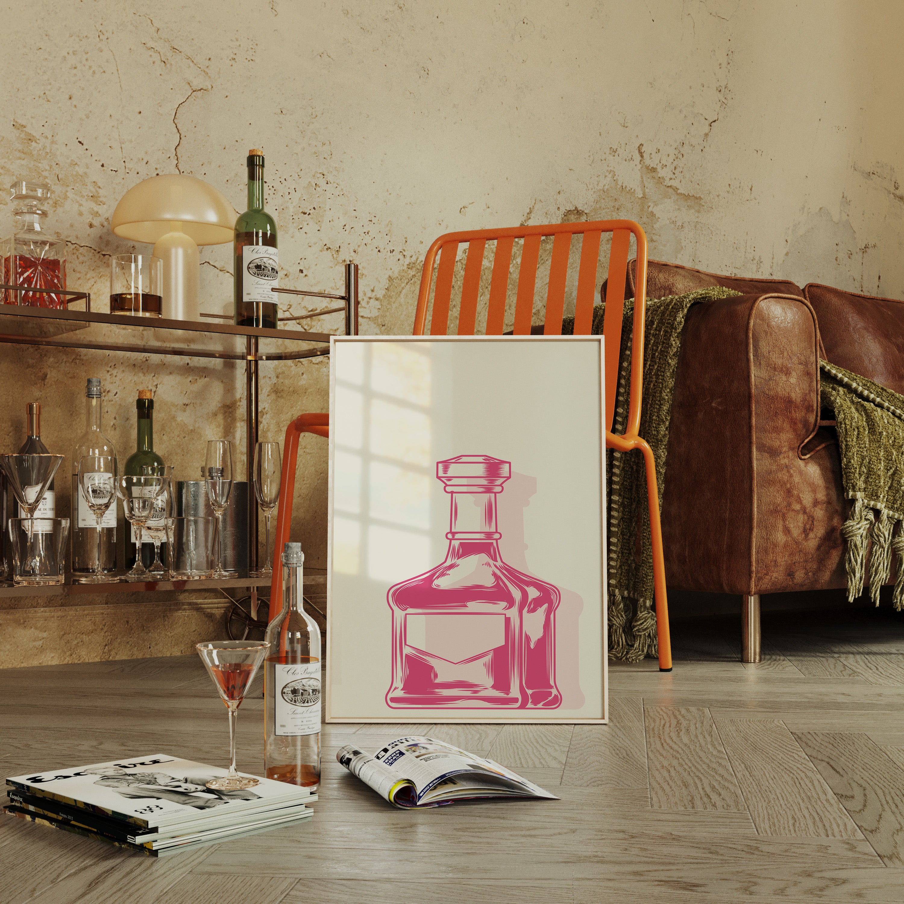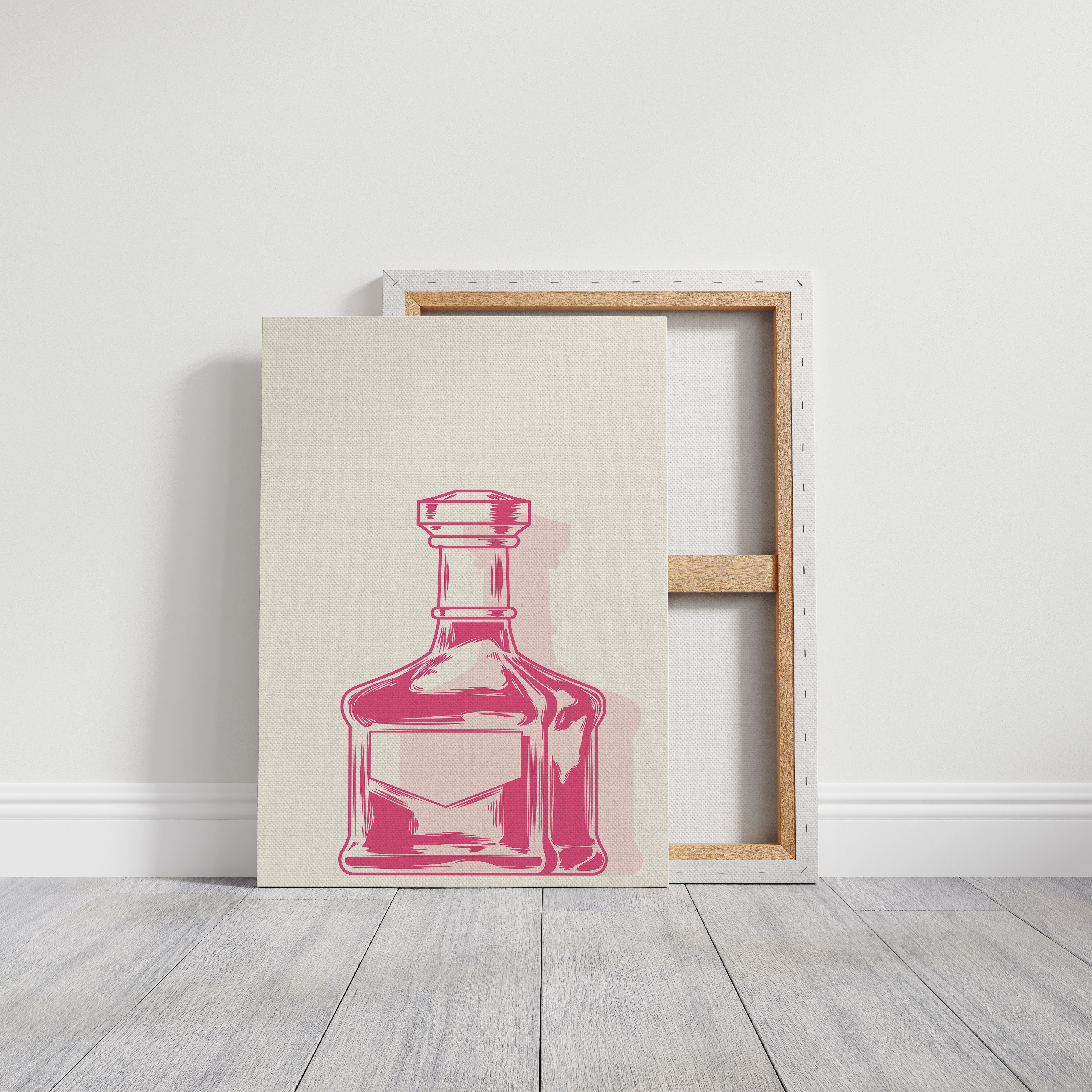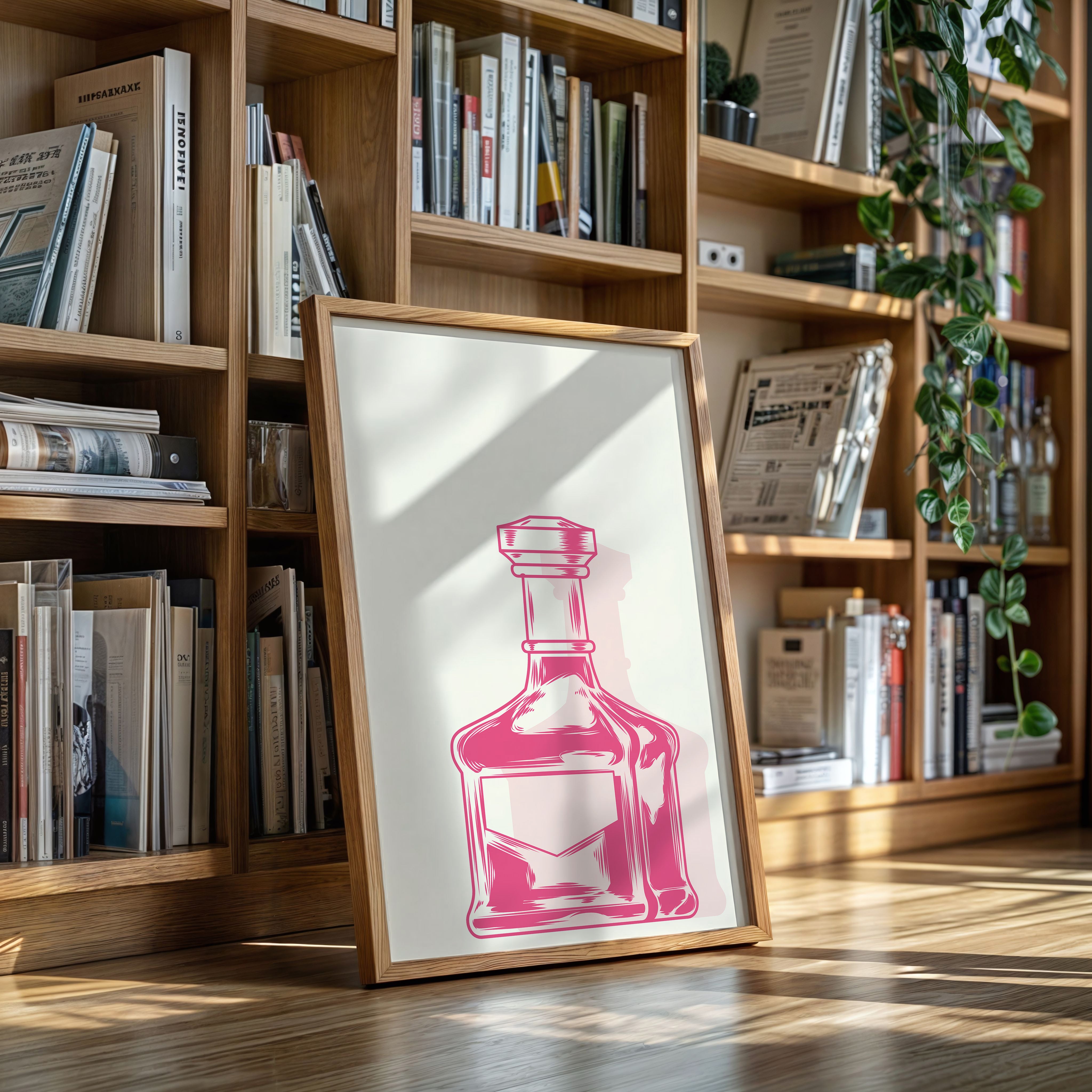 A delicate glass decanter catches light like spun sugar, its rosy silhouette casting gentle shadows against cream-colored walls. This piece from the Contemporary collection marries classic form with modern pop art sensibility. The bold pink hue transforms a traditional liquor bottle into an artful statement, while clean lines and careful shading create an almost architectural presence. Perfect for adding a sophisticated yet playful touch to a home bar area or dining room. The piece invites conversation while elevating any space with its refined whimsy.