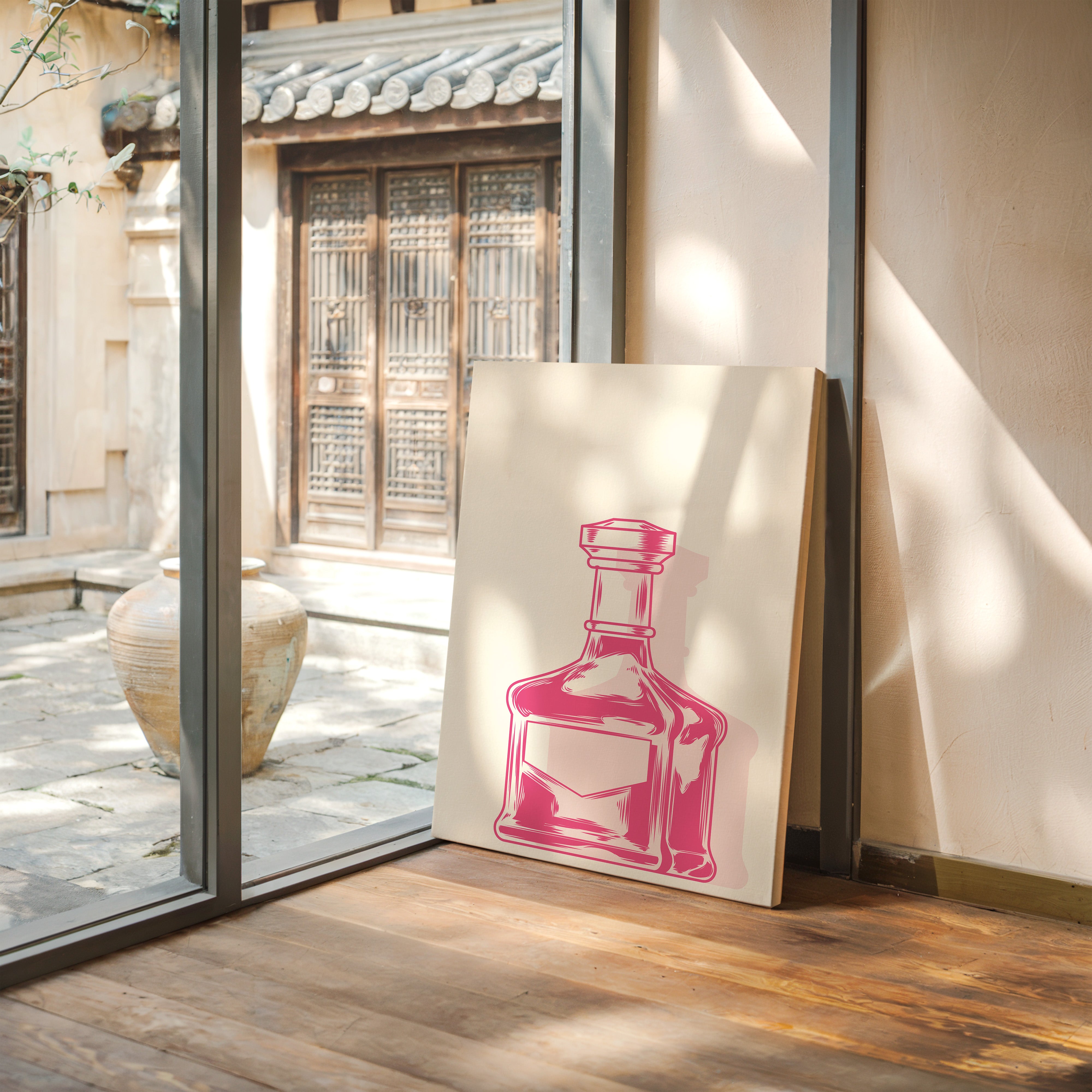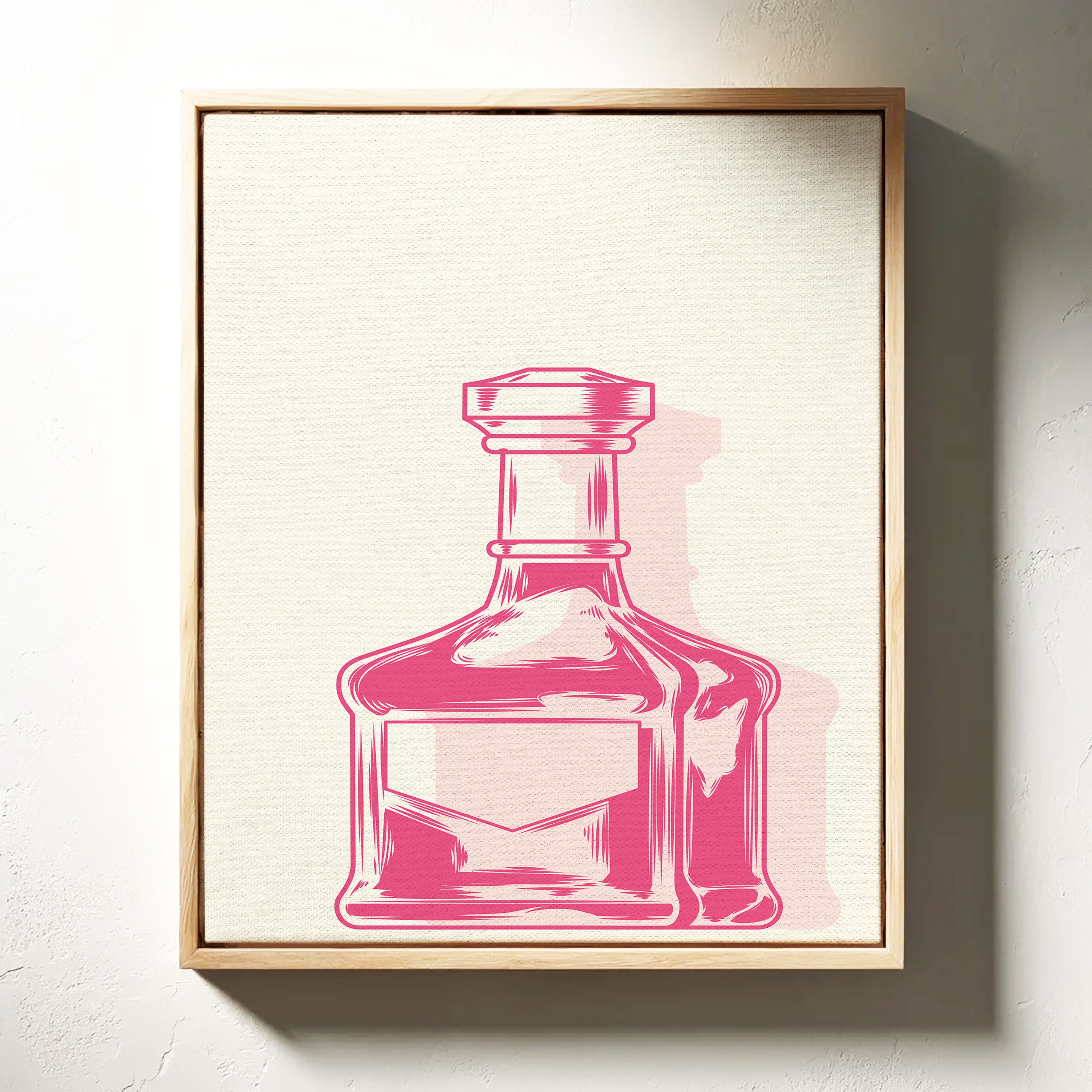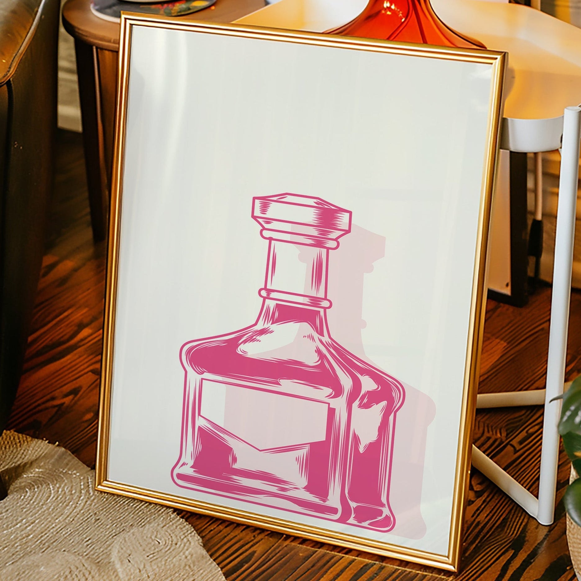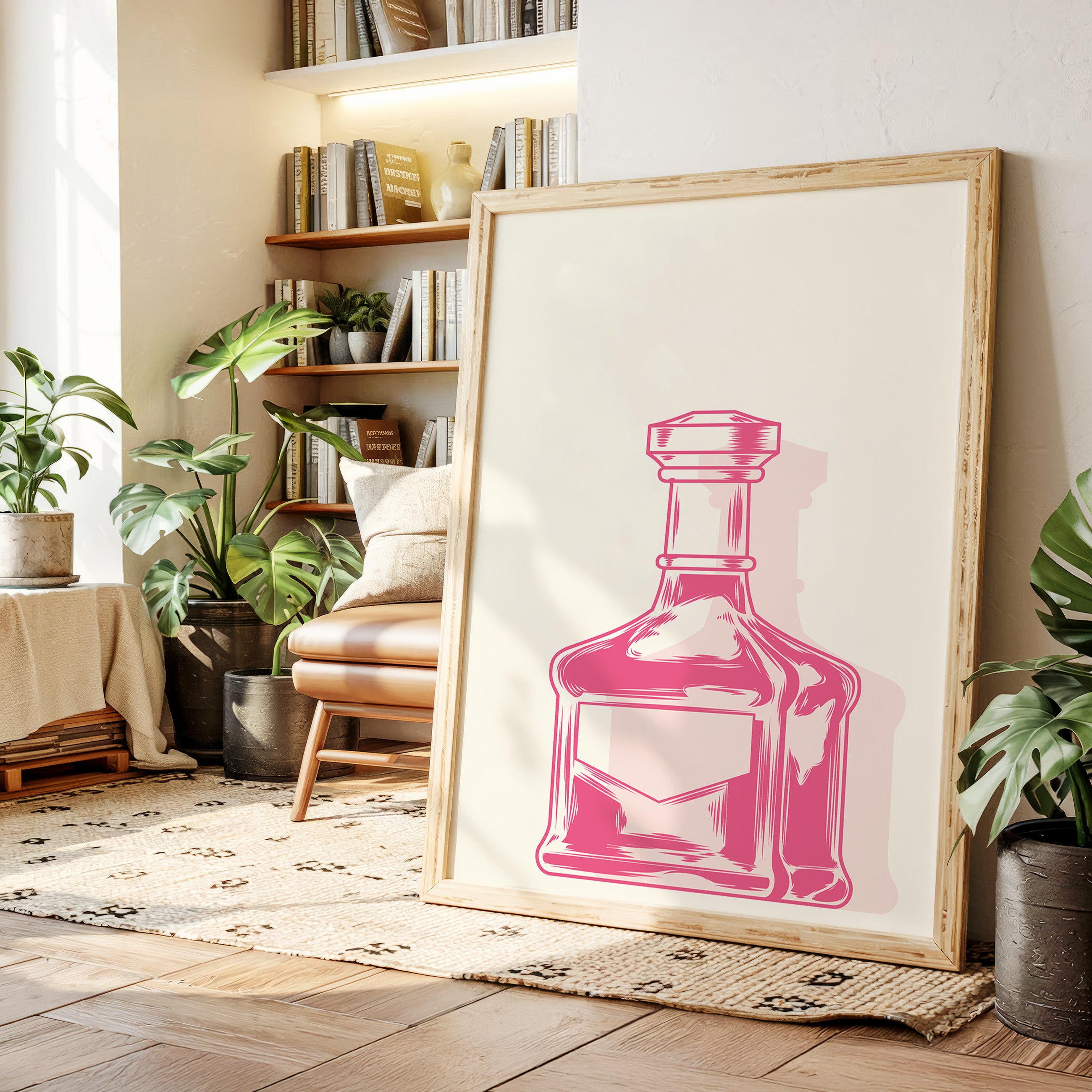 A delicate glass decanter catches light like spun sugar, its rosy silhouette casting gentle shadows against cream-colored walls. This piece from the Contemporary collection marries classic form with modern pop art sensibility. The bold pink hue transforms a traditional liquor bottle into an artful statement, while clean lines and careful shading create an almost architectural presence. Perfect for adding a sophisticated yet playful touch to a home bar area or dining room. The piece invites conversation while elevating any space with its refined whimsy.