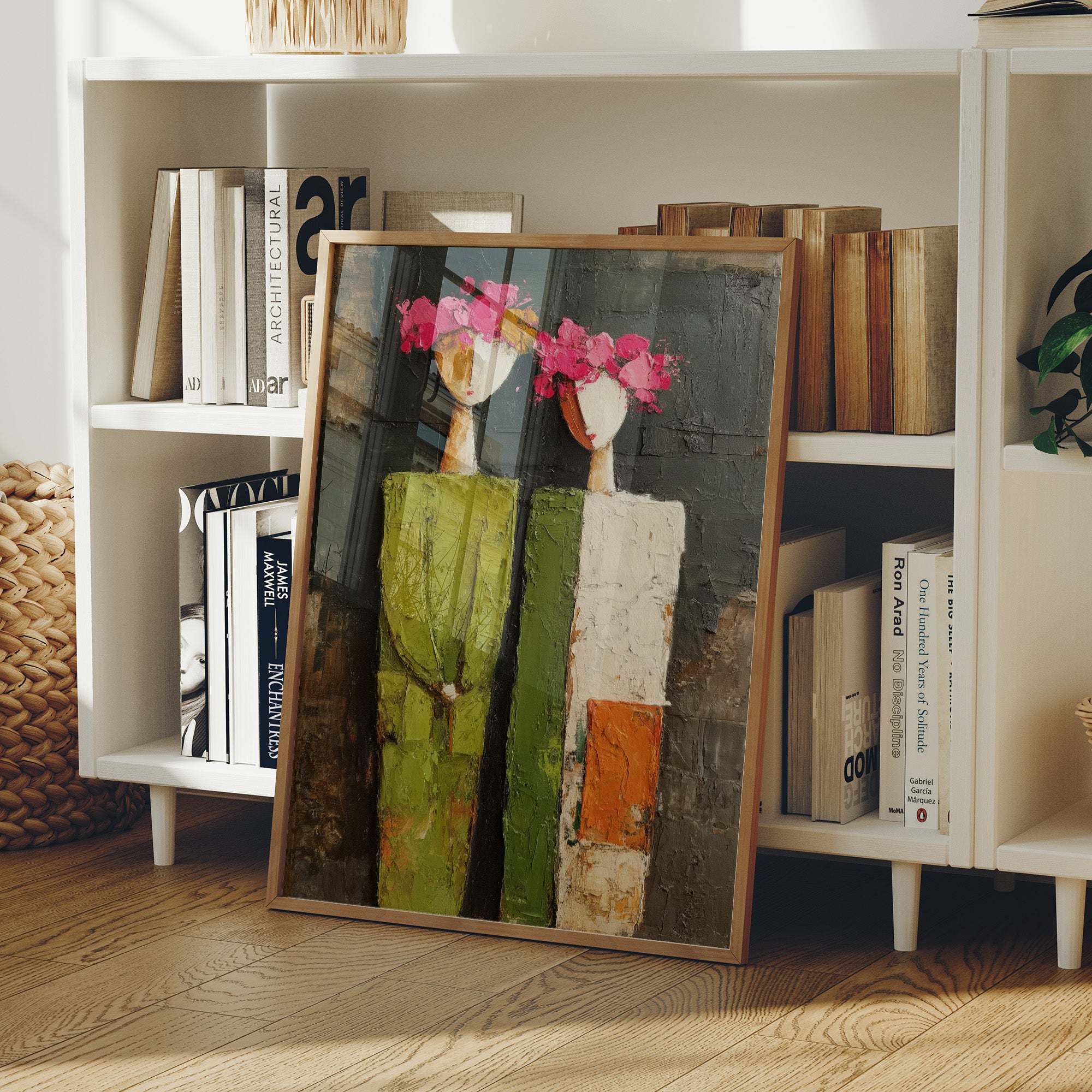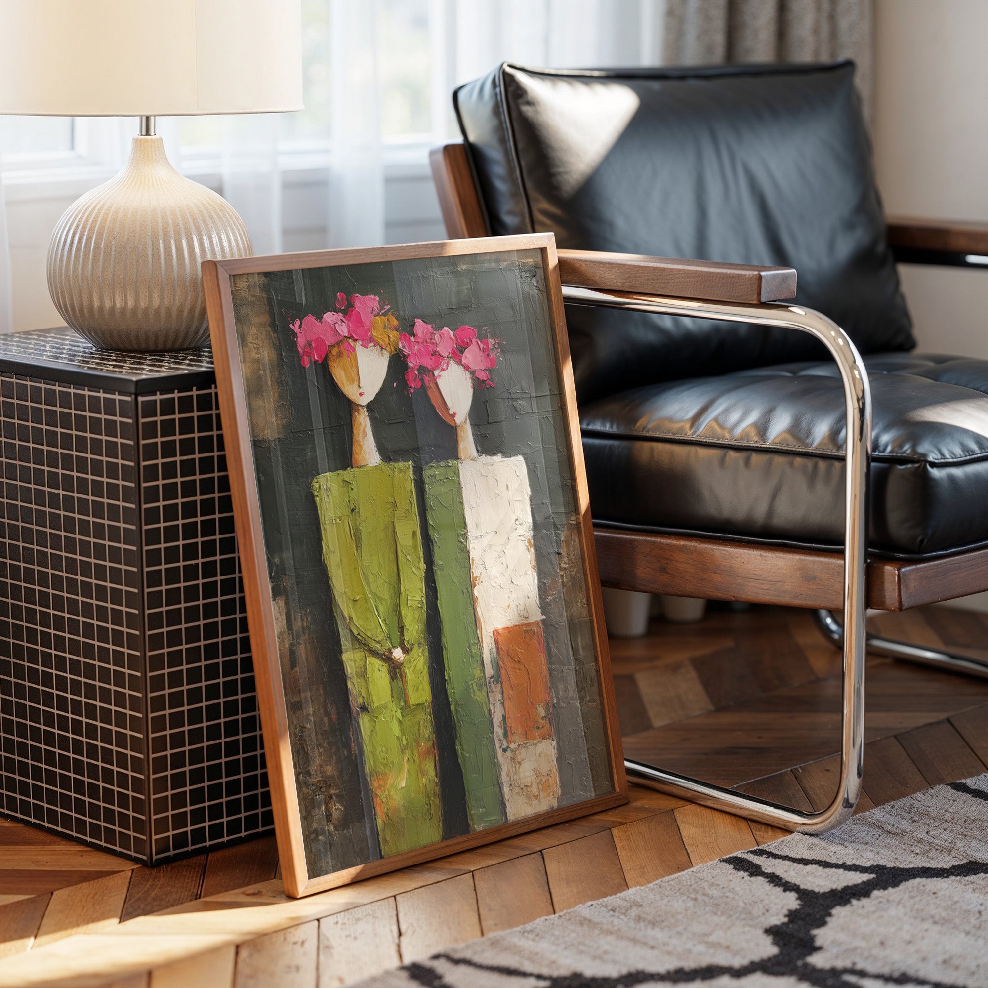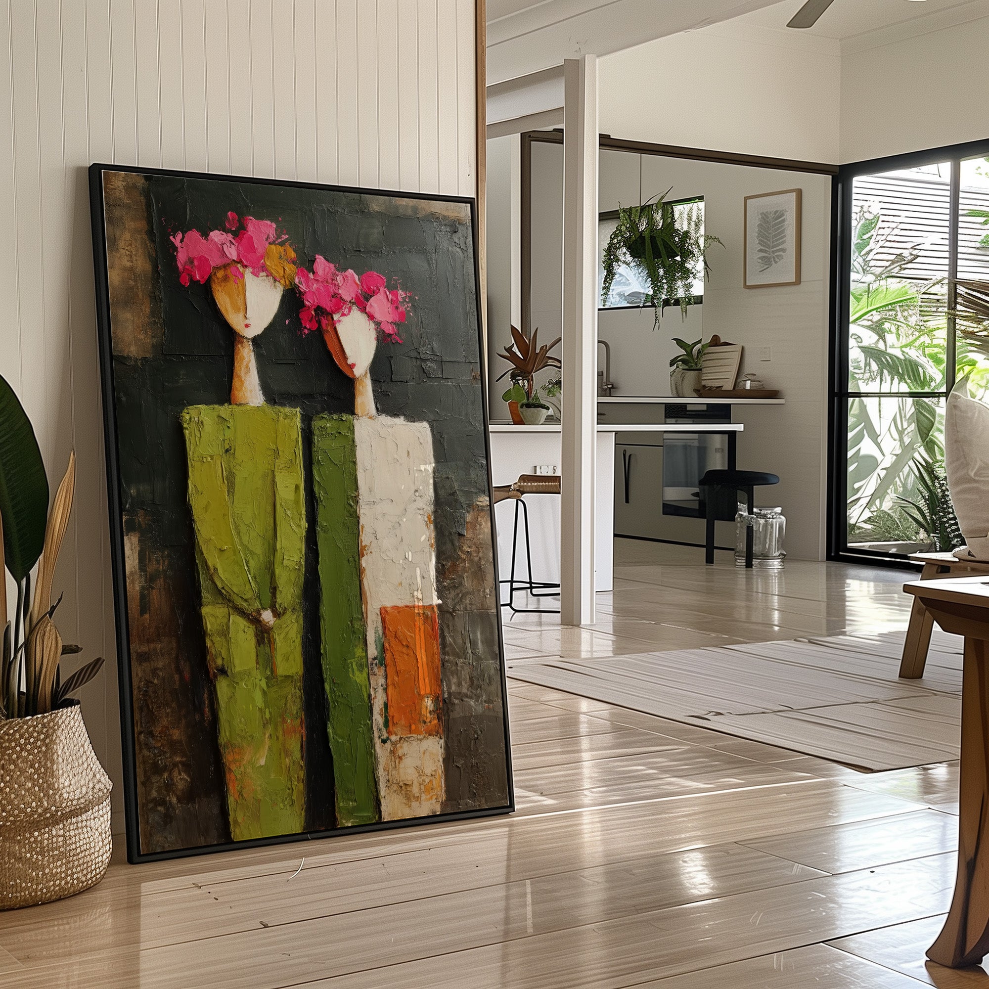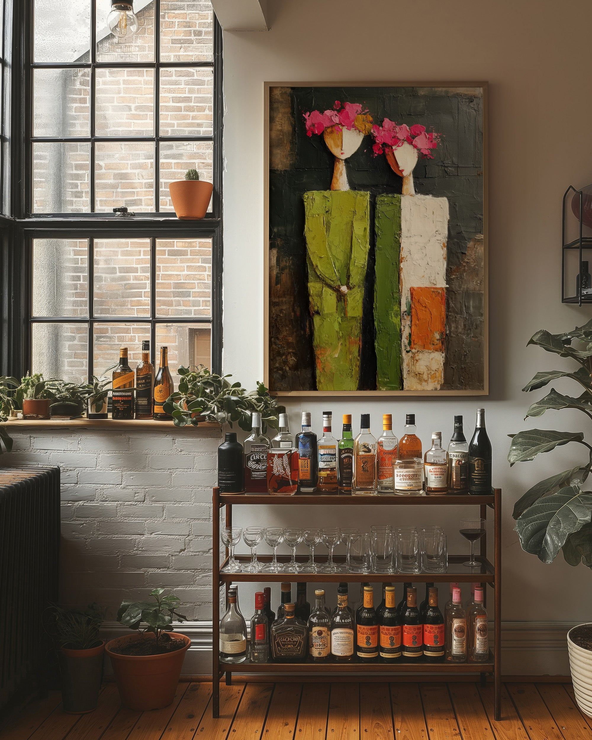 Sunlight streams through industrial windows, casting warm rays across a sophisticated home bar setup. A striking modern painting featuring two abstract figures in bold green and white, crowned with vibrant pink blooms, creates an artistic focal point above a meticulously arranged collection of spirits. The contrast between the raw brick walls, sleek bar cart, and carefully curated botanicals speaks to a thoughtful blend of industrial and organic elements. The space marries contemporary style with classic cocktail culture, where each bottle tells its own story against the backdrop of natural light and lush houseplants. This vignette would elevate a dining room, living space, or dedicated bar area, adding both functionality and artistic flair to contemporary urban interiors.