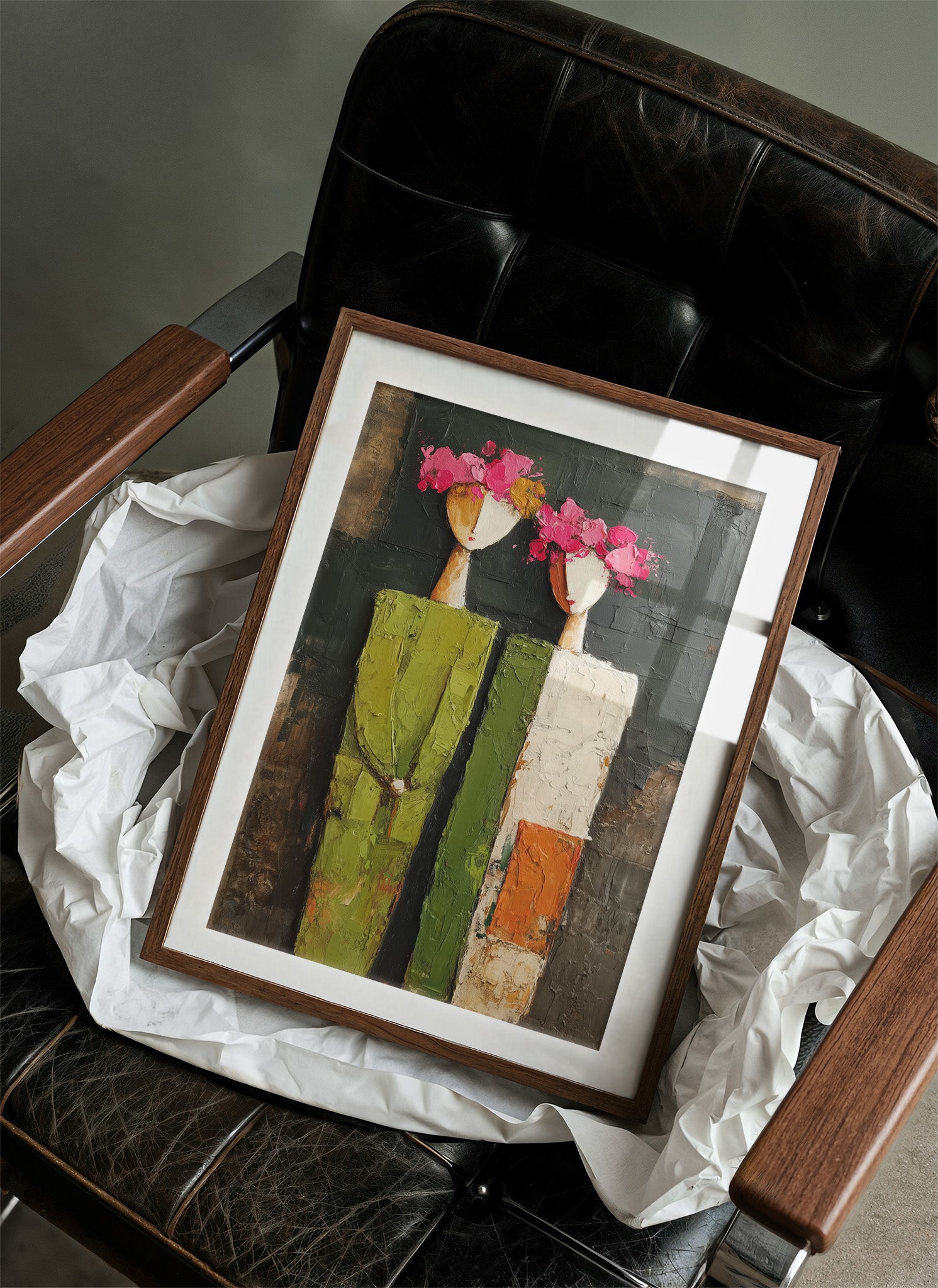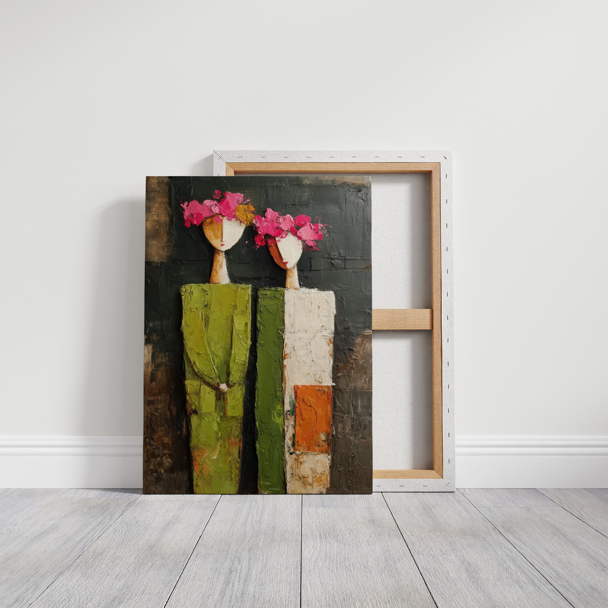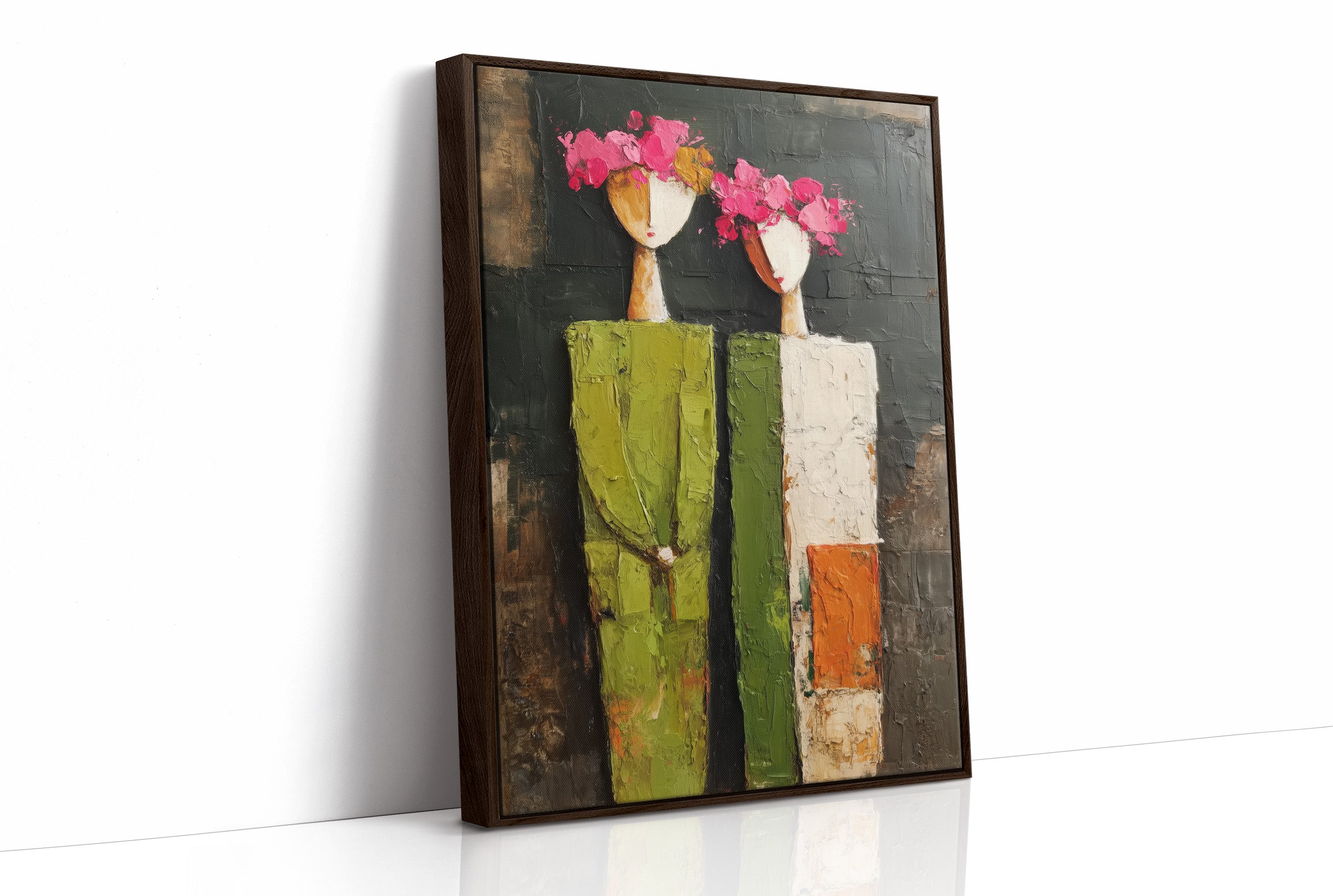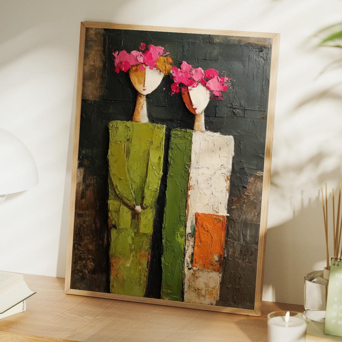 Sunlight streams through industrial windows, casting warm rays across a sophisticated home bar setup. A striking modern painting featuring two abstract figures in bold green and white, crowned with vibrant pink blooms, creates an artistic focal point above a meticulously arranged collection of spirits. The contrast between the raw brick walls, sleek bar cart, and carefully curated botanicals speaks to a thoughtful blend of industrial and organic elements. The space marries contemporary style with classic cocktail culture, where each bottle tells its own story against the backdrop of natural light and lush houseplants. This vignette would elevate a dining room, living space, or dedicated bar area, adding both functionality and artistic flair to contemporary urban interiors.