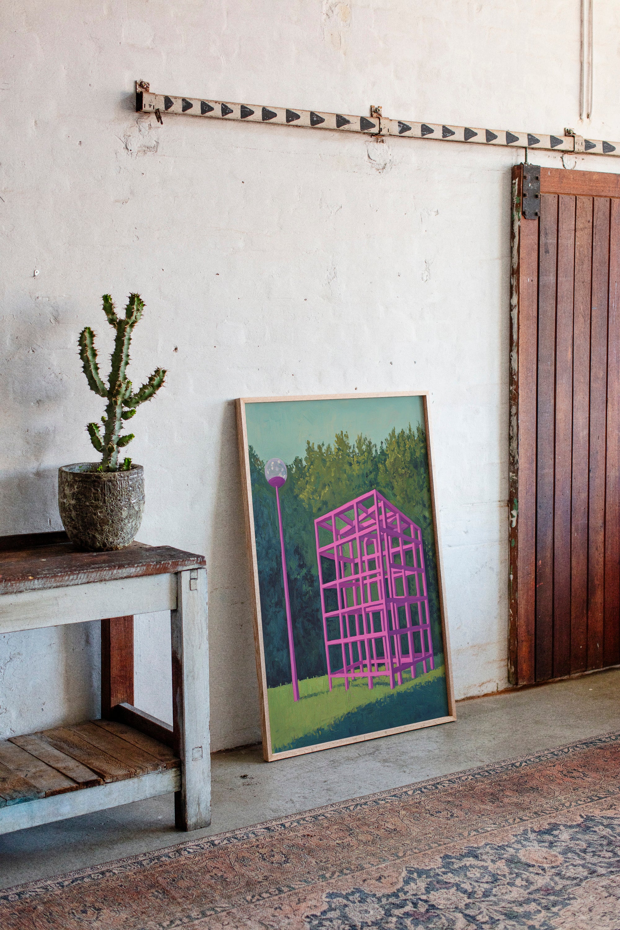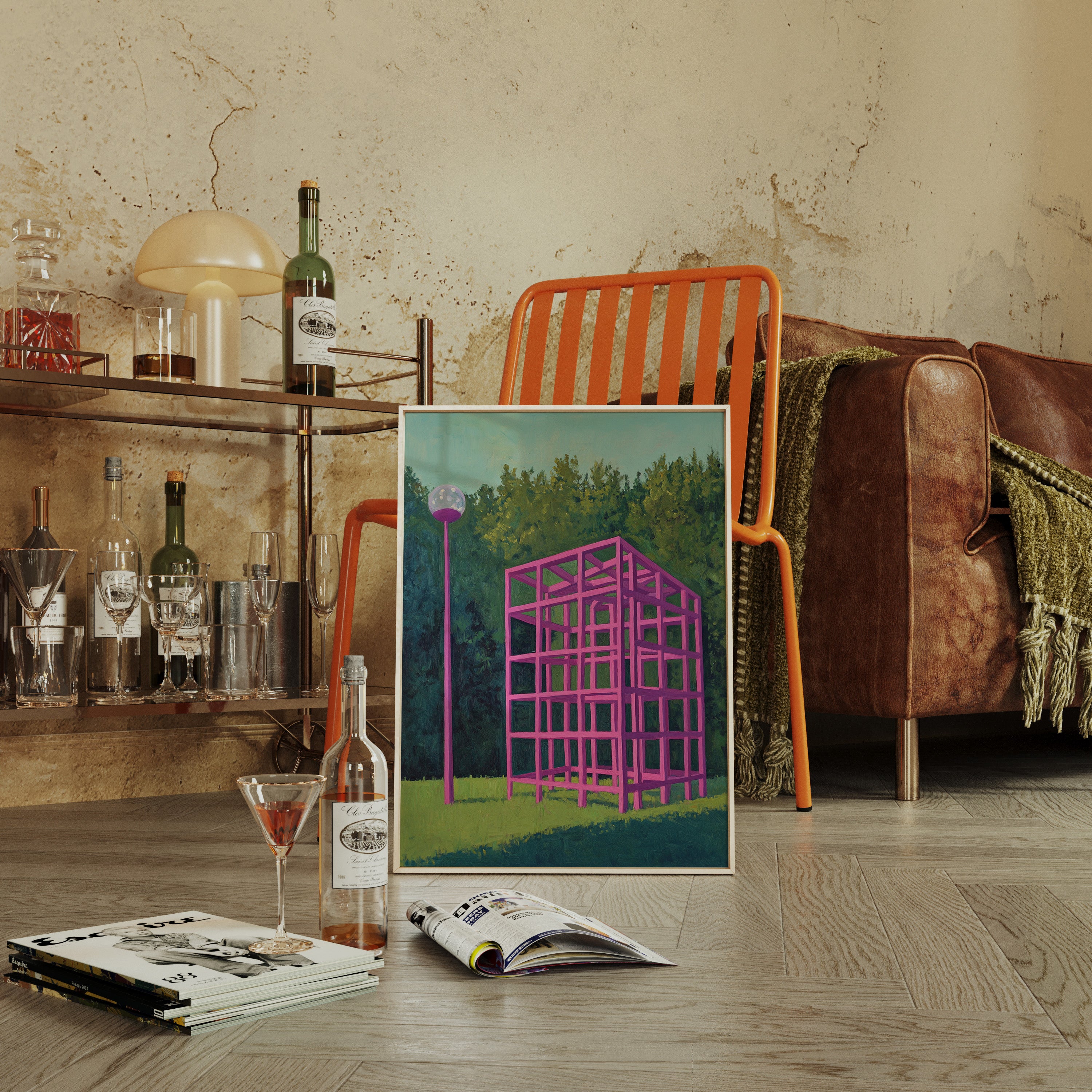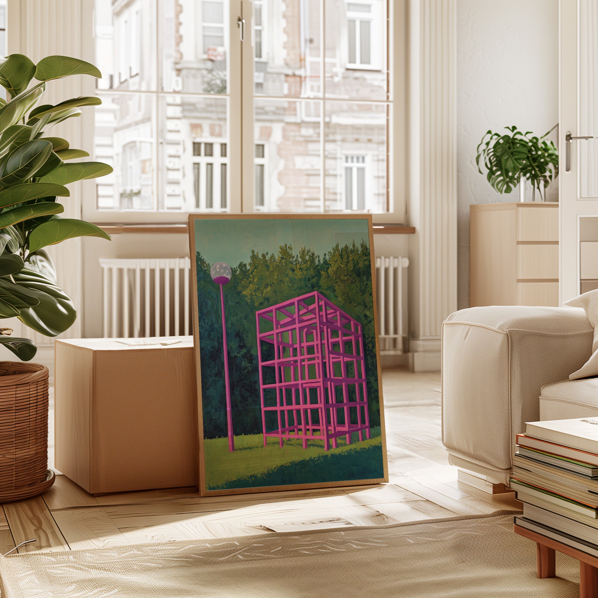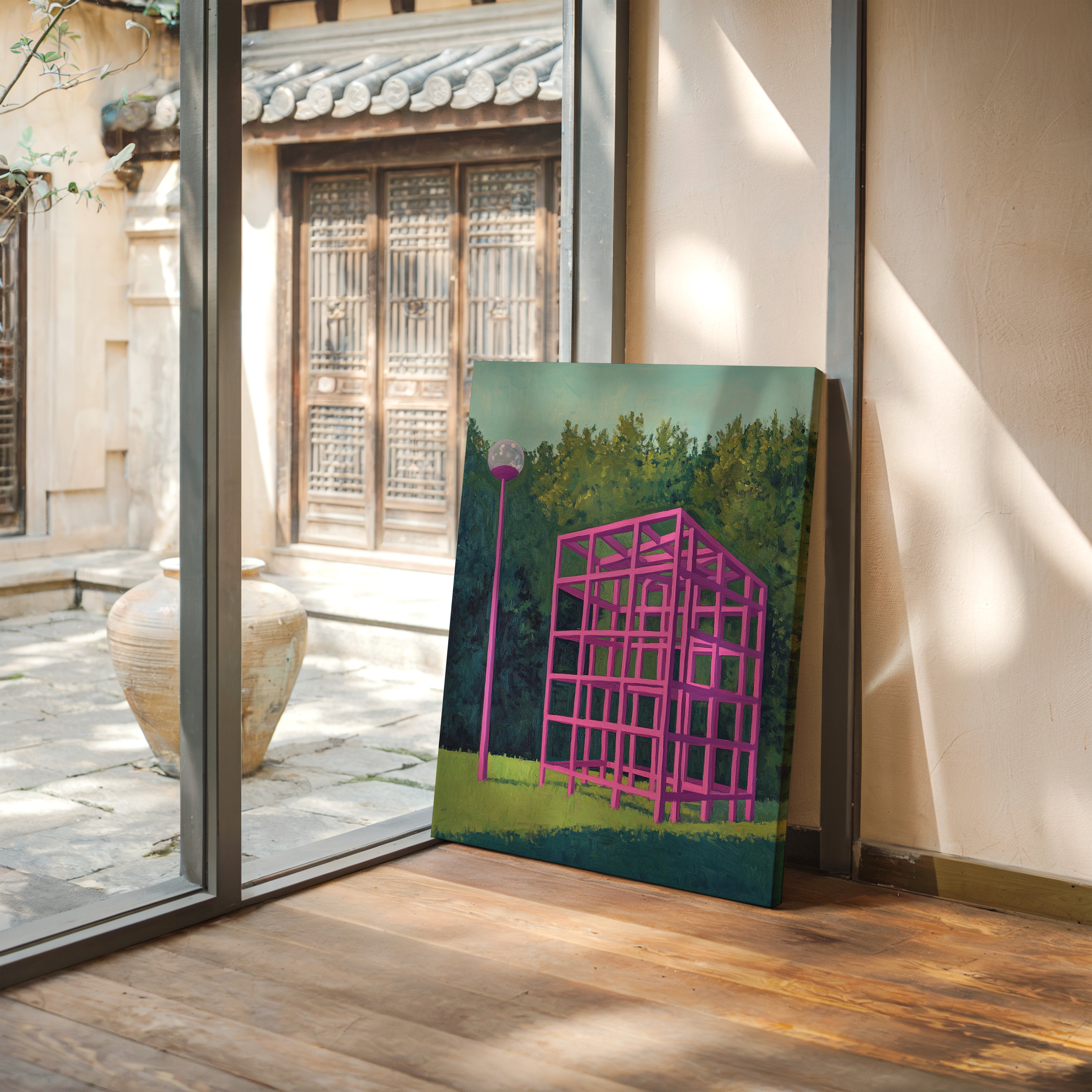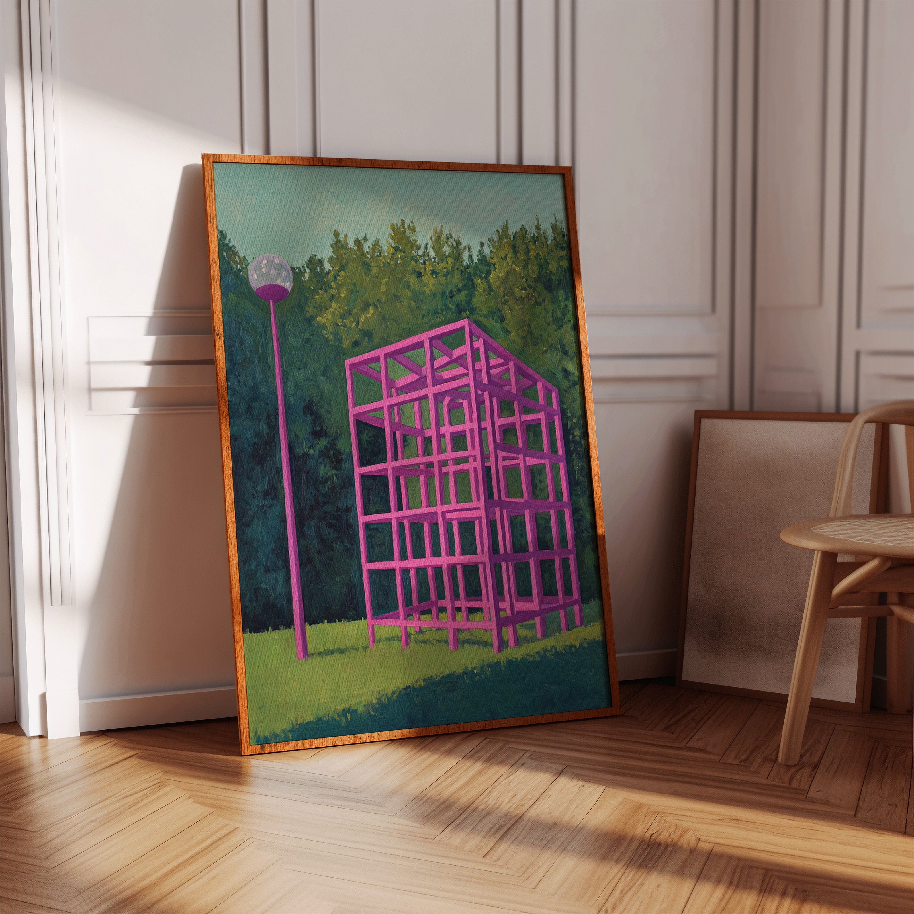 A bold magenta structure stands defiantly against nature's green canvas, creating an unexpected dialogue between artificial and organic forms. The geometric framework rises like a modernist sculpture, its clean lines and empty spaces forming a mesmerizing grid pattern while a whimsical orb-topped pole keeps silent watch nearby. Deep forest greens and sun-touched foliage provide a dramatic backdrop for this architectural intervention, highlighting the intentional contrast between structured design and wild growth. This piece would make a striking focal point in a contemporary office space or modern living room where its playful challenge to conventional landscape art can spark conversation.