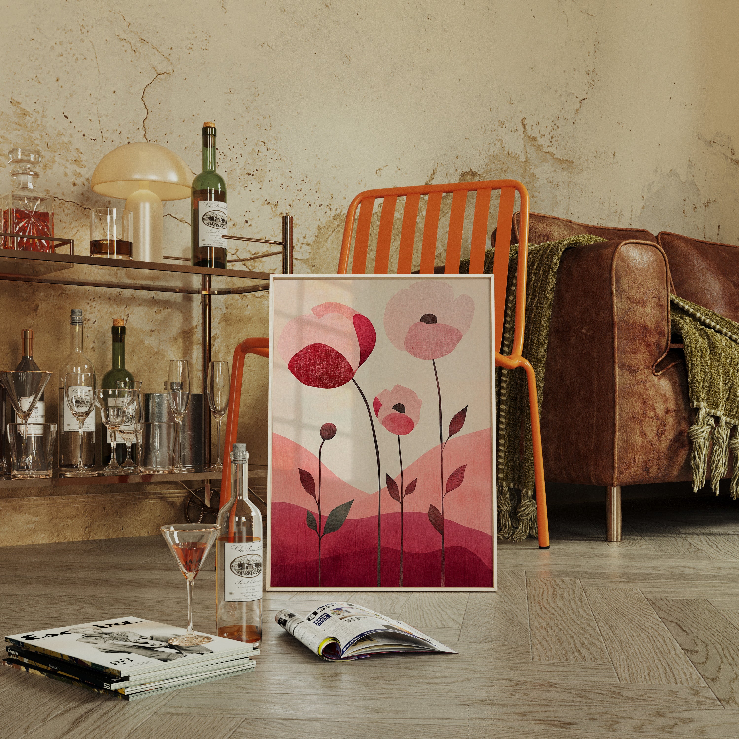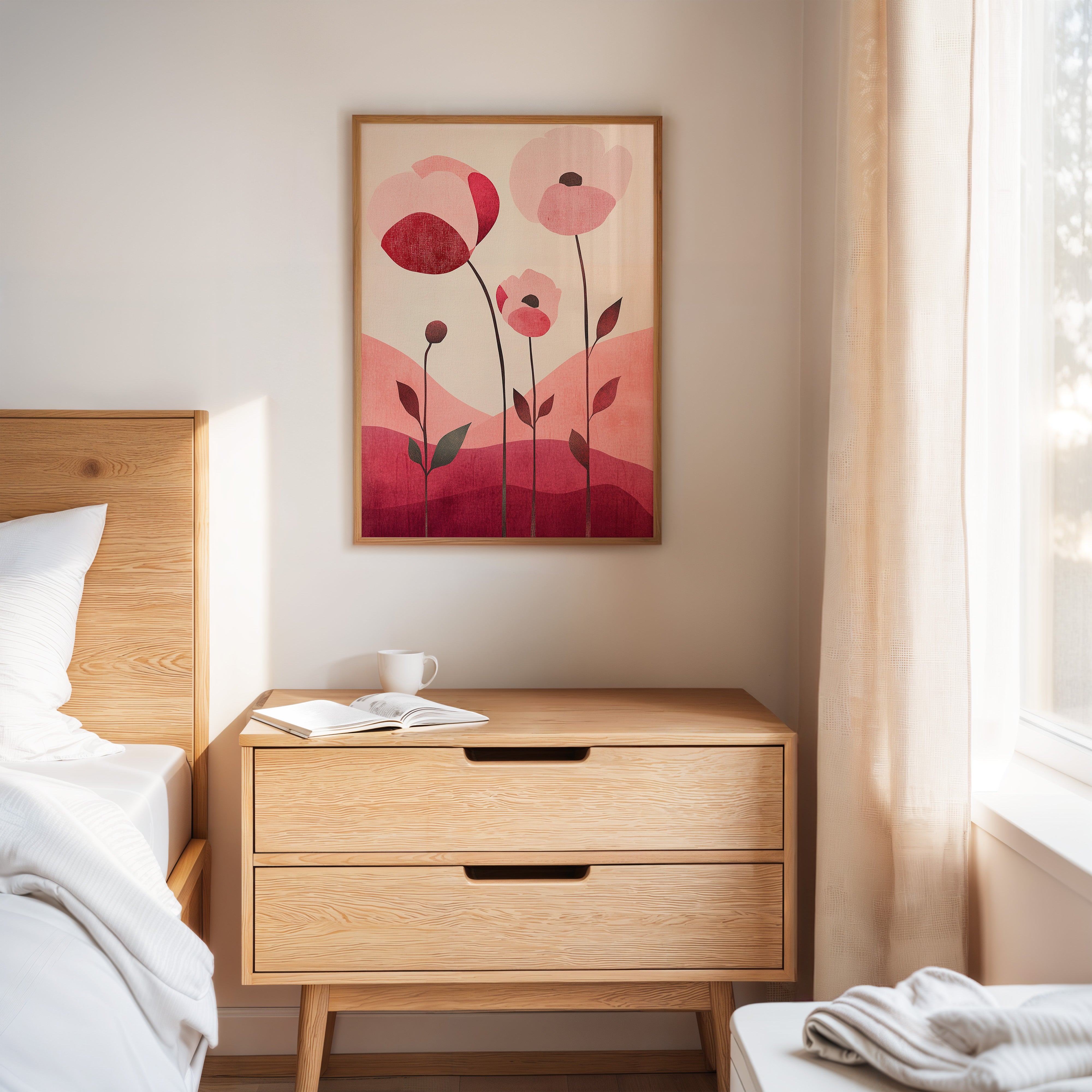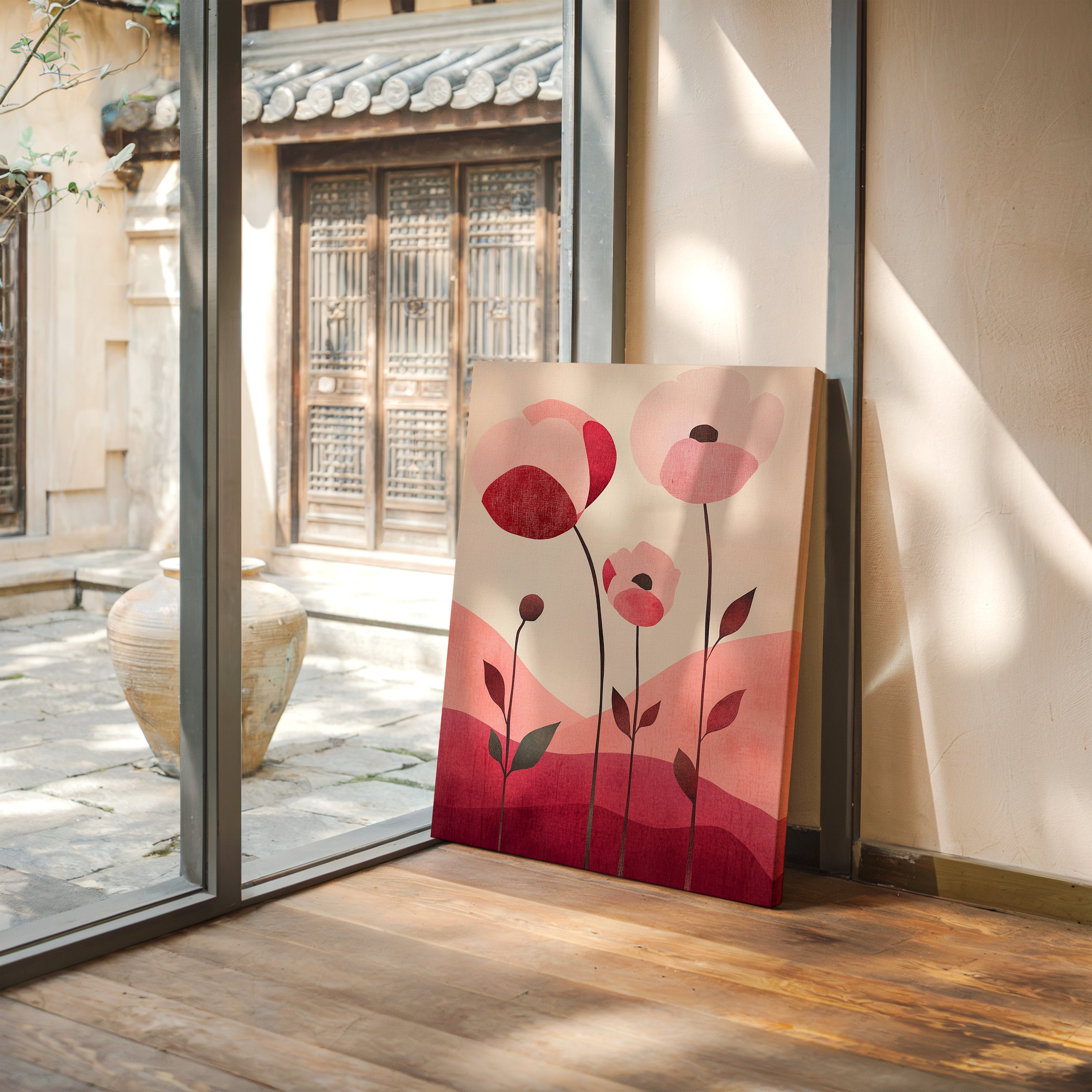 Delicate poppies stretch toward a rose-tinted sky, their petals unfurling like paper fans in the morning light. The flowers stand tall against rolling hills painted in graduating shades of pink and burgundy, creating a serene landscape of simplified organic forms. The composition balances modern minimalism with botanical grace, each bloom carefully rendered in overlapping transparent layers that suggest both depth and movement. This contemporary botanical piece brings a sense of peaceful sophistication to any room, particularly suited for a bedroom or reading nook where its gentle palette can foster moments of calm reflection.