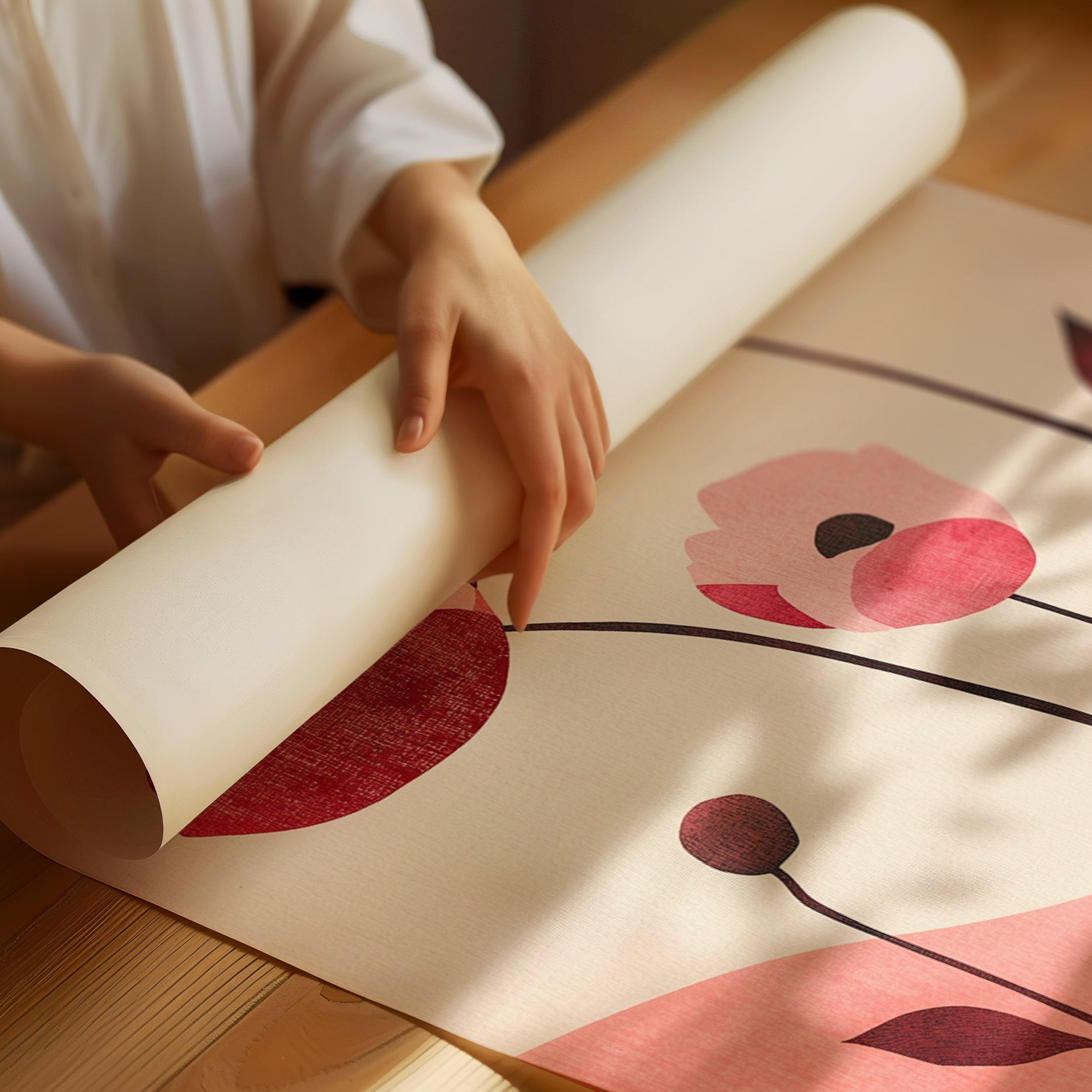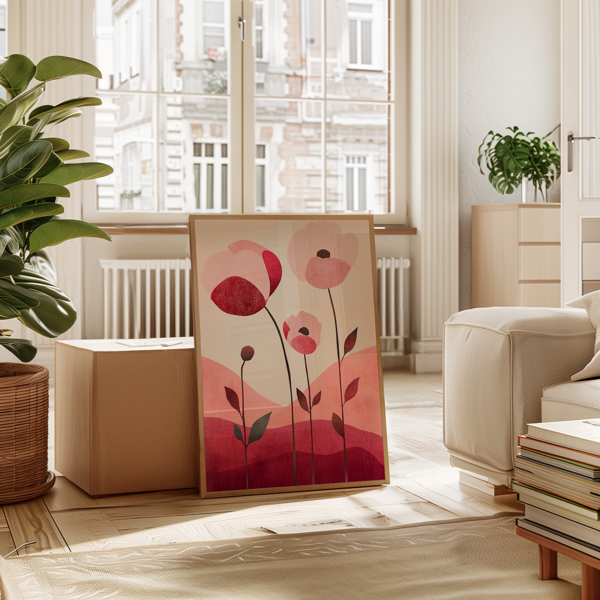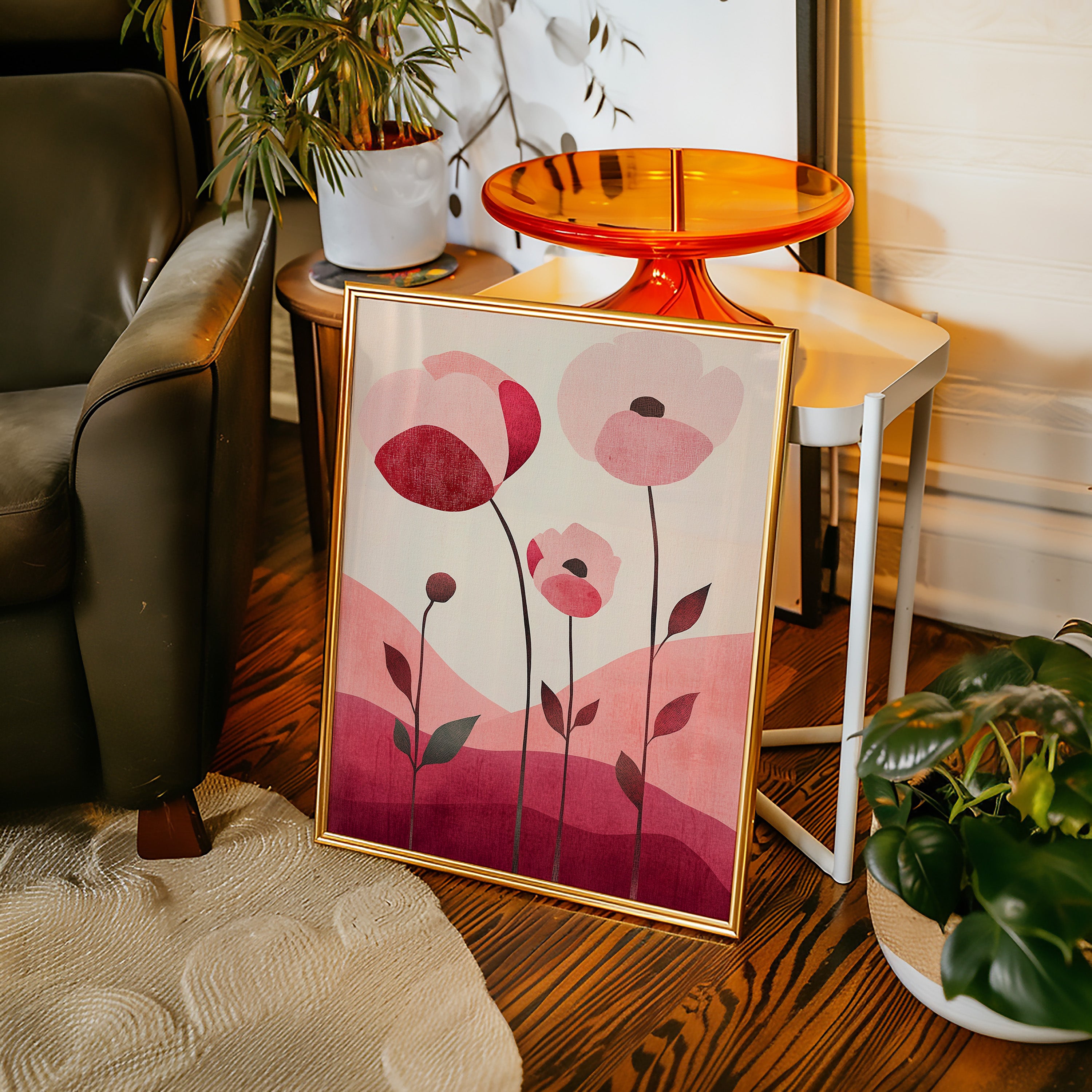 Delicate poppies stretch toward a rose-tinted sky, their petals unfurling like paper fans in the morning light. The flowers stand tall against rolling hills painted in graduating shades of pink and burgundy, creating a serene landscape of simplified organic forms. The composition balances modern minimalism with botanical grace, each bloom carefully rendered in overlapping transparent layers that suggest both depth and movement. This contemporary botanical piece brings a sense of peaceful sophistication to any room, particularly suited for a bedroom or reading nook where its gentle palette can foster moments of calm reflection.