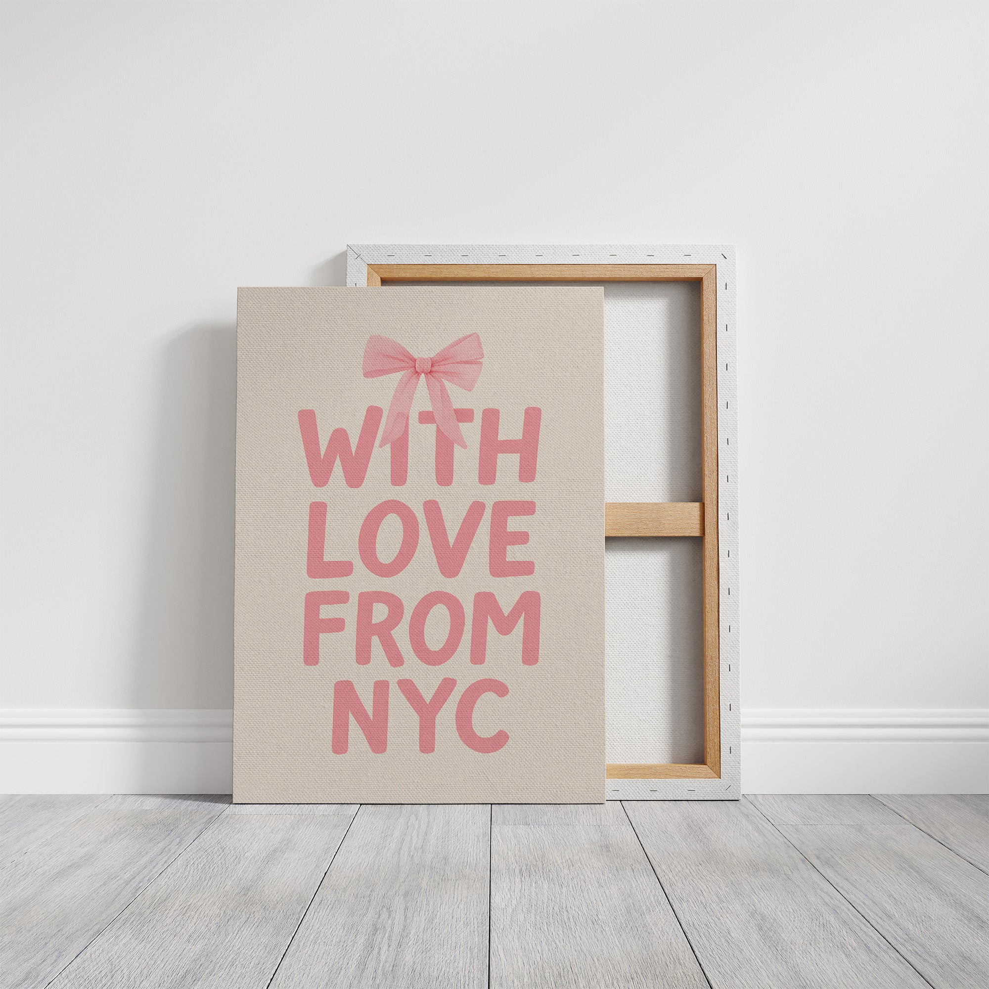 A minimalist typographic artwork featuring the phrase "WITH LOVE FROM NYC" in playful pink lettering against a soft cream background. The composition is adorned with a delicate pink ribbon bow at the top, adding a touch of elegance and warmth. This contemporary piece captures the essence of New York's affection through its simple yet impactful design, evoking feelings of sentimentality and connection to the iconic city. Perfect for urban-inspired interiors, greeting cards, or as a statement of metropolitan affection.