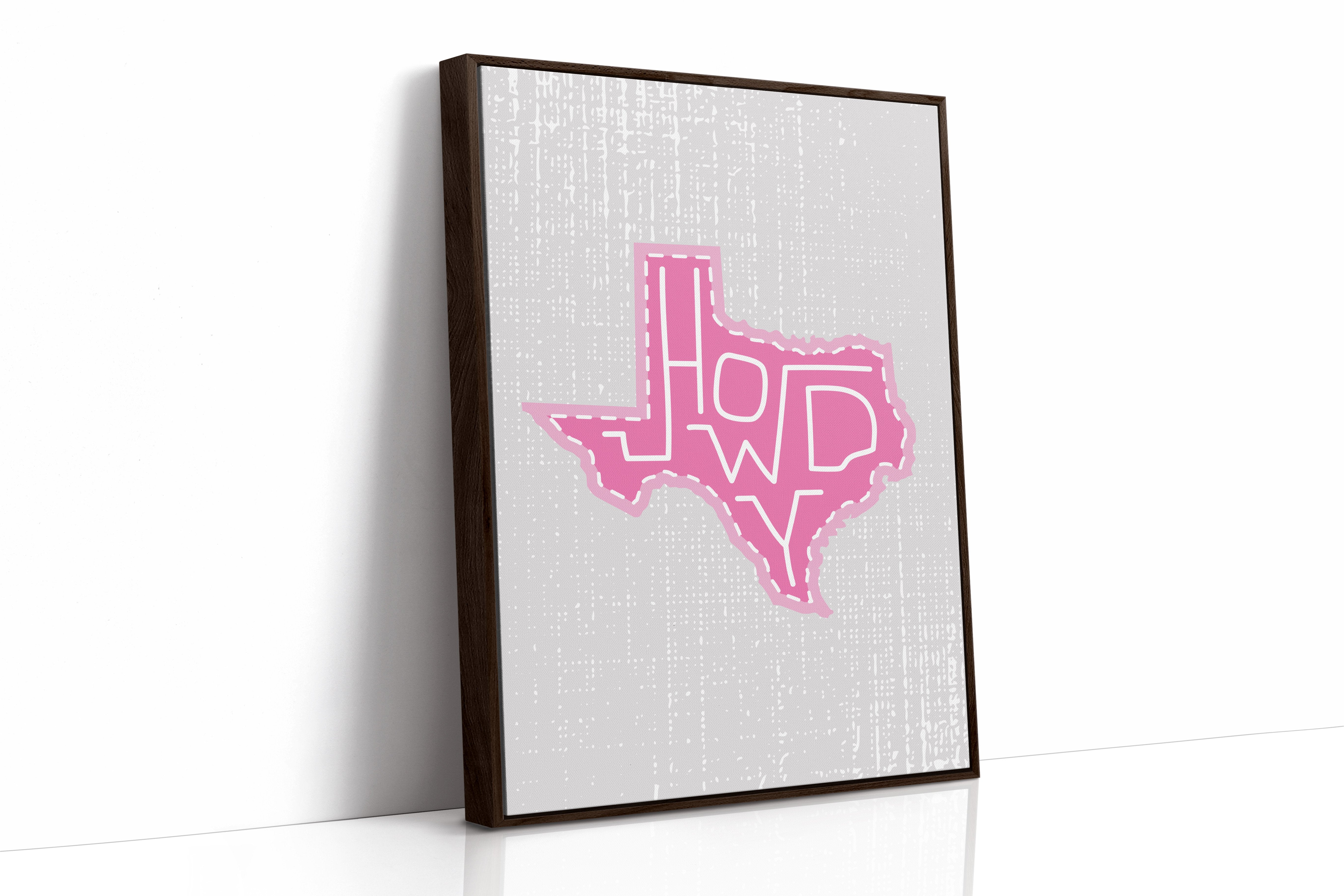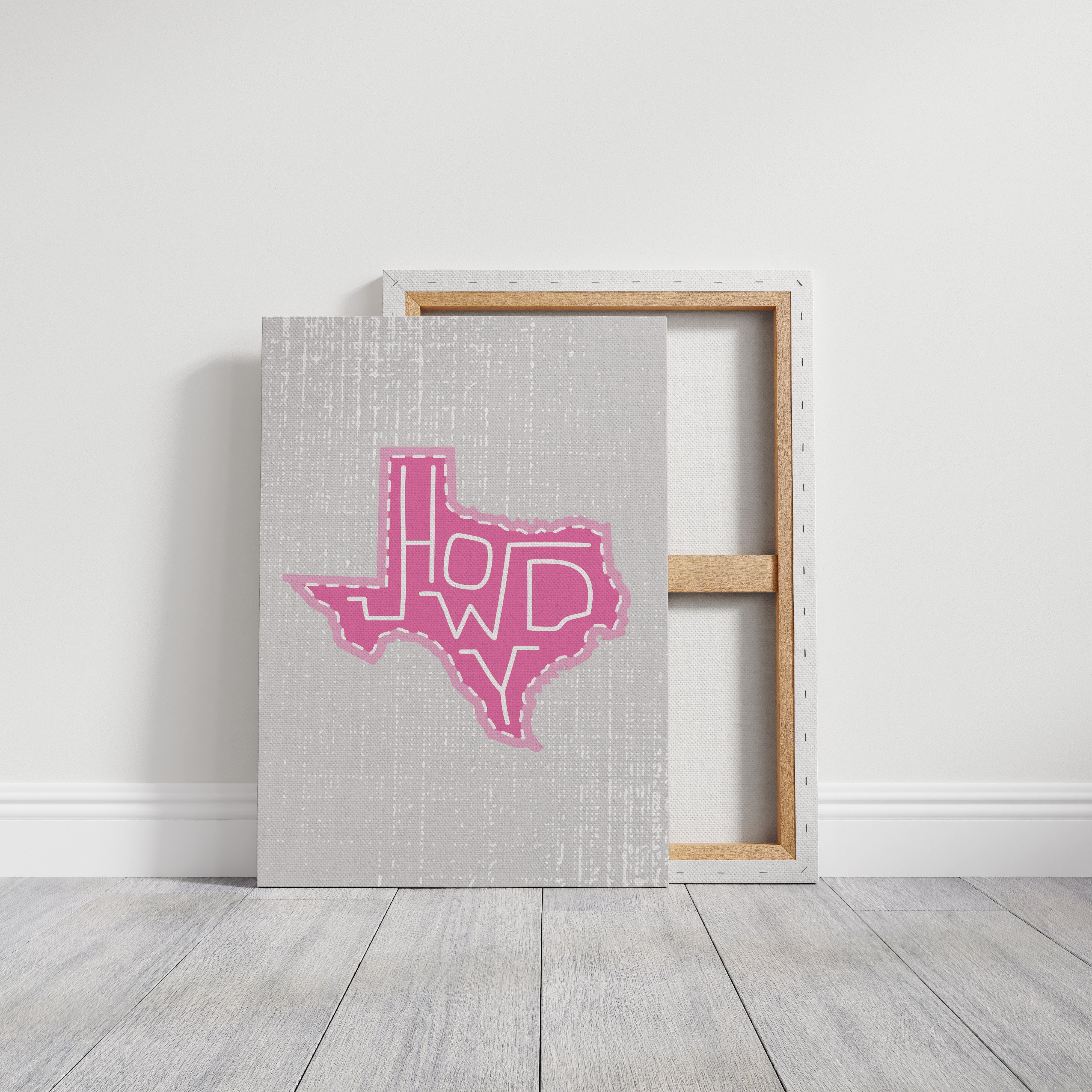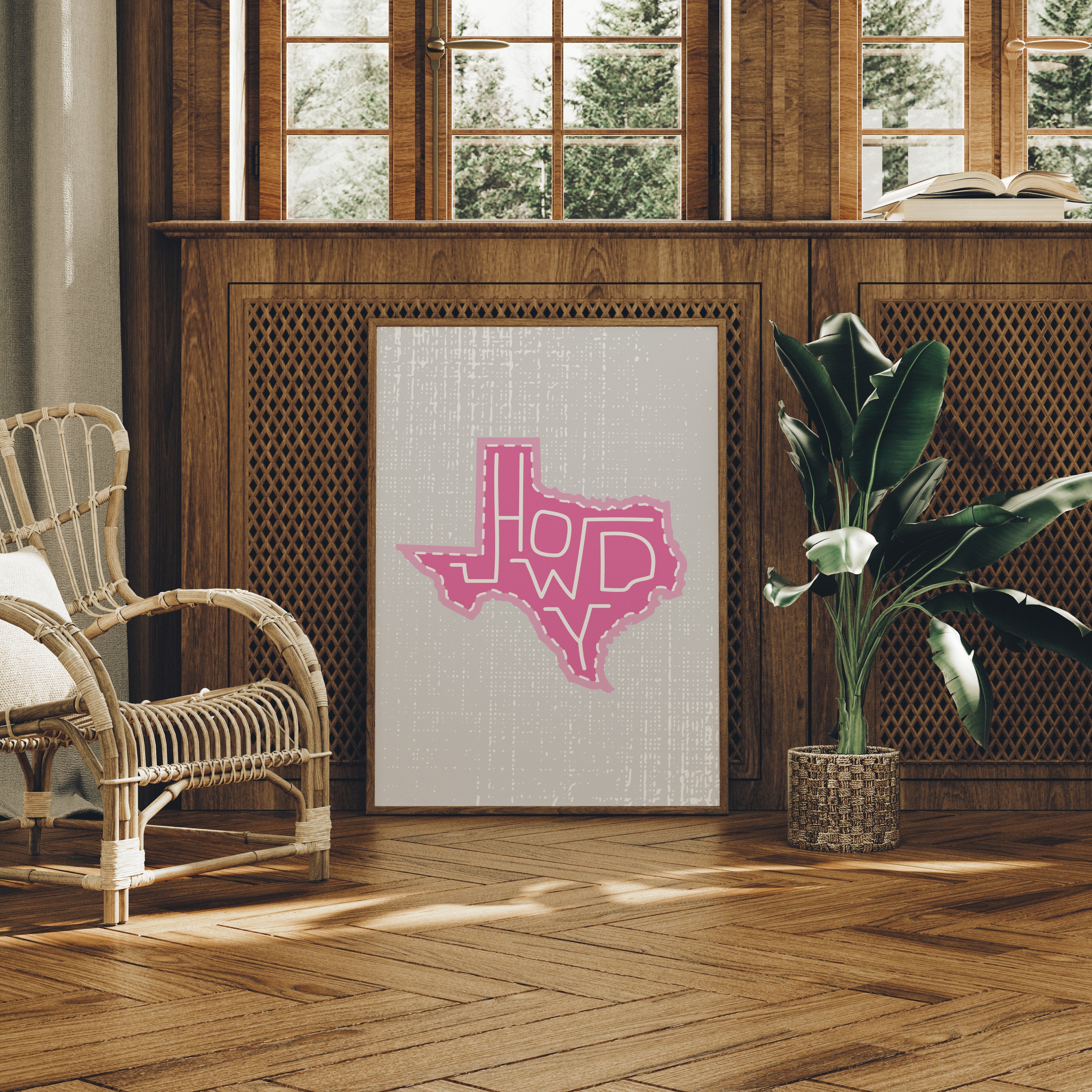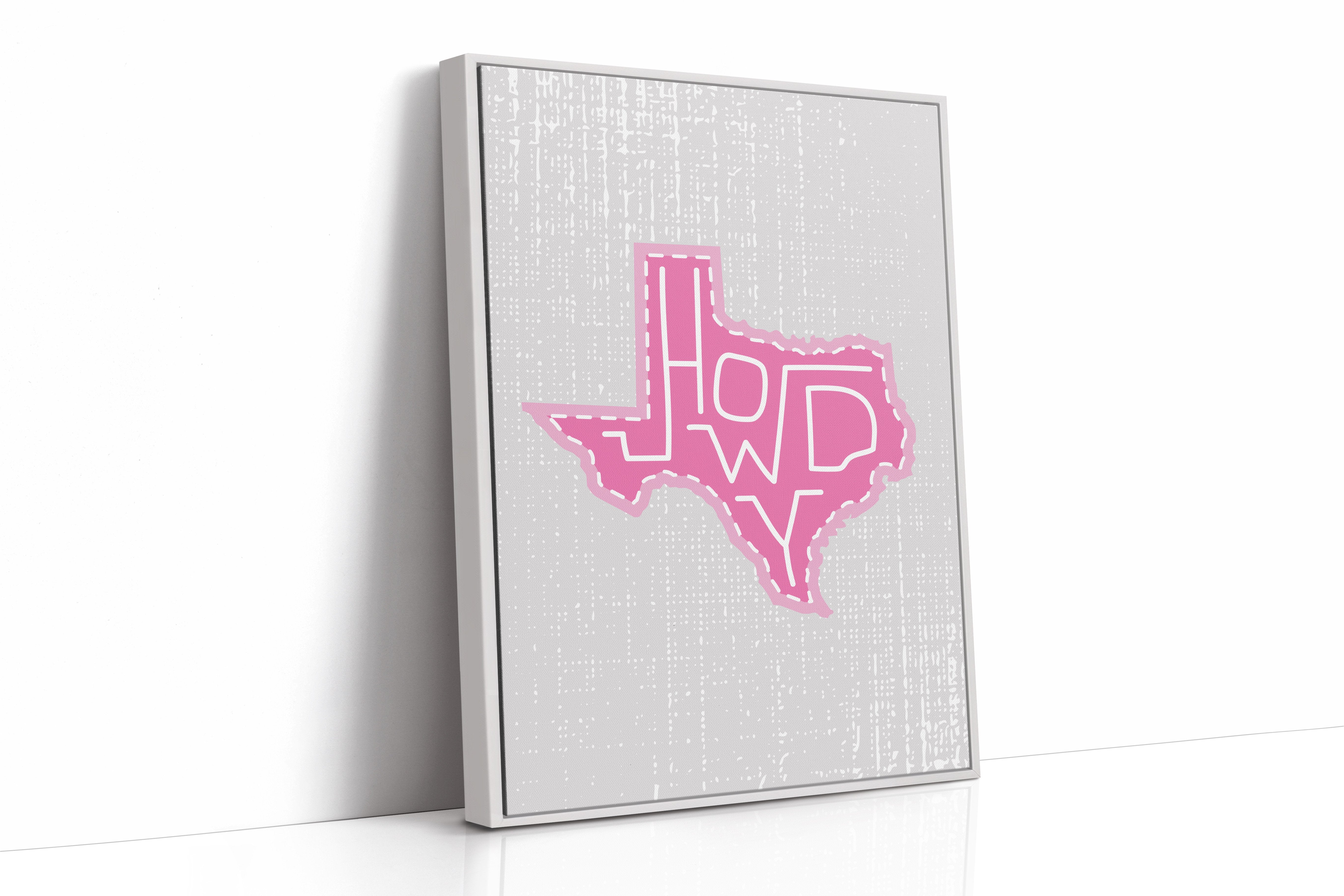 A vibrant pink Texas silhouette stands proud against a textured gray backdrop, the word ""HOWDY"" playfully stitched across its surface. The contrast between the soft pink hue and the rugged outline captures the duality of Texas spiritbold yet welcoming. White dotted lines trace the state's iconic shape, adding a handcrafted feel that speaks to tradition reimagined with contemporary flair. This piece brings a touch of Southern charm to modern spaces, perfect for adding personality to a home office or creating a conversation starter in an entryway.
