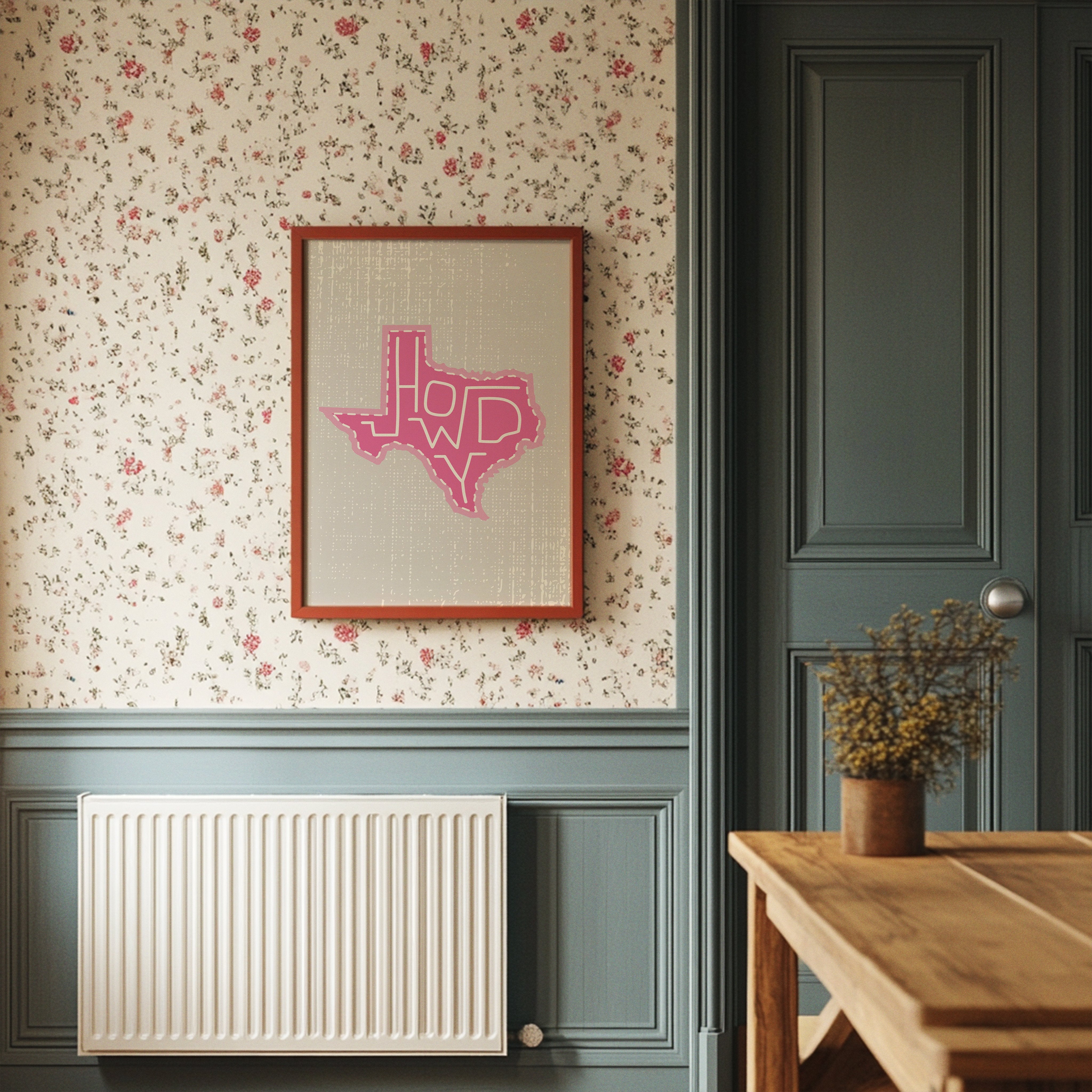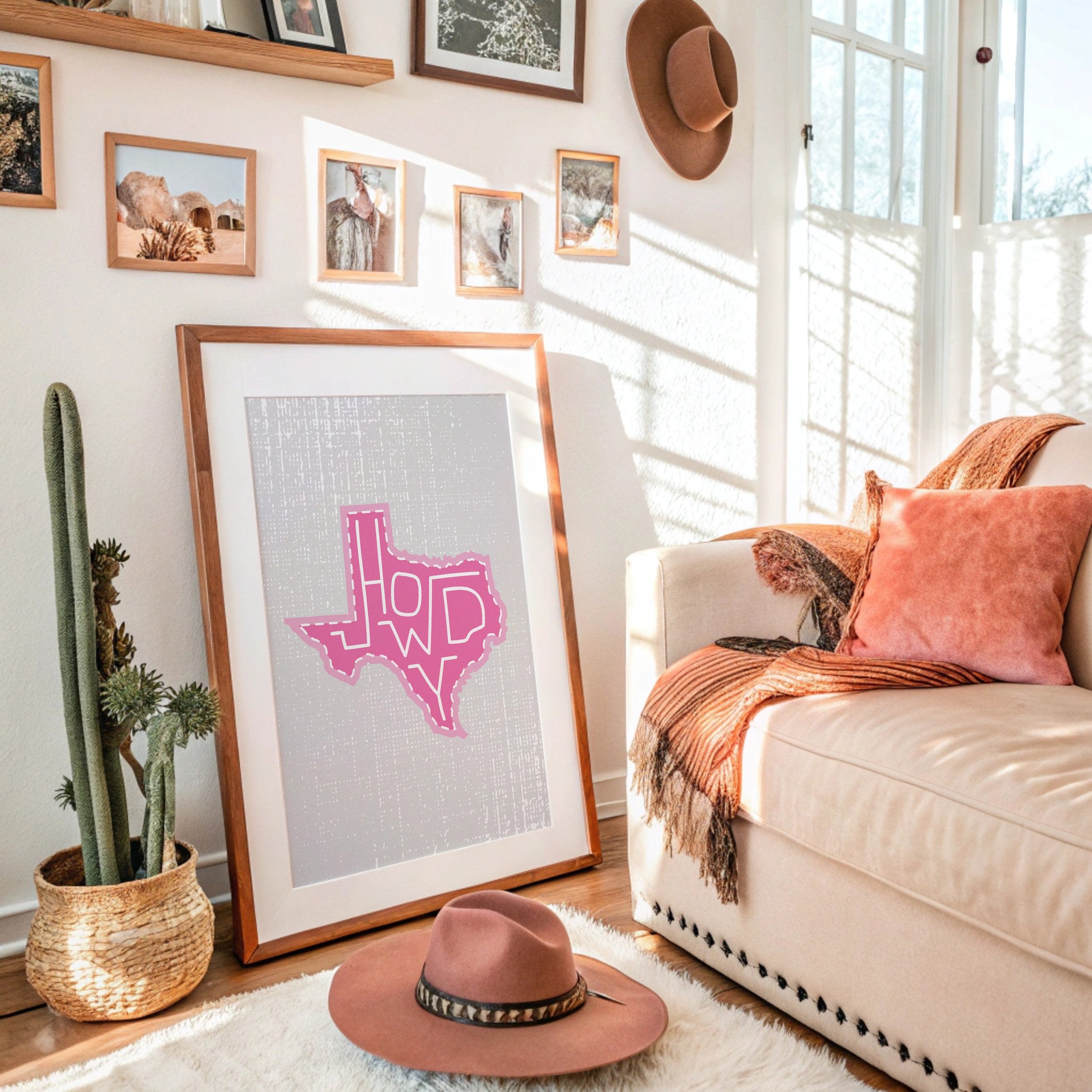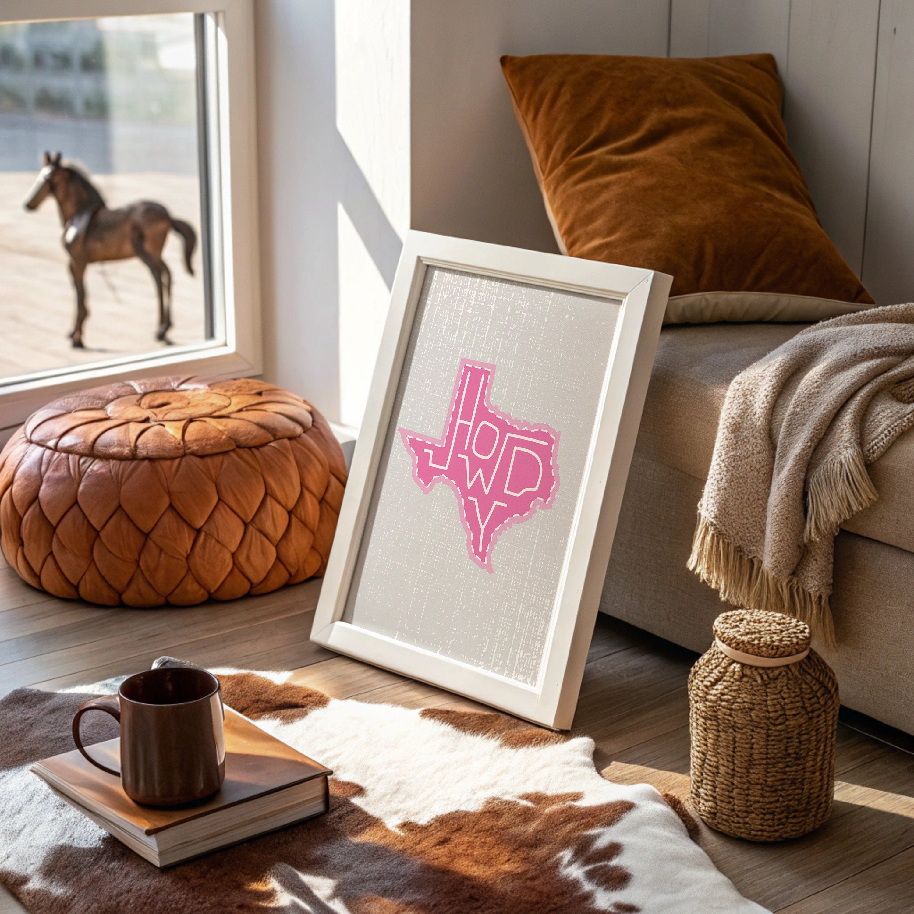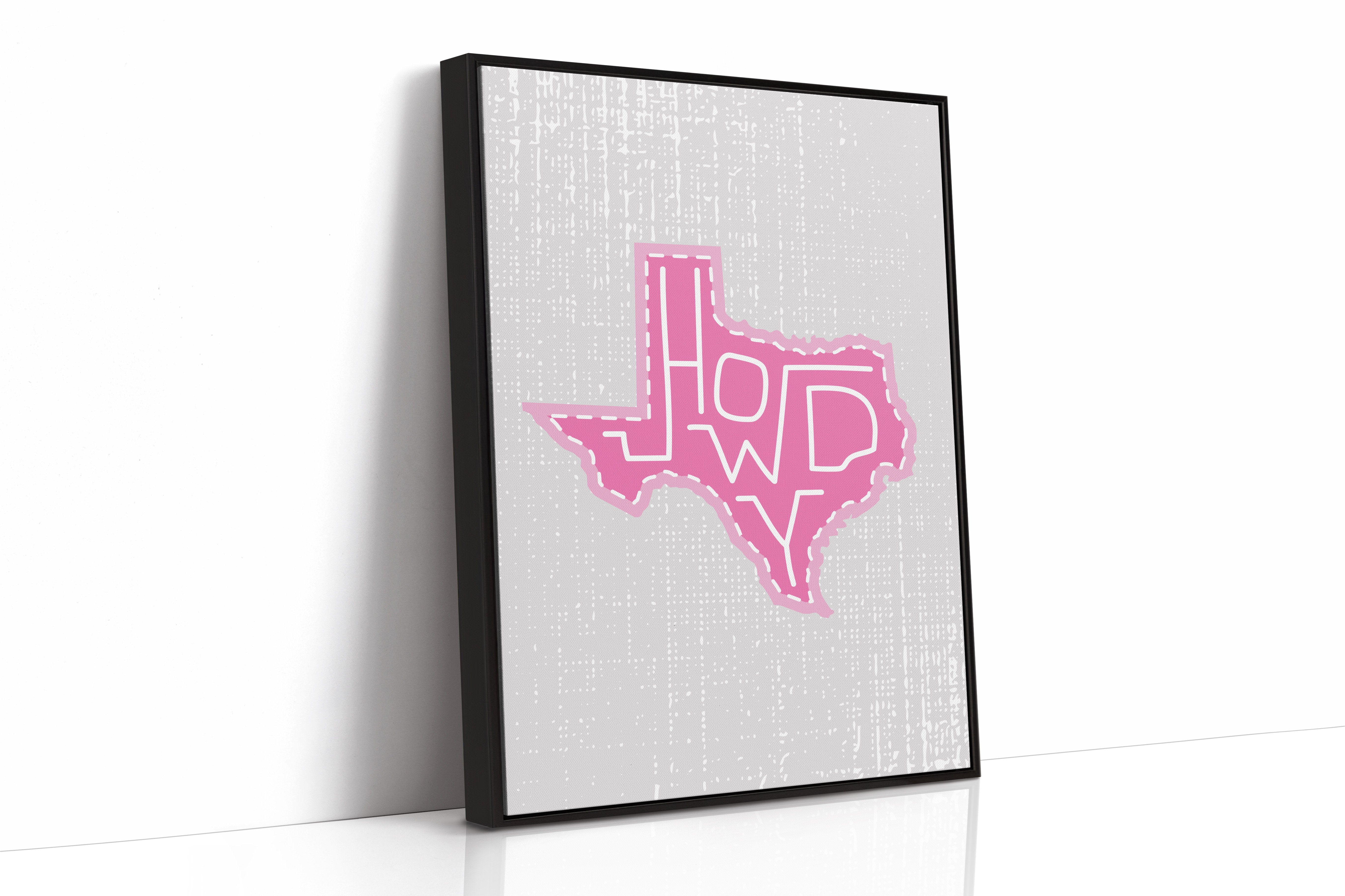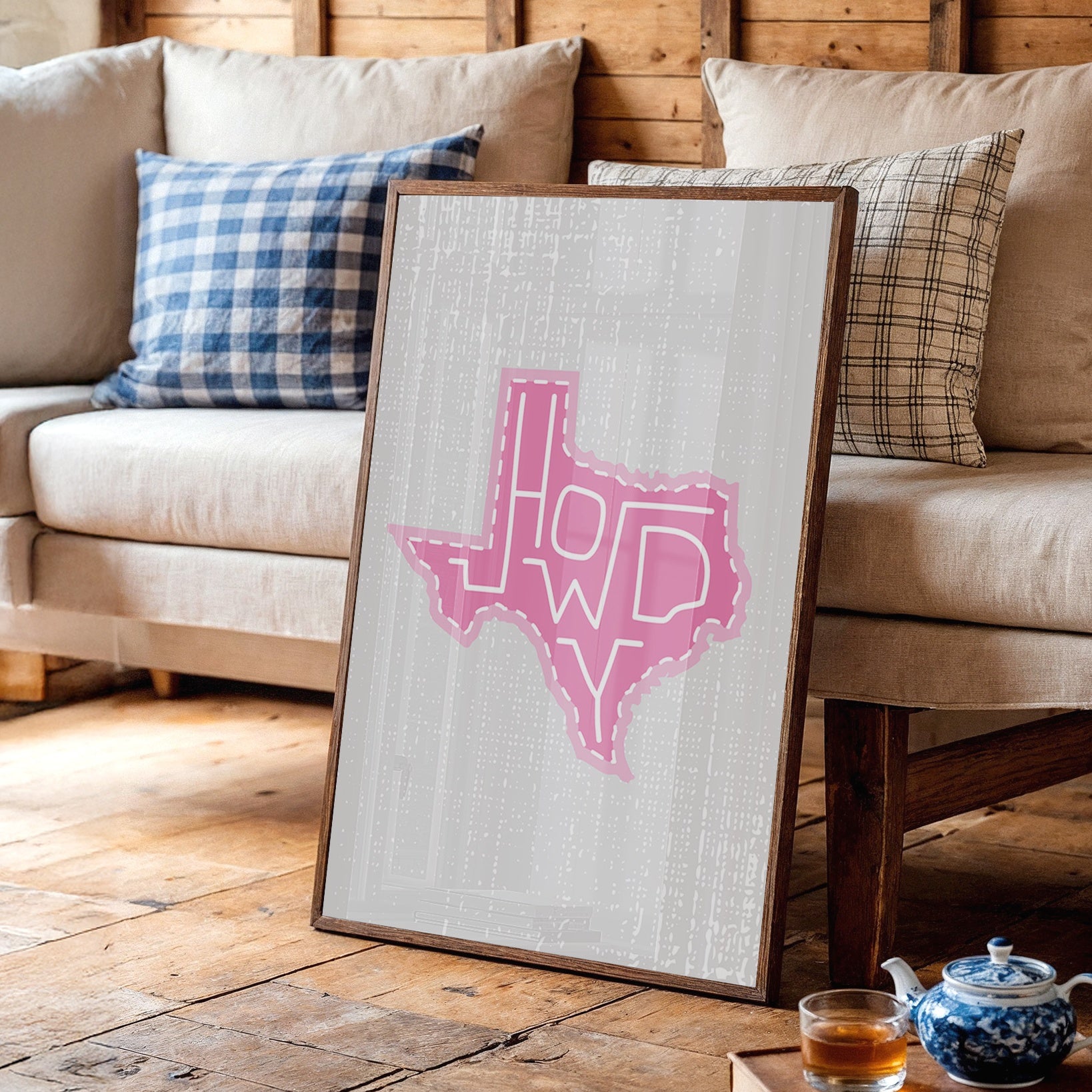 A vibrant pink Texas silhouette stands proud against a textured gray backdrop, the word ""HOWDY"" playfully stitched across its surface. The contrast between the soft pink hue and the rugged outline captures the duality of Texas spiritbold yet welcoming. White dotted lines trace the state's iconic shape, adding a handcrafted feel that speaks to tradition reimagined with contemporary flair. This piece brings a touch of Southern charm to modern spaces, perfect for adding personality to a home office or creating a conversation starter in an entryway.