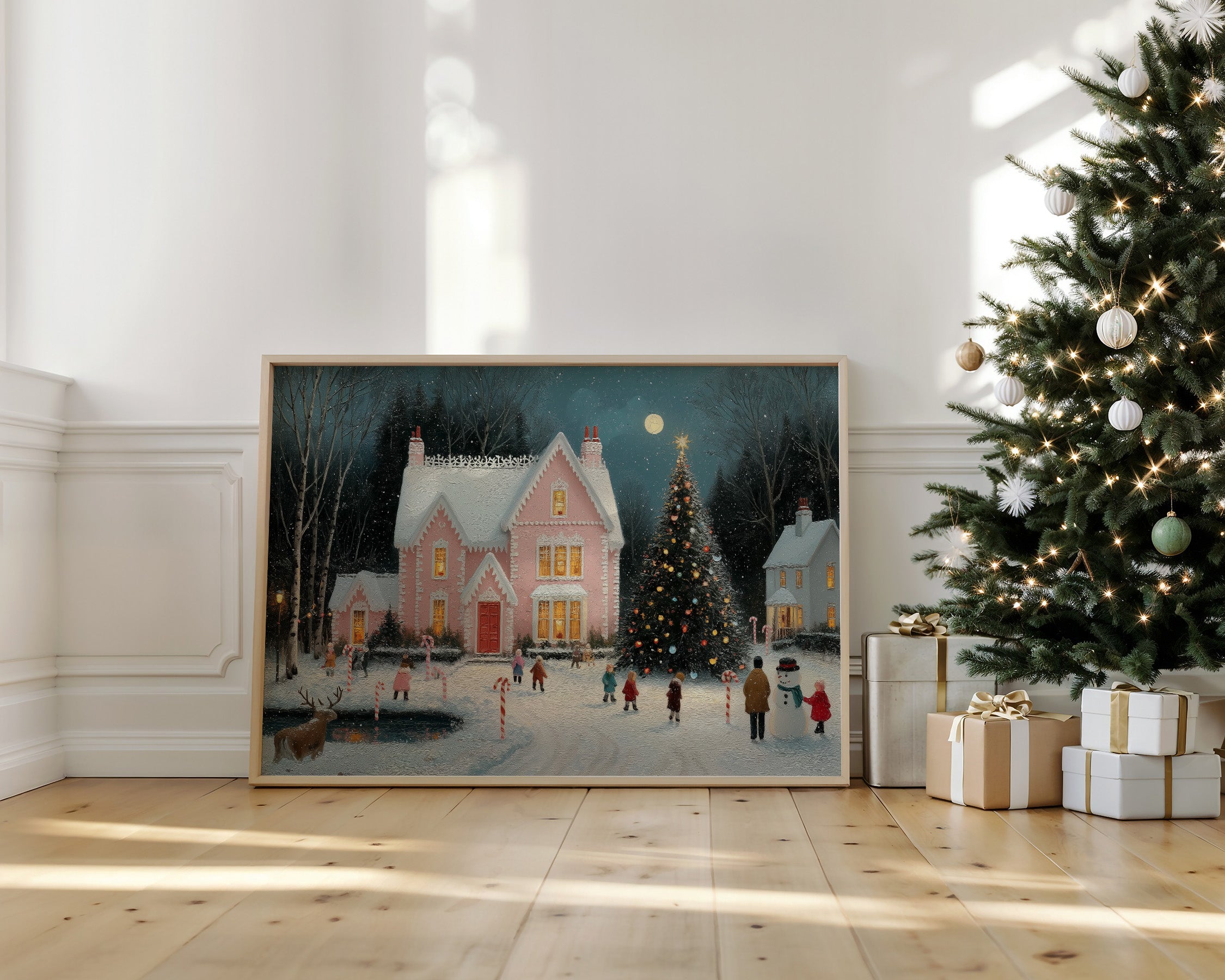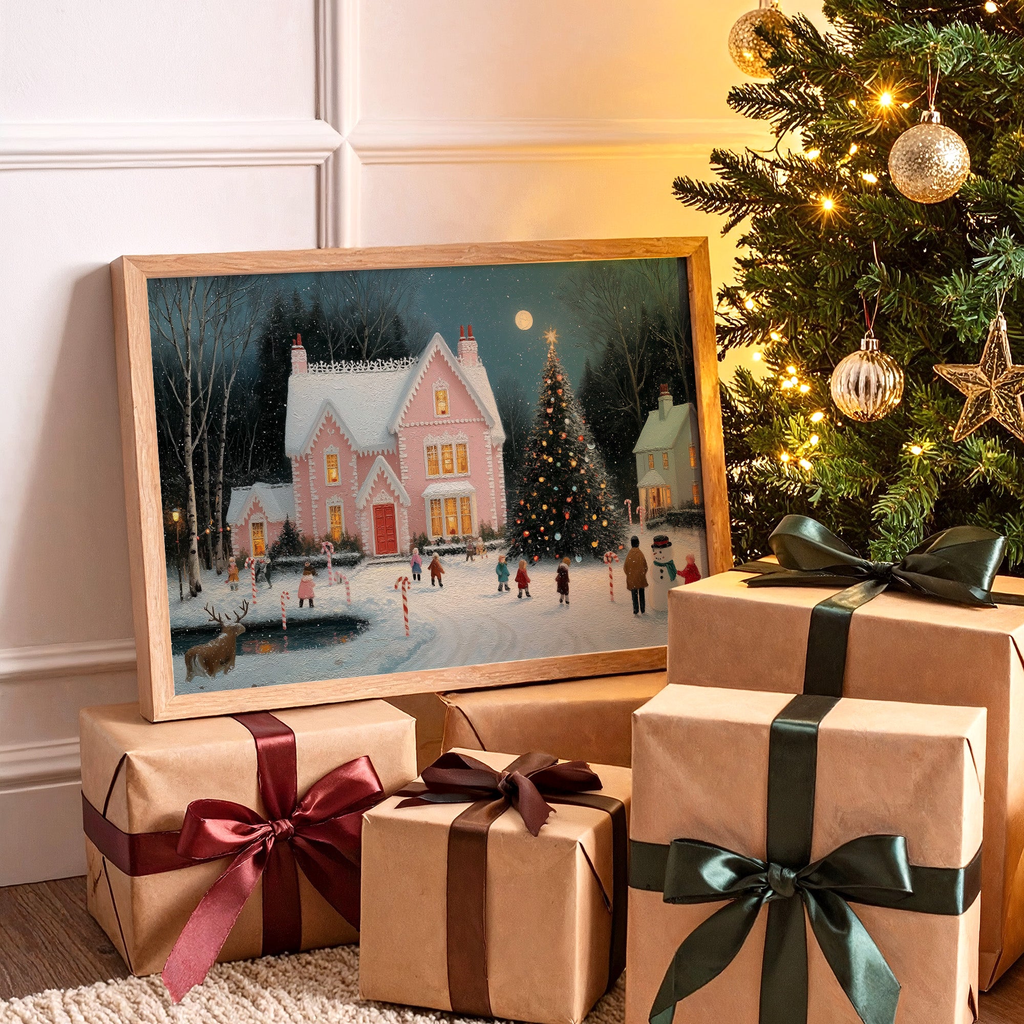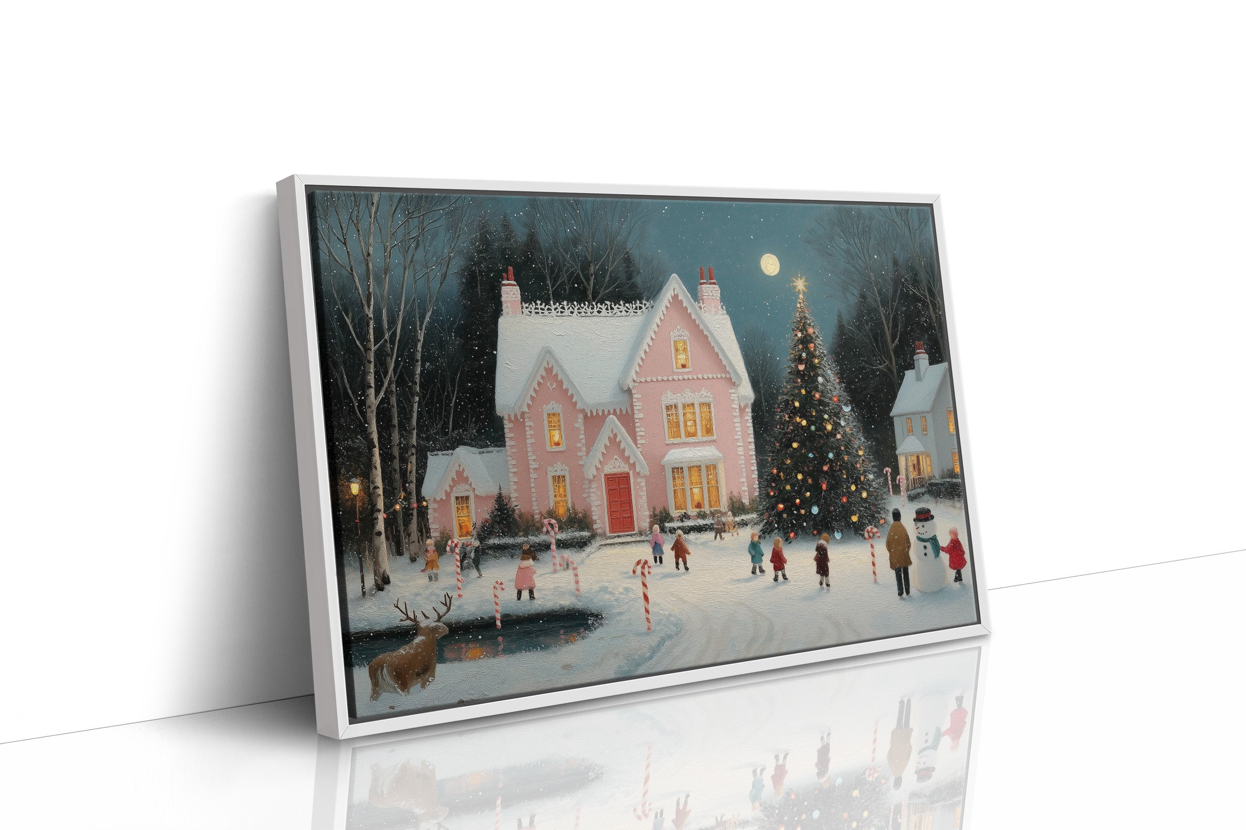 A charming winter evening unfolds as golden light spills from the windows of a pink Victorian house, casting warm rectangles across fresh snow. The scene captures the magical essence of Christmas, with children skating on a frozen pond while a majestic decorated tree sparkles beneath a full moon. Delicate snowflakes drift through the air, creating a dreamy atmosphere around the candy cane-lined pathways and cheerful snowman builders. This nostalgic winter tableau would bring seasonal charm to a living room or entryway, creating an inviting conversation piece that celebrates the wonder of holiday traditions.