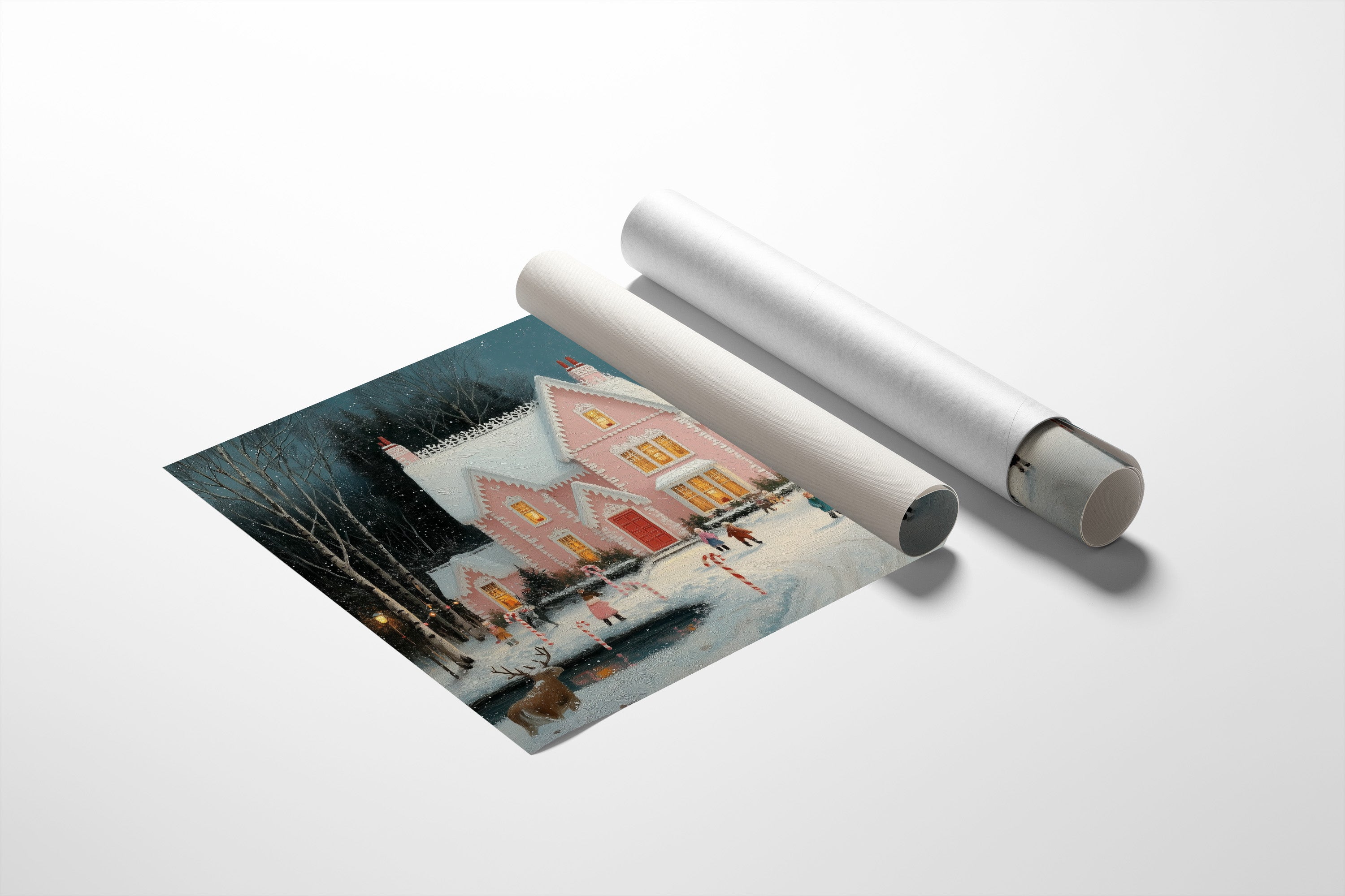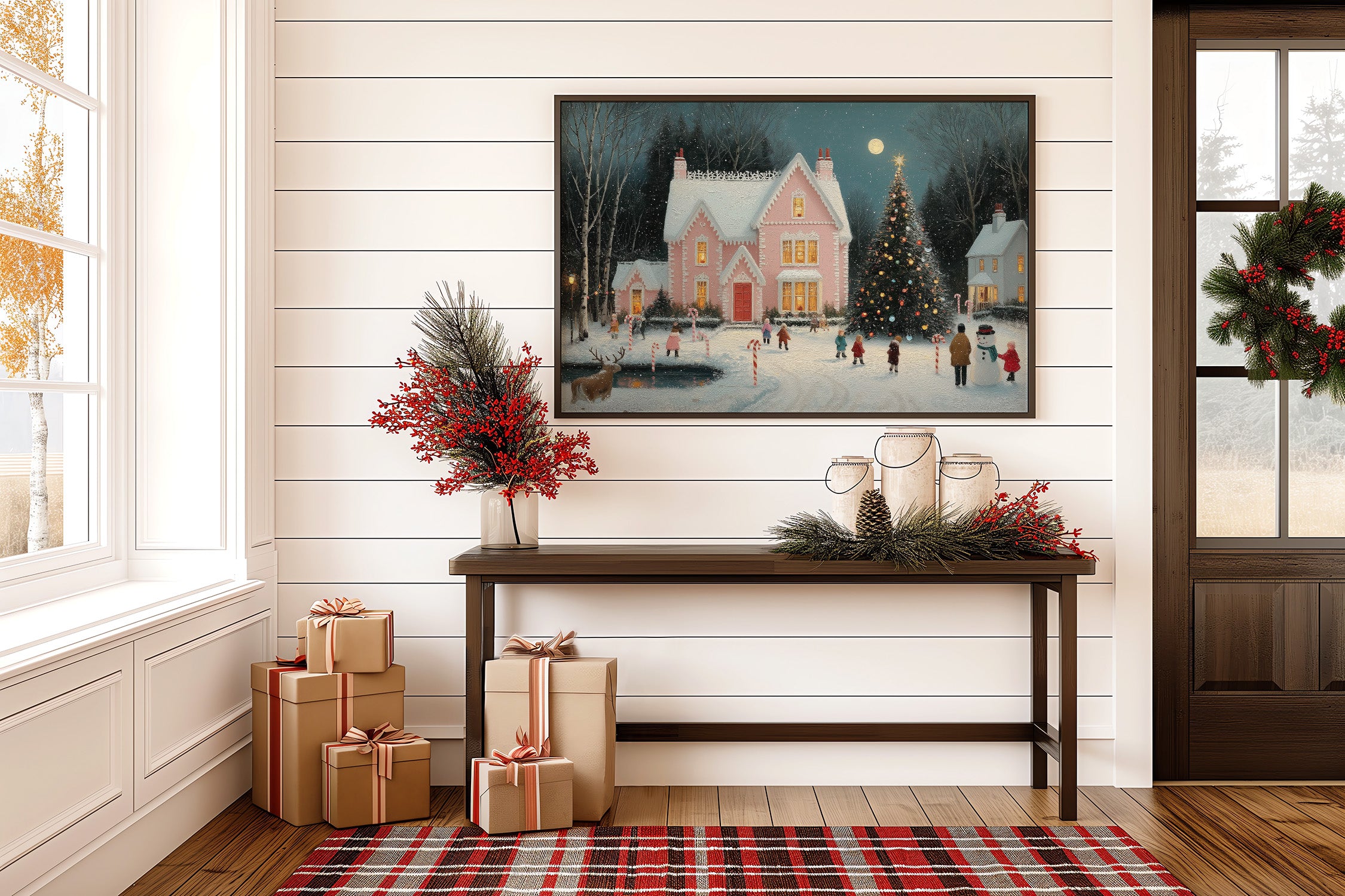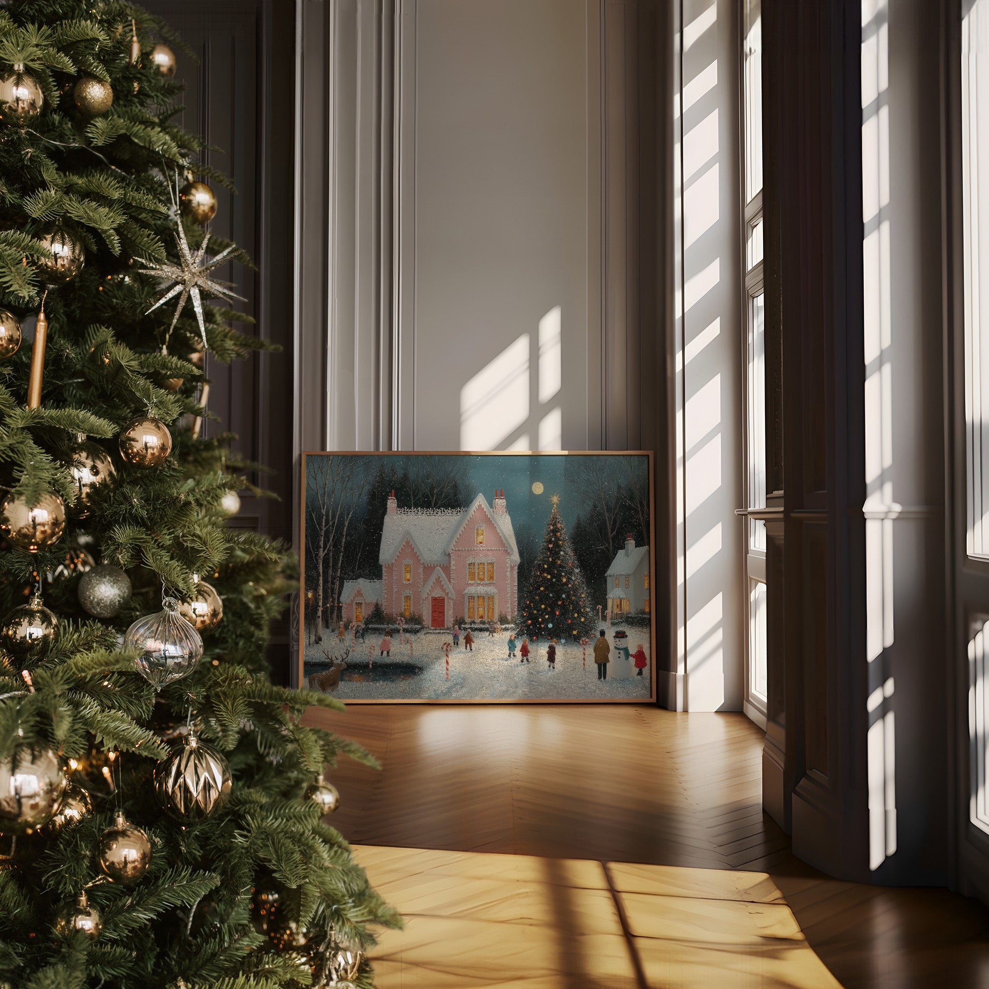 A charming winter evening unfolds as golden light spills from the windows of a pink Victorian house, casting warm rectangles across fresh snow. The scene captures the magical essence of Christmas, with children skating on a frozen pond while a majestic decorated tree sparkles beneath a full moon. Delicate snowflakes drift through the air, creating a dreamy atmosphere around the candy cane-lined pathways and cheerful snowman builders. This nostalgic winter tableau would bring seasonal charm to a living room or entryway, creating an inviting conversation piece that celebrates the wonder of holiday traditions.