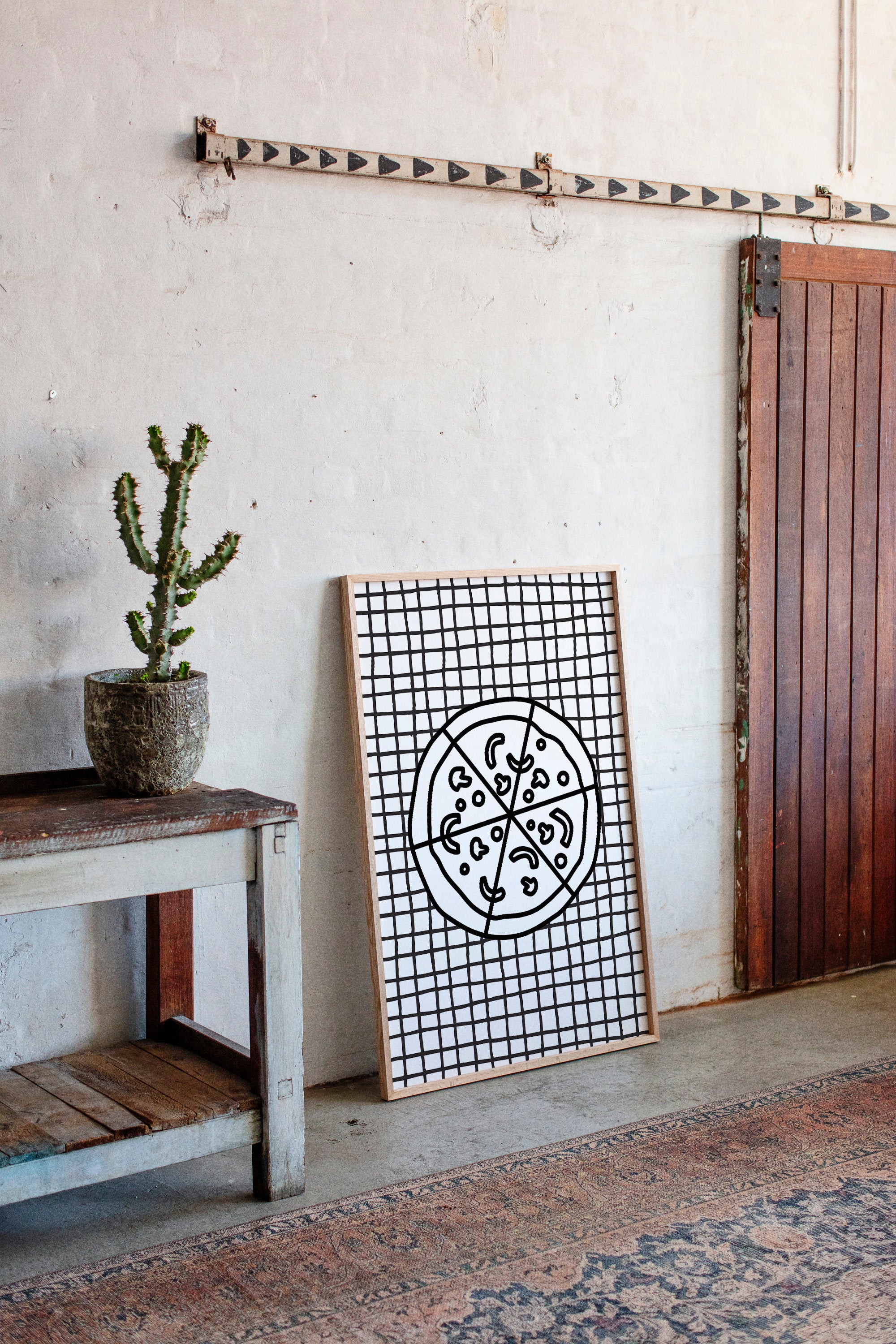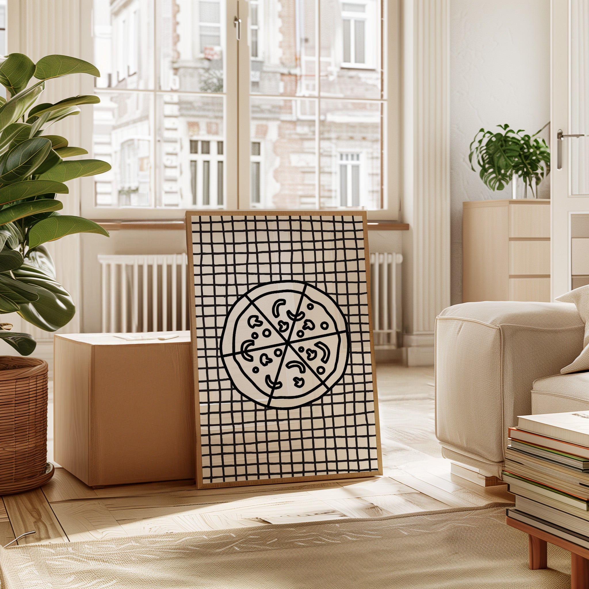 A simple moment captured in bold strokes - a pizza rests atop a classic checkered pattern, like a cherished memory from a neighborhood trattoria. This piece from our Contemporary collection celebrates the beauty in everyday dining through minimalist line art. The stark black and white composition creates a powerful graphic statement, with the pizza's perfect circular form contrasting against the rhythmic grid of the tablecloth. The playful toppings dance across the divided surface, creating a delightful geometry of their own. Perfect for adding personality to a modern kitchen, dining room, or restaurant space. Each viewing invites a new appreciation for the artistry found in life's simple pleasures.