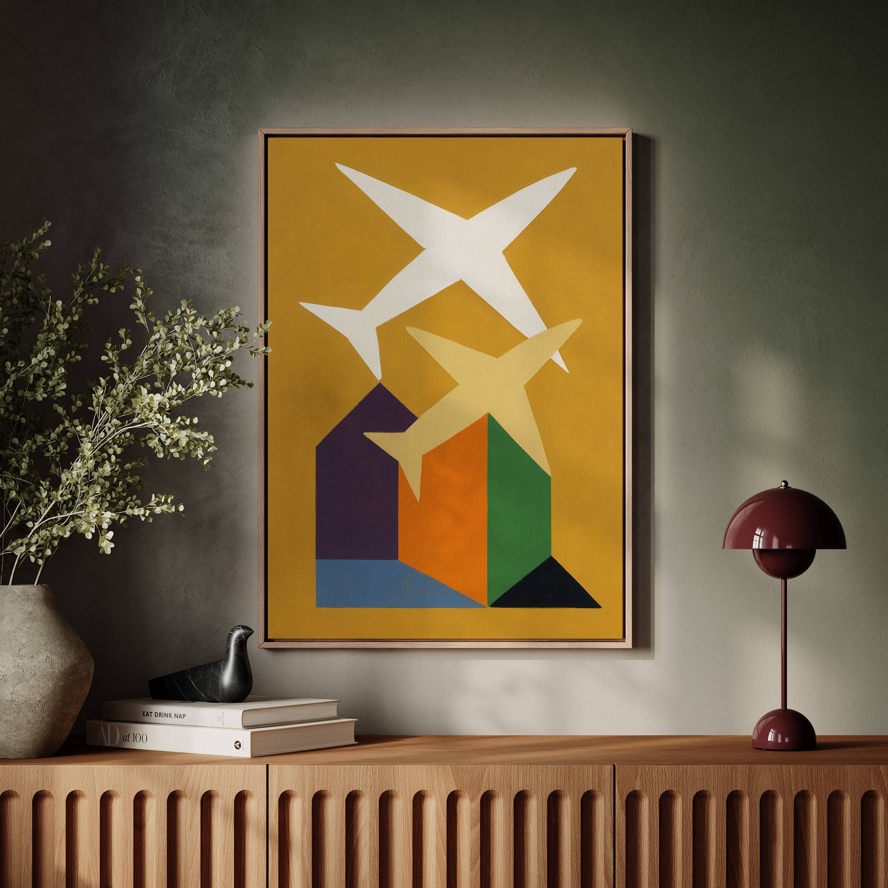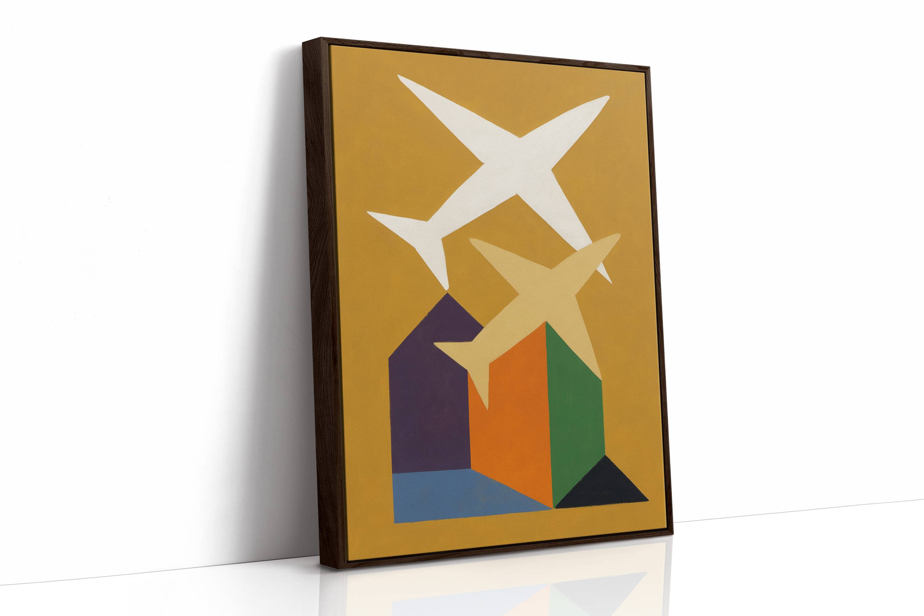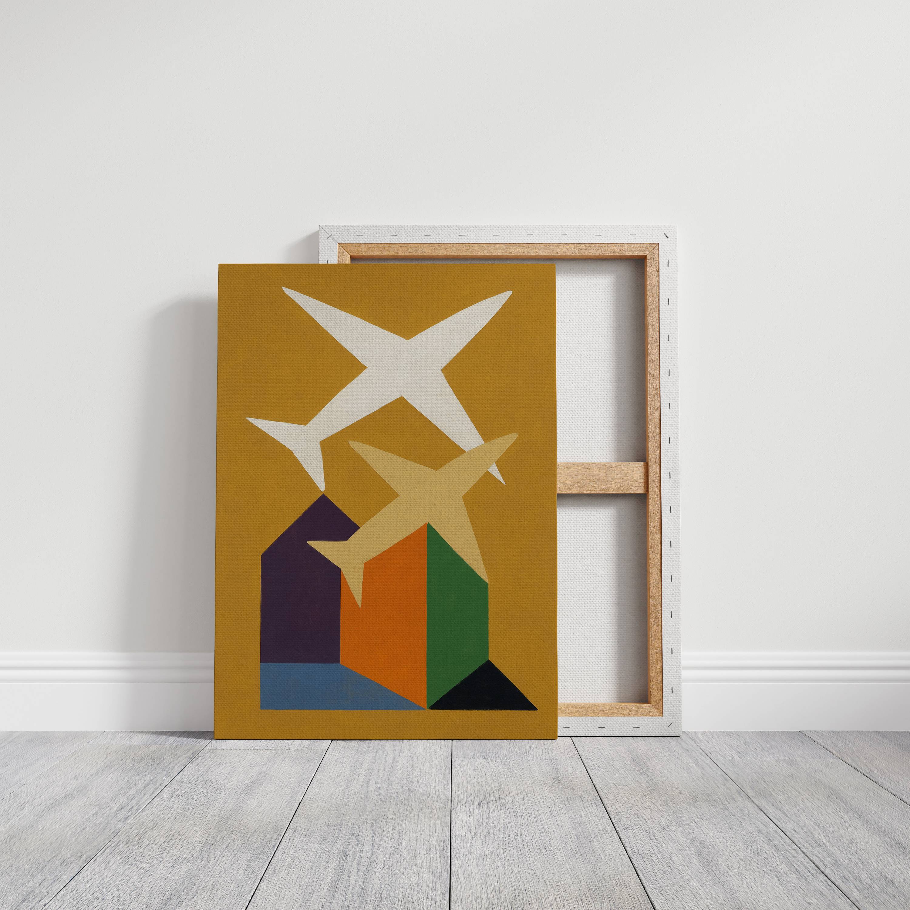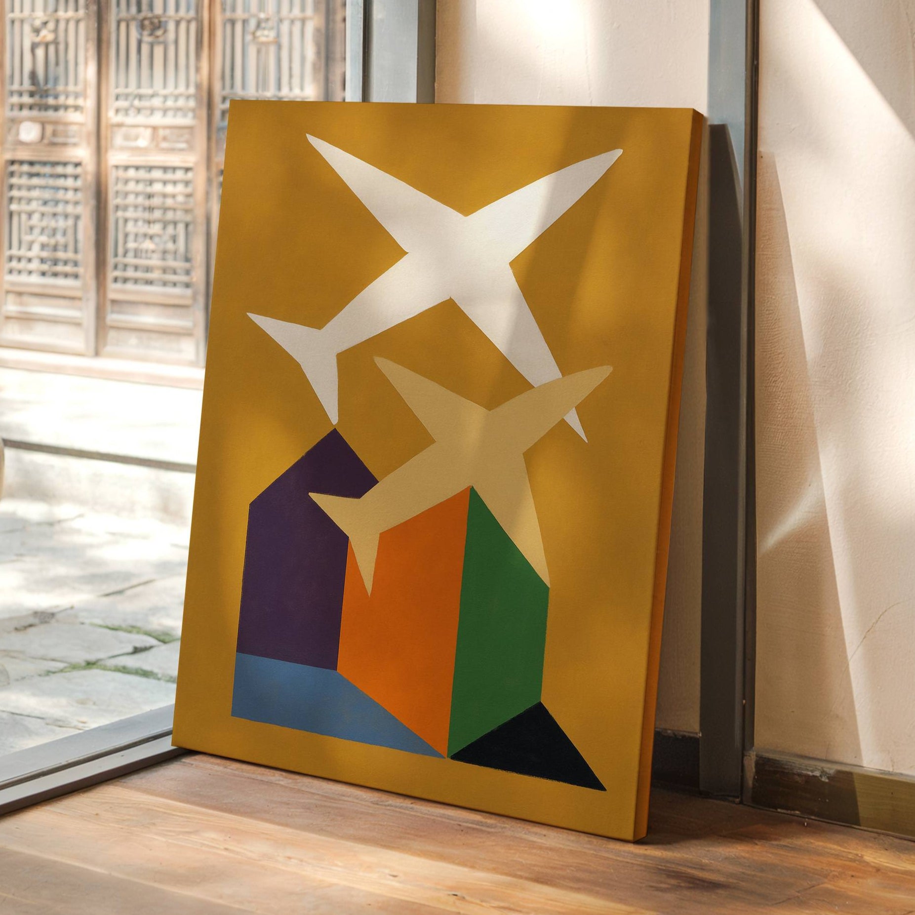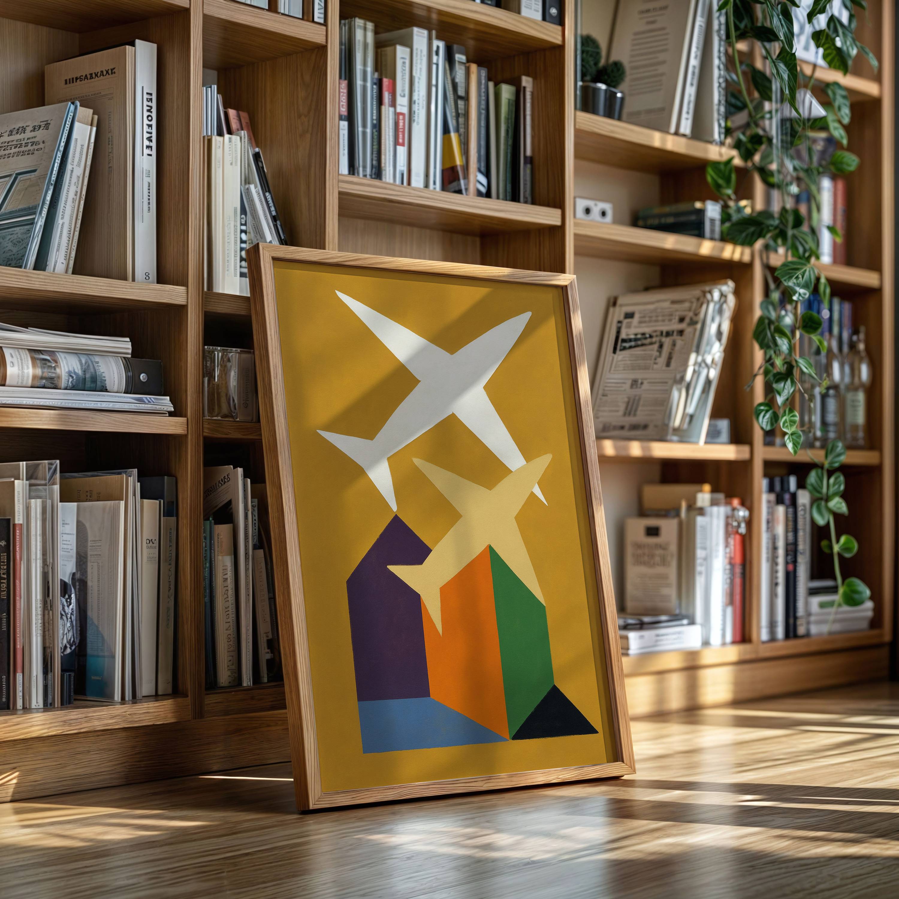 Against a warm ochre sky, two aircraft silhouettes dance in geometric harmony. The stark white and golden planes hover above a colorful cityscape rendered in bold, modernist blocks of purple, orange, and green. The composition marries the organic curves of flight with the rigid angles of urban architecture, creating a striking study in contrast and movement. This contemporary piece speaks to the intersection of human achievement - both in architecture and aviation. Perfect for a modern office space, creative studio, or any room seeking to capture the energy of urban life and the freedom of flight.