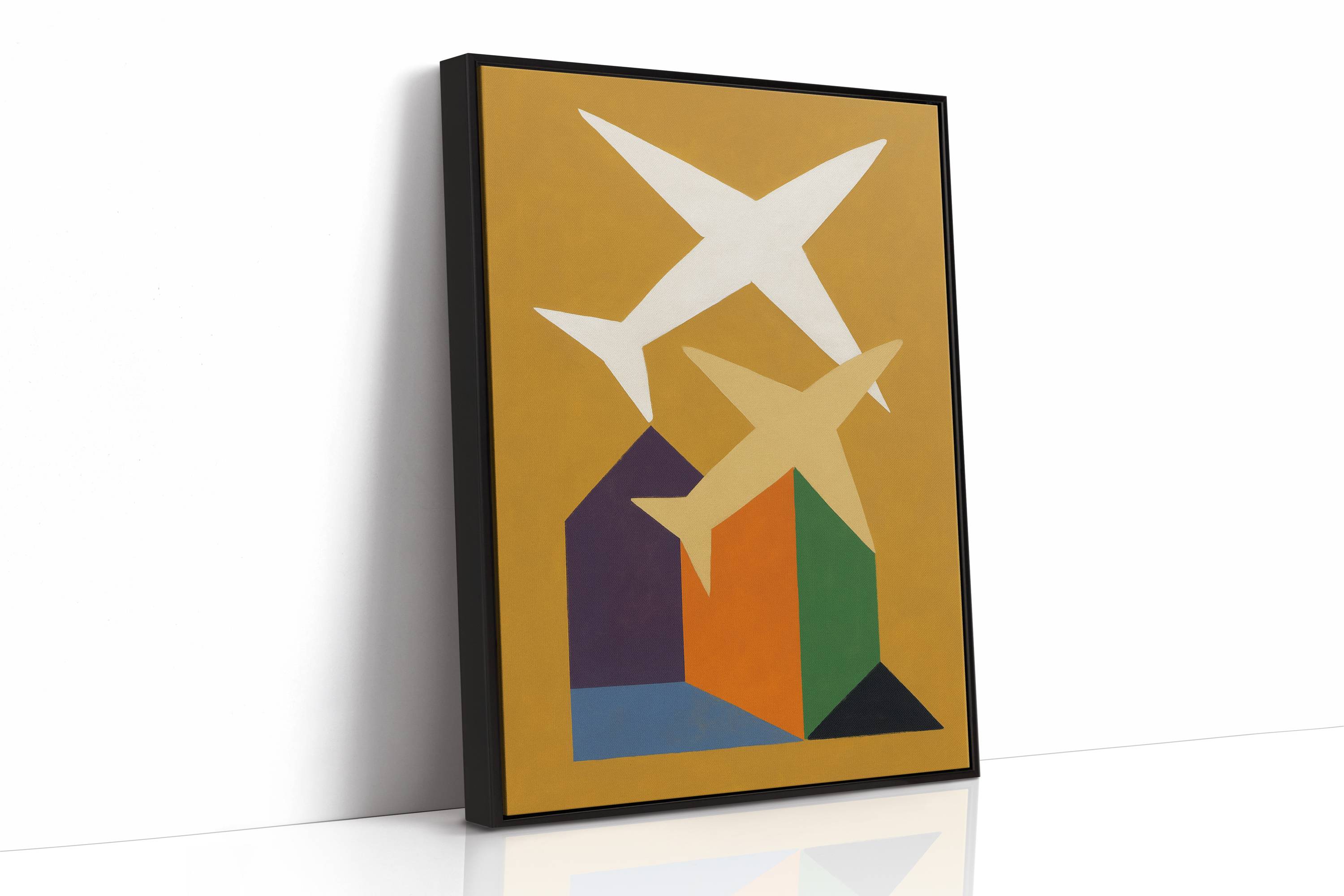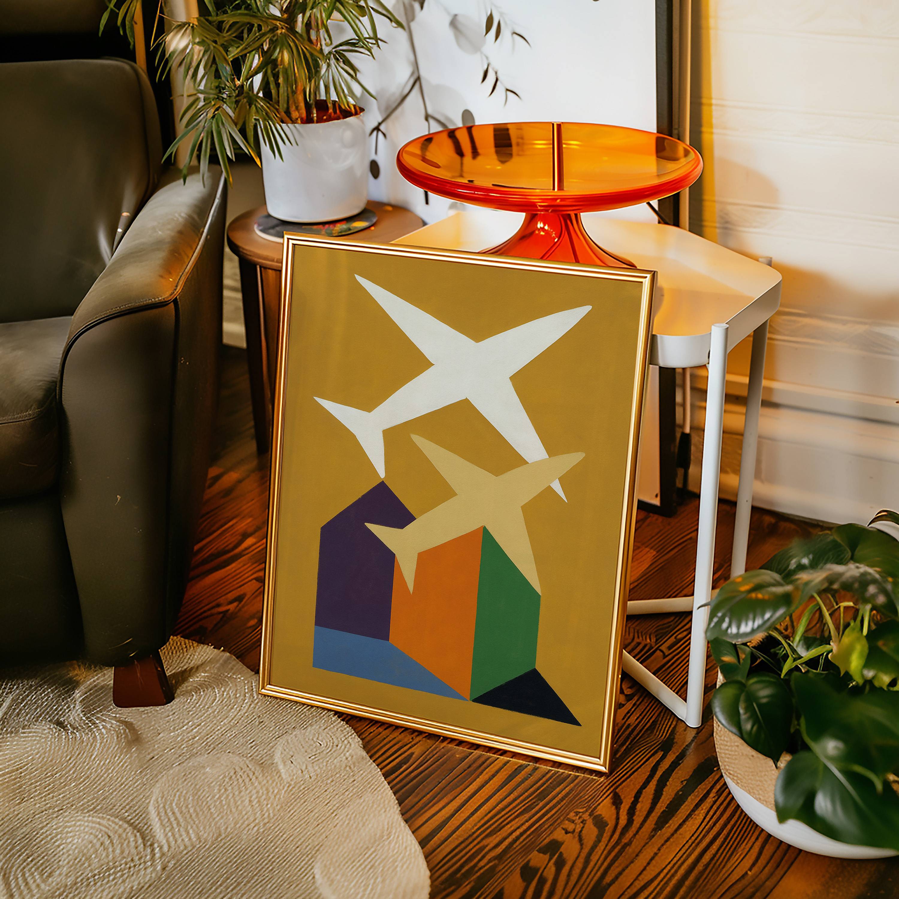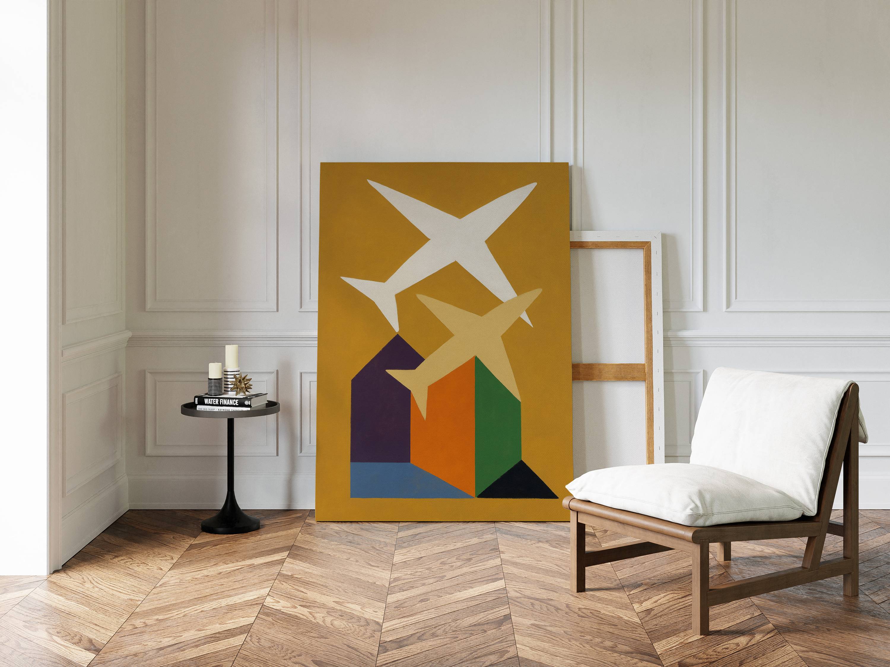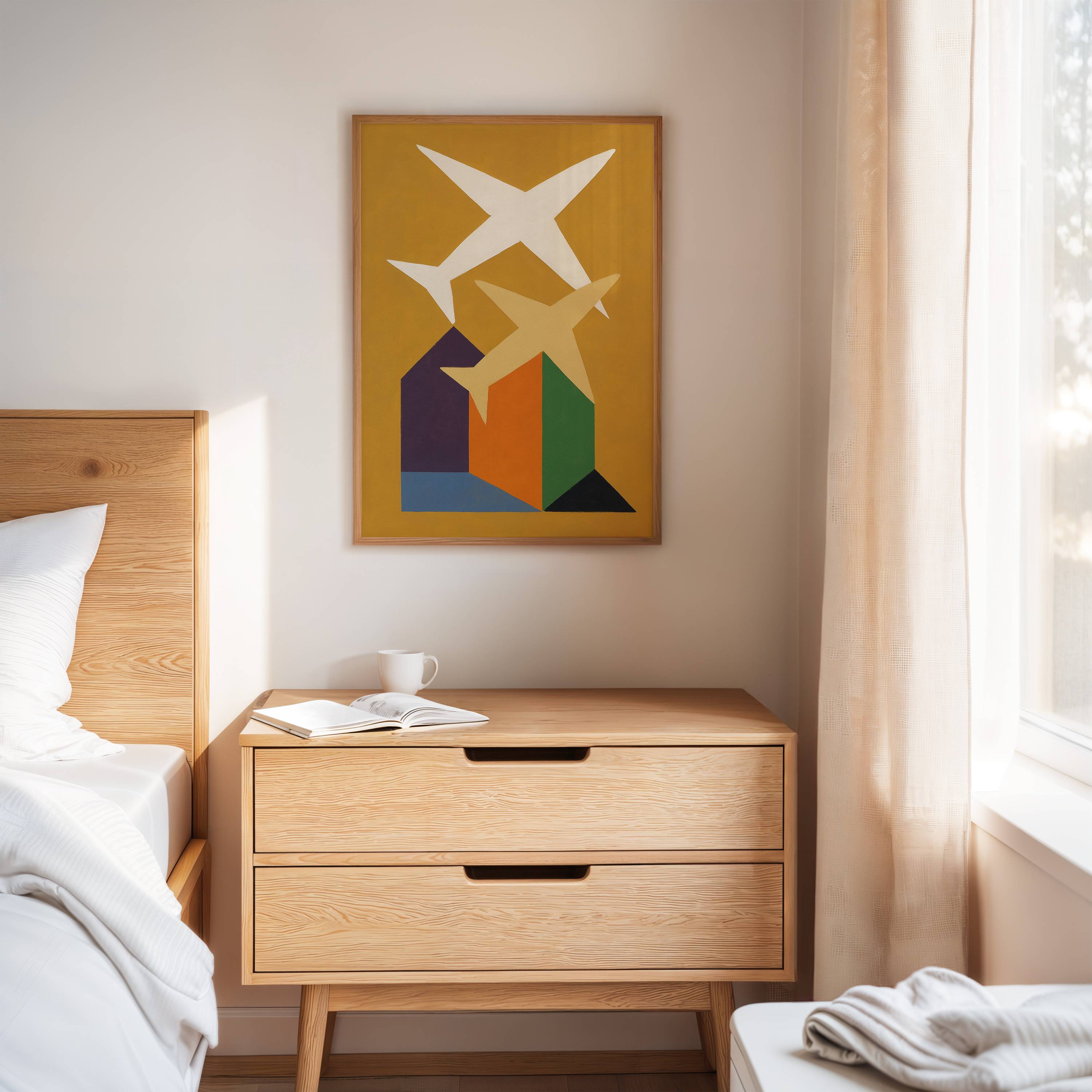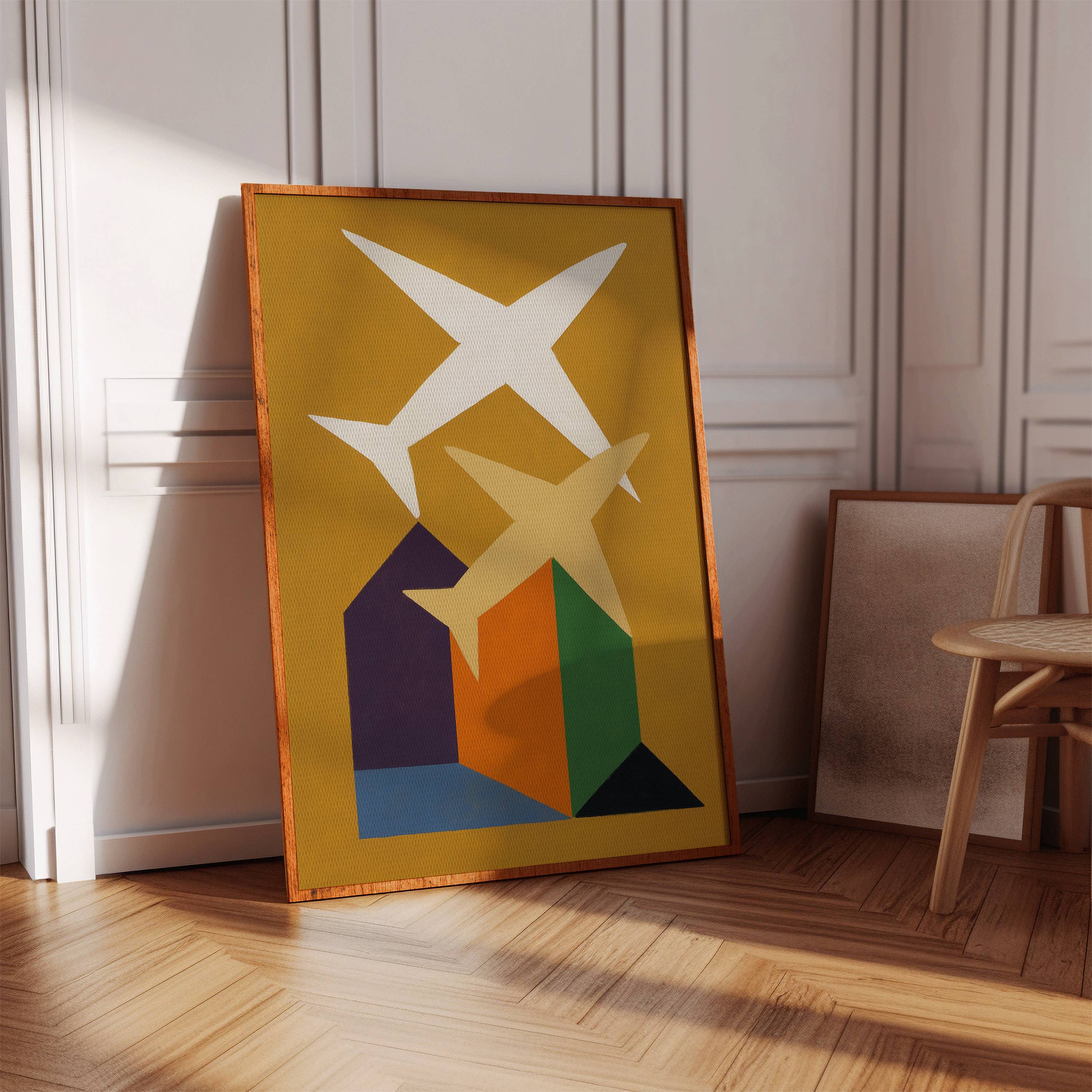 Against a warm ochre sky, two aircraft silhouettes dance in geometric harmony. The stark white and golden planes hover above a colorful cityscape rendered in bold, modernist blocks of purple, orange, and green. The composition marries the organic curves of flight with the rigid angles of urban architecture, creating a striking study in contrast and movement. This contemporary piece speaks to the intersection of human achievement - both in architecture and aviation. Perfect for a modern office space, creative studio, or any room seeking to capture the energy of urban life and the freedom of flight.