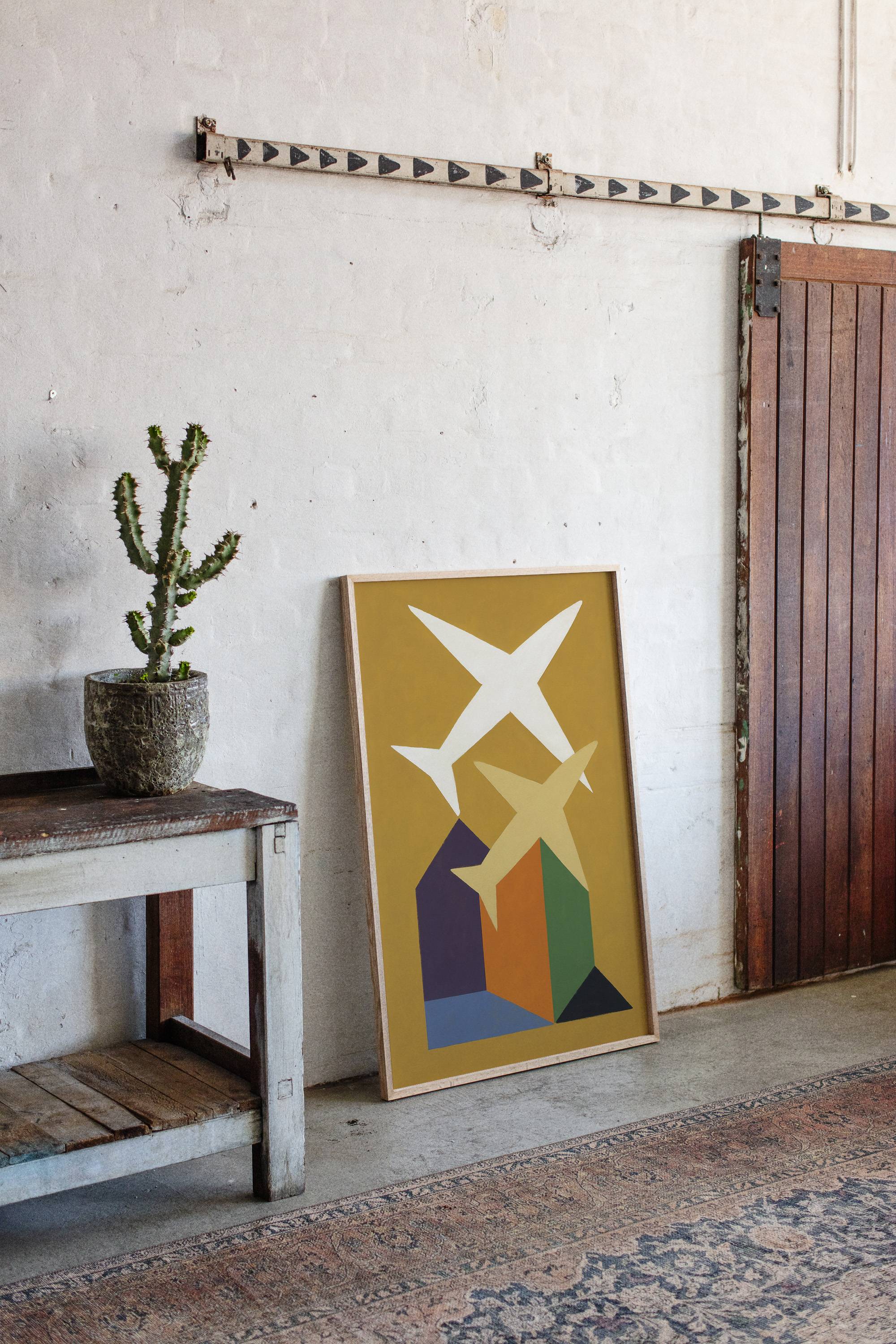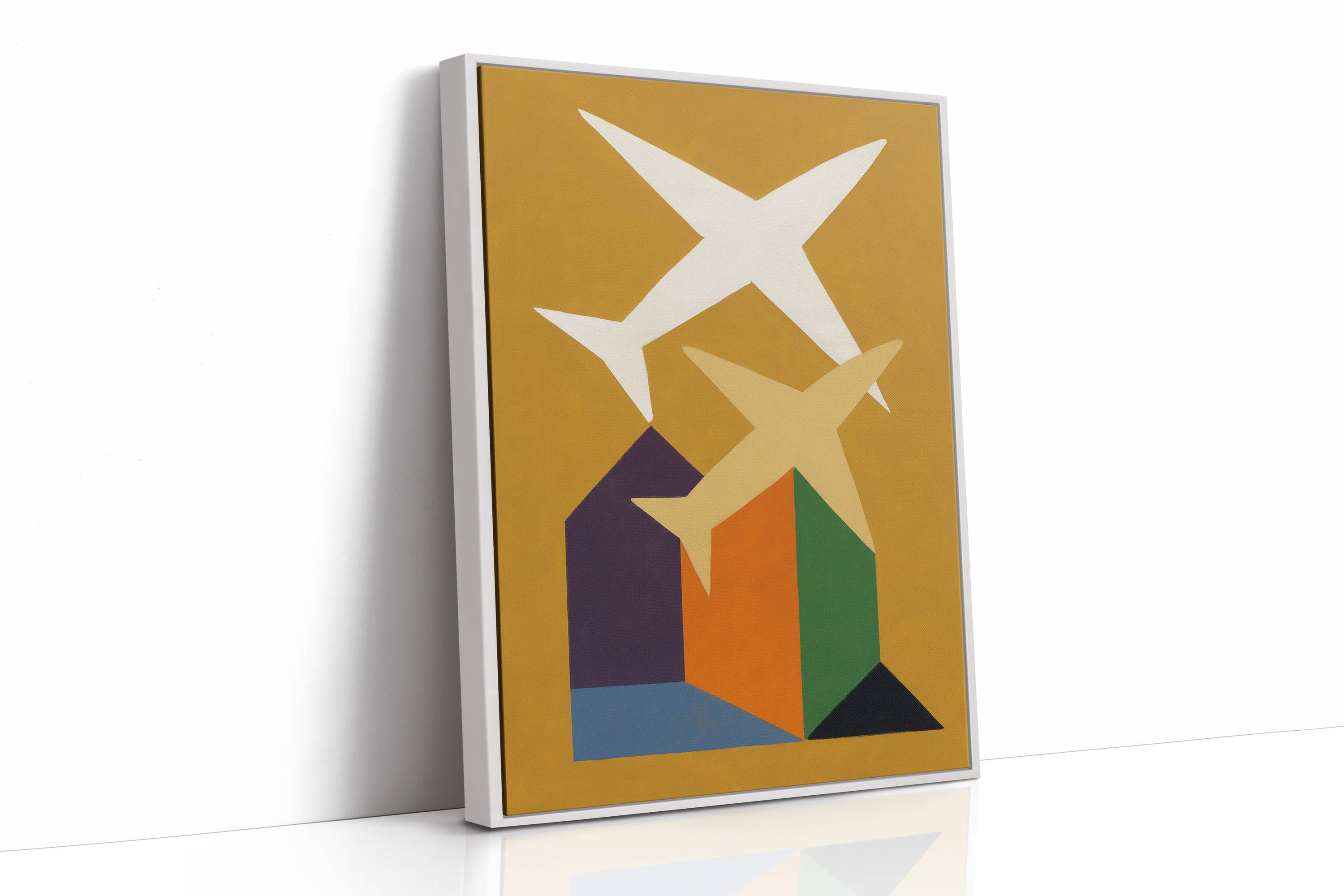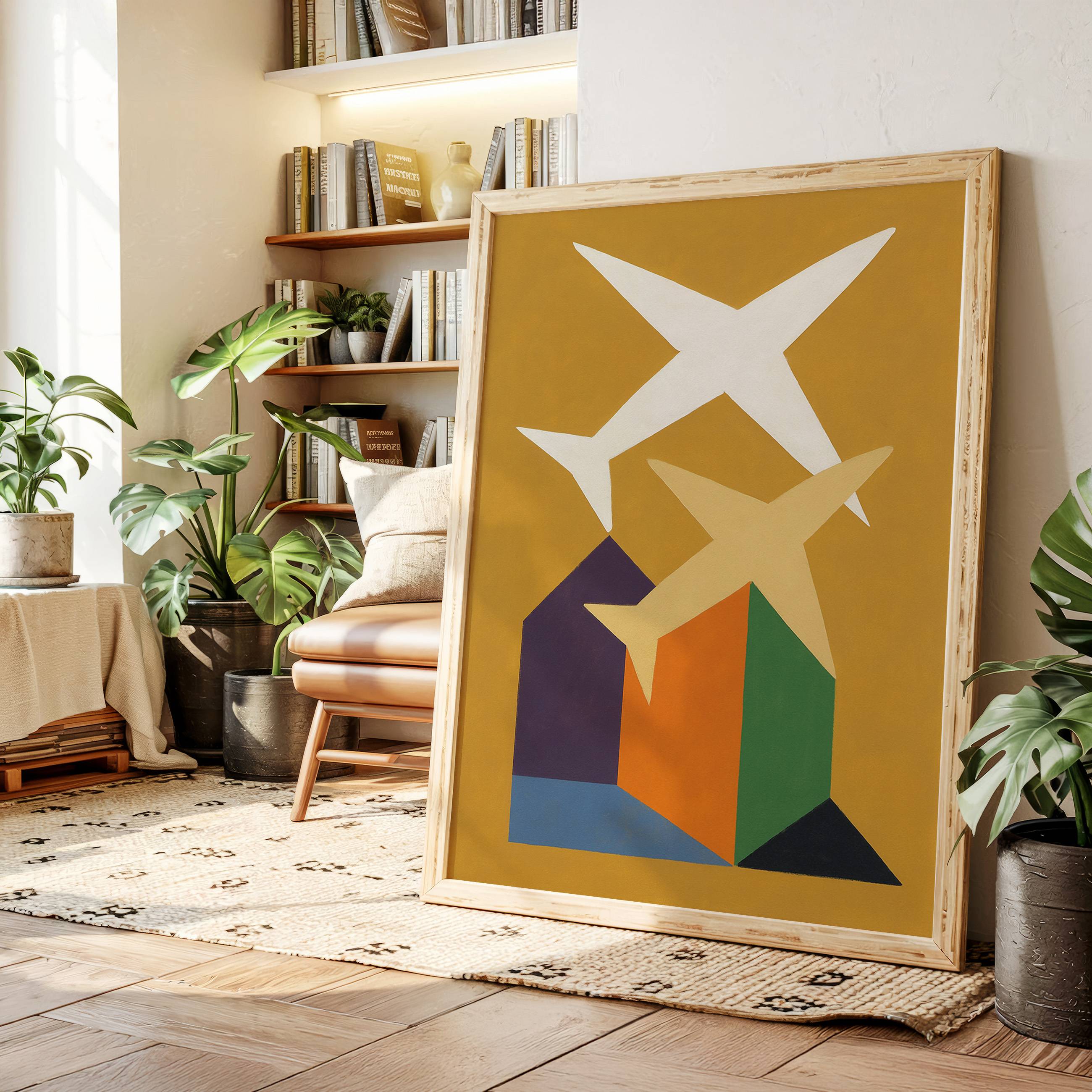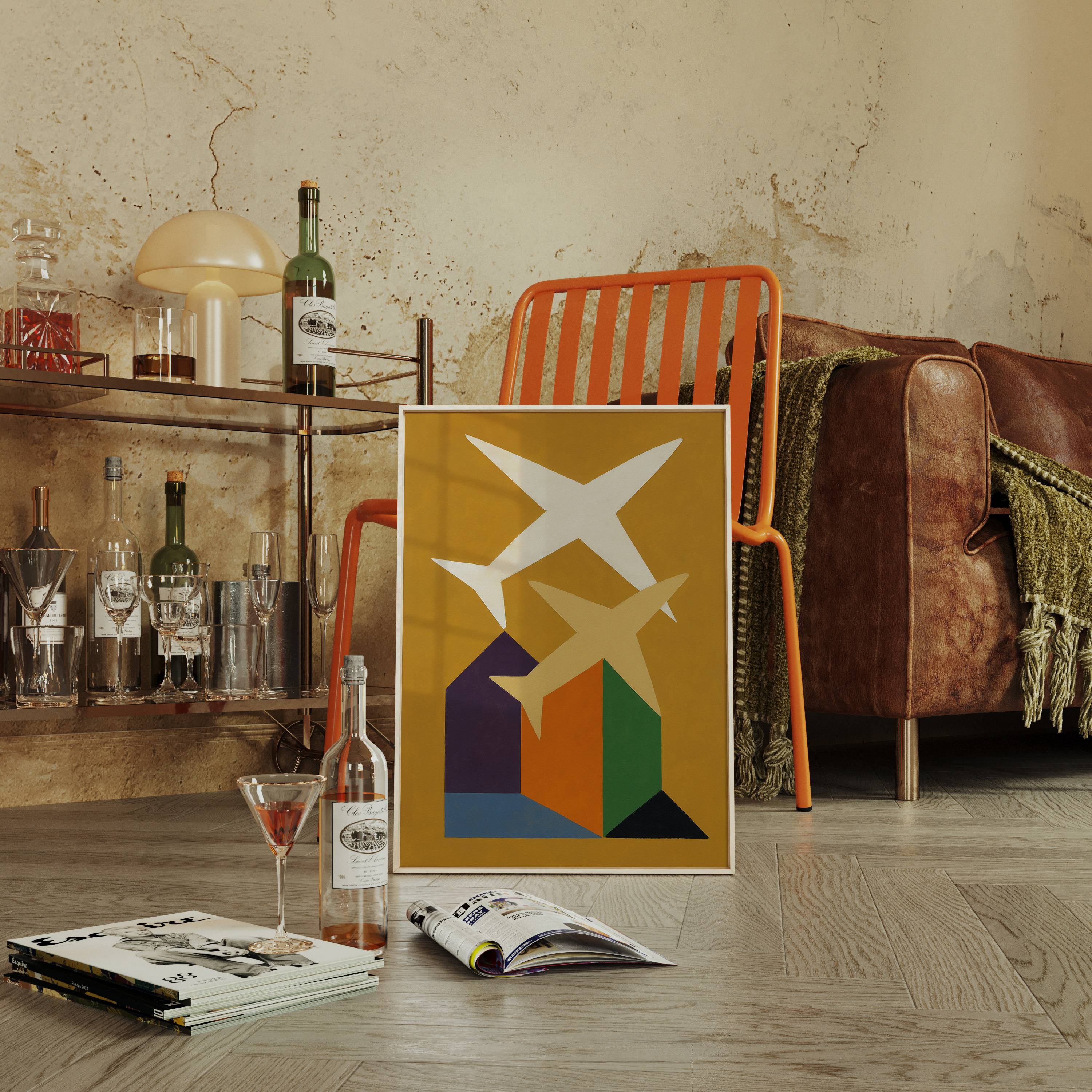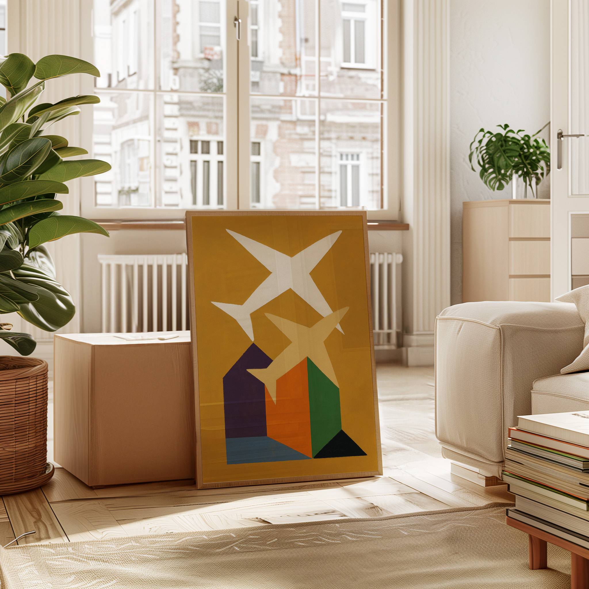 Against a warm ochre sky, two aircraft silhouettes dance in geometric harmony. The stark white and golden planes hover above a colorful cityscape rendered in bold, modernist blocks of purple, orange, and green. The composition marries the organic curves of flight with the rigid angles of urban architecture, creating a striking study in contrast and movement. This contemporary piece speaks to the intersection of human achievement - both in architecture and aviation. Perfect for a modern office space, creative studio, or any room seeking to capture the energy of urban life and the freedom of flight.