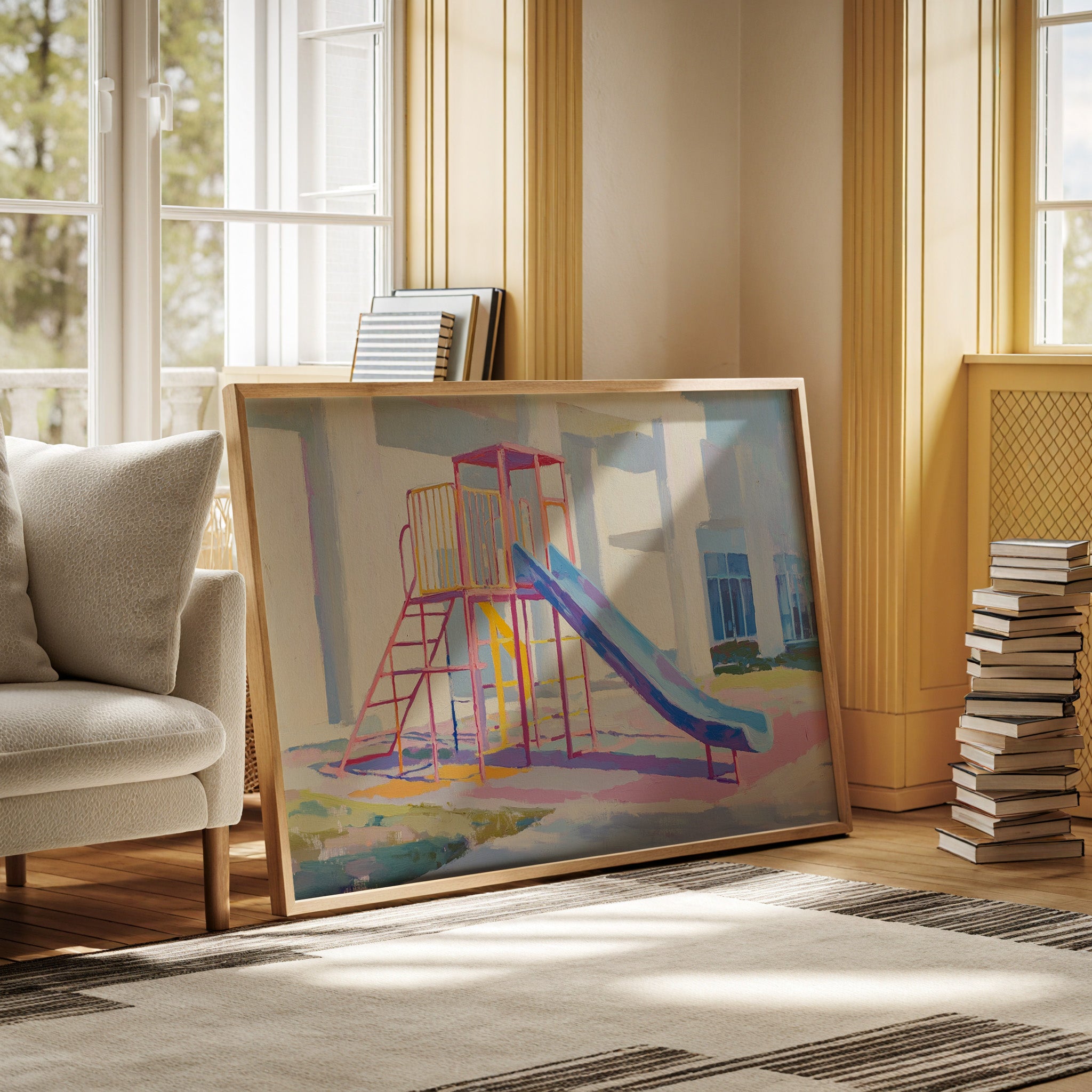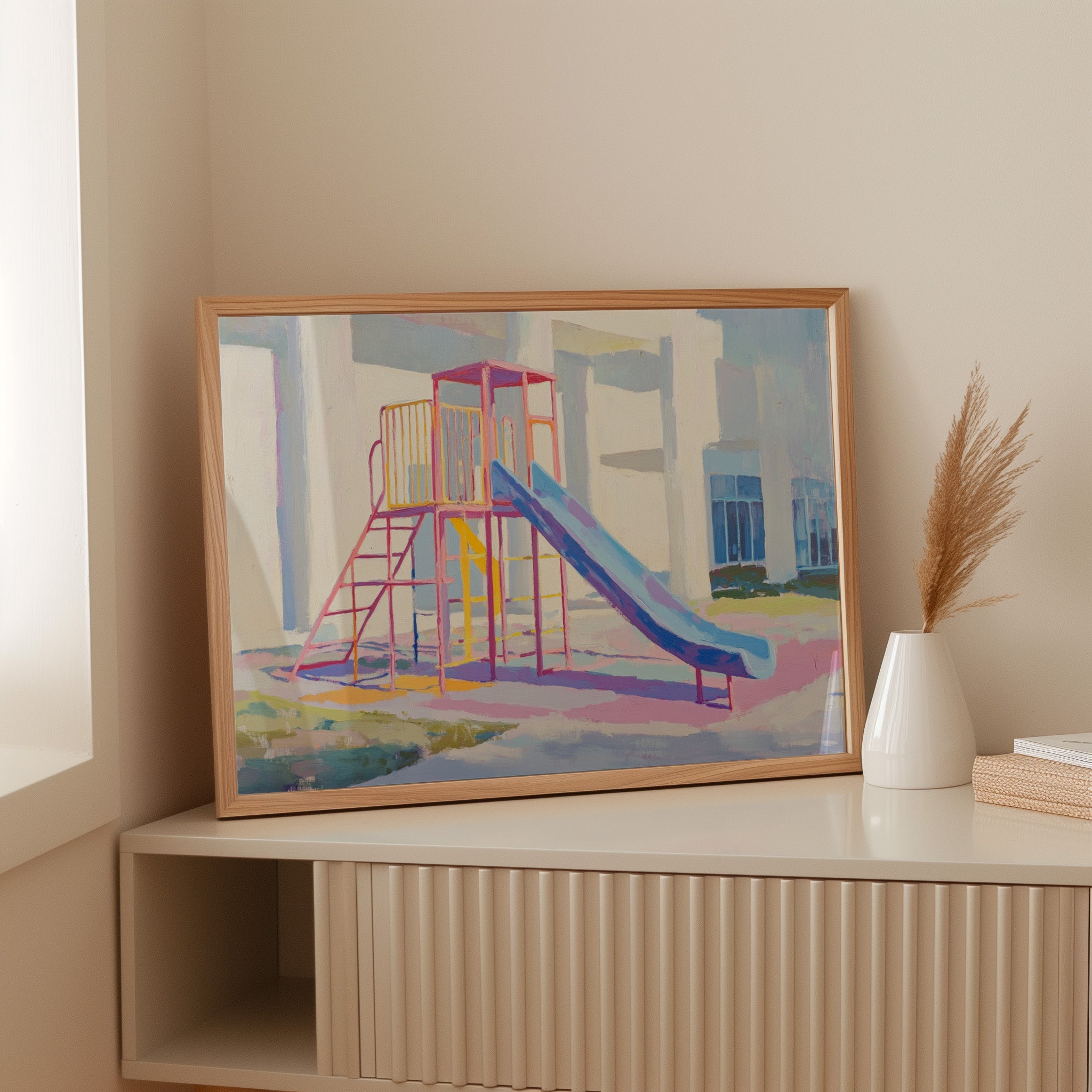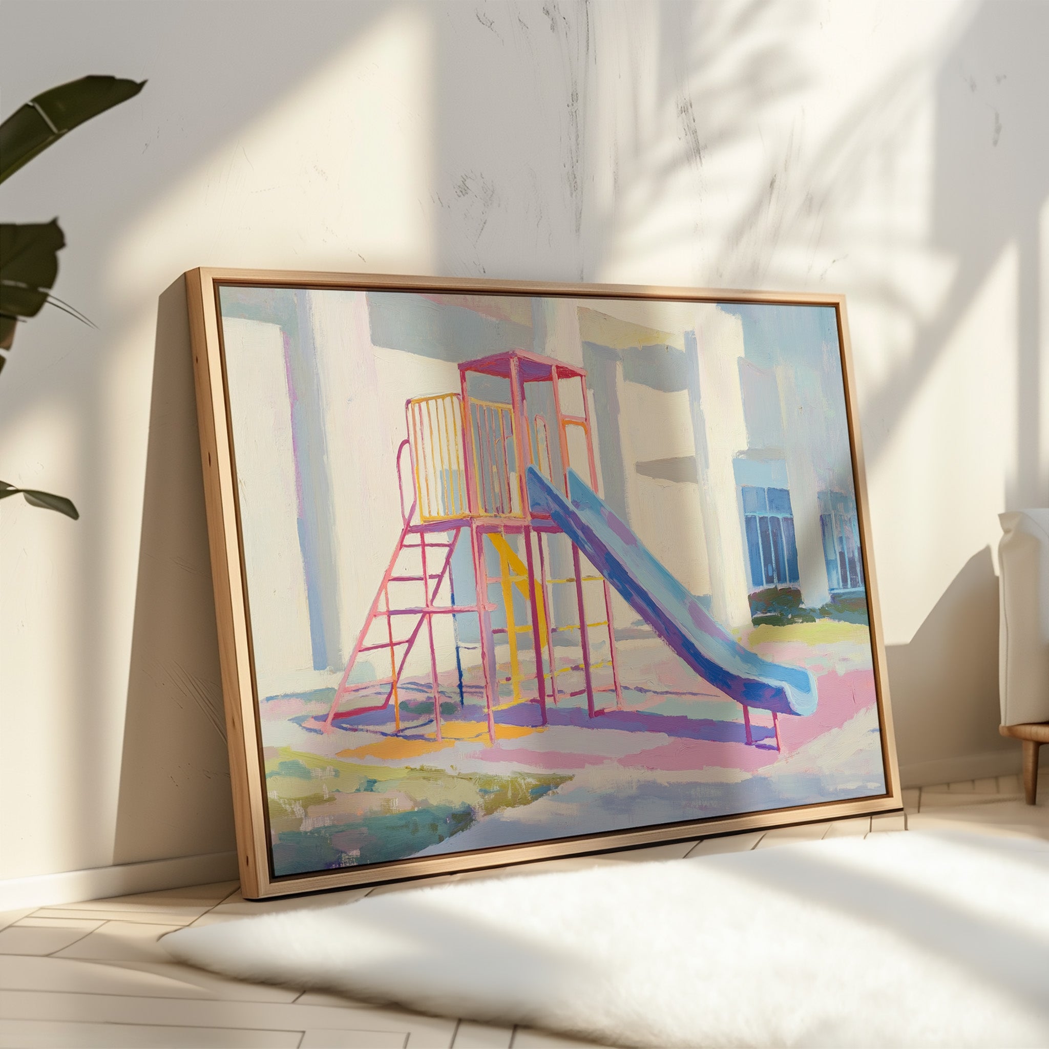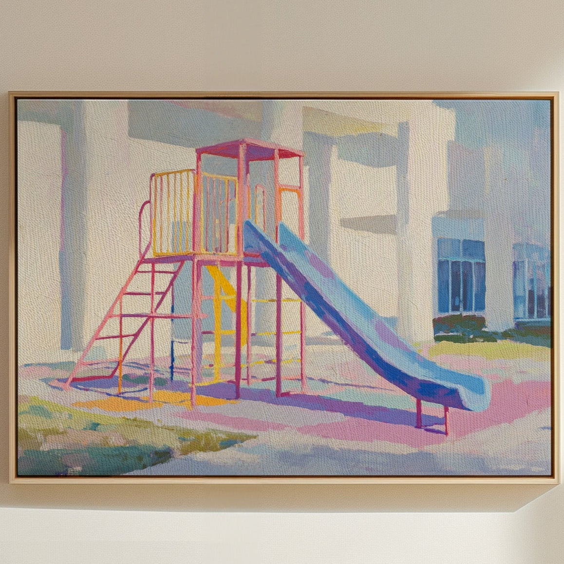 Morning light casts gentle shadows across an empty playground, creating a canvas of nostalgia and possibility. The slide's brilliant blue sweeps down like a frozen waterfall, while pink and yellow climbing frames stand proud against white walls. Brushstrokes capture the essence of childhood joy in pastel hues, transforming an ordinary play structure into a meditation on memory and innocence. This contemporary piece brings warmth and whimsy to any space, perfect for a child's room or a modern home office where playful energy meets sophisticated style.