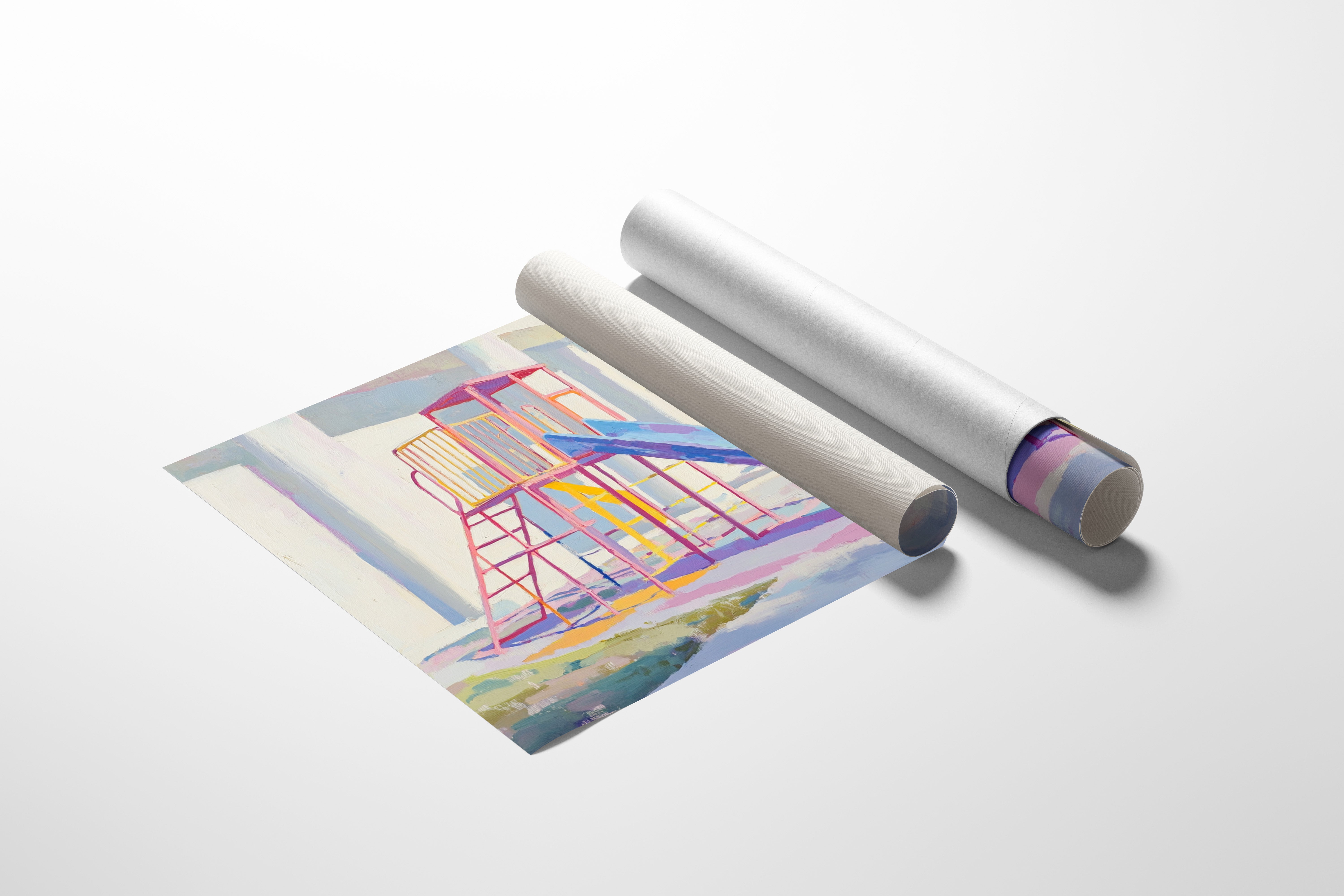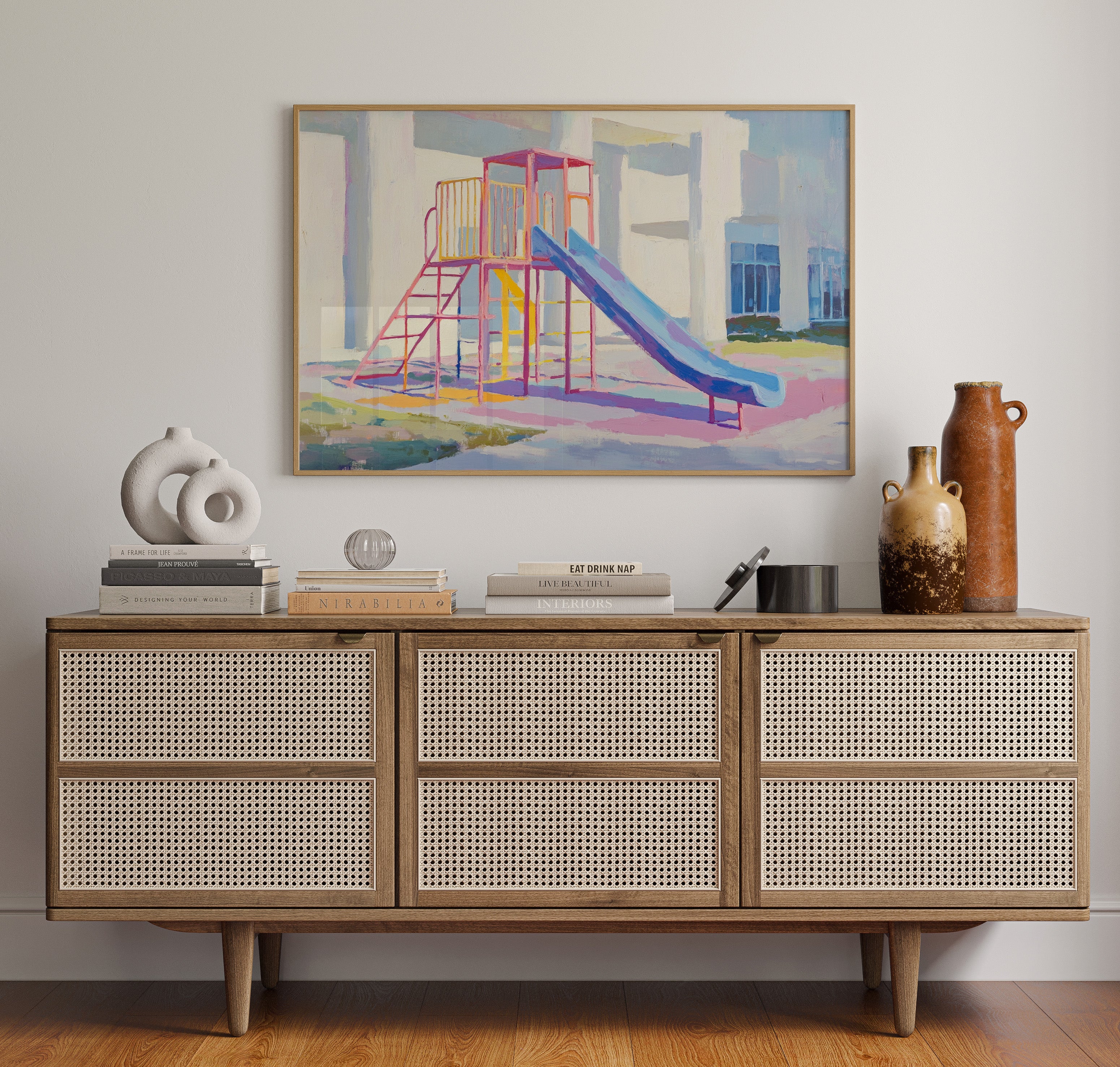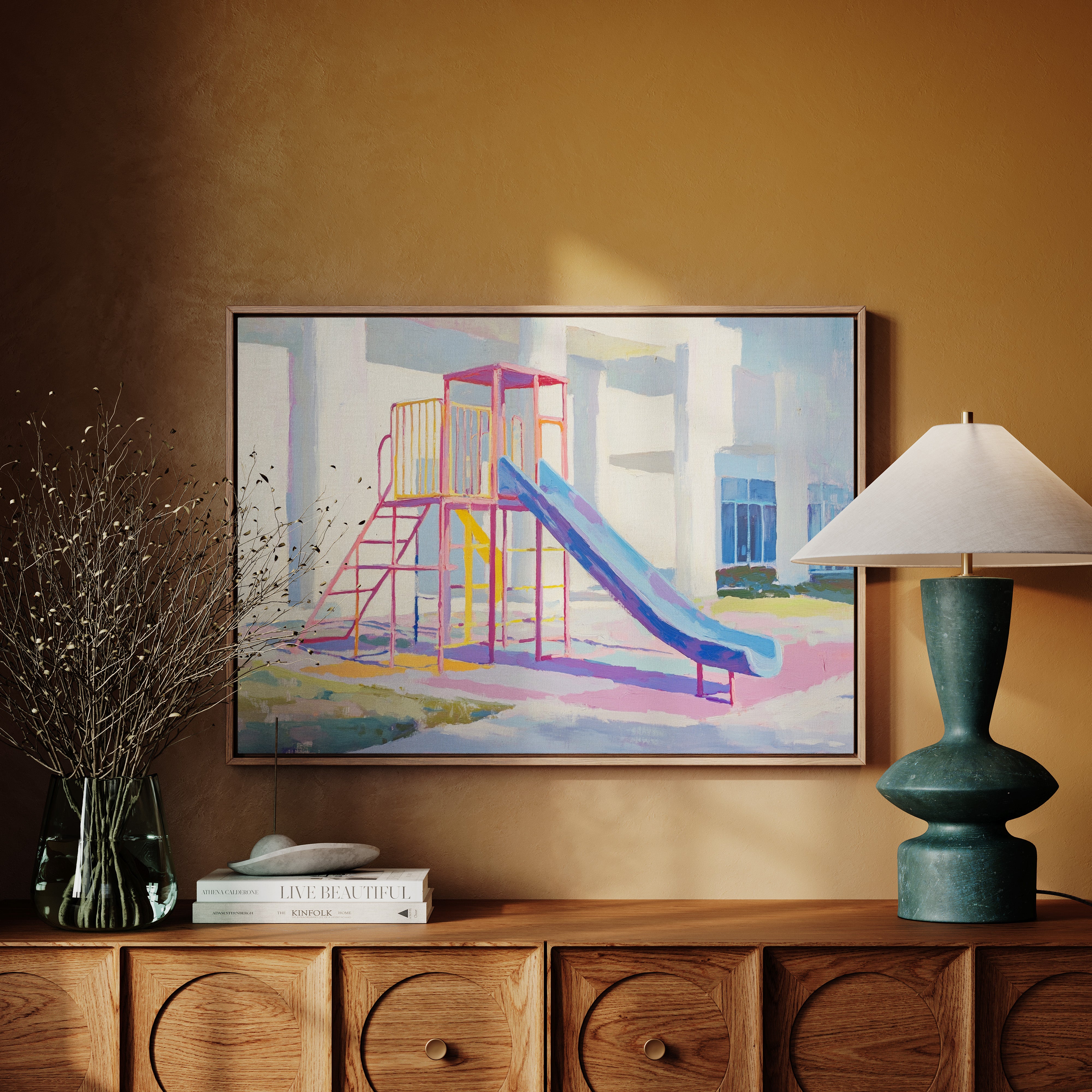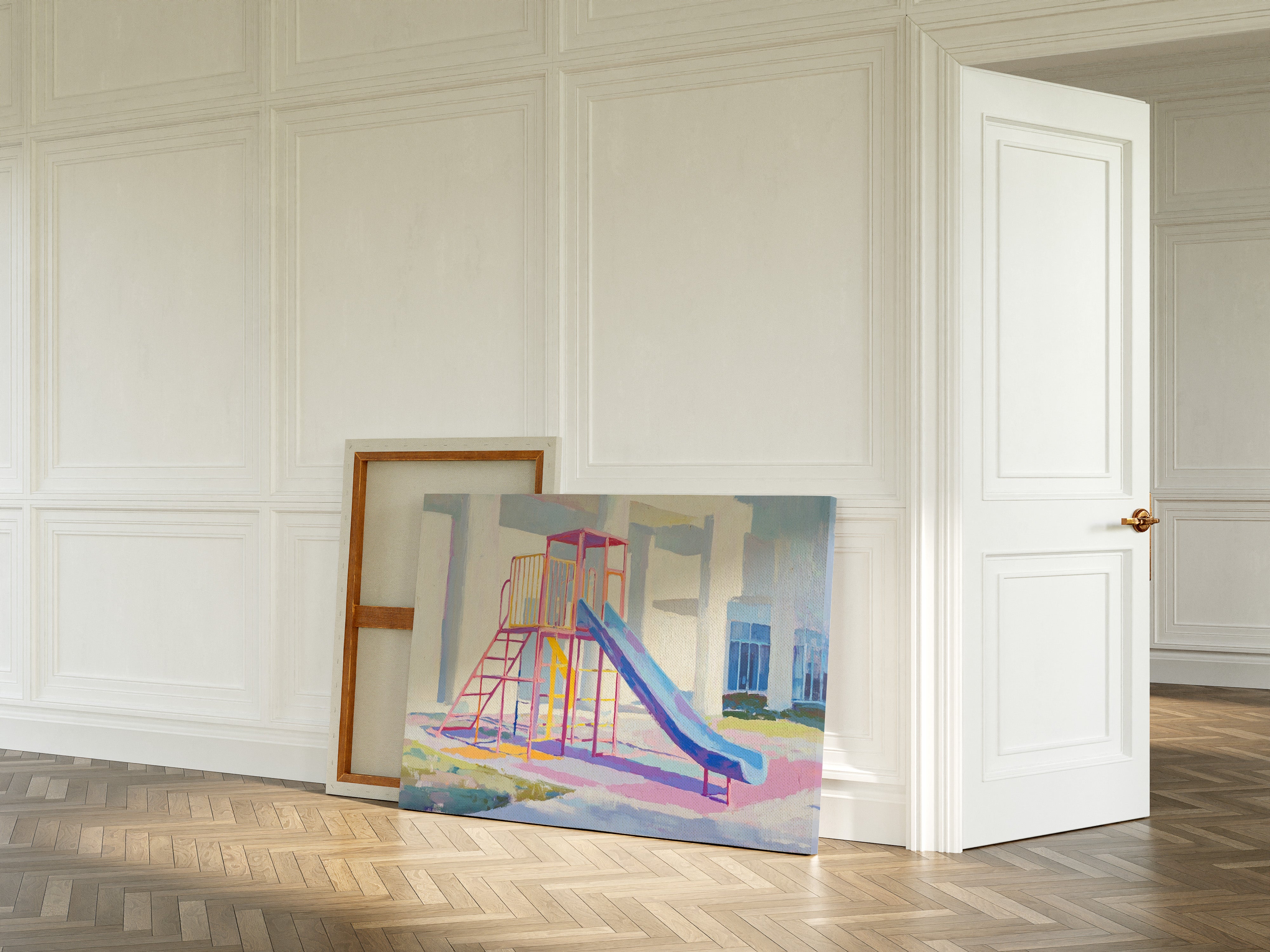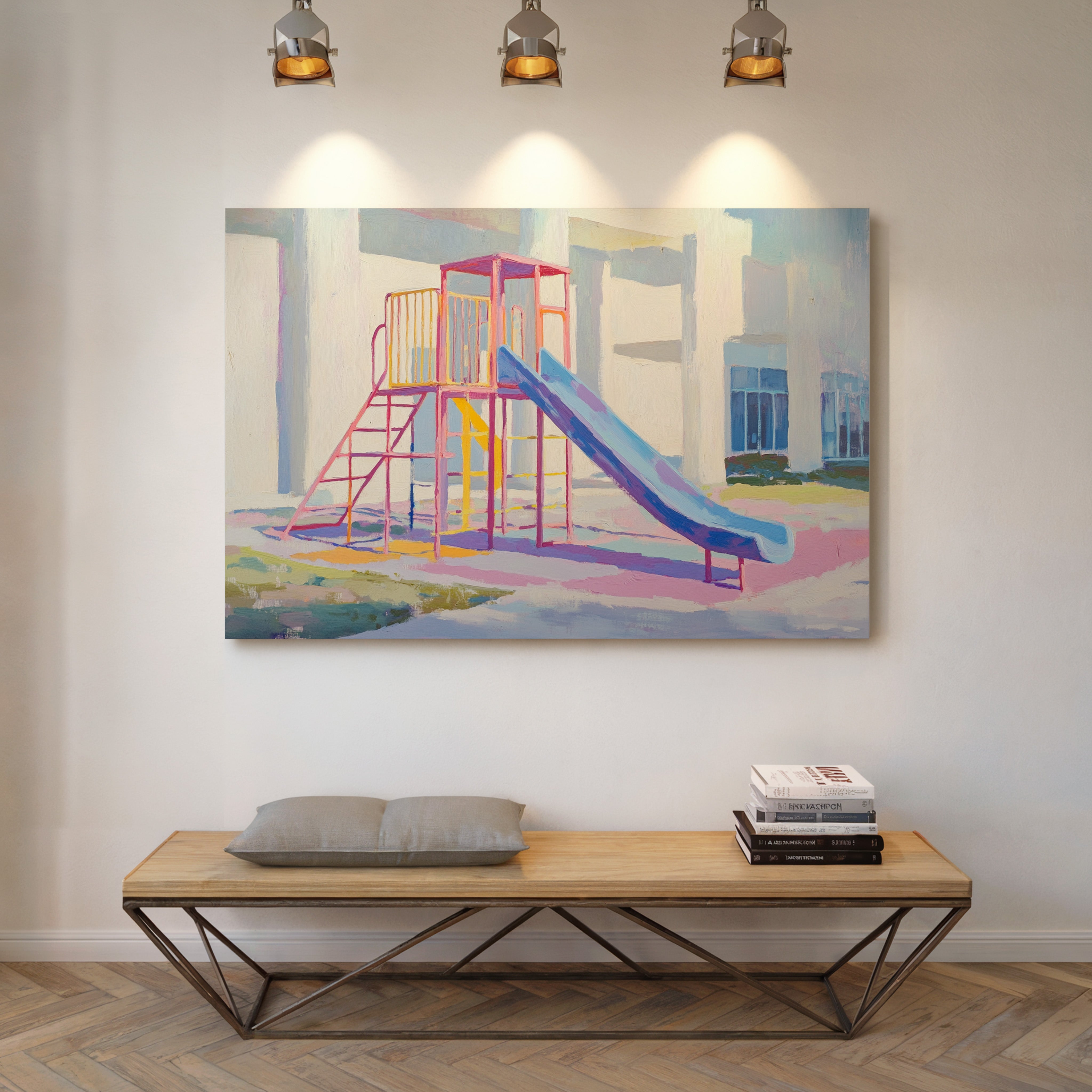 Morning light casts gentle shadows across an empty playground, creating a canvas of nostalgia and possibility. The slide's brilliant blue sweeps down like a frozen waterfall, while pink and yellow climbing frames stand proud against white walls. Brushstrokes capture the essence of childhood joy in pastel hues, transforming an ordinary play structure into a meditation on memory and innocence. This contemporary piece brings warmth and whimsy to any space, perfect for a child's room or a modern home office where playful energy meets sophisticated style.