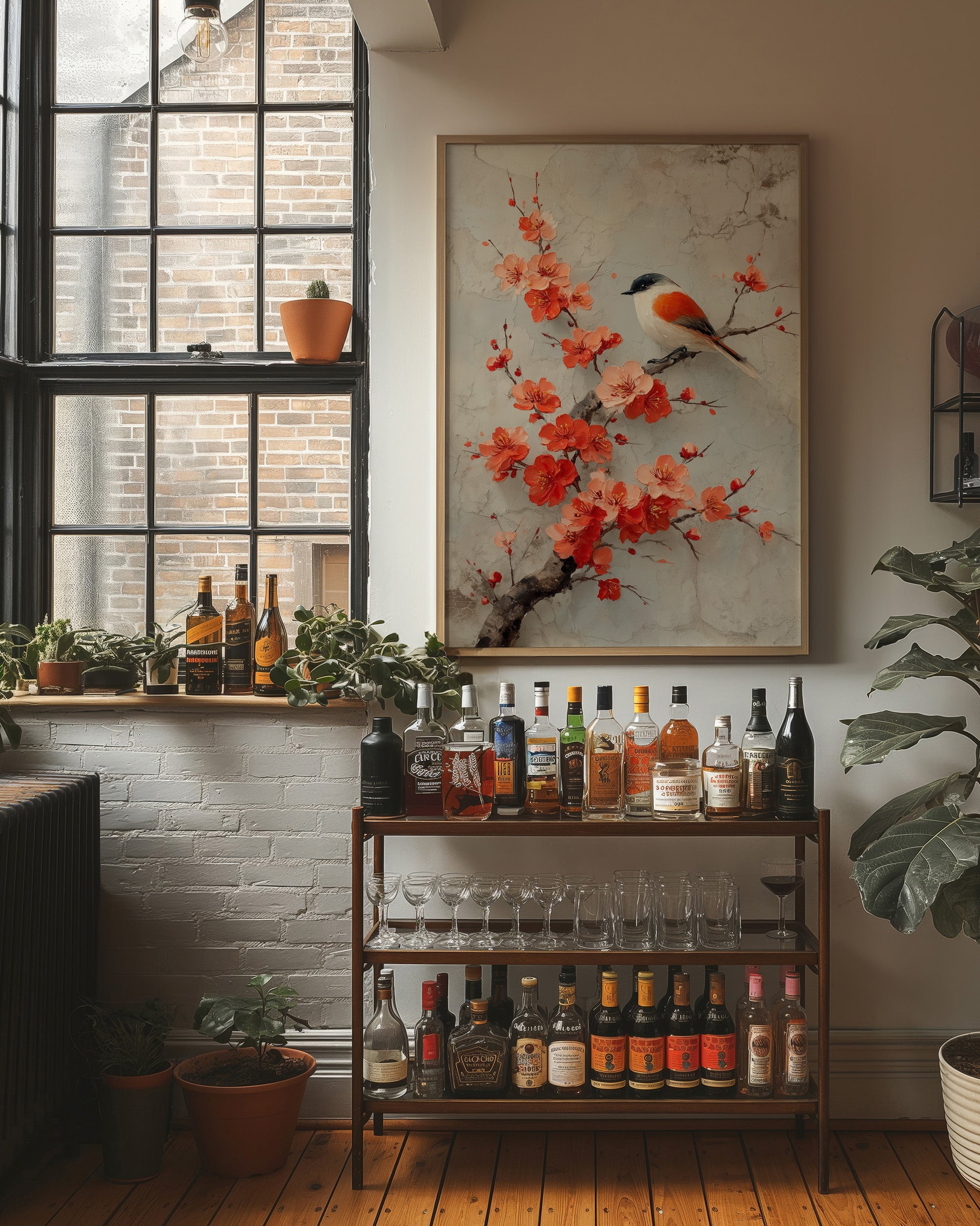 Delicate coral blossoms reach skyward like nature's fireworks, while a small bird perches in quiet contemplation. The soft gray background creates a misty dreamscape where each petal seems to dance with ethereal grace. The composition marries Eastern artistic traditions with contemporary sensibilities, as branches stretch across the frame in an elegant display of spring's awakening. This piece would bring a sense of serenity and sophisticated charm to a reading nook or meditation space, where its gentle energy can be fully appreciated.