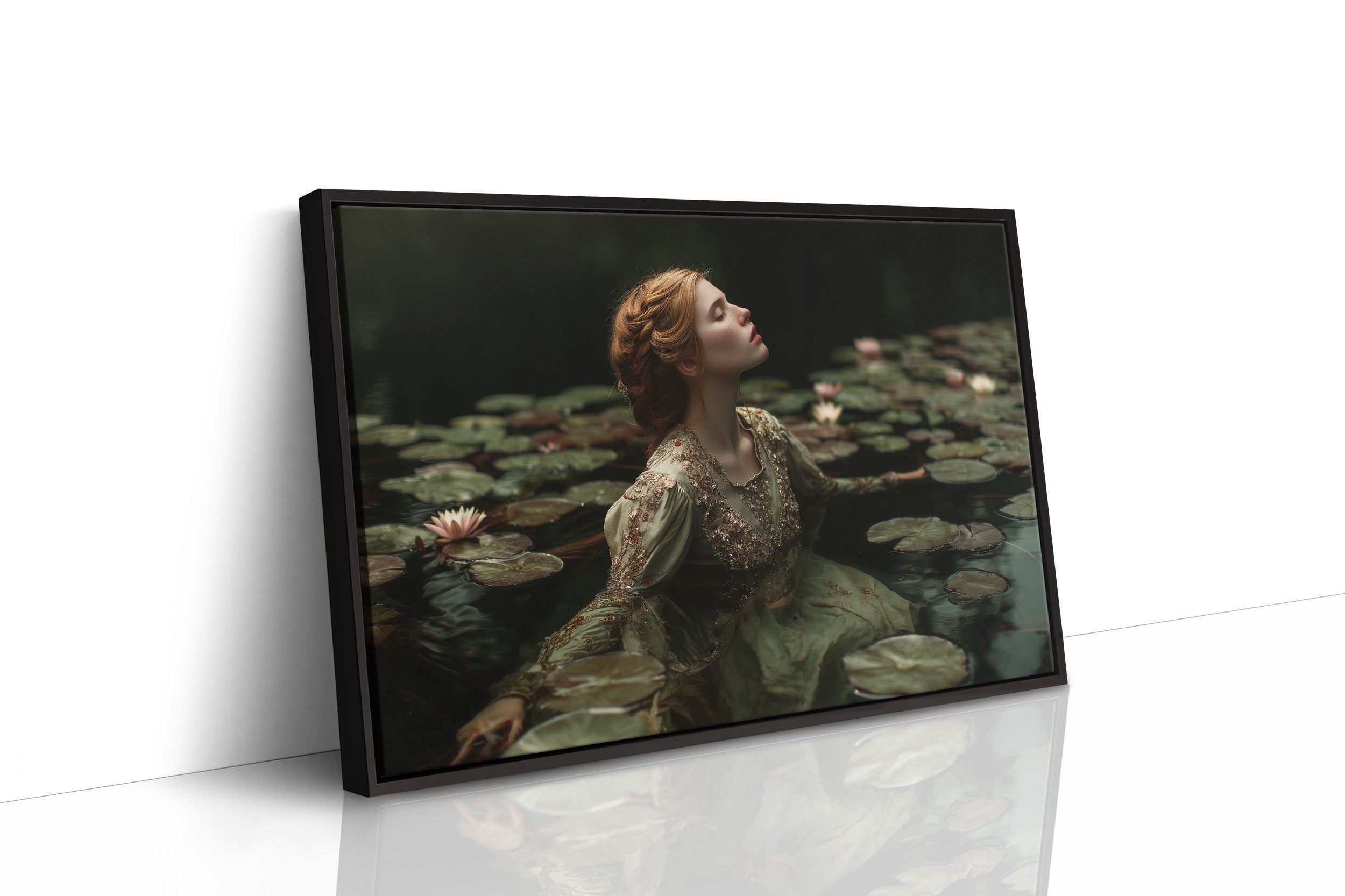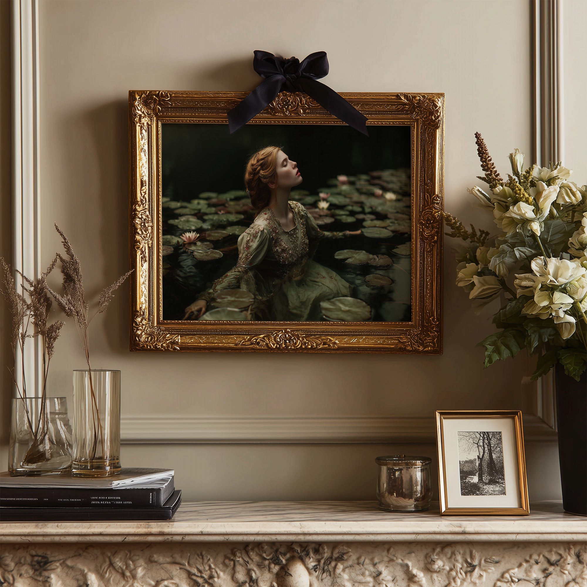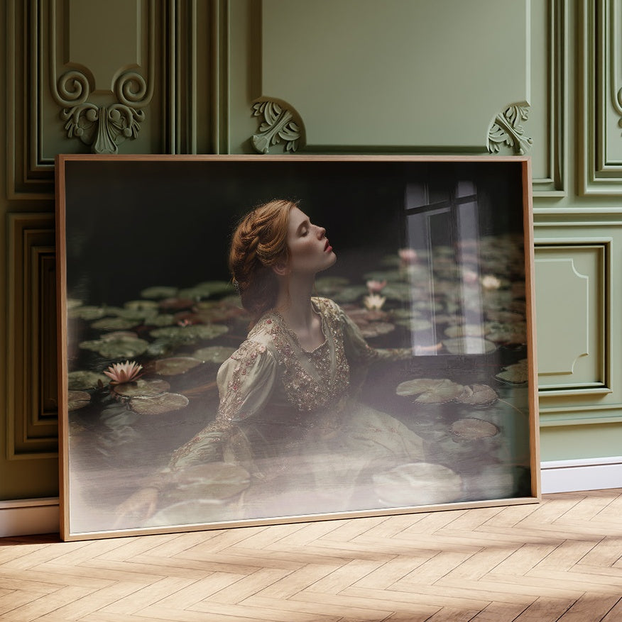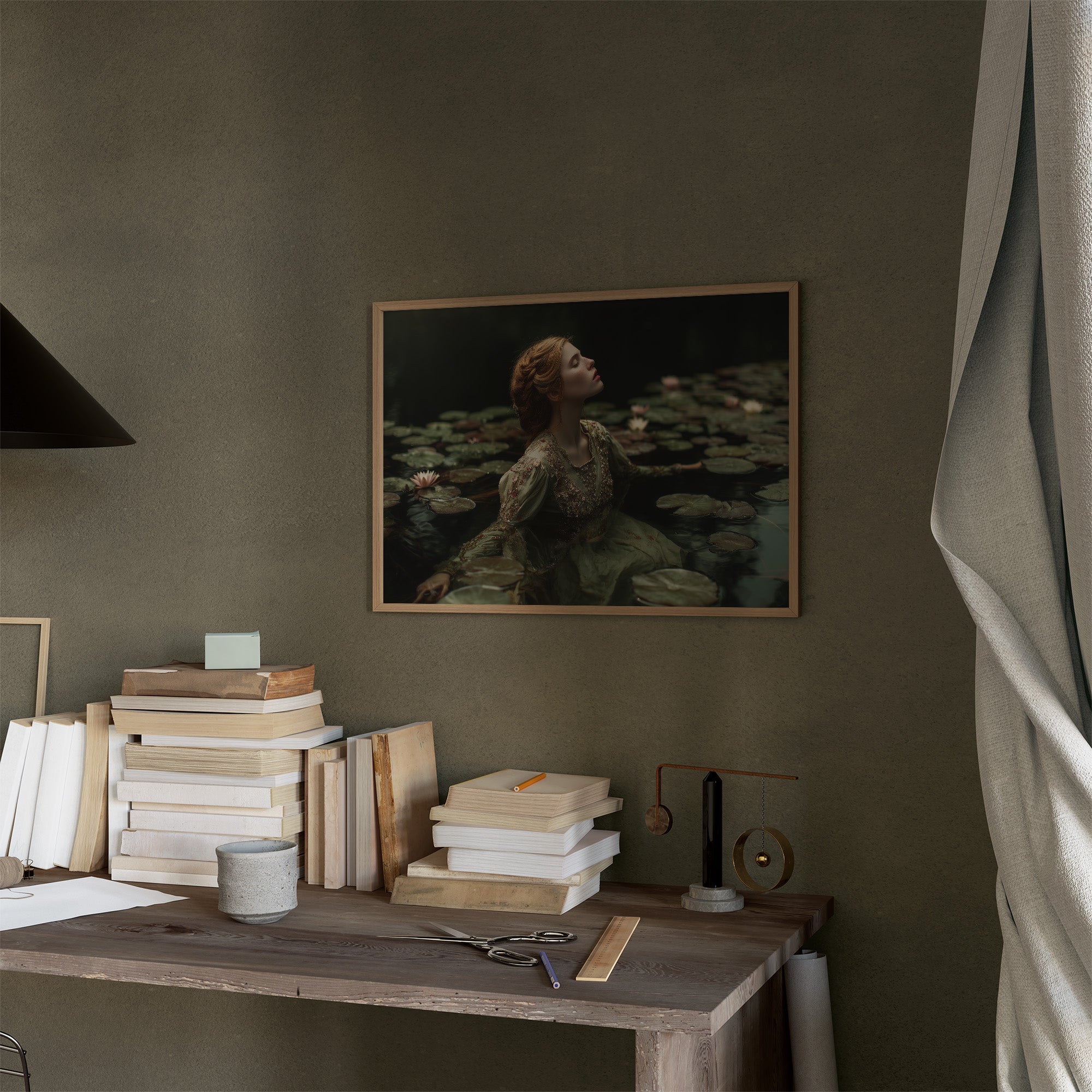 A framed portrait rests against wooden bookshelves, creating an intimate dialogue between art and literature. The photograph captures a dreamy scene of a woman in vintage attire floating among water lilies, her gaze turned upward in quiet contemplation. Rich emerald tones of the dress blend harmoniously with the dark waters and delicate pink blooms, while the warm wooden shelves filled with books create a scholarly backdrop that frames this moment of ethereal beauty. This piece brings sophisticated drama to a home office, reading nook, or any space where stories and imagination are cherished.