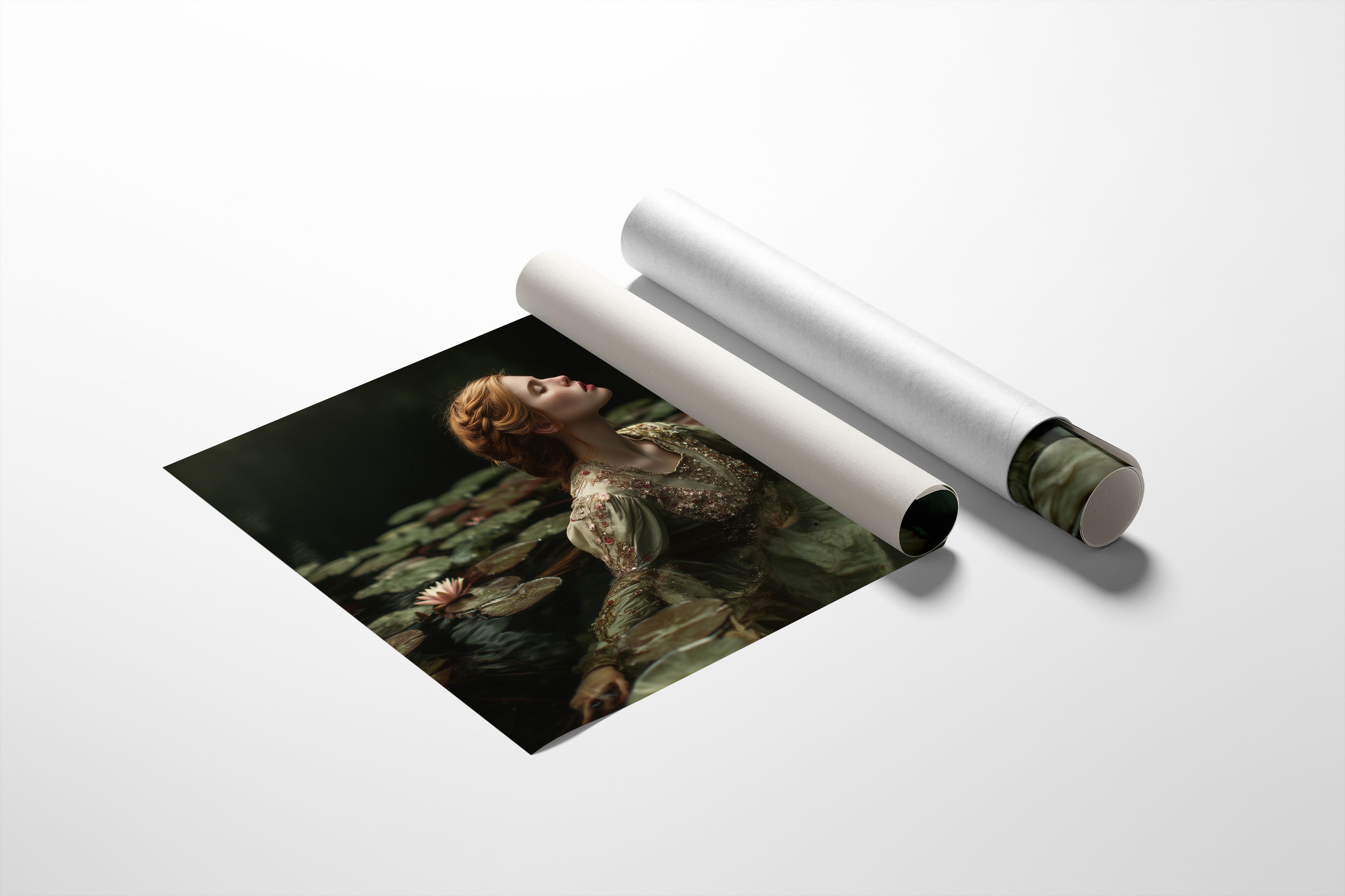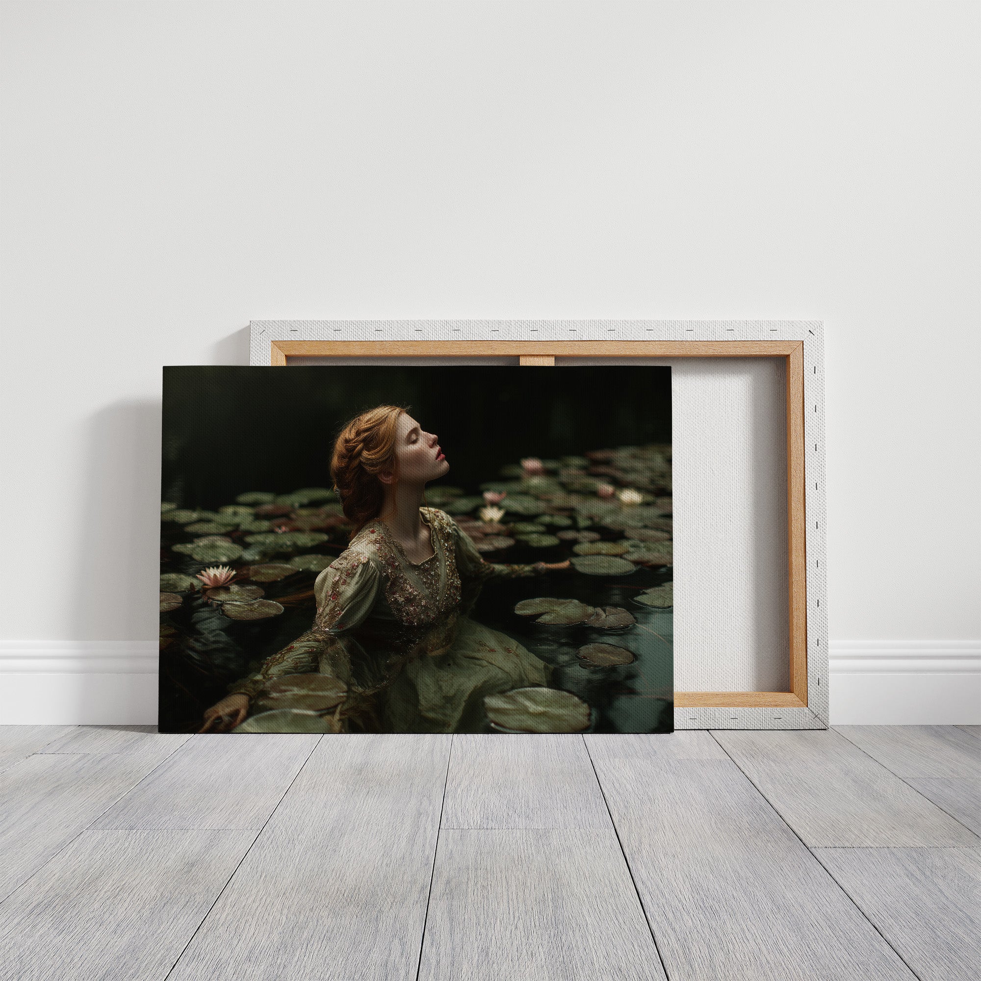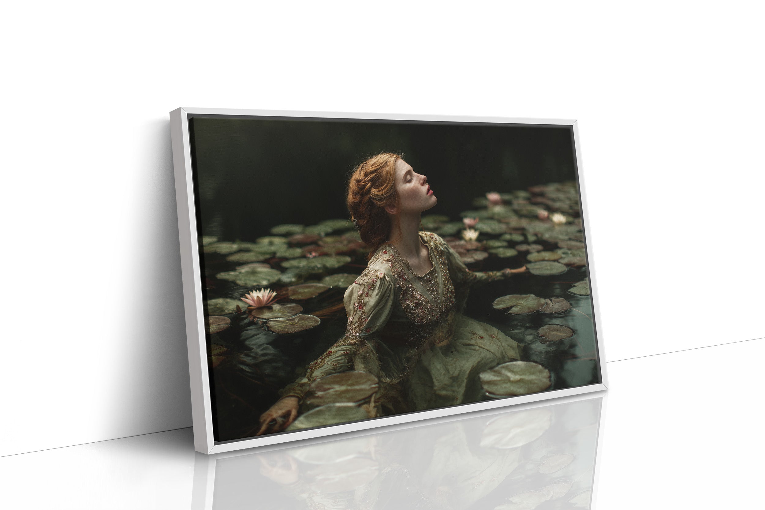 A framed portrait rests against wooden bookshelves, creating an intimate dialogue between art and literature. The photograph captures a dreamy scene of a woman in vintage attire floating among water lilies, her gaze turned upward in quiet contemplation. Rich emerald tones of the dress blend harmoniously with the dark waters and delicate pink blooms, while the warm wooden shelves filled with books create a scholarly backdrop that frames this moment of ethereal beauty. This piece brings sophisticated drama to a home office, reading nook, or any space where stories and imagination are cherished.