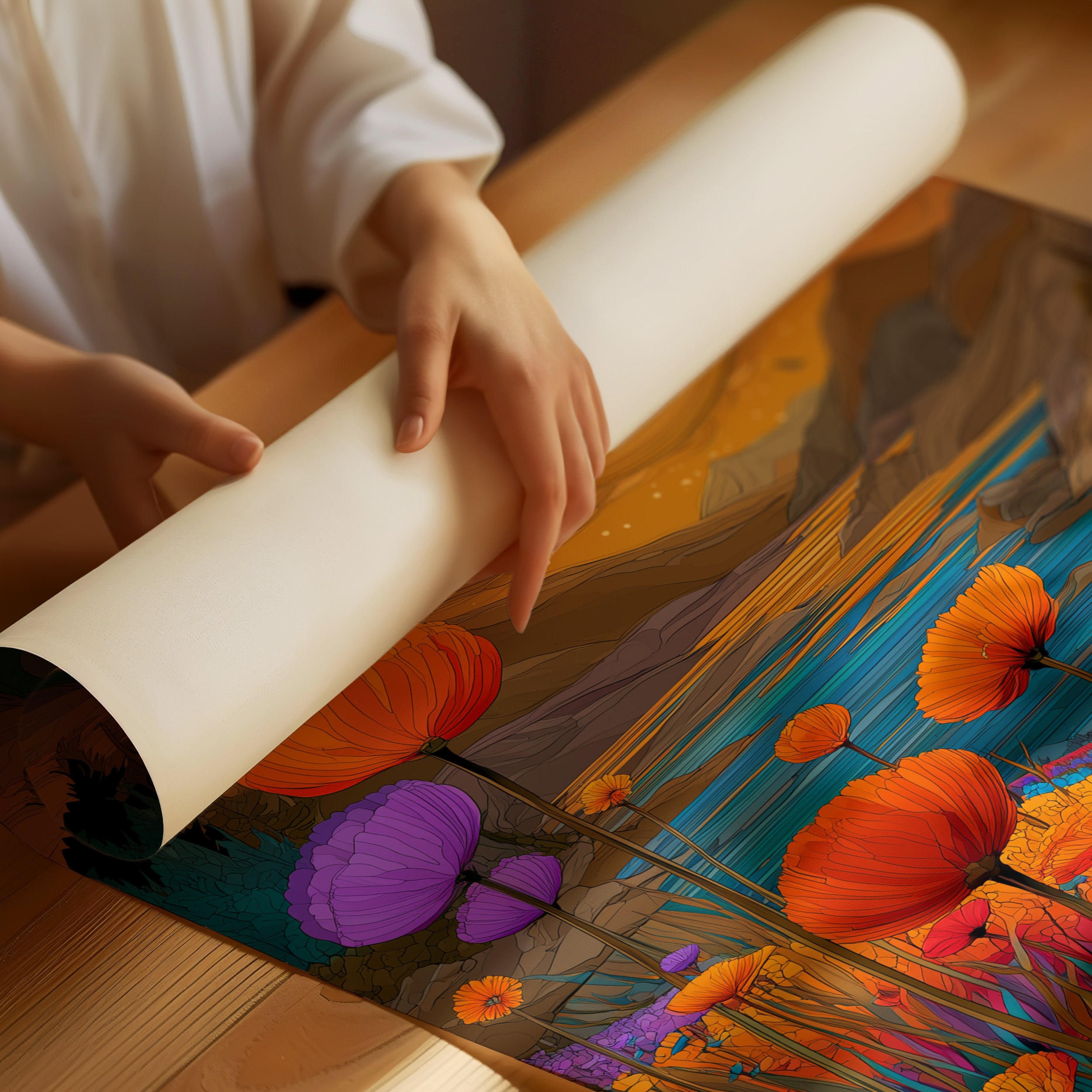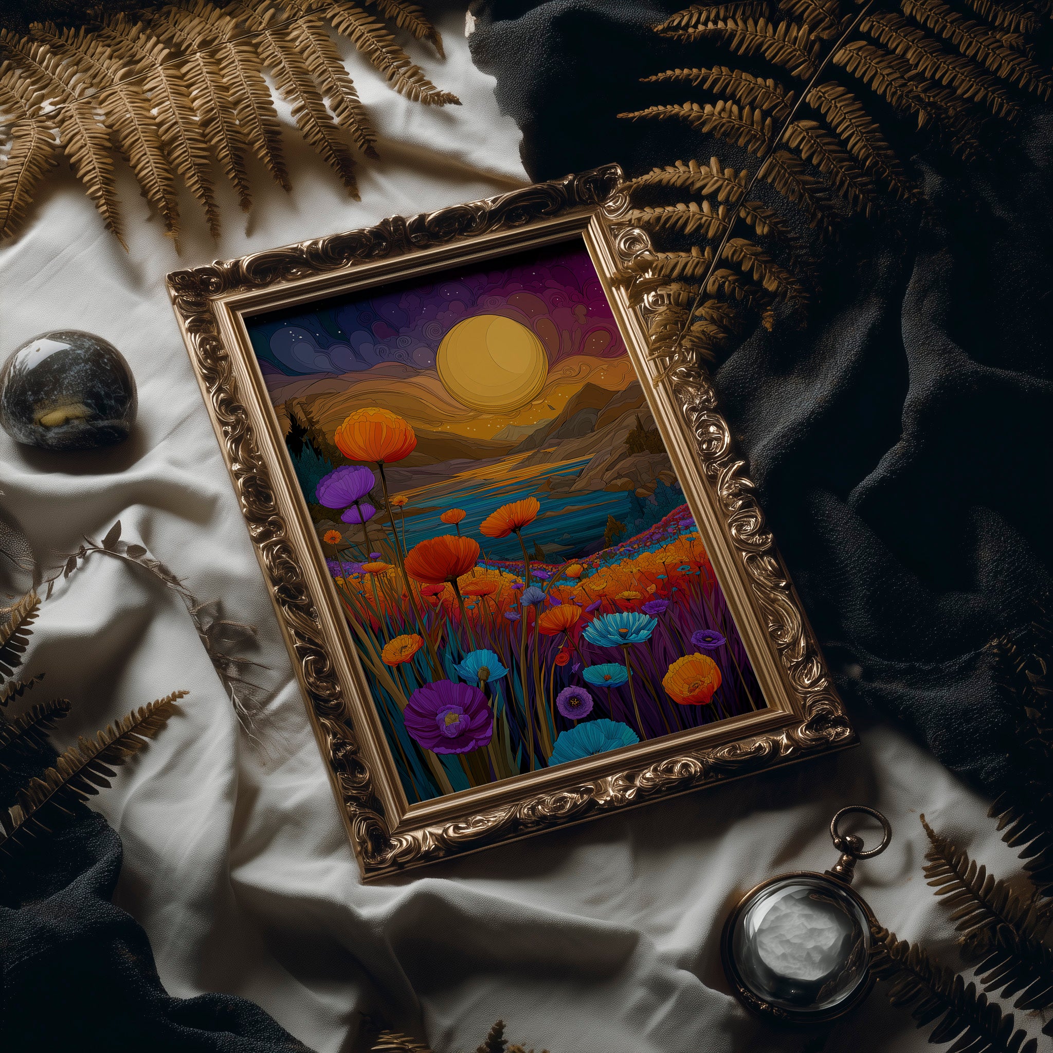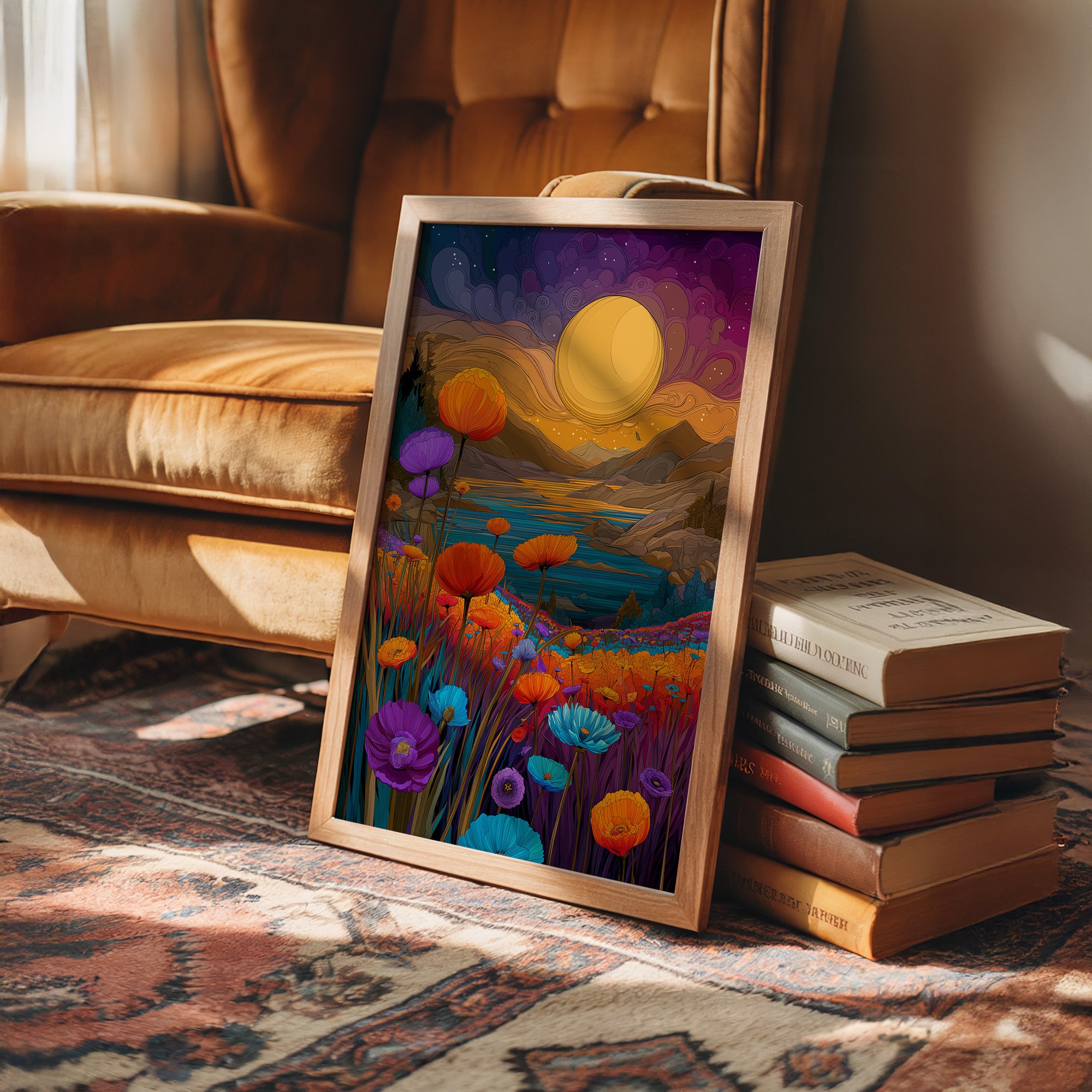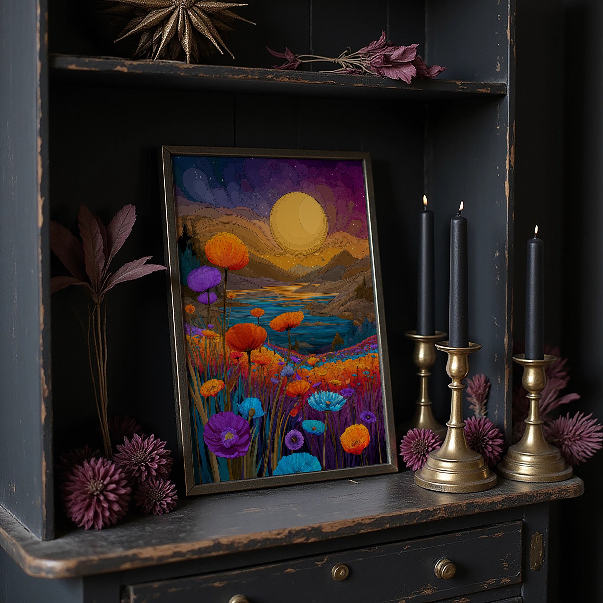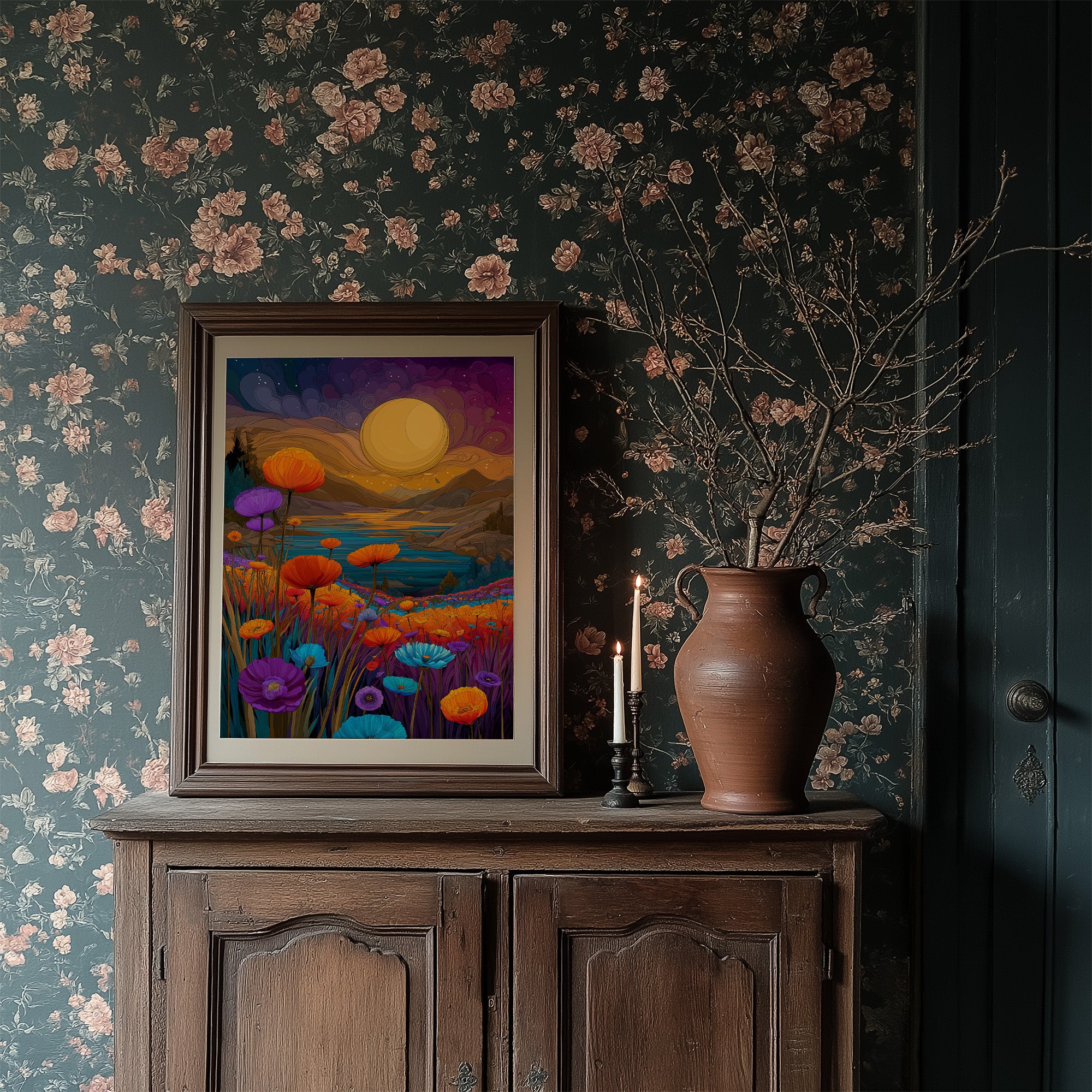 The meadow hums with vibrant life as sunset poppies bend toward the massive golden orb suspended in a violet sky. Turquoise waters reflect the warm glow, creating a dreamlike boundary between the floral foreground and distant mountains. Orange, purple, and blue blooms dance together in this psychedelic landscape where reality melts into fantasy, their slender stems reaching upward like worshippers to the sun. This statement piece brings bold energy to minimalist spaces, transforming dining rooms or entryways with its fearless palette and otherworldly charm.