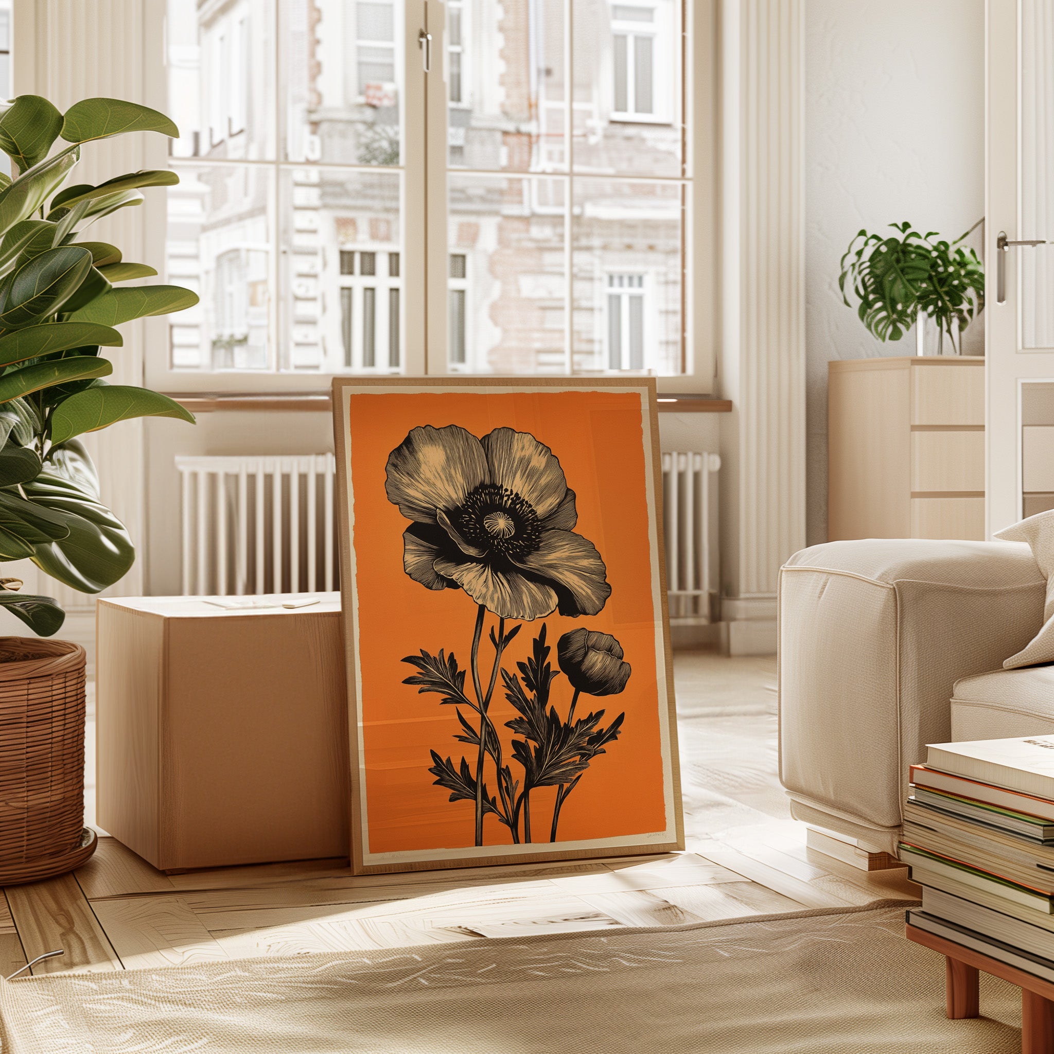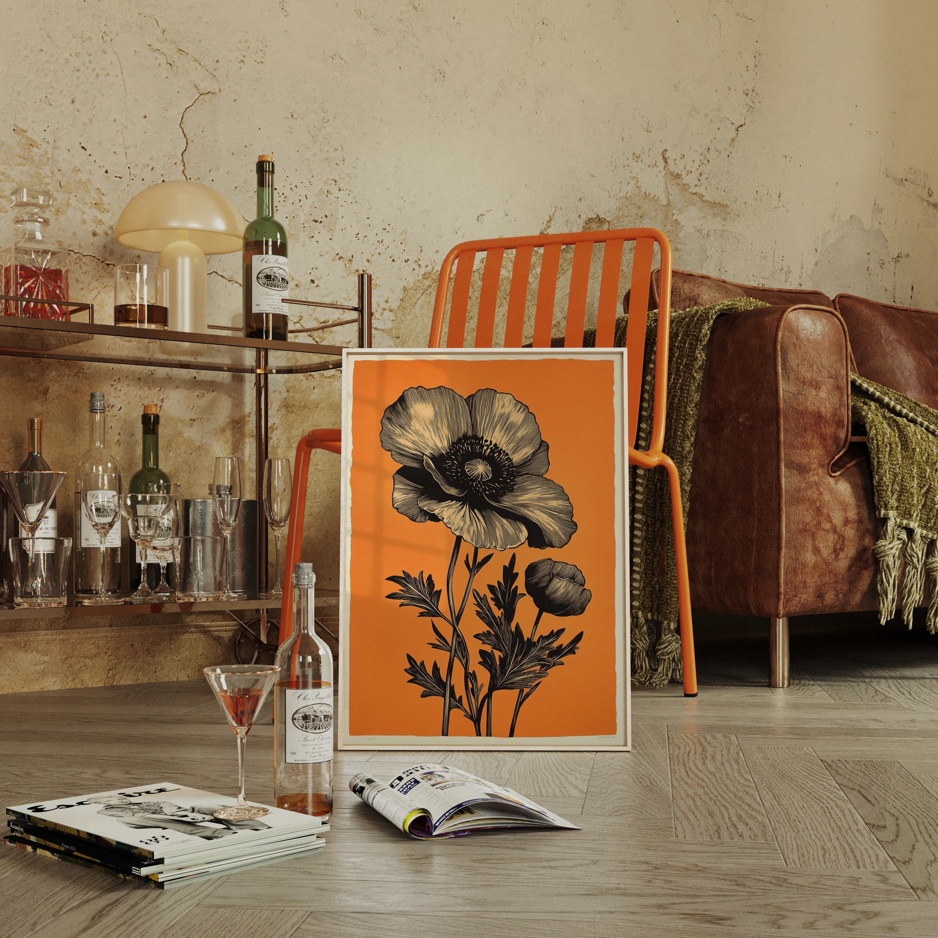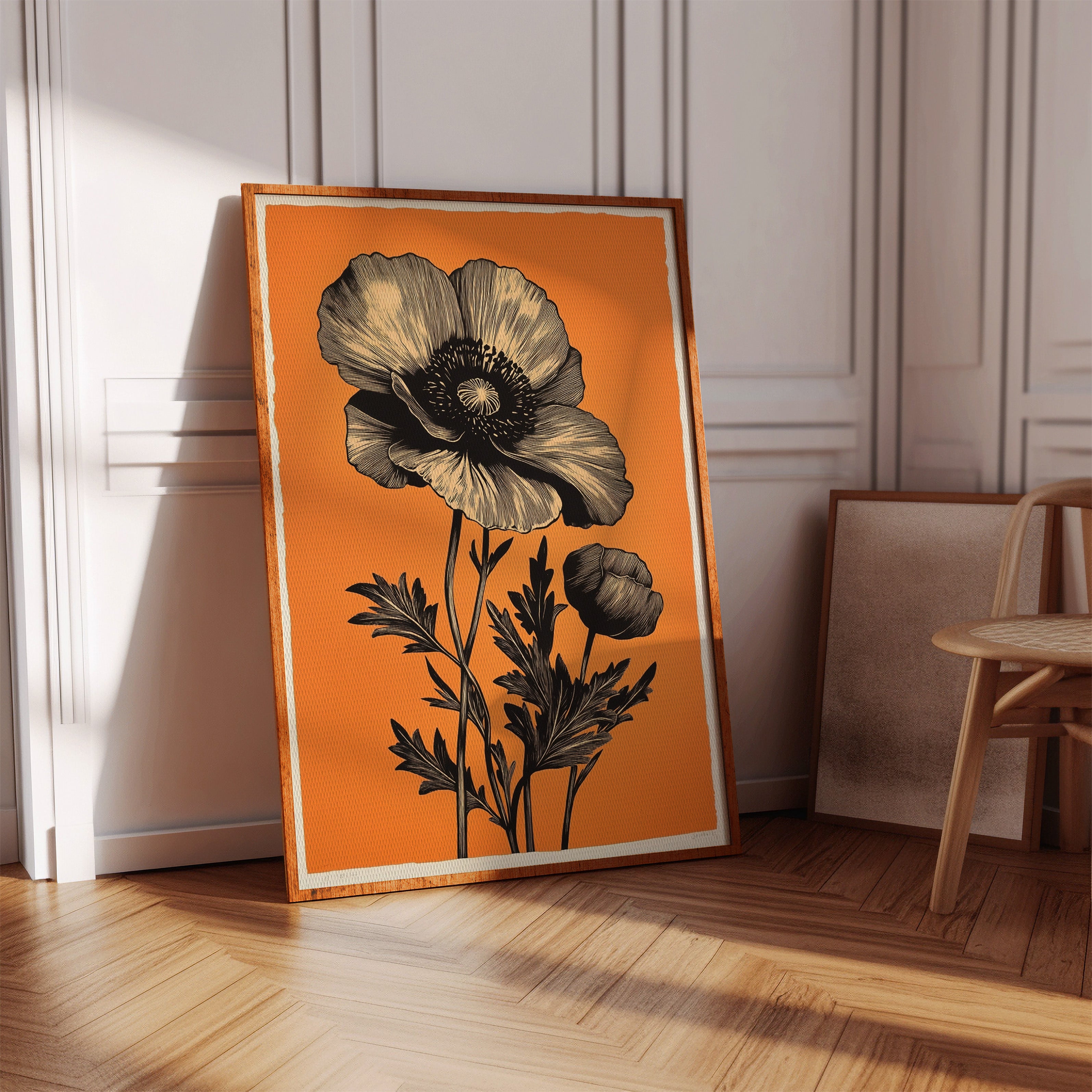 A dramatic botanical silhouette emerges against a vibrant tangerine sky, capturing the delicate strength of wild poppies in full bloom. The intricate linework reveals every delicate vein and petal, creating a mesmerizing study in contrast and form. The composition balances bold graphic elements with botanical accuracy, while the warm orange background infuses the piece with summer's golden hour warmth. This striking contemporary interpretation would make a captivating focal point in a modern dining room or add sophisticated drama to a minimalist home office.