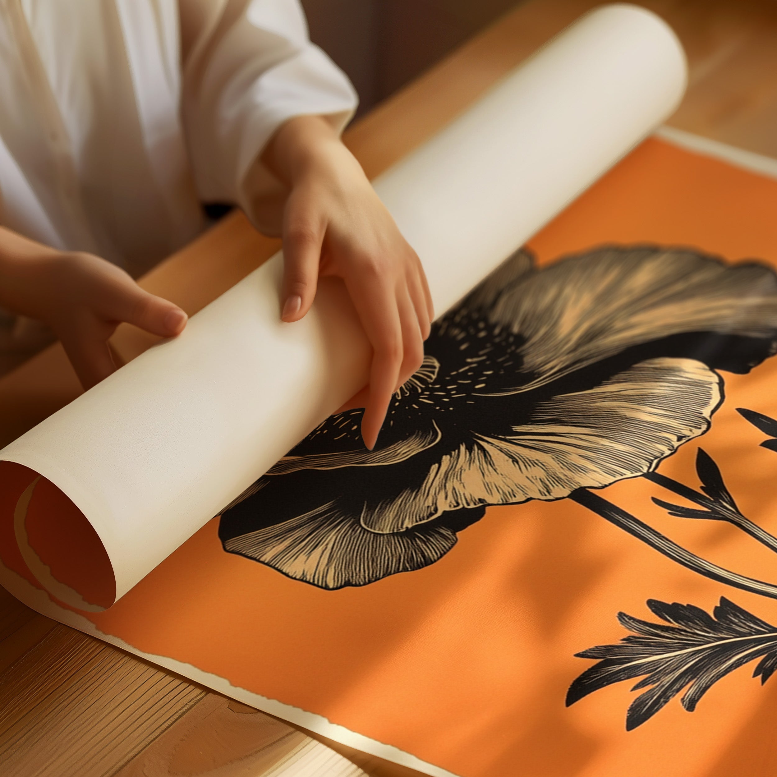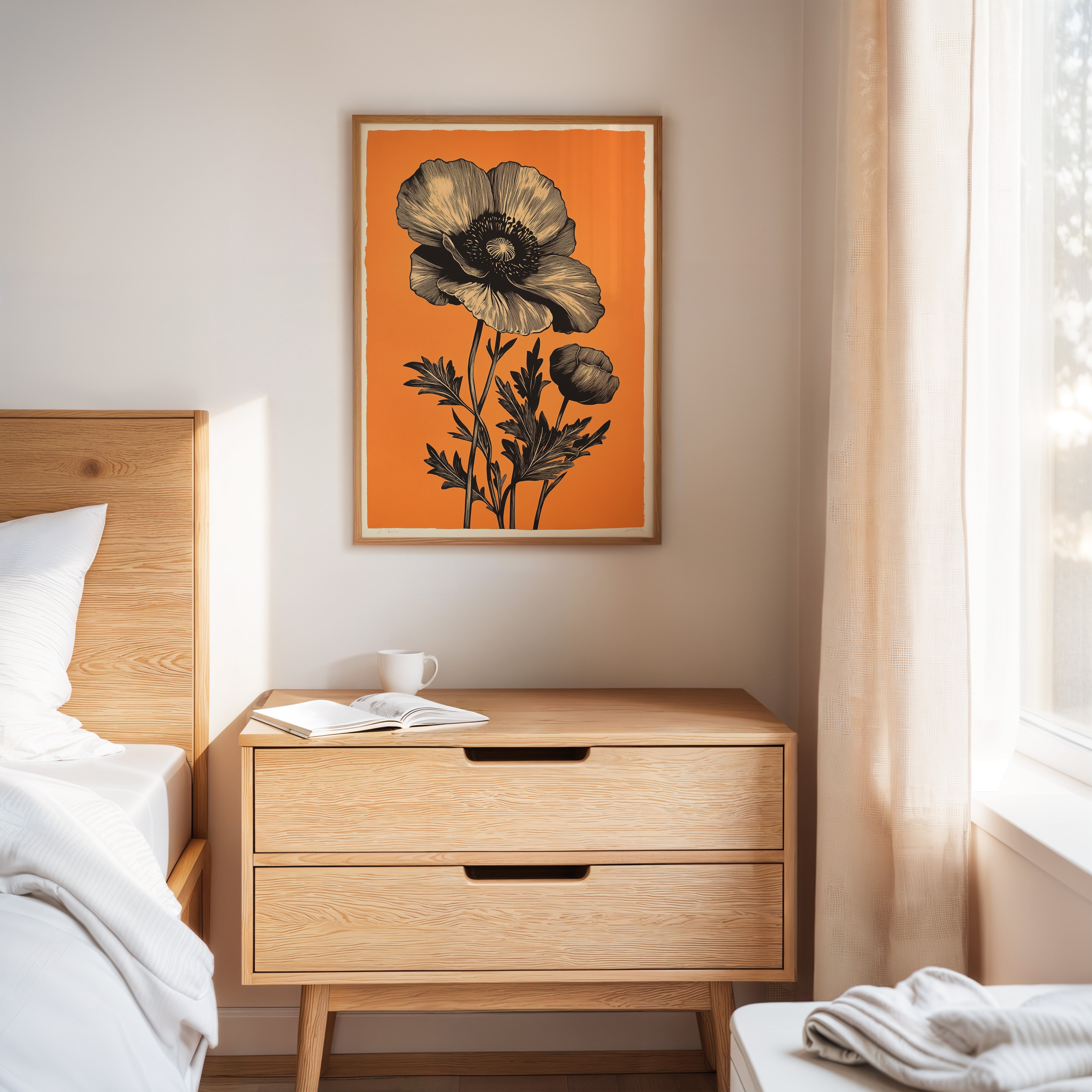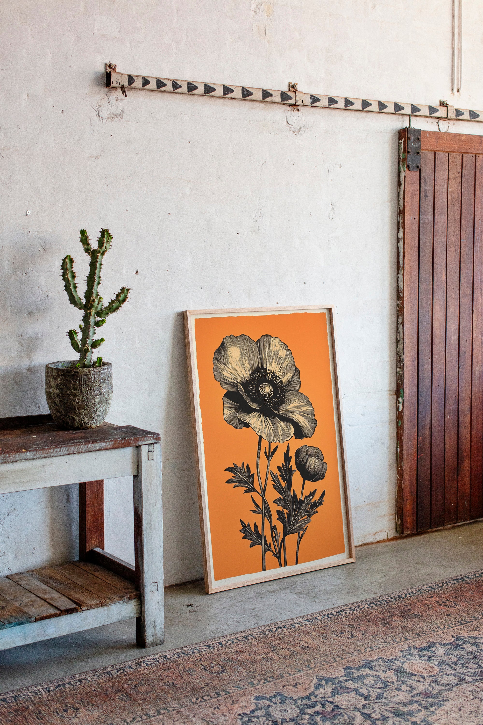 A dramatic botanical silhouette emerges against a vibrant tangerine sky, capturing the delicate strength of wild poppies in full bloom. The intricate linework reveals every delicate vein and petal, creating a mesmerizing study in contrast and form. The composition balances bold graphic elements with botanical accuracy, while the warm orange background infuses the piece with summer's golden hour warmth. This striking contemporary interpretation would make a captivating focal point in a modern dining room or add sophisticated drama to a minimalist home office.