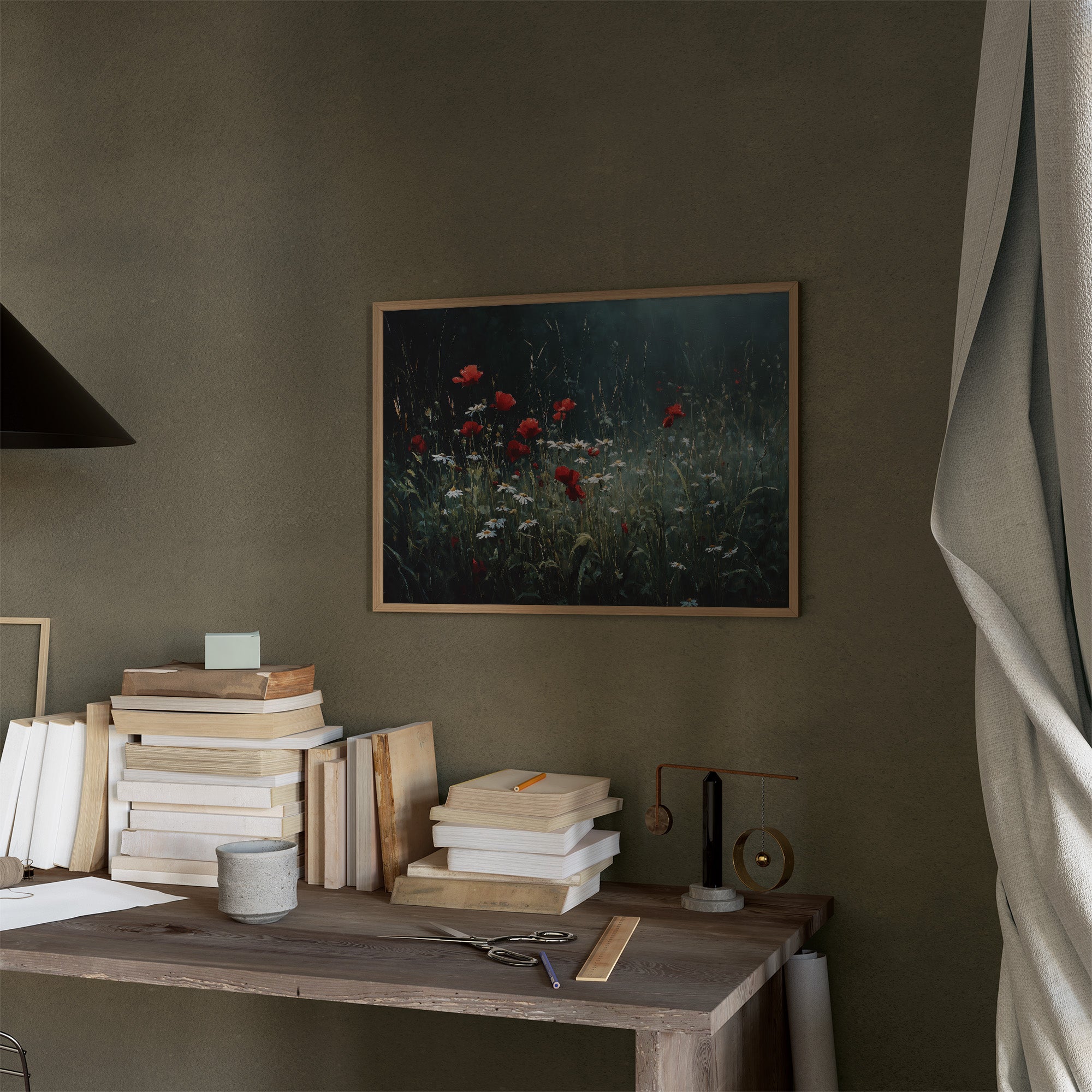 The framed meadow scene breathes life into the scholarly sanctuary, crimson poppies and delicate daisies caught in a moment of wild grace. Rich wooden bookshelves create a backdrop of collected wisdom, the contrast between bound knowledge and painted nature striking a perfect balance. The thoughtful arrangementwith potted greenery flanking the artwork and stacked books nearbyinvites contemplation of beauty both cultivated and untamed.
