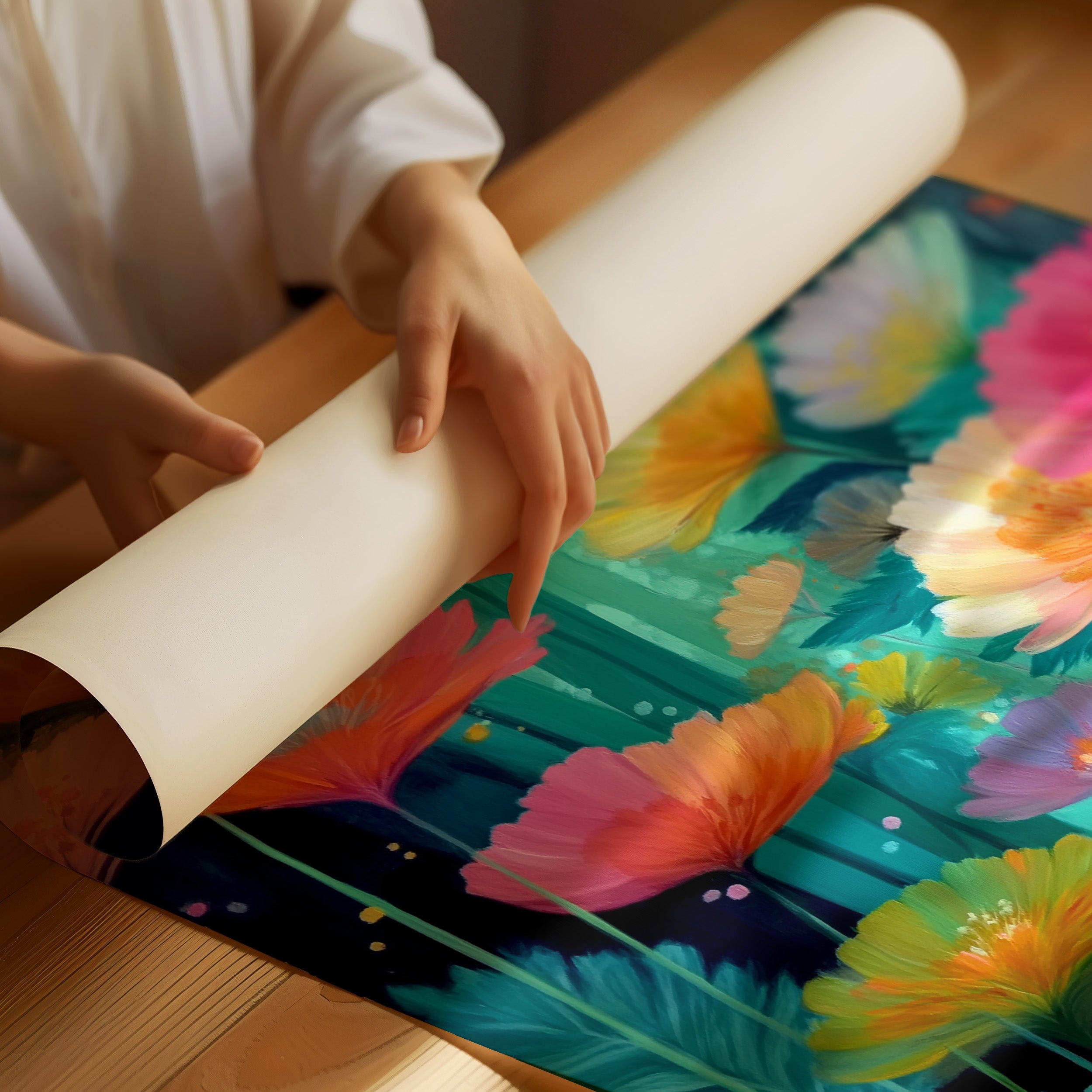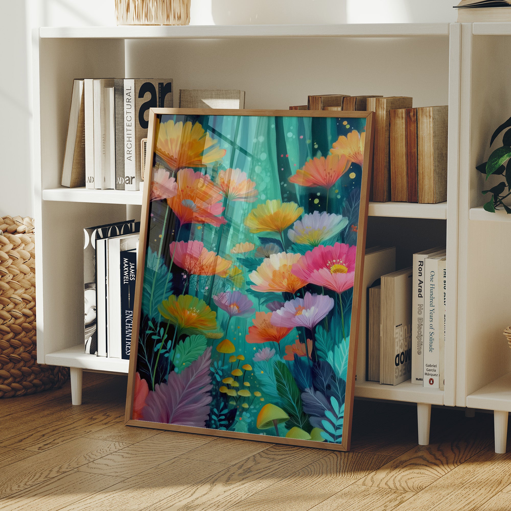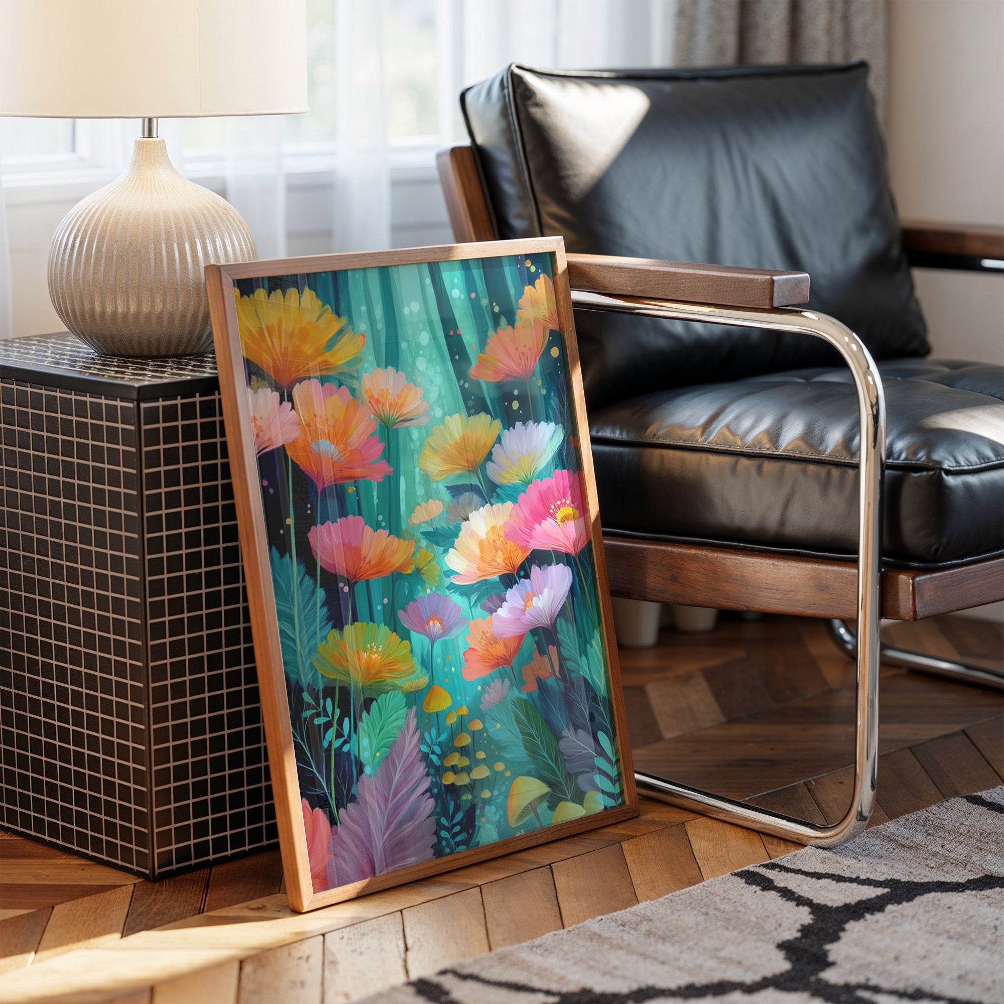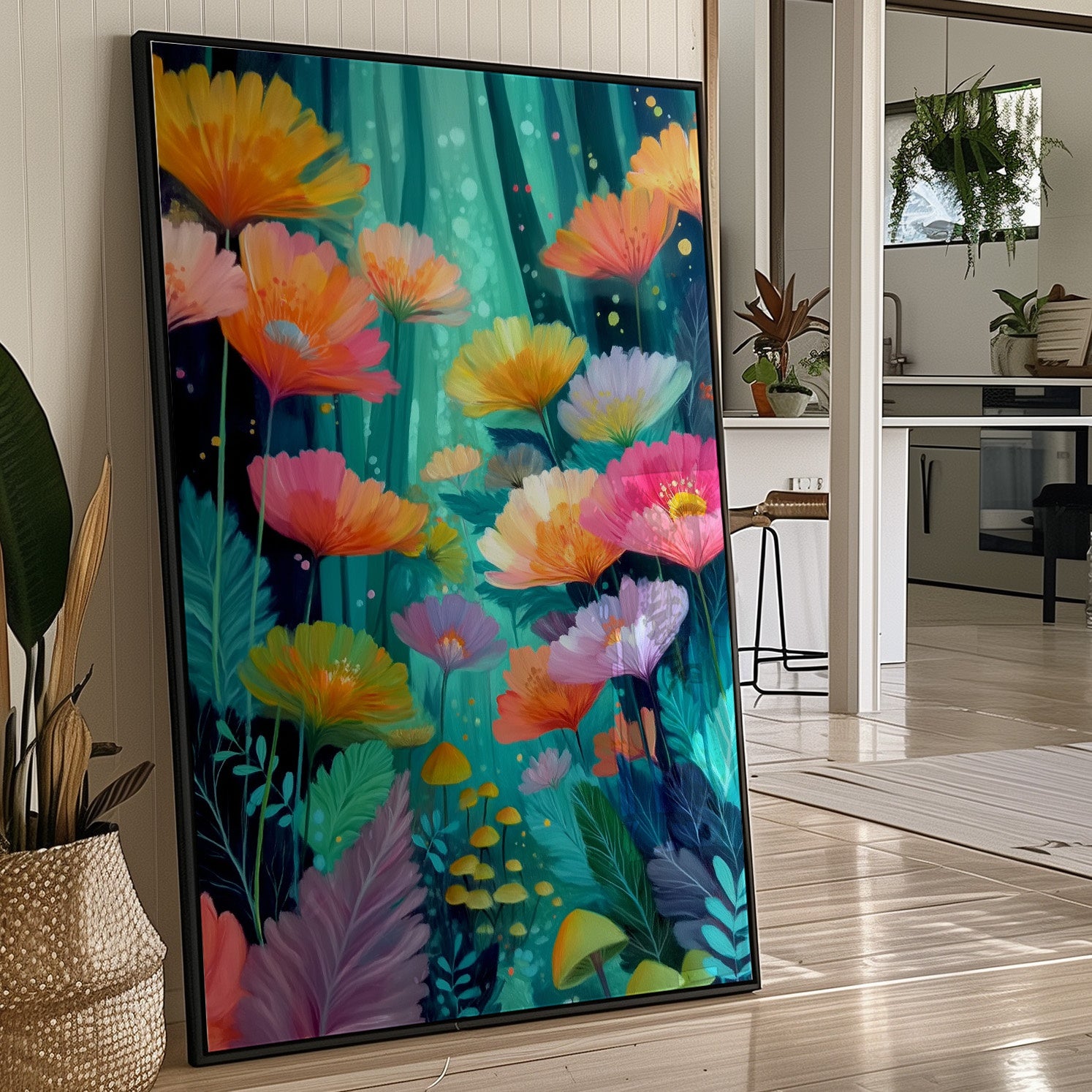 Luminous orange and pink poppies stretch toward an enchanted turquoise sky, their petals catching ethereal light like stained glass. The flowers emerge from a mysterious underwater-like atmosphere, where teal and indigo foliage creates depth and movement through layers of magical forest elements. Small golden mushrooms and floating particles add whimsy to this dreamlike botanical scene, transforming an ordinary garden into a nocturnal wonderland. This piece would bring an enchanting focal point to a modern bedroom or reading nook, where its vibrant yet soothing color palette can inspire moments of peaceful contemplation.