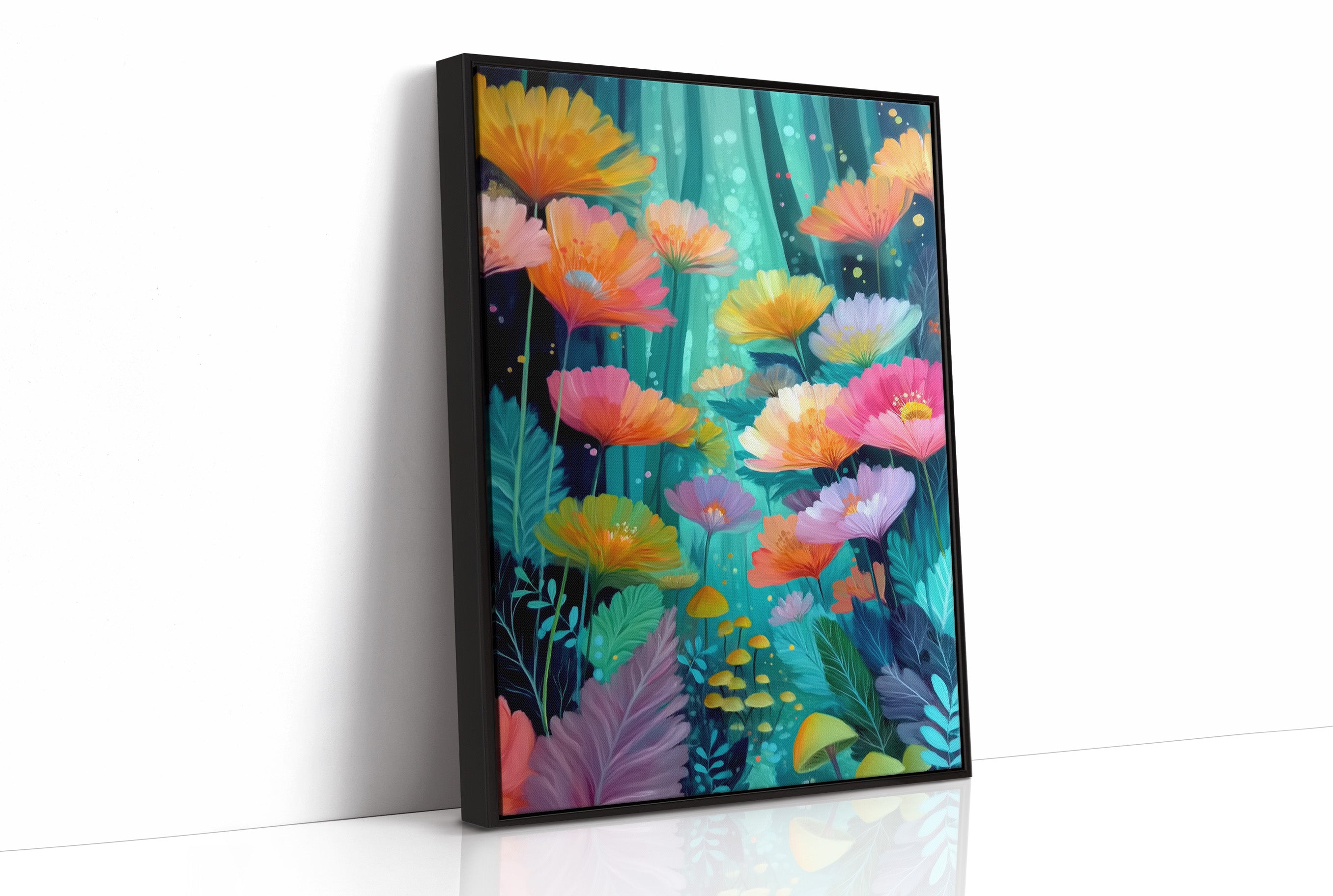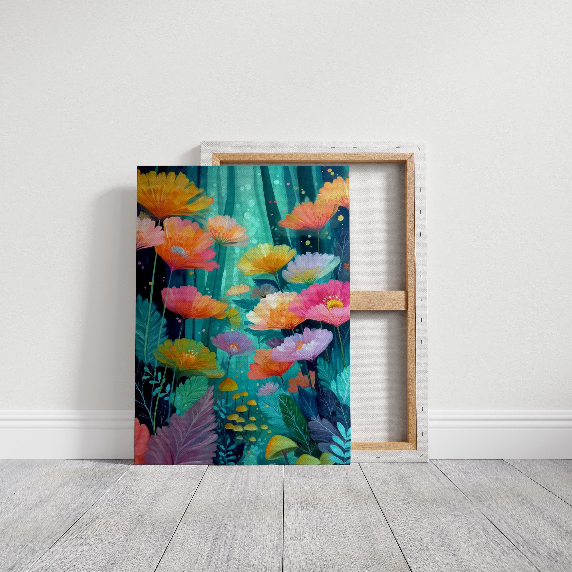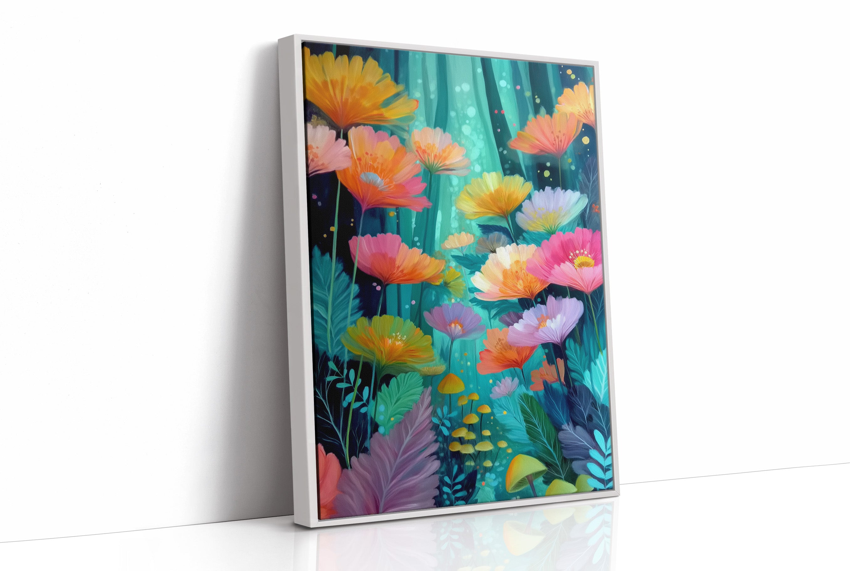 Luminous orange and pink poppies stretch toward an enchanted turquoise sky, their petals catching ethereal light like stained glass. The flowers emerge from a mysterious underwater-like atmosphere, where teal and indigo foliage creates depth and movement through layers of magical forest elements. Small golden mushrooms and floating particles add whimsy to this dreamlike botanical scene, transforming an ordinary garden into a nocturnal wonderland. This piece would bring an enchanting focal point to a modern bedroom or reading nook, where its vibrant yet soothing color palette can inspire moments of peaceful contemplation.