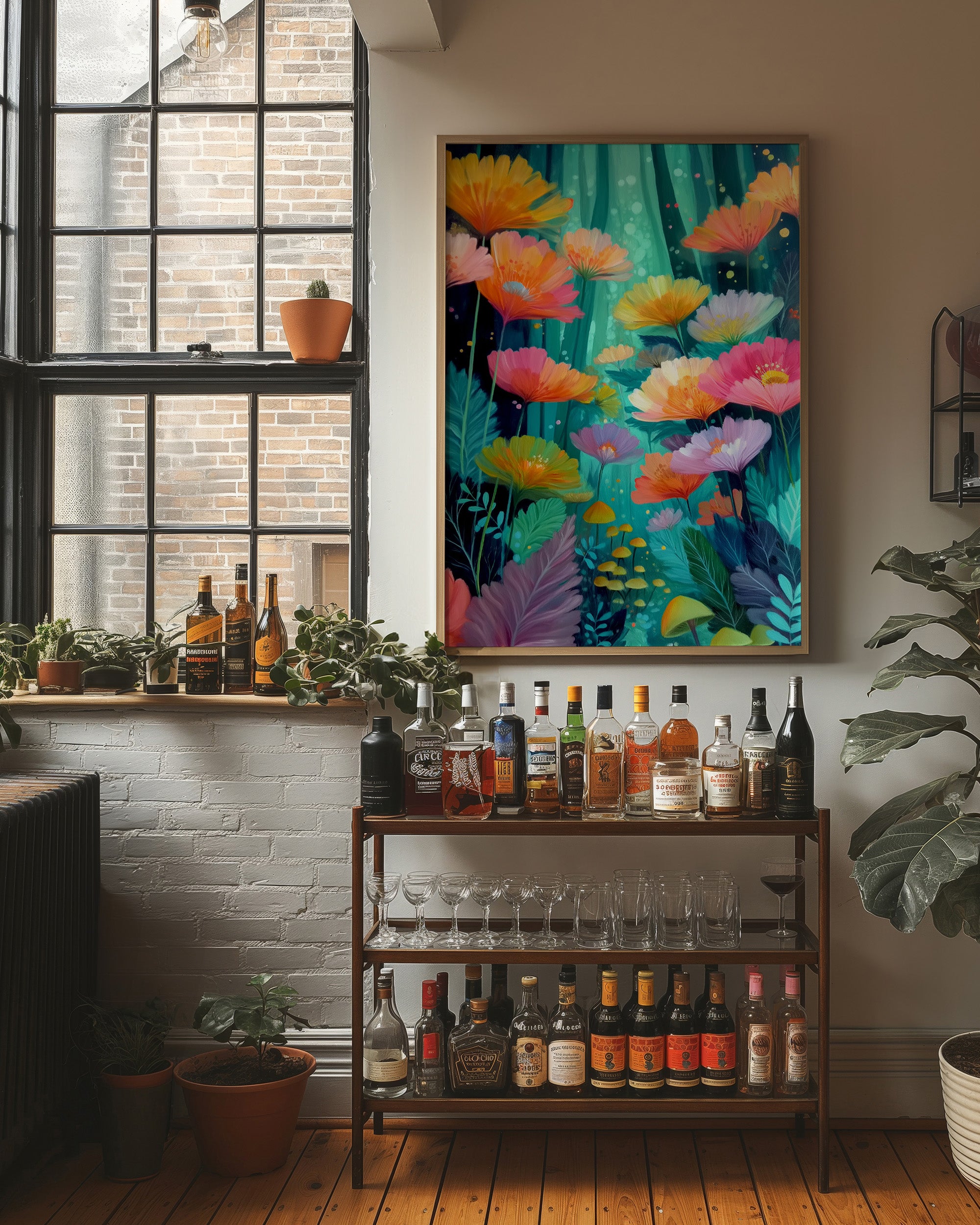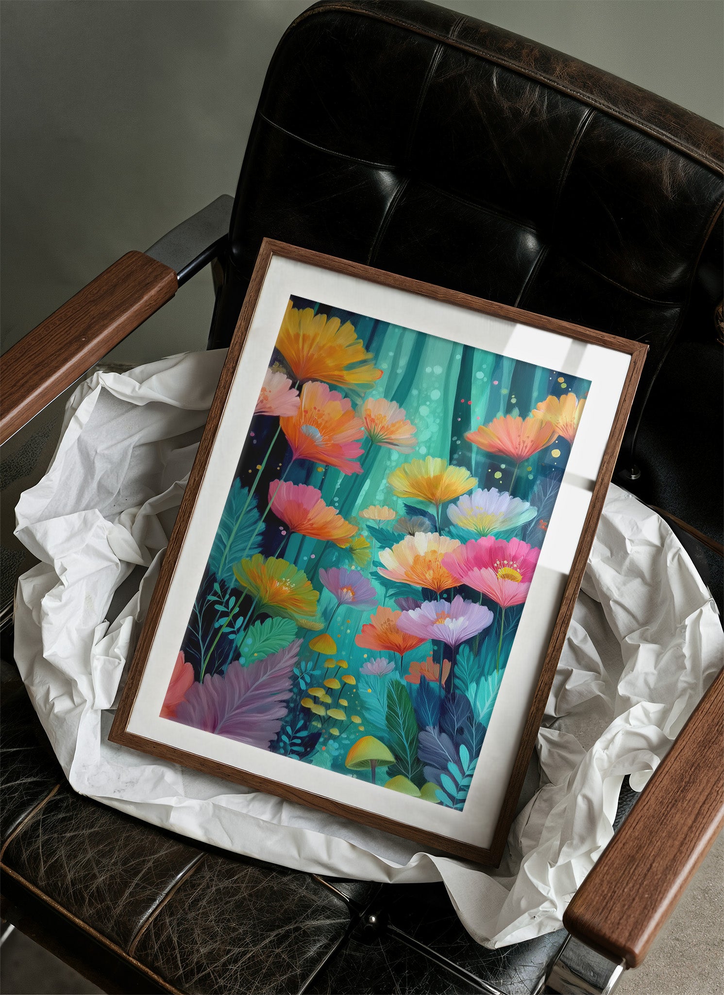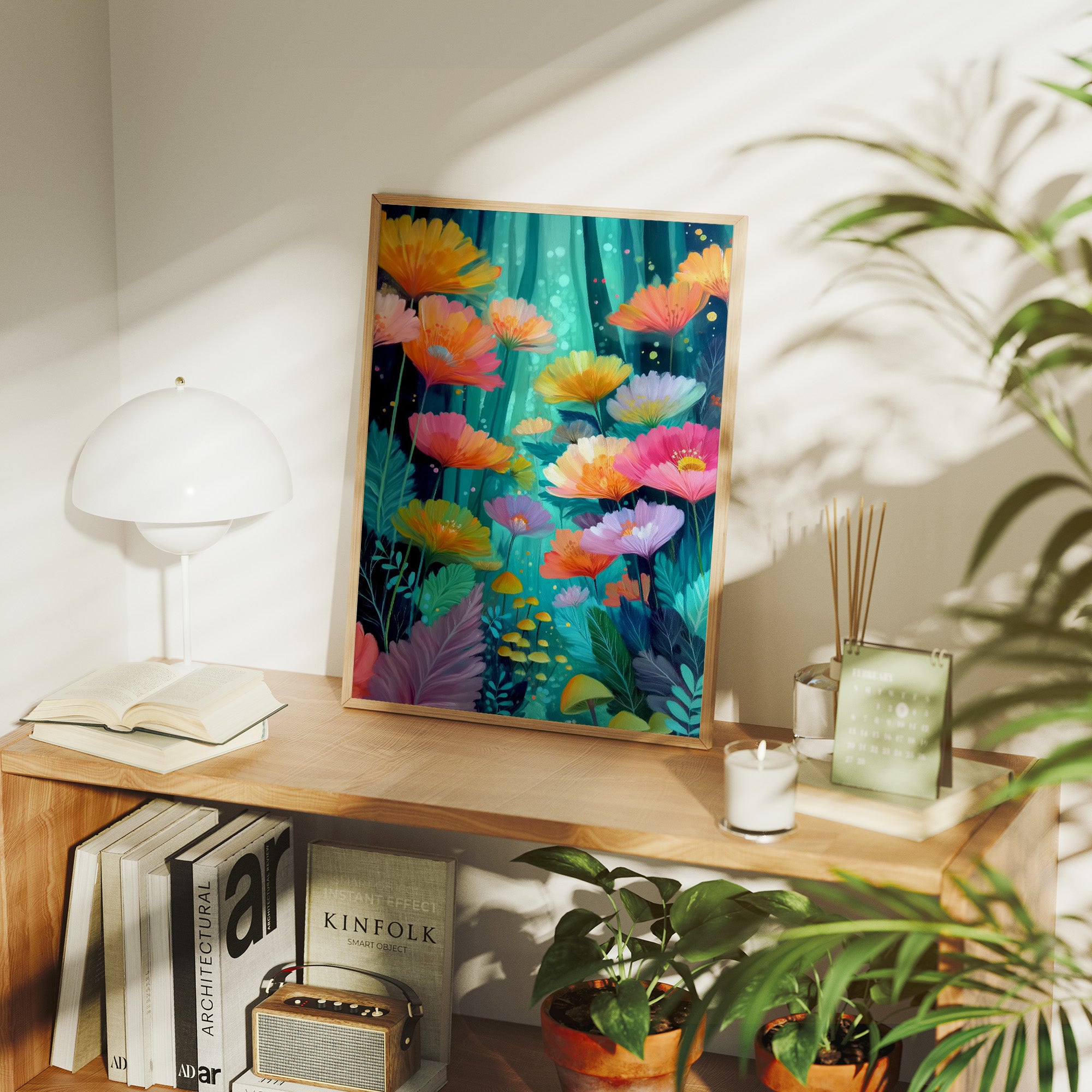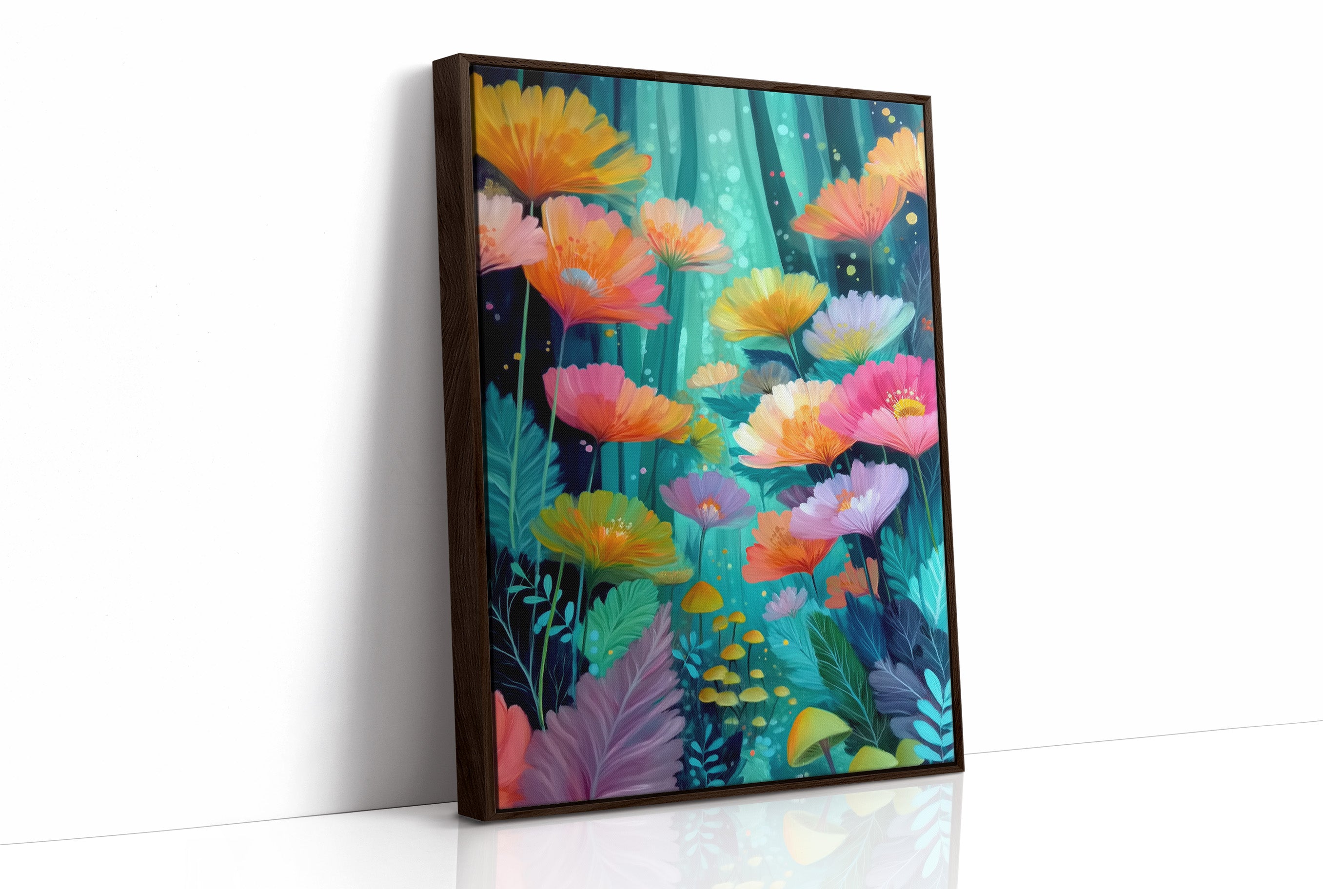 Luminous orange and pink poppies stretch toward an enchanted turquoise sky, their petals catching ethereal light like stained glass. The flowers emerge from a mysterious underwater-like atmosphere, where teal and indigo foliage creates depth and movement through layers of magical forest elements. Small golden mushrooms and floating particles add whimsy to this dreamlike botanical scene, transforming an ordinary garden into a nocturnal wonderland. This piece would bring an enchanting focal point to a modern bedroom or reading nook, where its vibrant yet soothing color palette can inspire moments of peaceful contemplation.