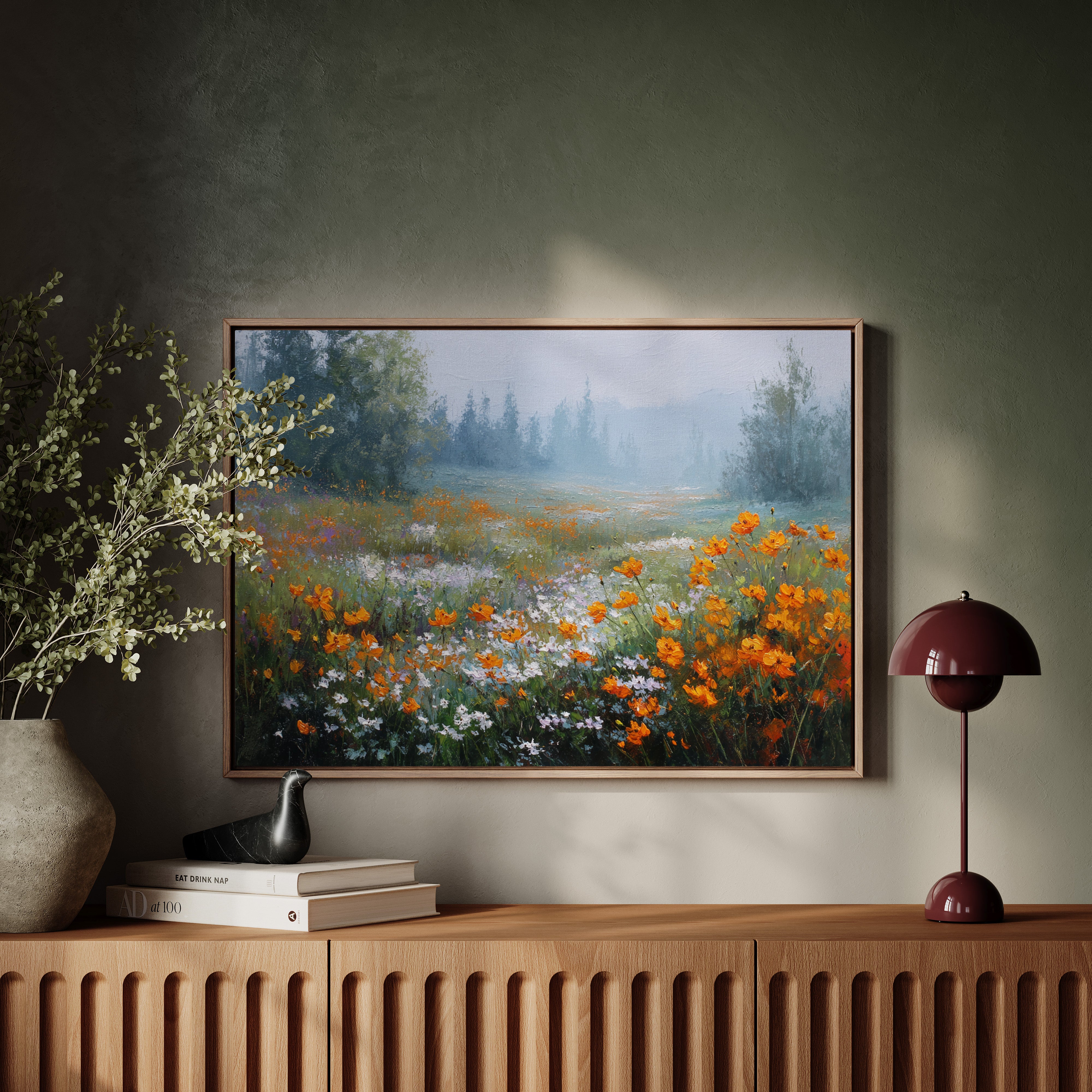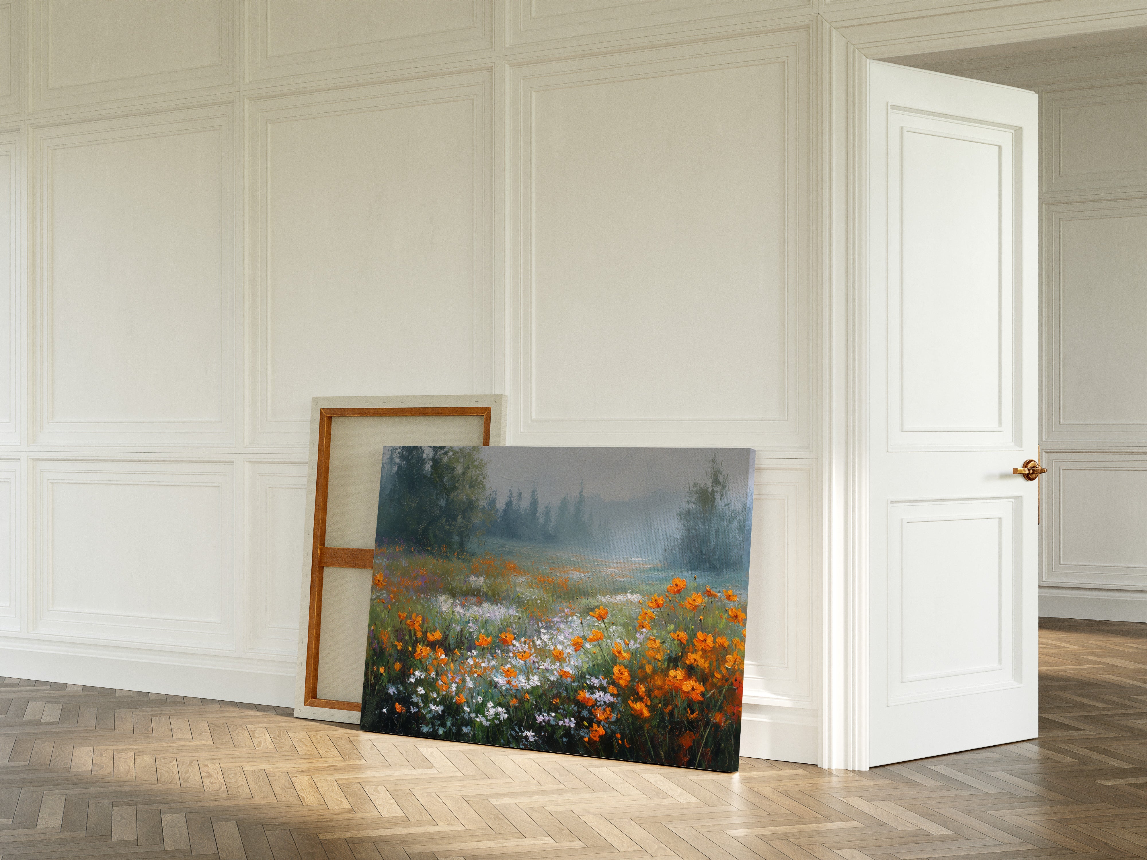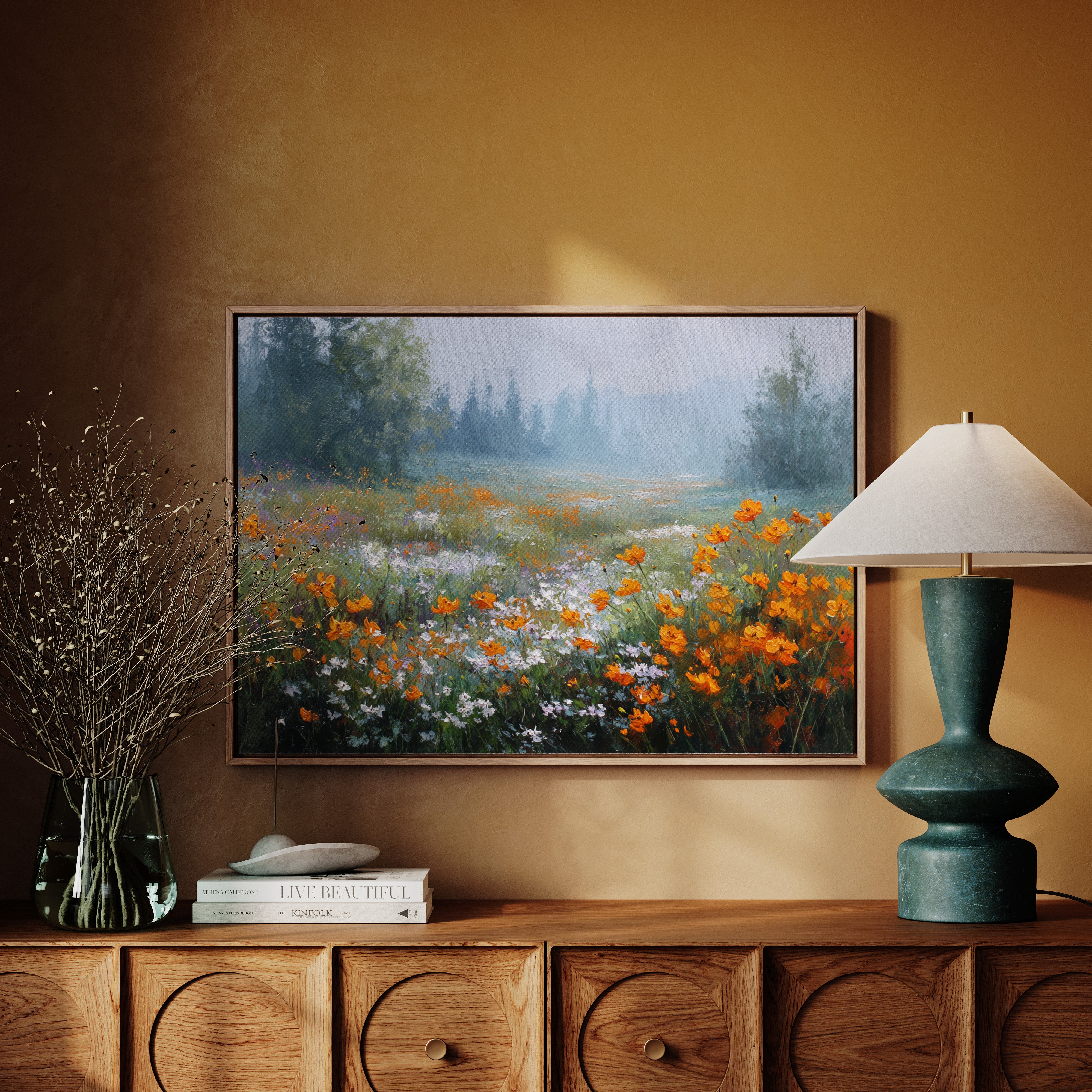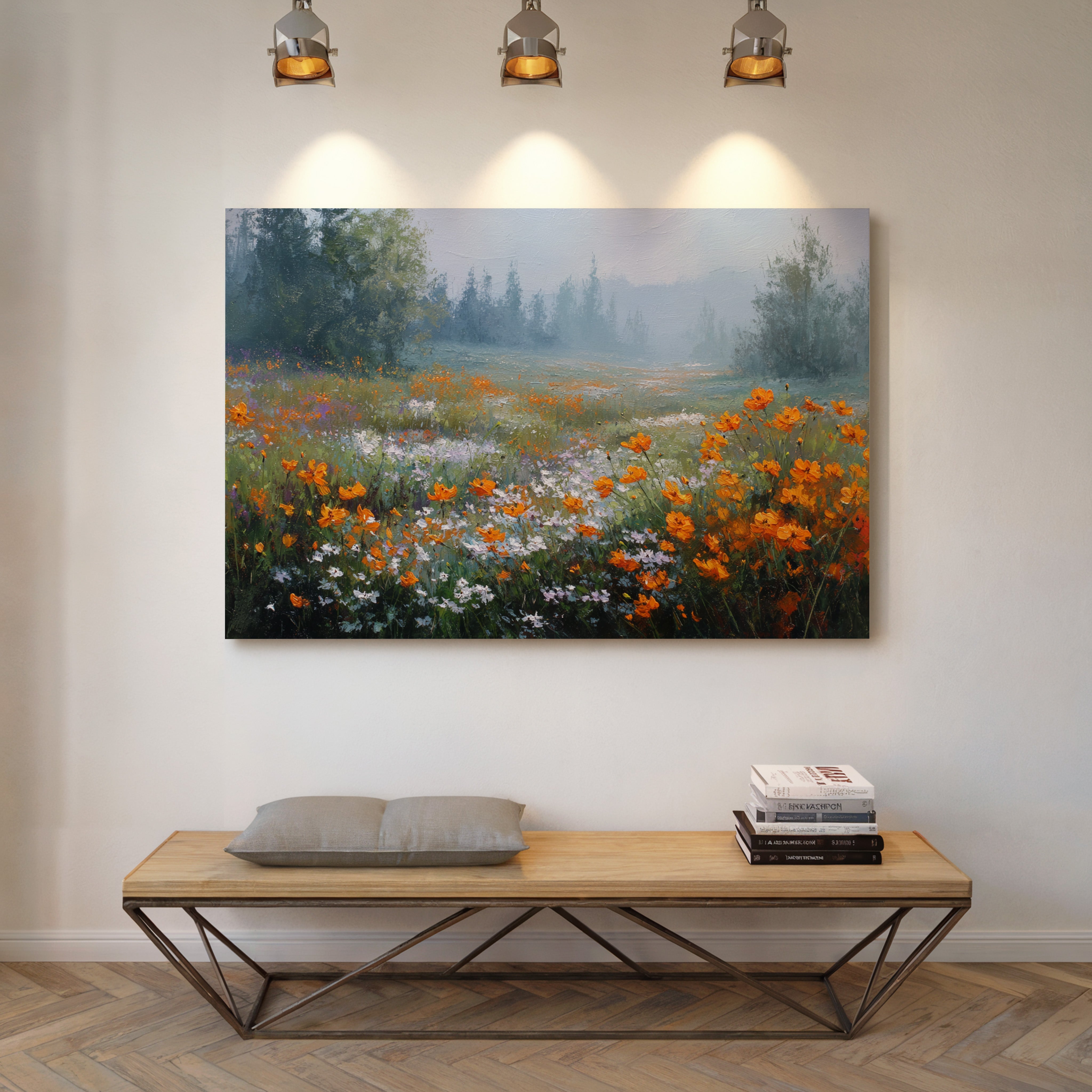 Morning fog rolls gently across the meadow, creating a dreamy backdrop for a vibrant display of nature's joy. Brilliant orange poppies stand proud among delicate white wildflowers, their petals catching the soft light like tiny lanterns in the misty air. The distant evergreens fade into blues and grays, creating layers of depth that draw the eye from the detailed foreground to the mysterious forest beyond. This piece would bring a perfect balance of serenity and vitality to a living room or bedroom, where its peaceful yet energetic presence can inspire quiet contemplation.