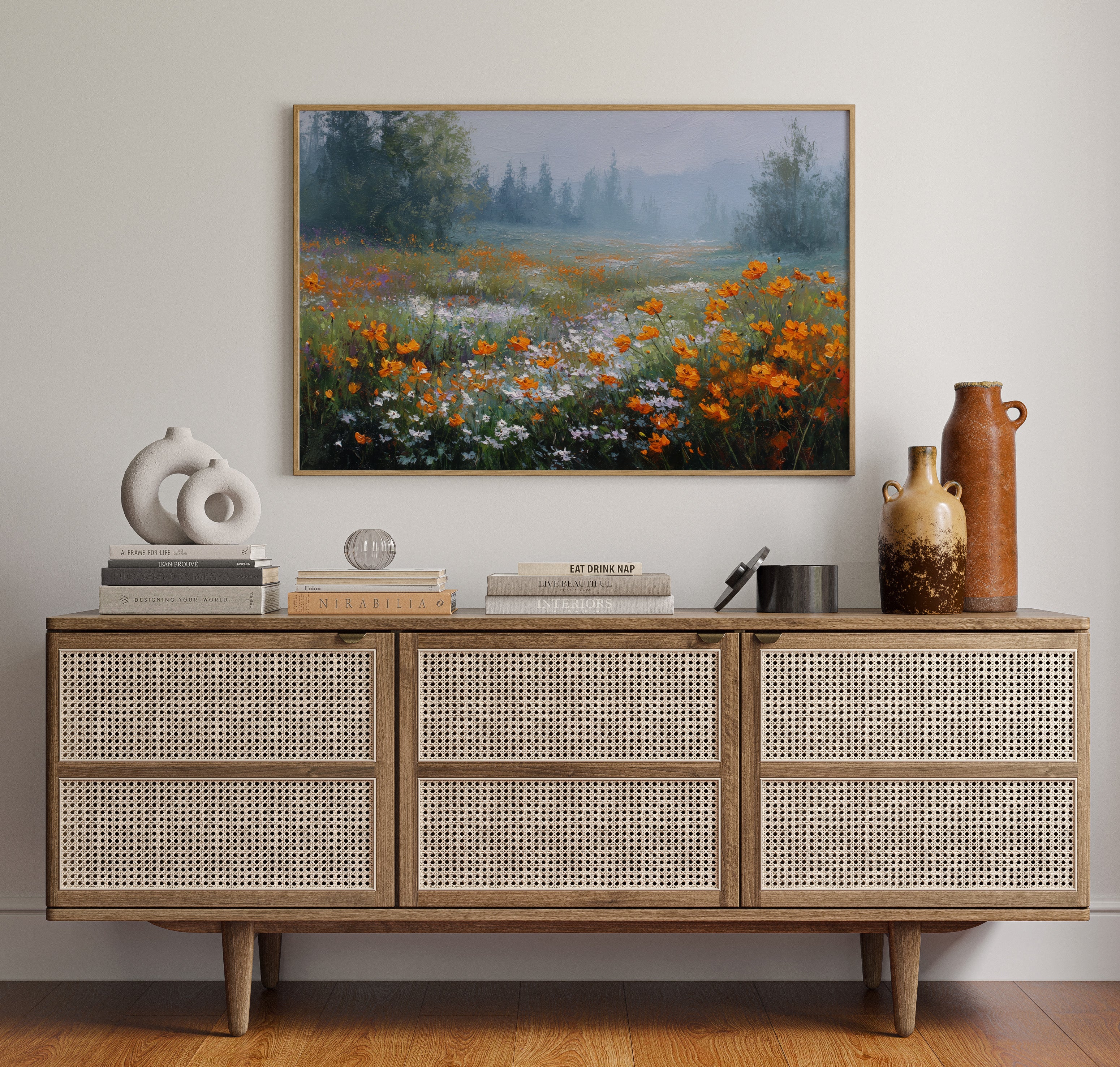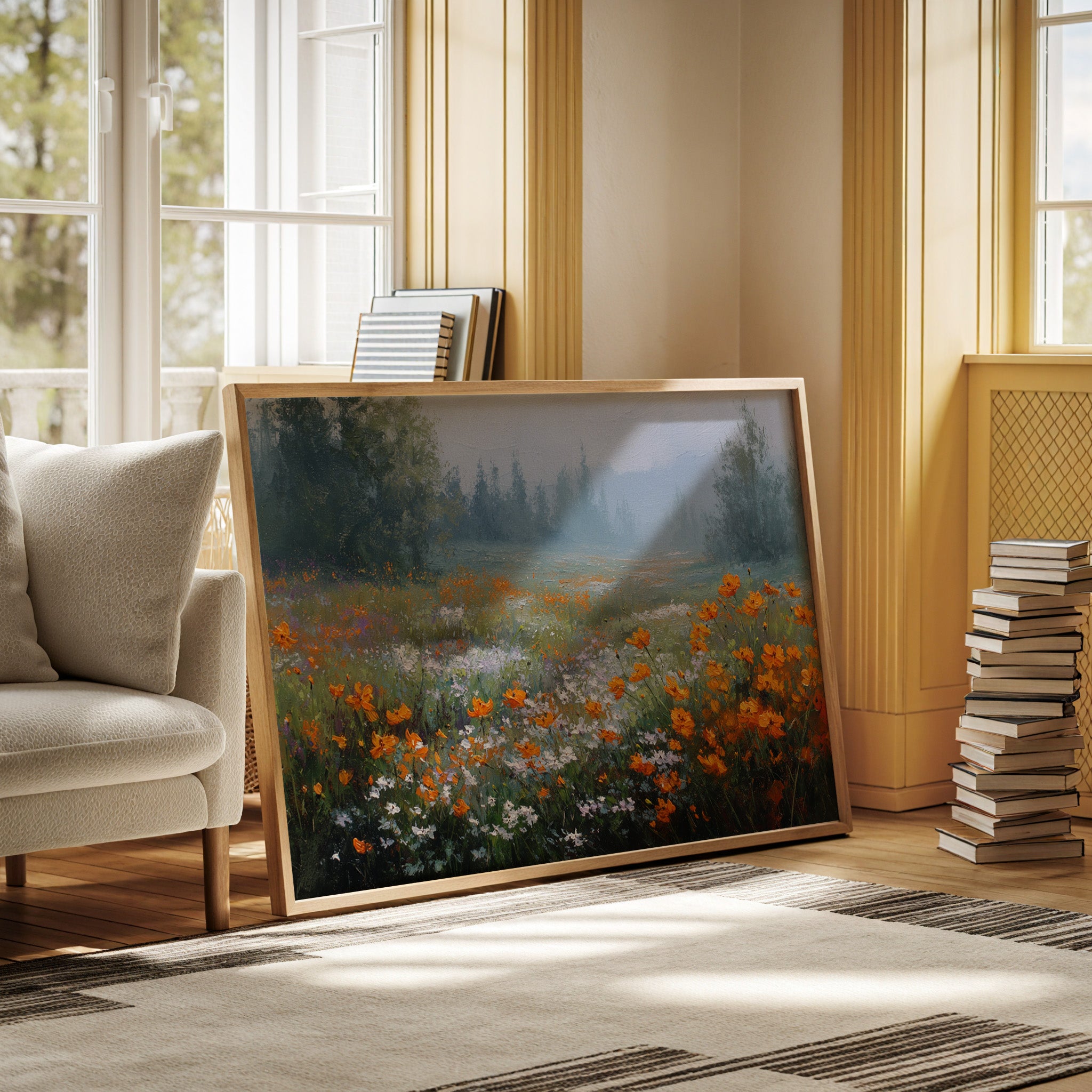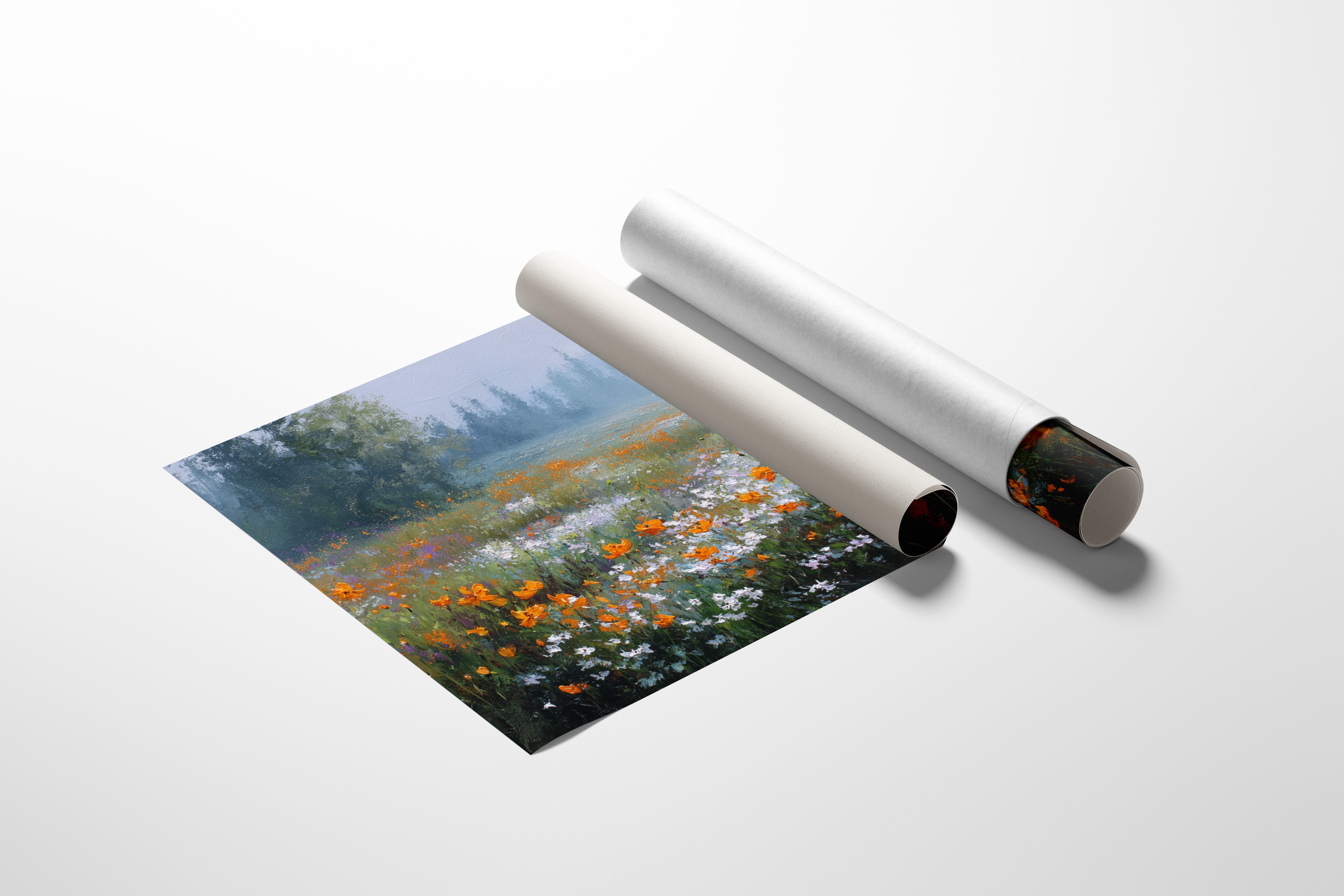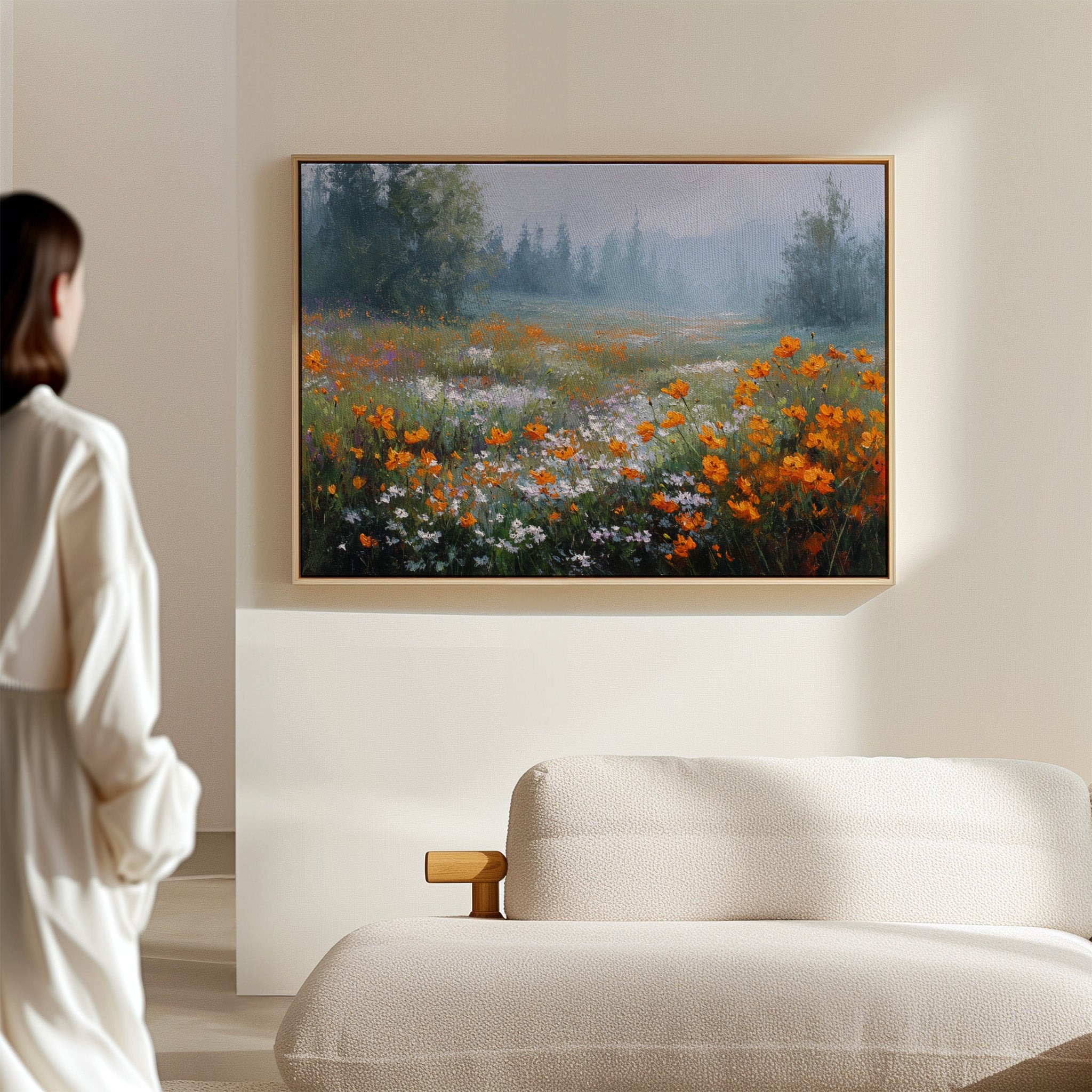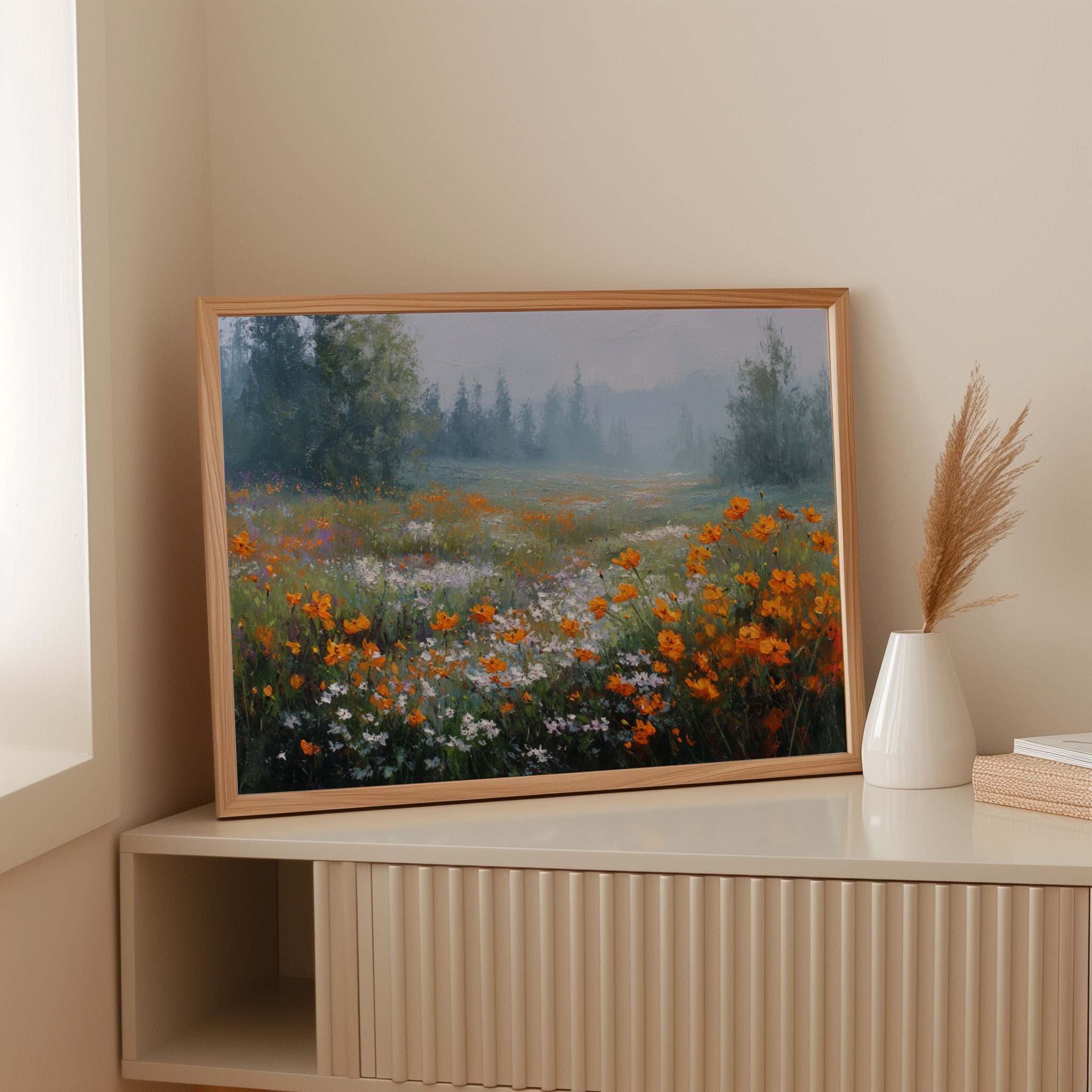 Morning fog rolls gently across the meadow, creating a dreamy backdrop for a vibrant display of nature's joy. Brilliant orange poppies stand proud among delicate white wildflowers, their petals catching the soft light like tiny lanterns in the misty air. The distant evergreens fade into blues and grays, creating layers of depth that draw the eye from the detailed foreground to the mysterious forest beyond. This piece would bring a perfect balance of serenity and vitality to a living room or bedroom, where its peaceful yet energetic presence can inspire quiet contemplation.