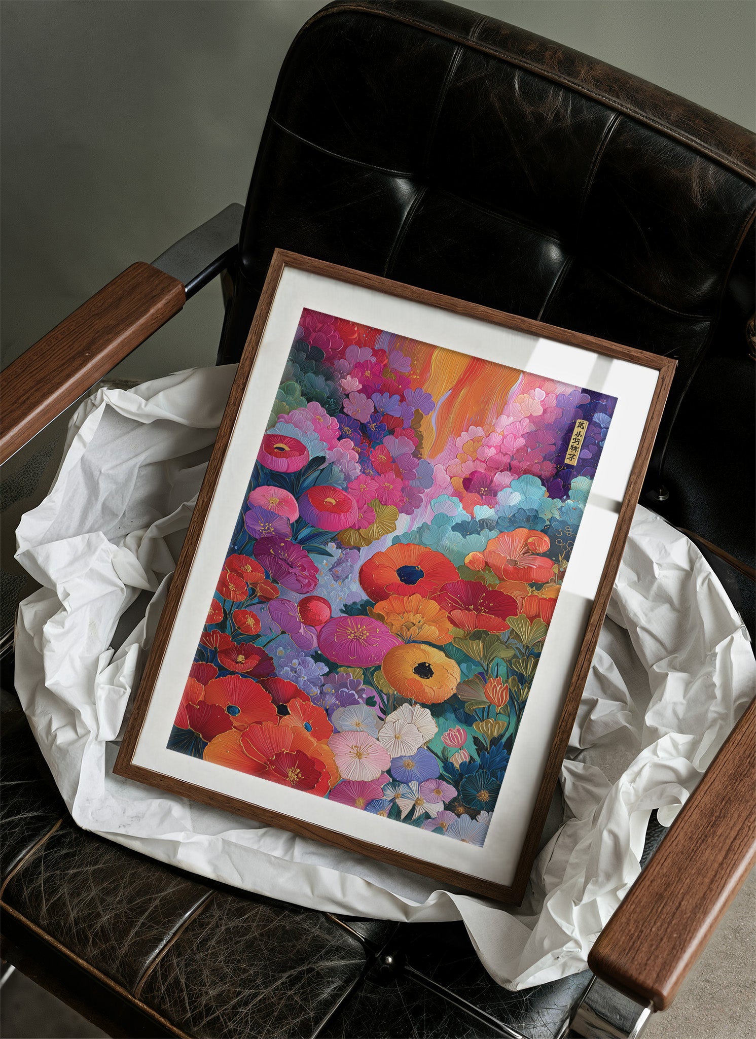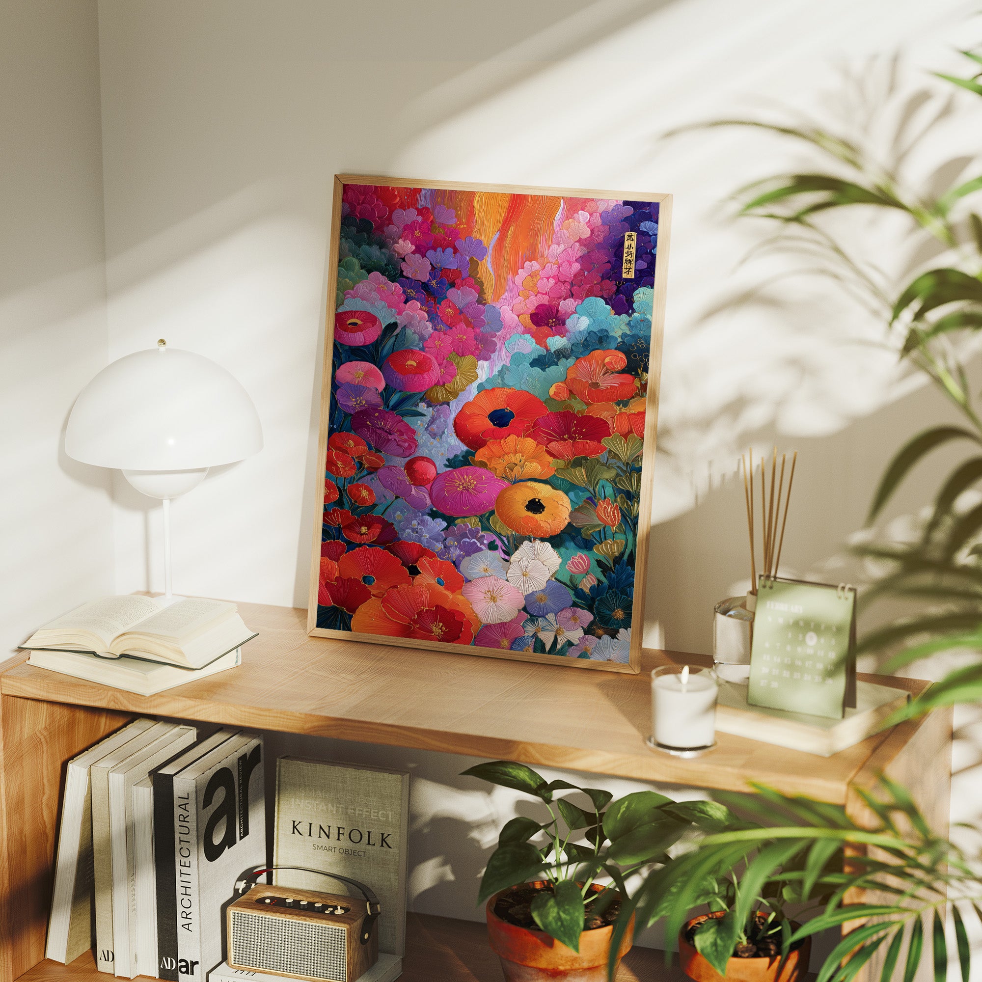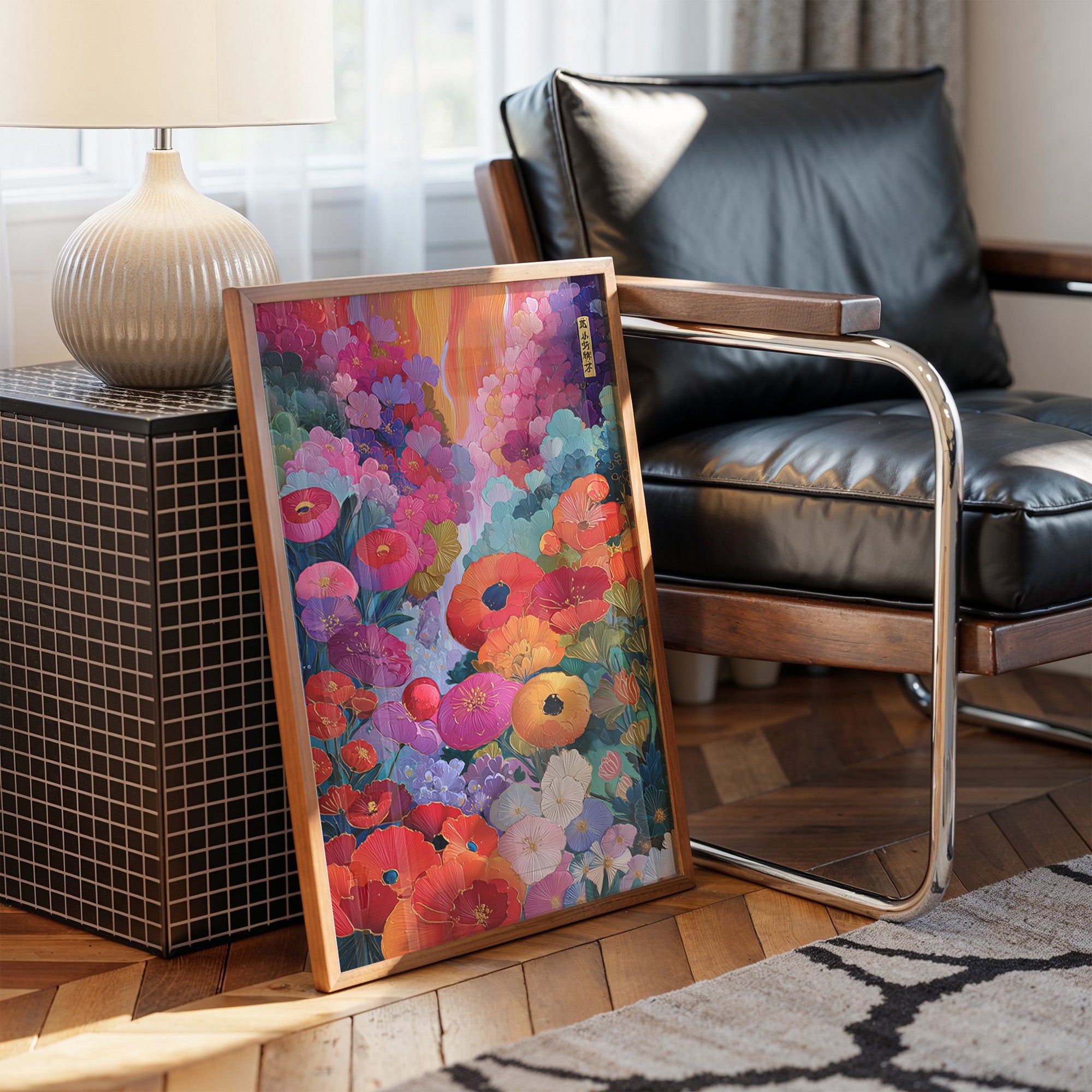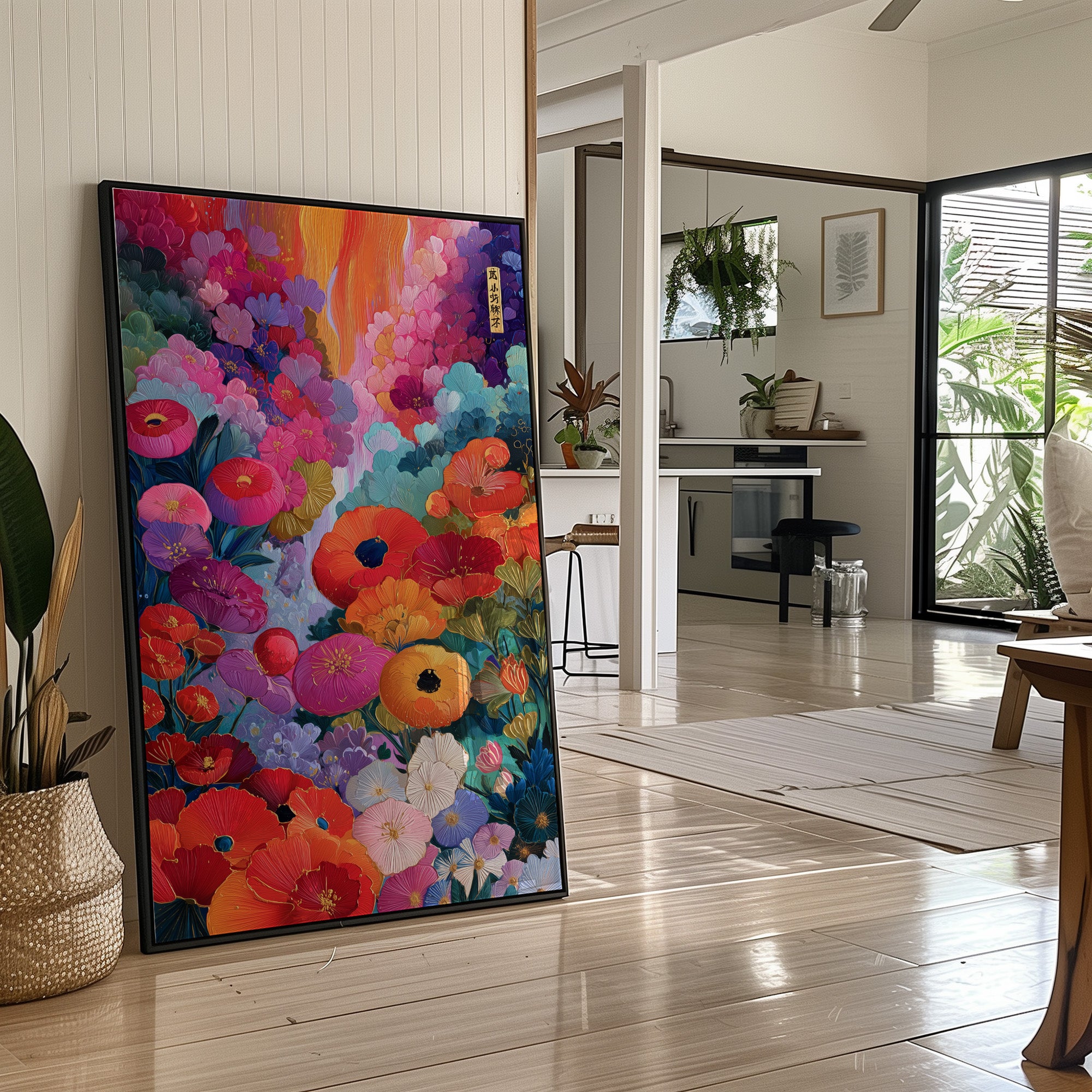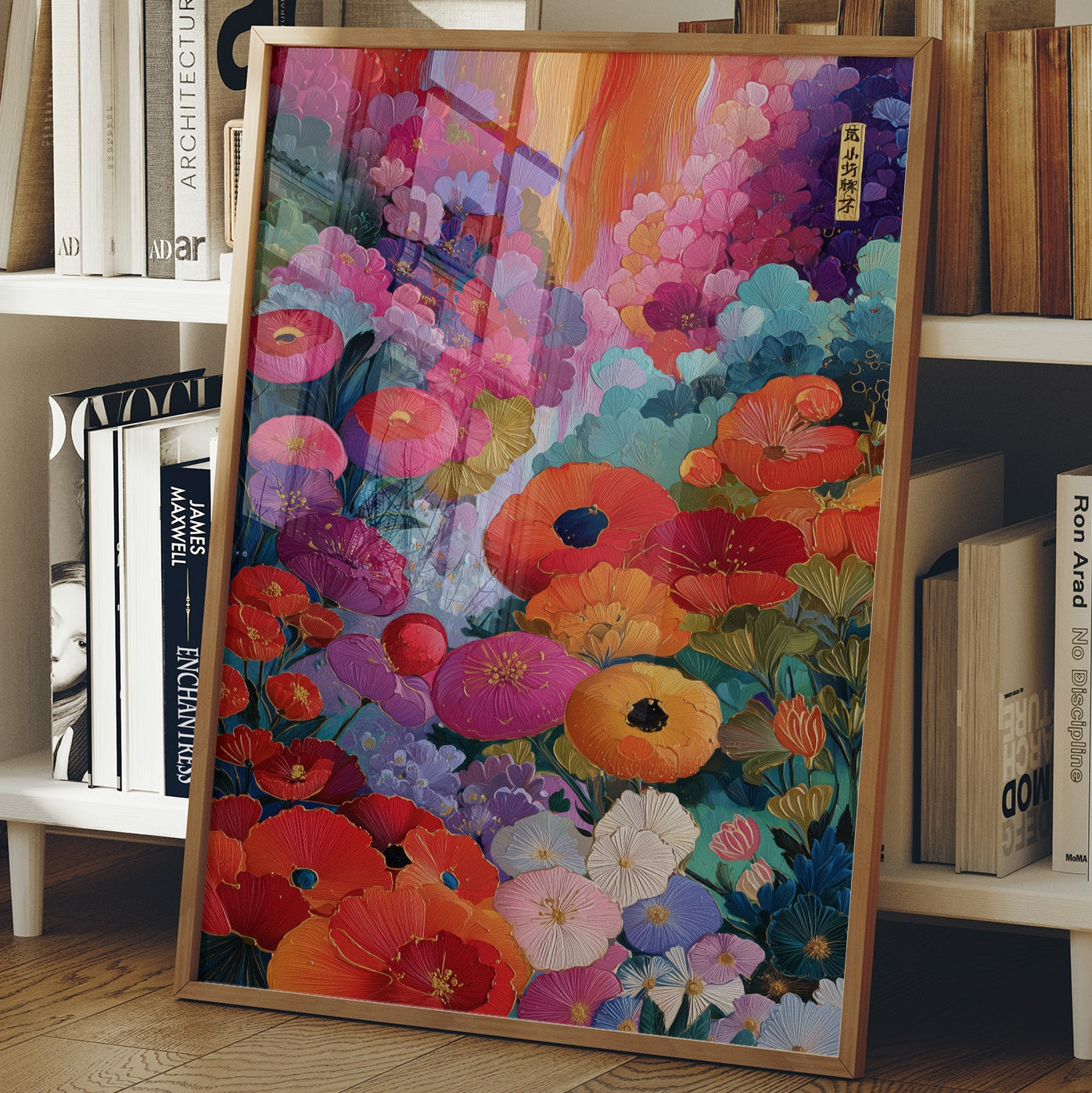 Vibrant coral and fuchsia poppies burst forth against a dreamy turquoise sky, creating a mesmerizing garden of color and light. The composition flows with dynamic energy, each bloom carefully rendered in a contemporary Japanese-inspired style that balances bold forms with delicate details. The interplay of warm oranges and cool purples creates a harmonious tension that draws the eye through the magical landscape. This piece brings serenity and artistic sophistication to any room, perfect for a reading nook or meditation space where its calming yet energetic presence can be fully appreciated.