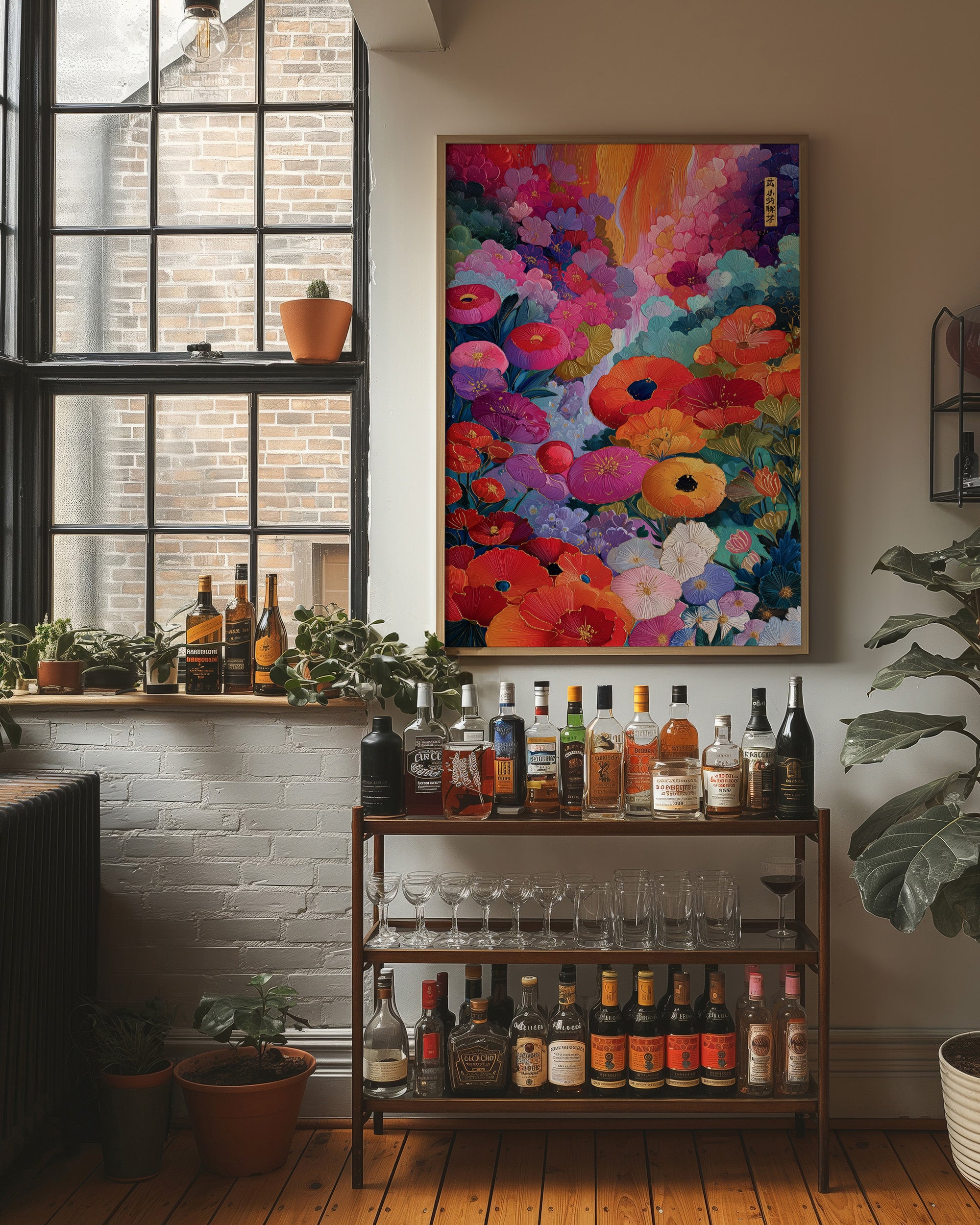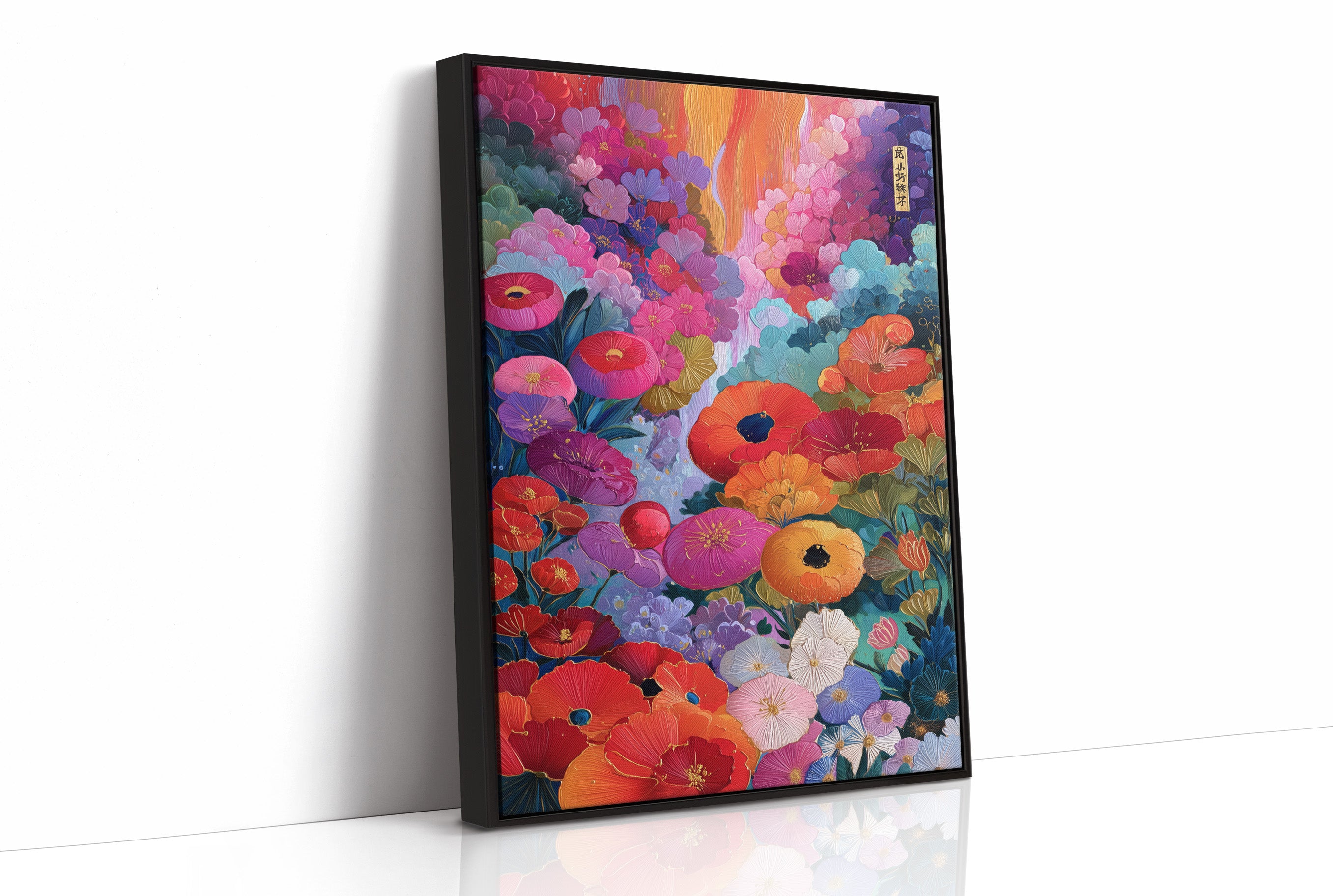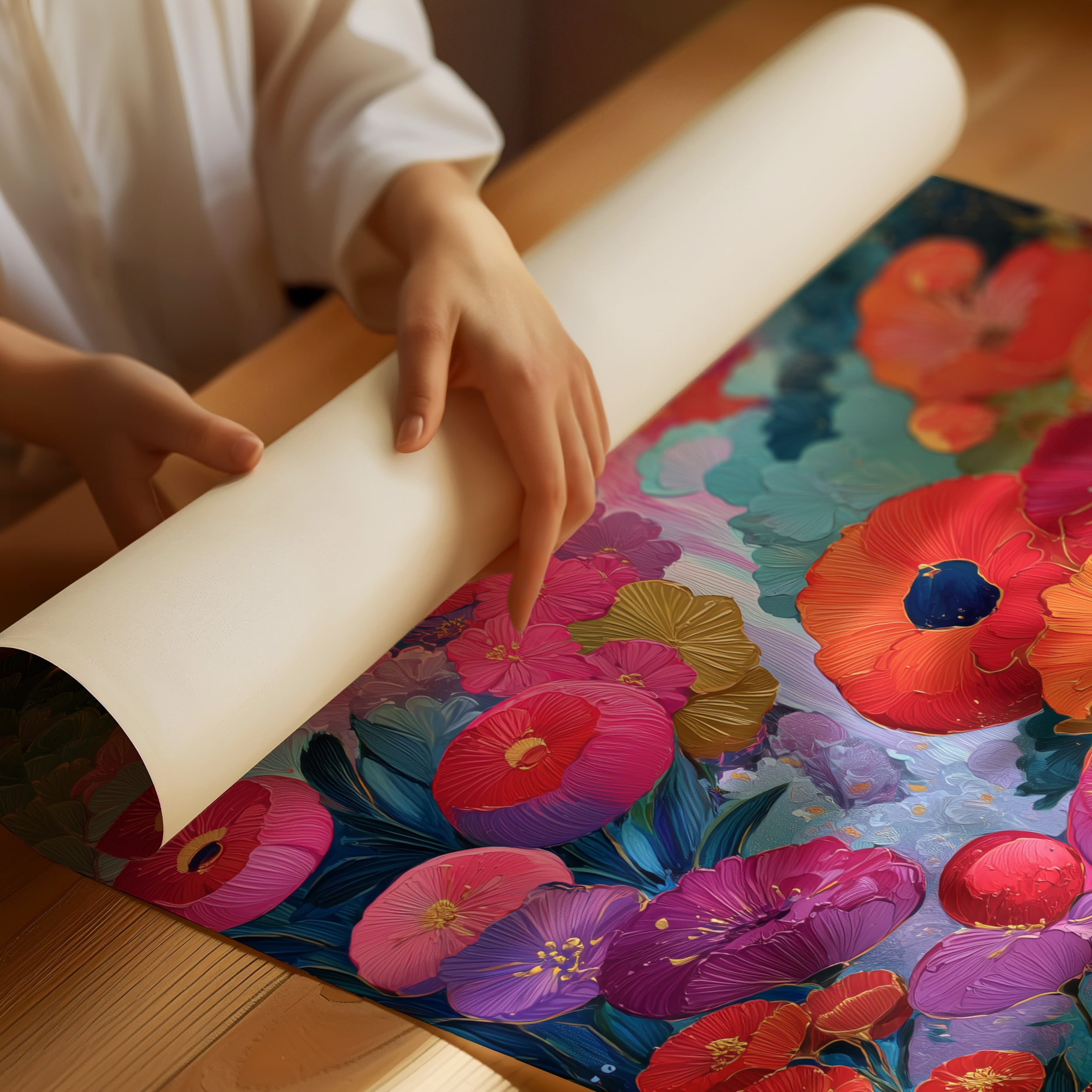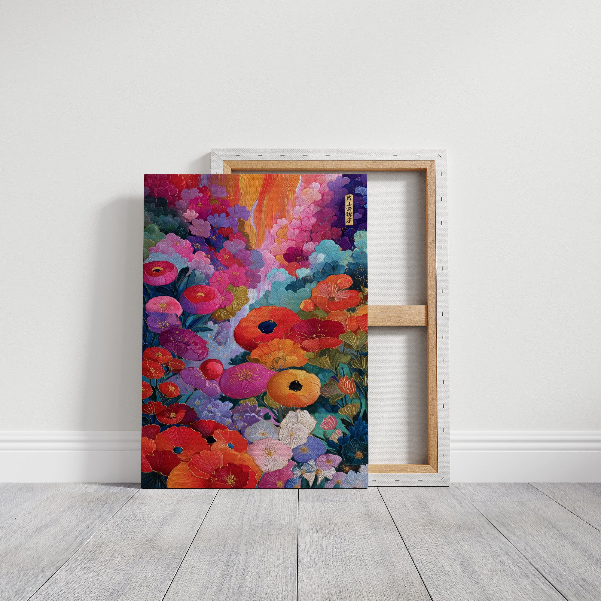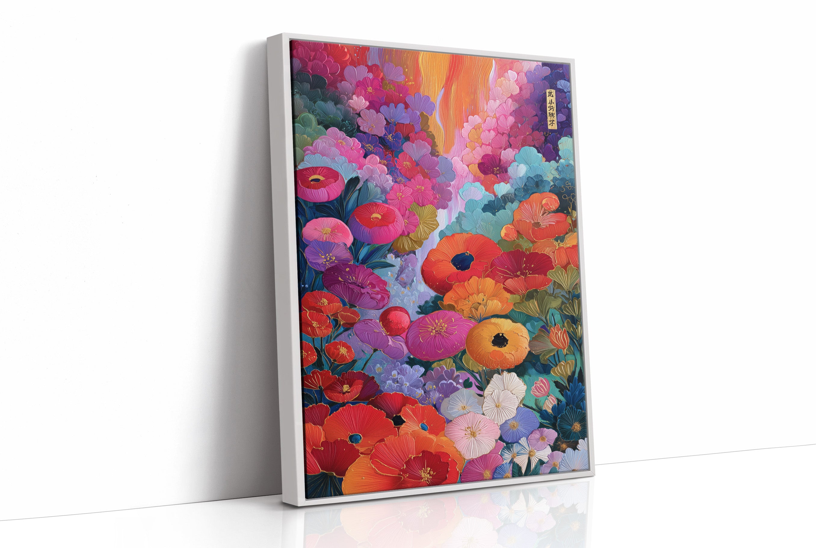 Vibrant coral and fuchsia poppies burst forth against a dreamy turquoise sky, creating a mesmerizing garden of color and light. The composition flows with dynamic energy, each bloom carefully rendered in a contemporary Japanese-inspired style that balances bold forms with delicate details. The interplay of warm oranges and cool purples creates a harmonious tension that draws the eye through the magical landscape. This piece brings serenity and artistic sophistication to any room, perfect for a reading nook or meditation space where its calming yet energetic presence can be fully appreciated.