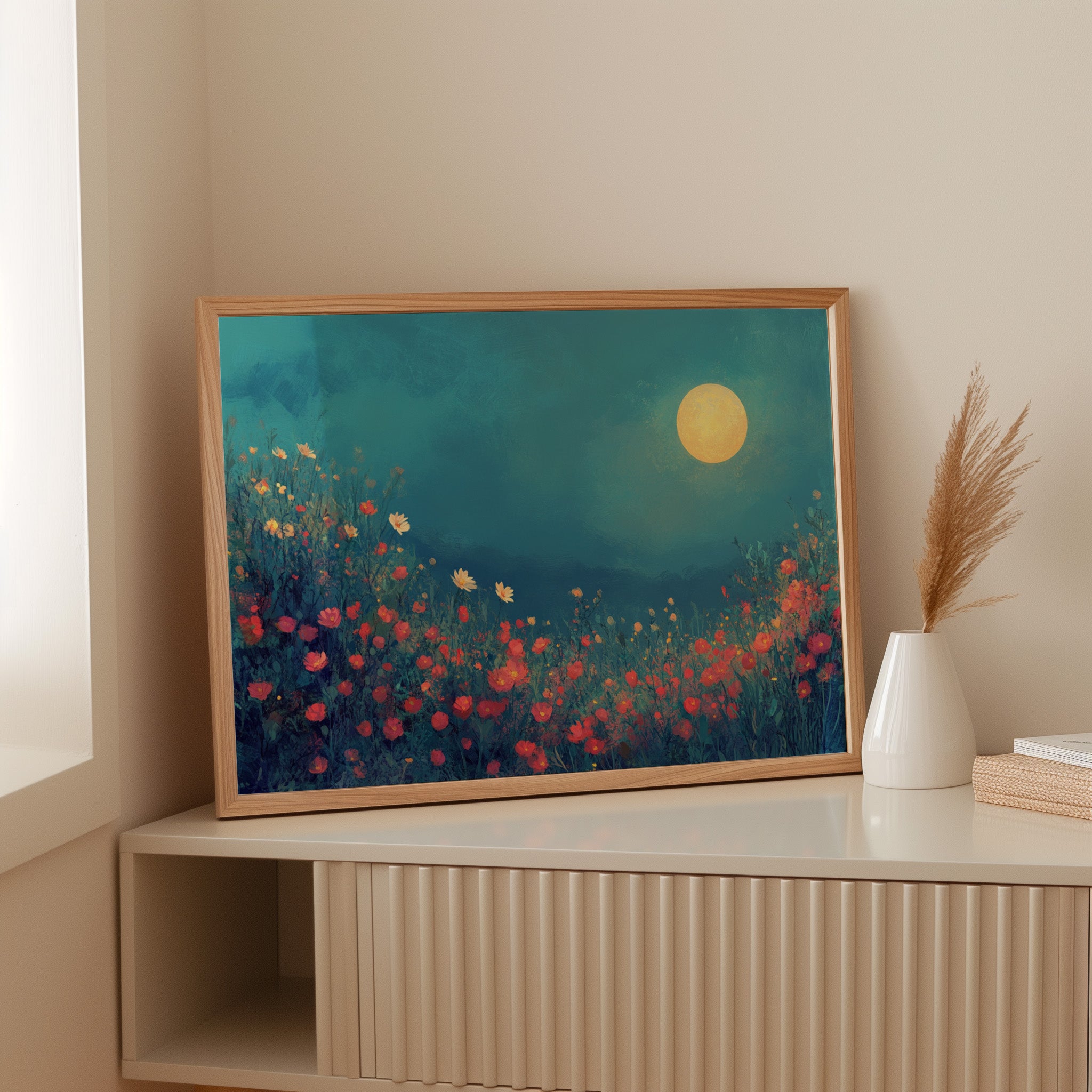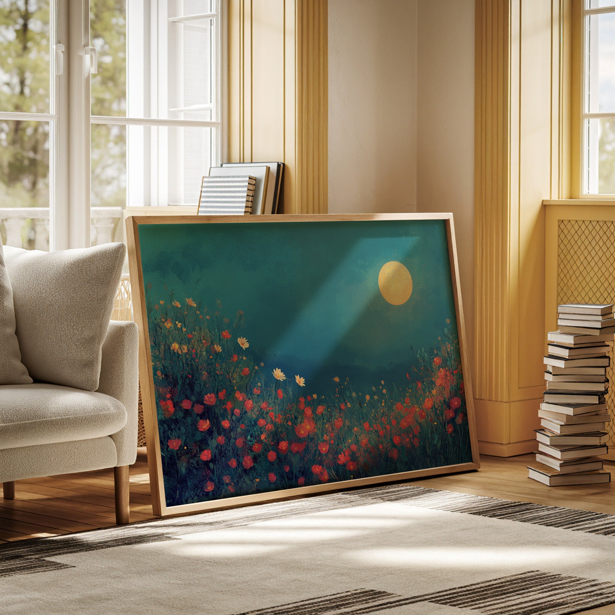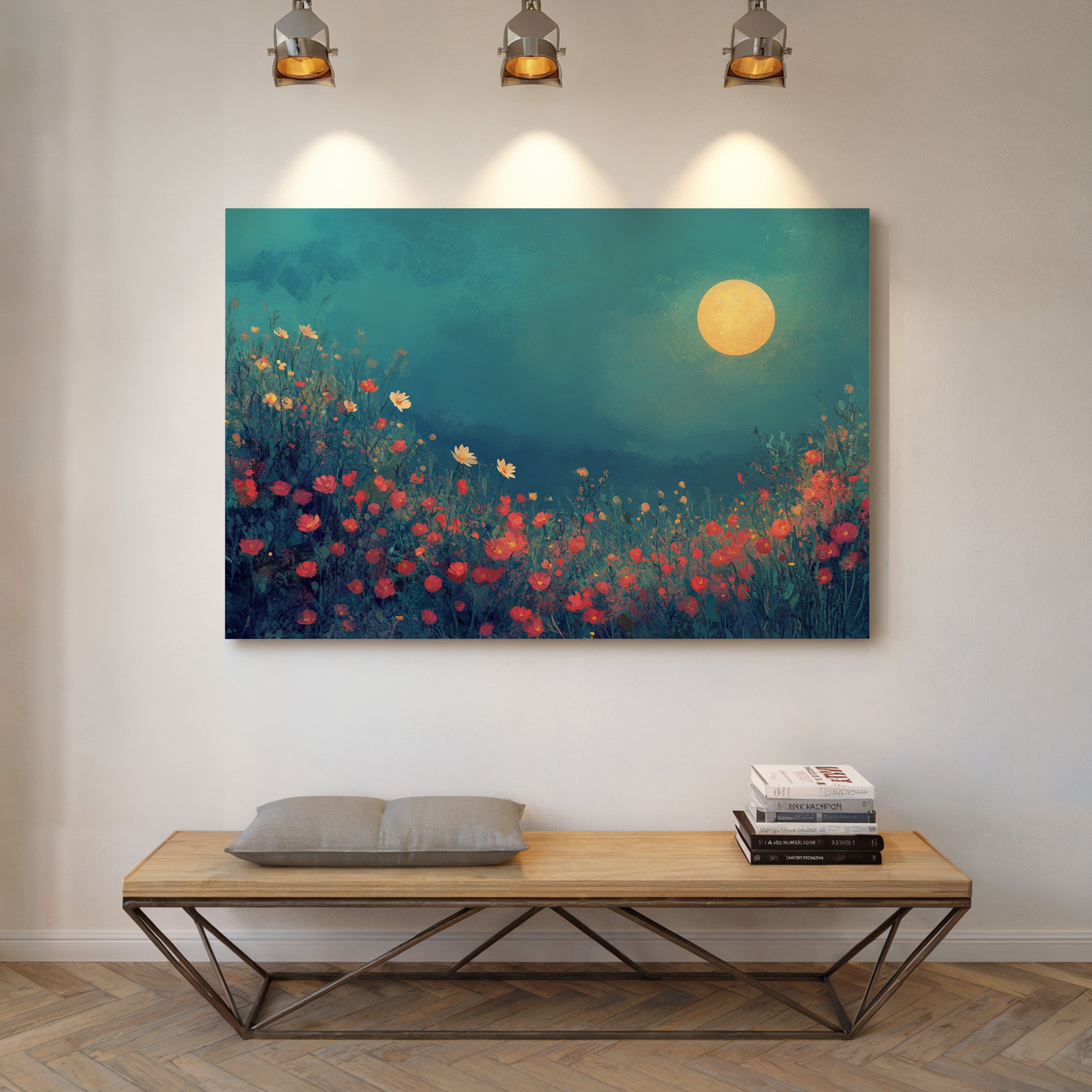 A celestial ballet unfolds as crimson poppies sway beneath a luminous full moon. The deep teal night sky creates a dramatic backdrop for the vibrant wildflowers, their delicate petals catching the golden moonlight. Coral and scarlet blooms mingle with soft yellow daisies in a natural garden, while mysterious shadows play among the stems and leaves. This enchanting nocturnal scene captures the magic of a midsummer night's garden in full bloom, where flowers seem to perform their secret rituals under moonlit guidance. Perfect for creating a dreamy focal point in a bedroom or adding a touch of natural romance to a reading nook.