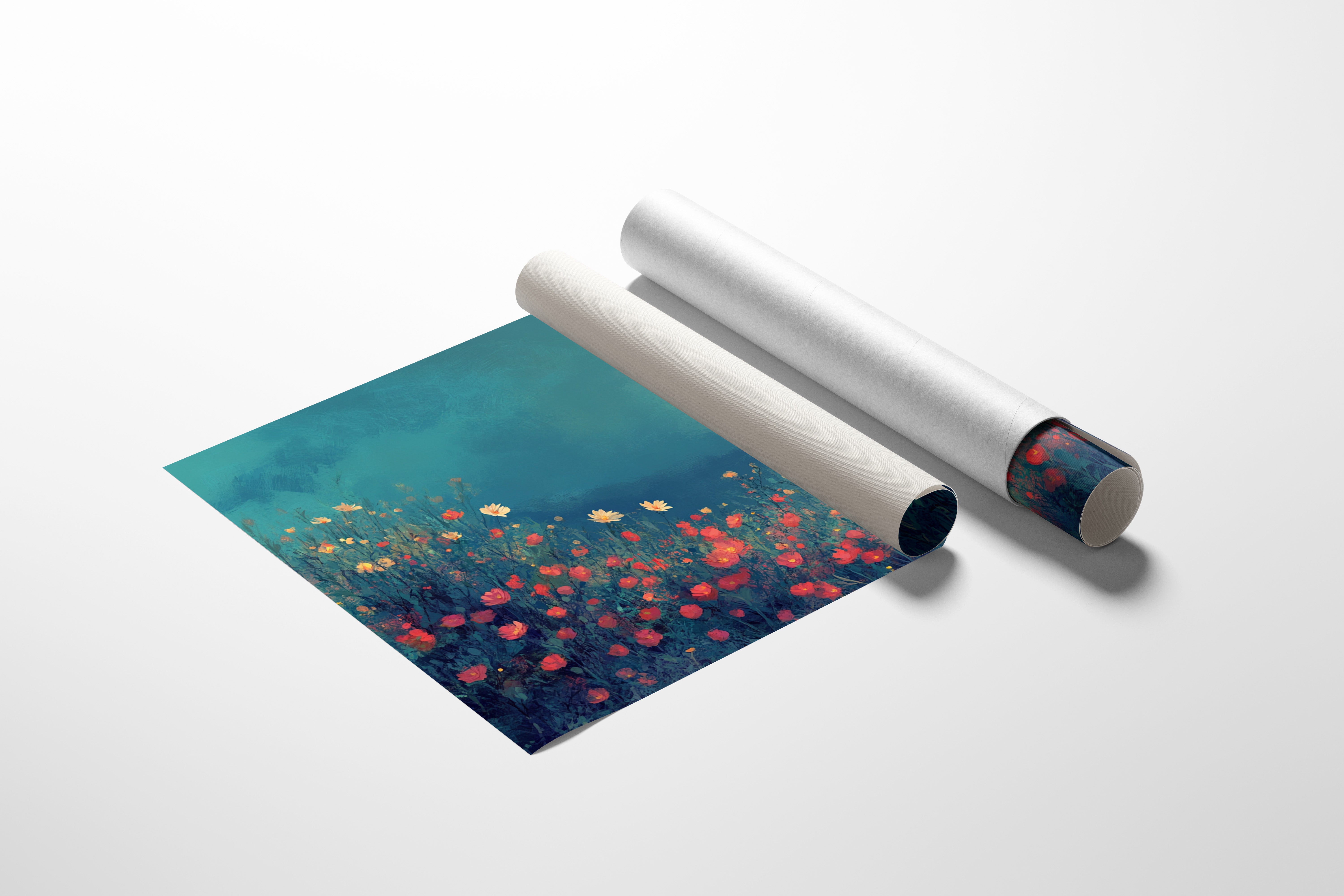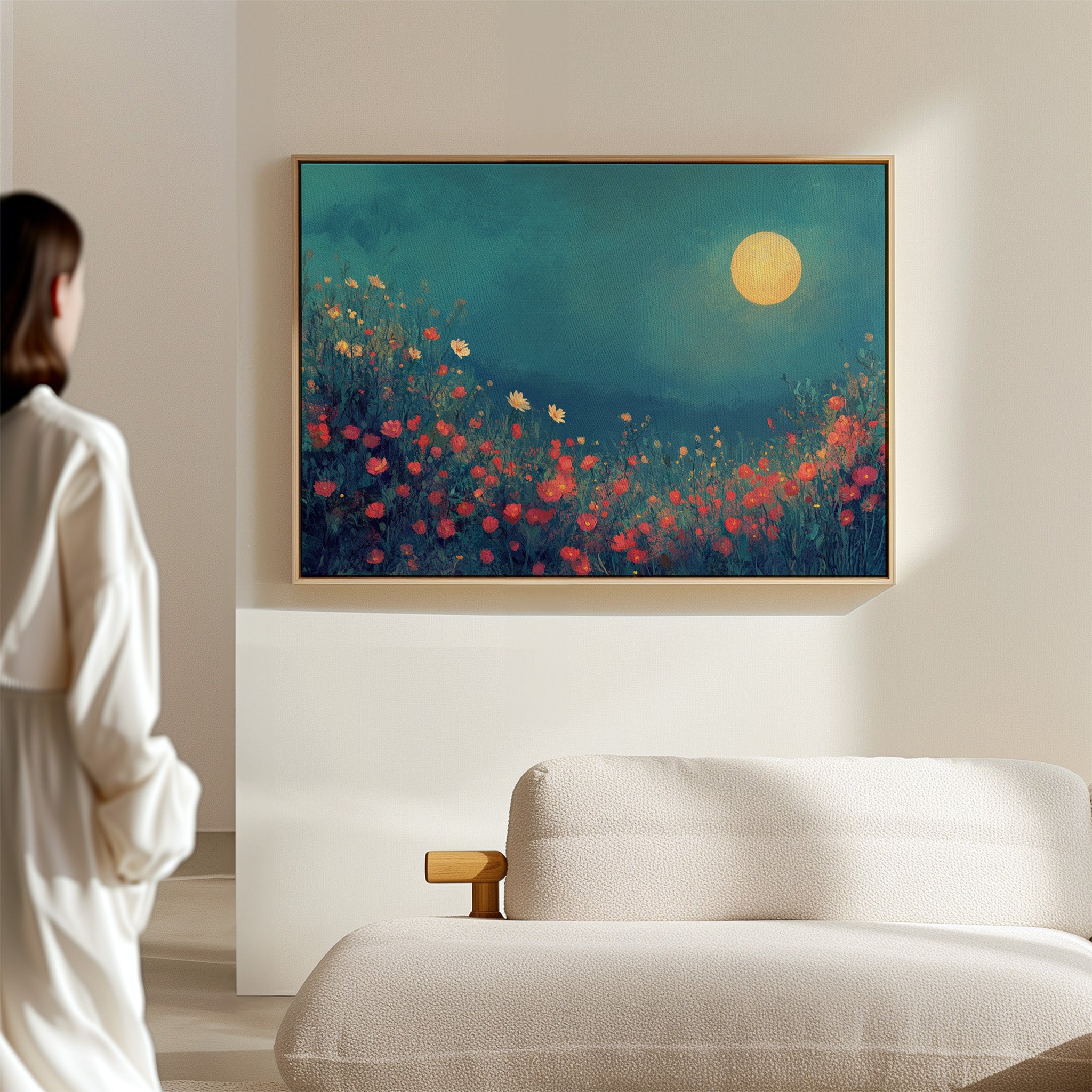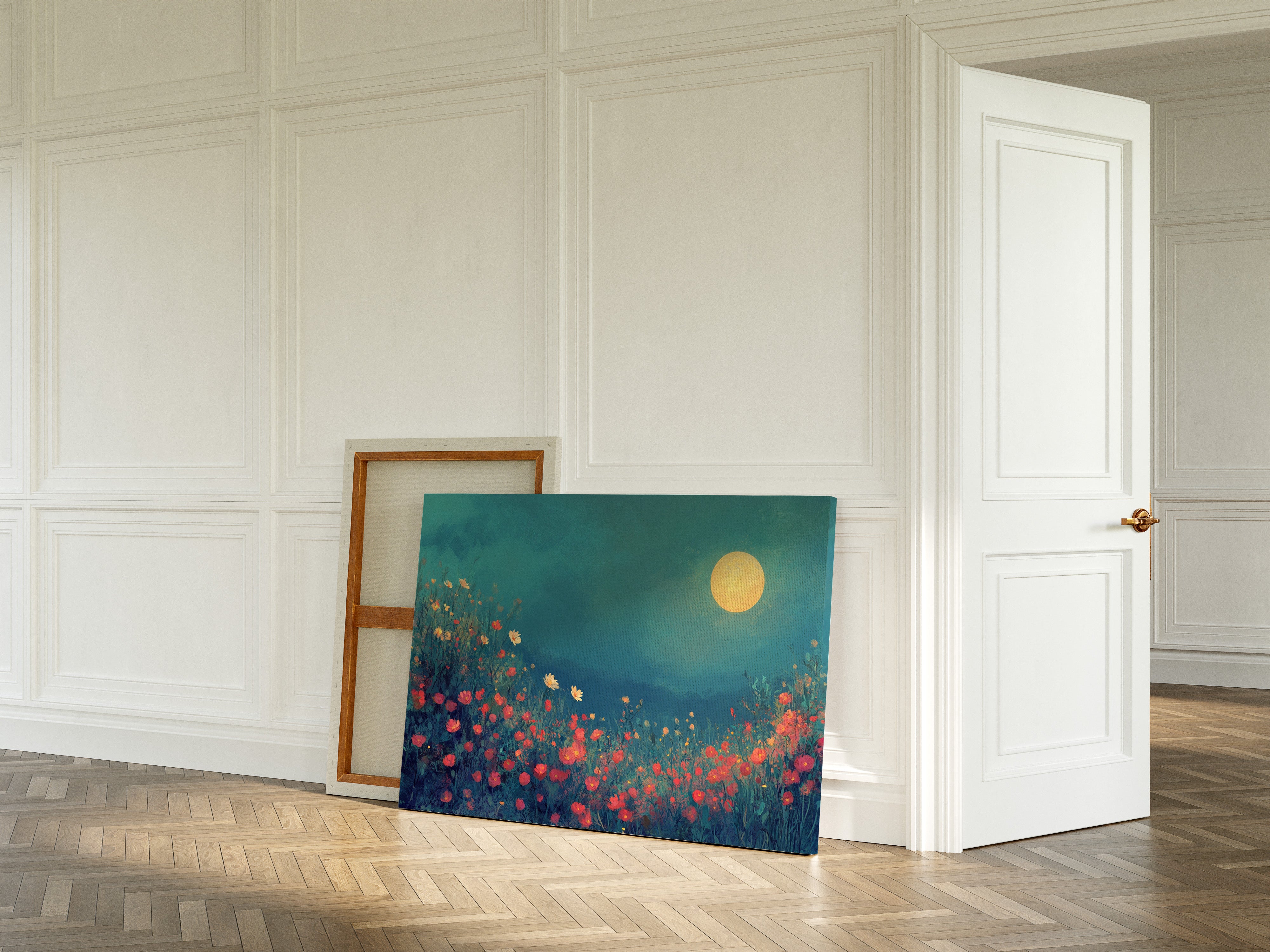 A celestial ballet unfolds as crimson poppies sway beneath a luminous full moon. The deep teal night sky creates a dramatic backdrop for the vibrant wildflowers, their delicate petals catching the golden moonlight. Coral and scarlet blooms mingle with soft yellow daisies in a natural garden, while mysterious shadows play among the stems and leaves. This enchanting nocturnal scene captures the magic of a midsummer night's garden in full bloom, where flowers seem to perform their secret rituals under moonlit guidance. Perfect for creating a dreamy focal point in a bedroom or adding a touch of natural romance to a reading nook.