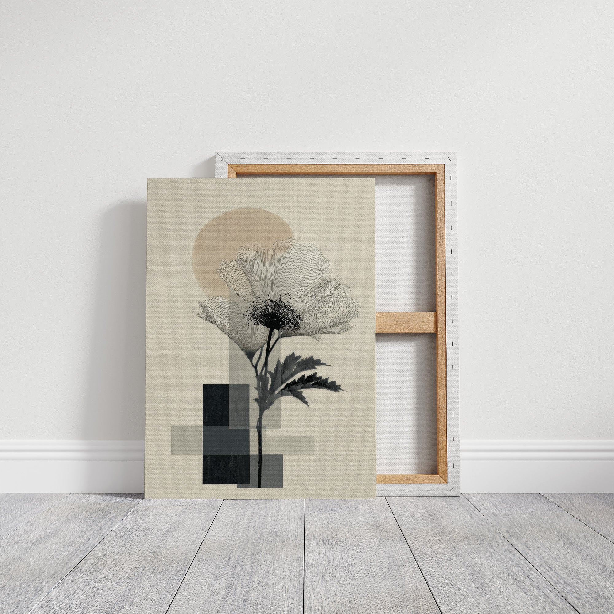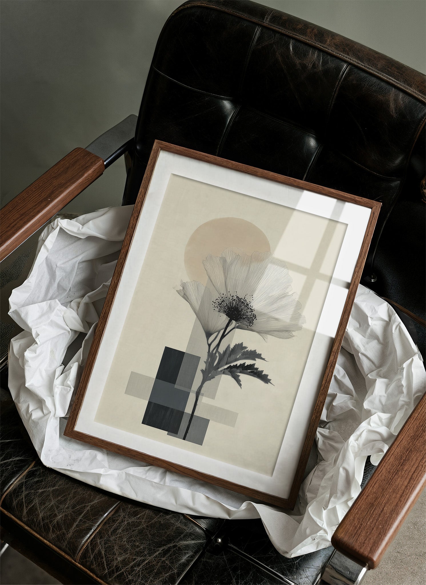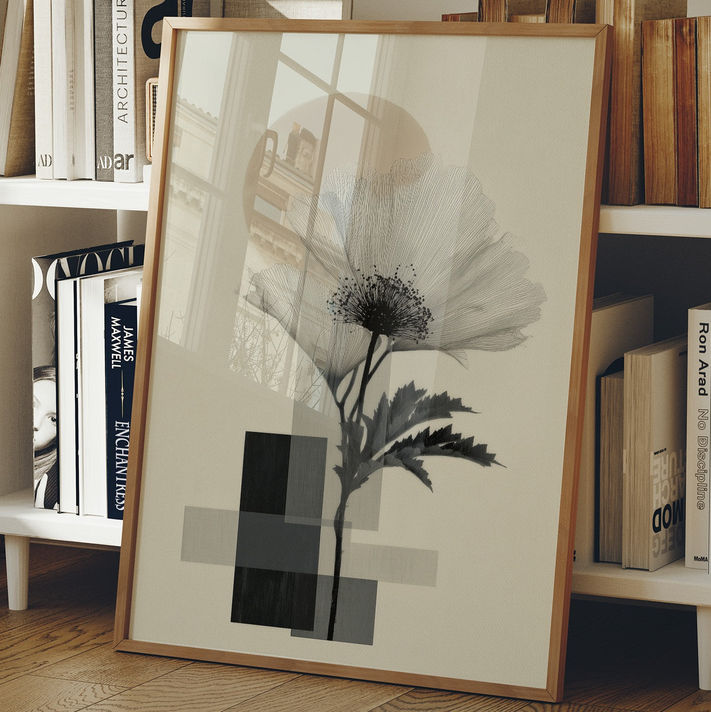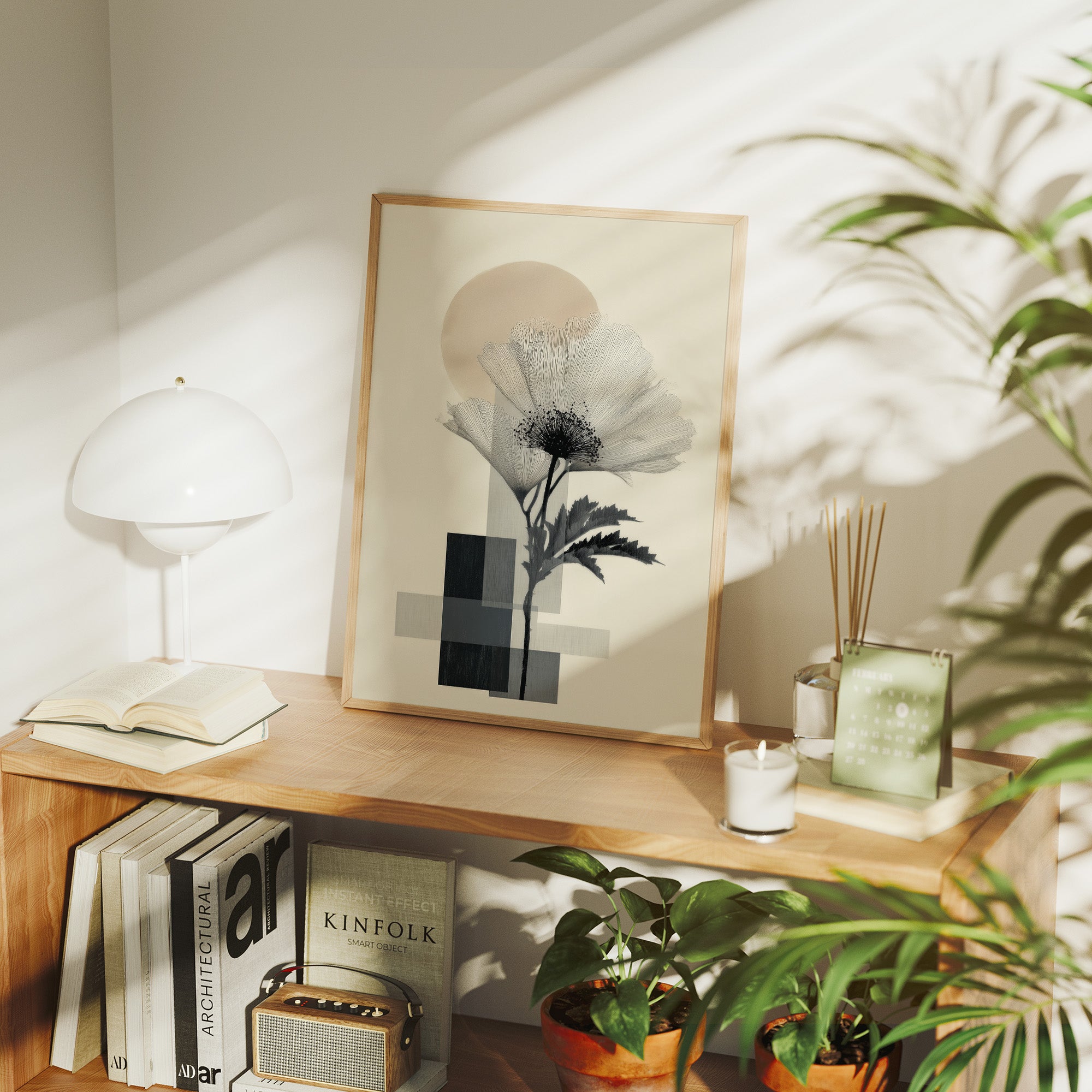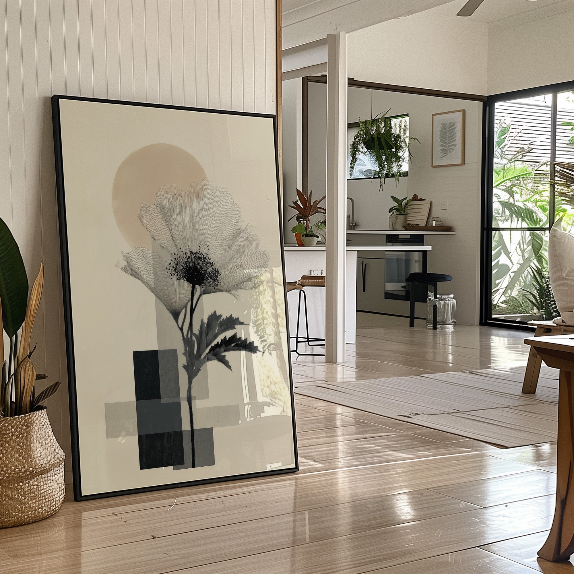 Sunlight streams through industrial windows, casting gentle shadows across a sophisticated home bar setup. A minimalist botanical print featuring a translucent poppy takes center stage, its delicate petals floating above geometric shapes in a study of light and shadow. The careful arrangement of premium spirits on iron shelving creates a perfect balance between refined taste and urban charm, while potted plants add organic warmth to the brick-walled space.