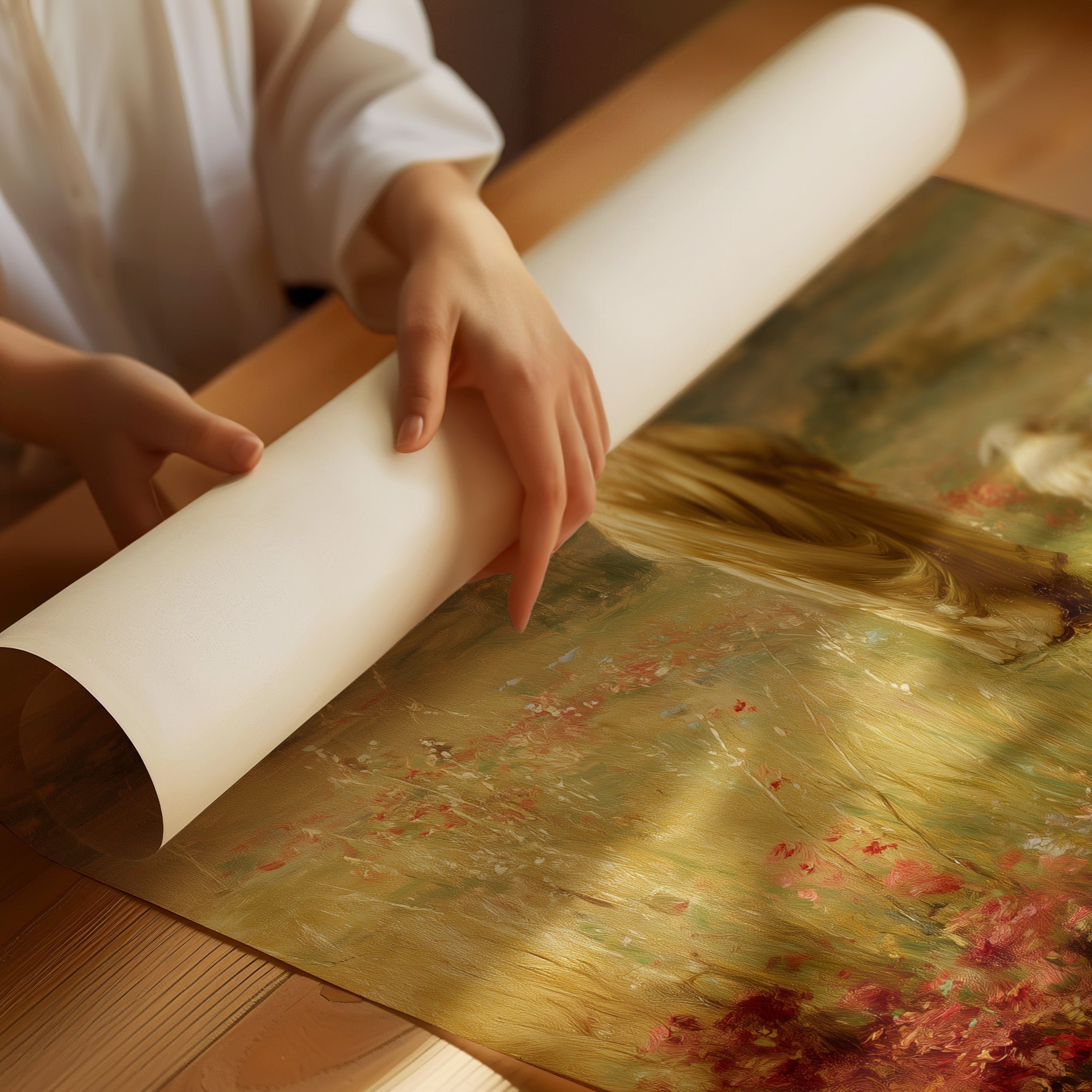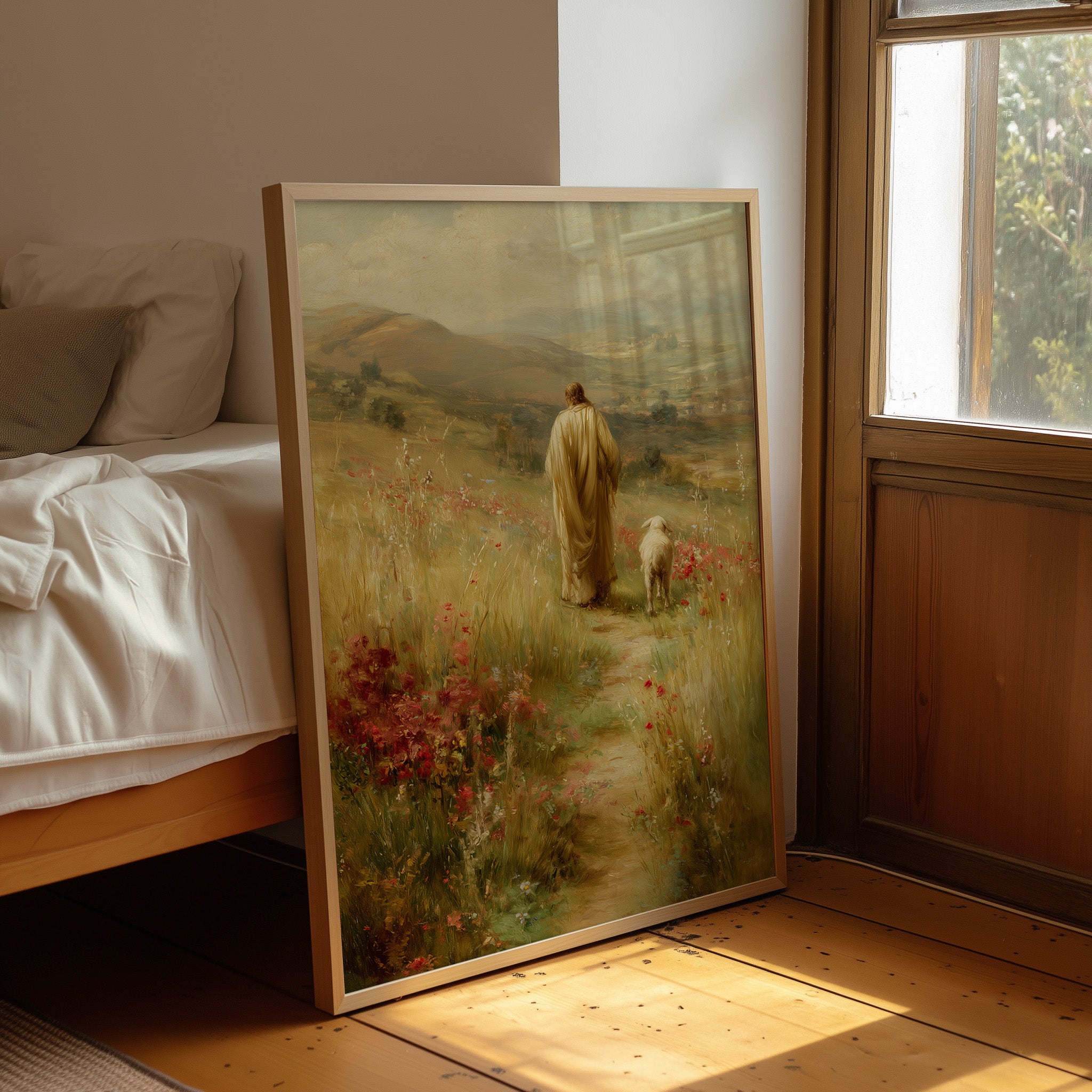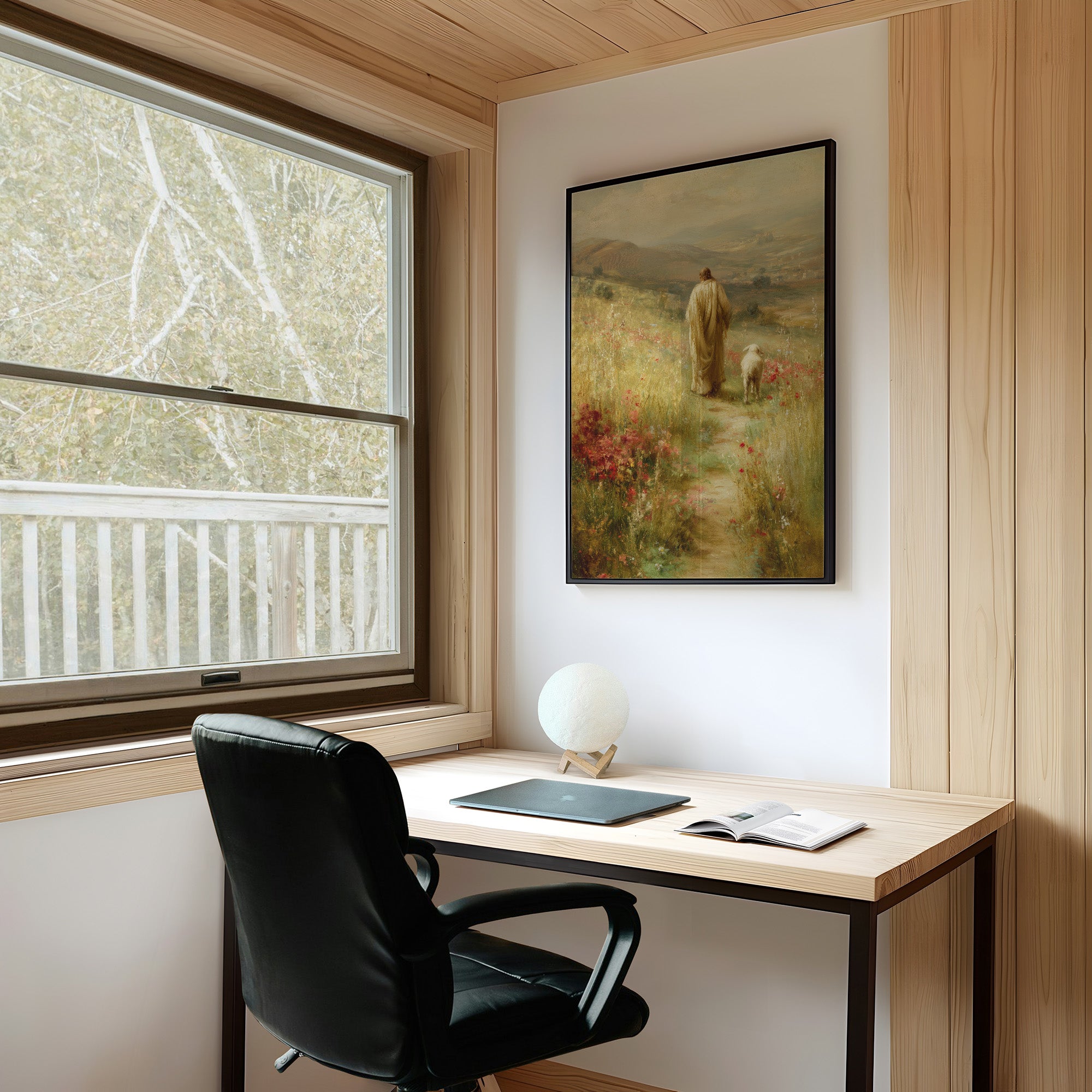 Morning light catches on a painting that tells of simpler times, where a solitary figure and their lamb traverse a meadow dotted with scarlet poppies. The pastoral scene unfolds with gentle brushstrokes, capturing rolling hills that fade into misty distance, while warm golds and greens create a tapestry of tranquil countryside. This nostalgic artwork rests on a rustic wooden table, the kind of contemplative piece that brings timeless serenity to a reading nook or home office.