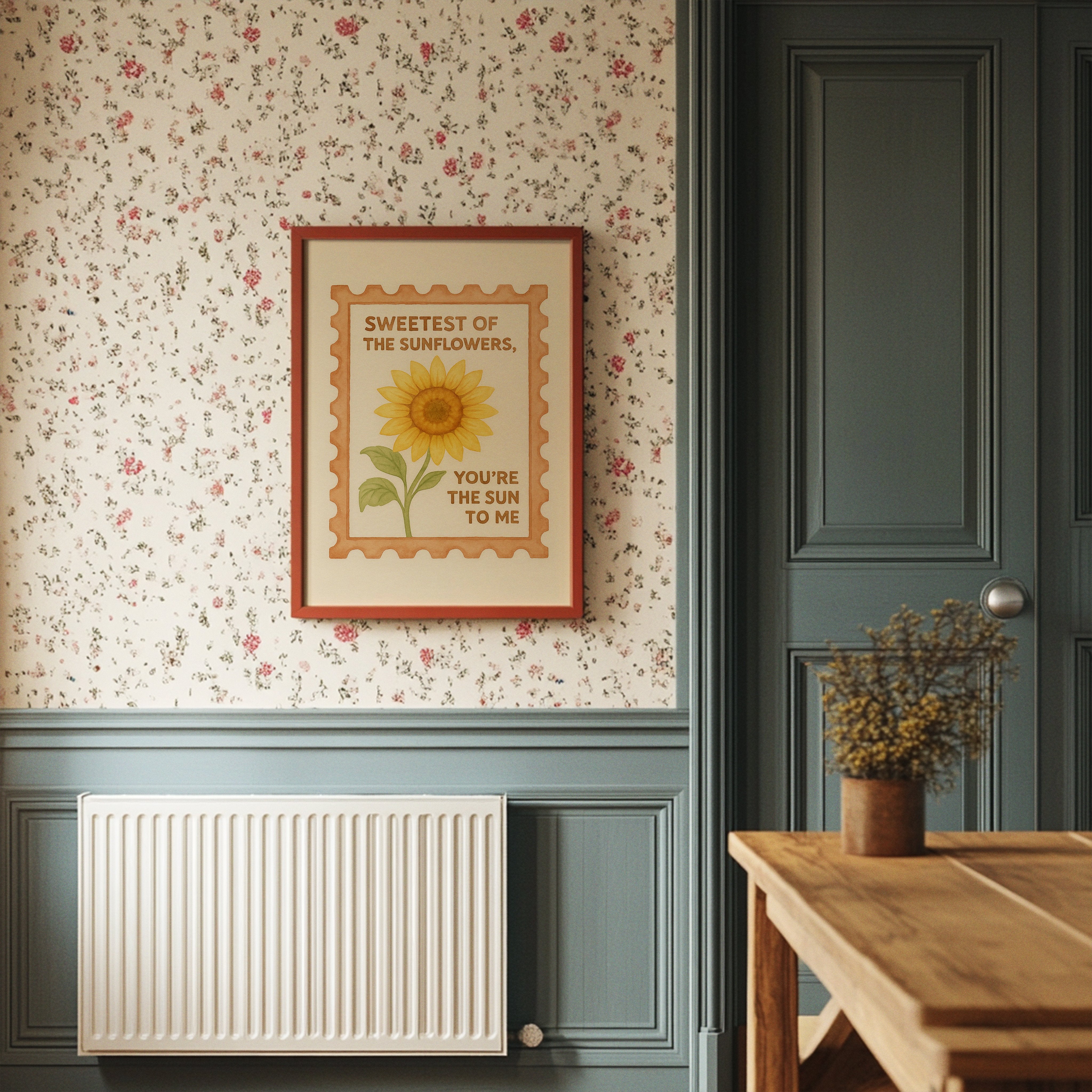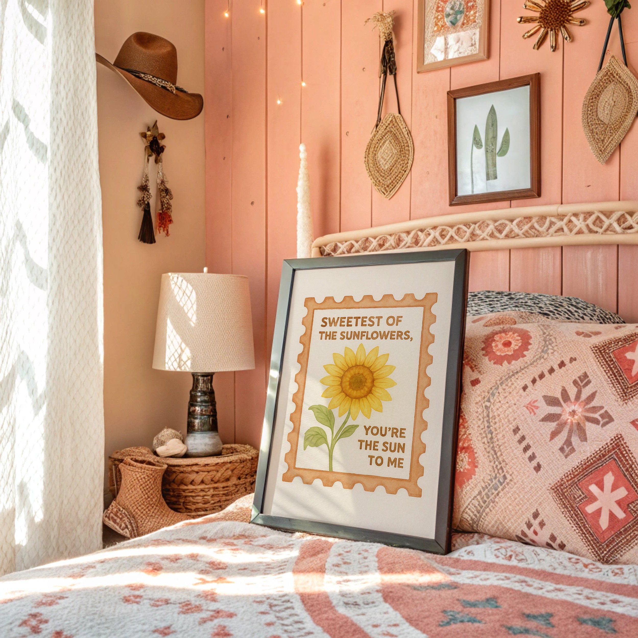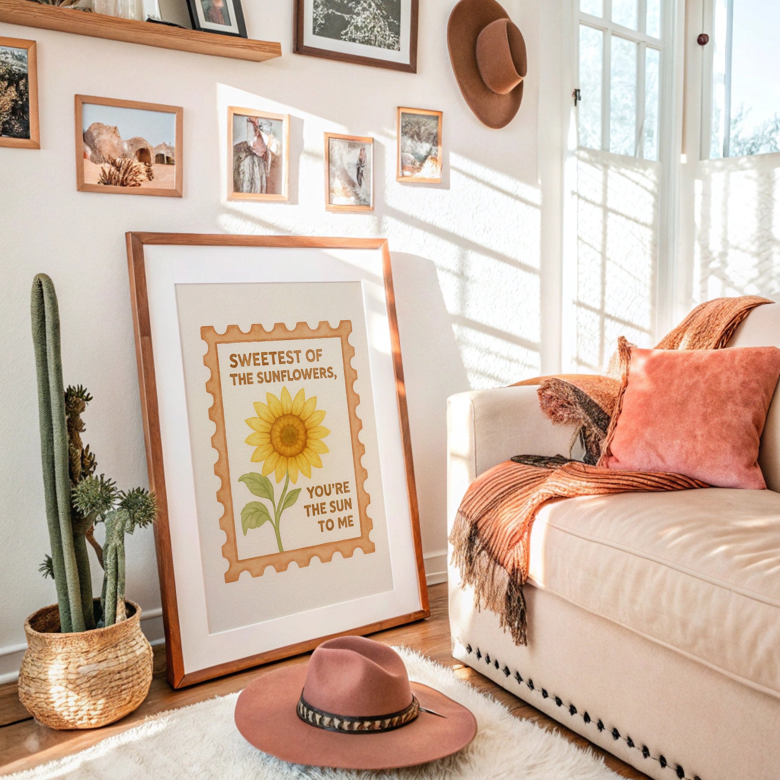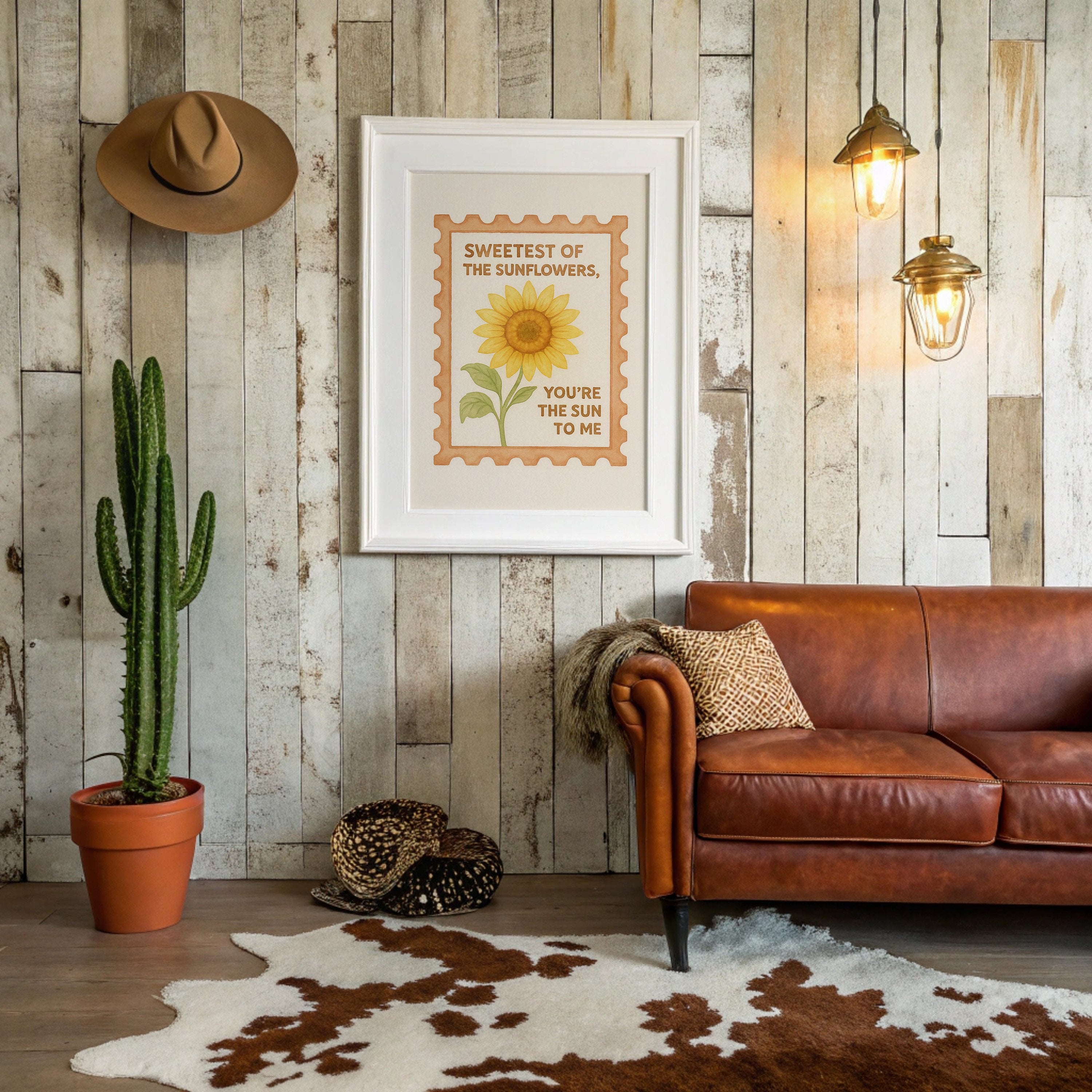 Warmth radiates from this vintage-inspired sunflower print, bringing a slice of endless summer into the rustic space. The charming stamp design pairs cheerful yellows with soothing terracotta tones, creating a love letter to sunny days against weathered wood paneling. This piece adds a perfect touch of nostalgia and affection to a farmhouse living room, country kitchen, or any space needing a reminder of life's simple joys.