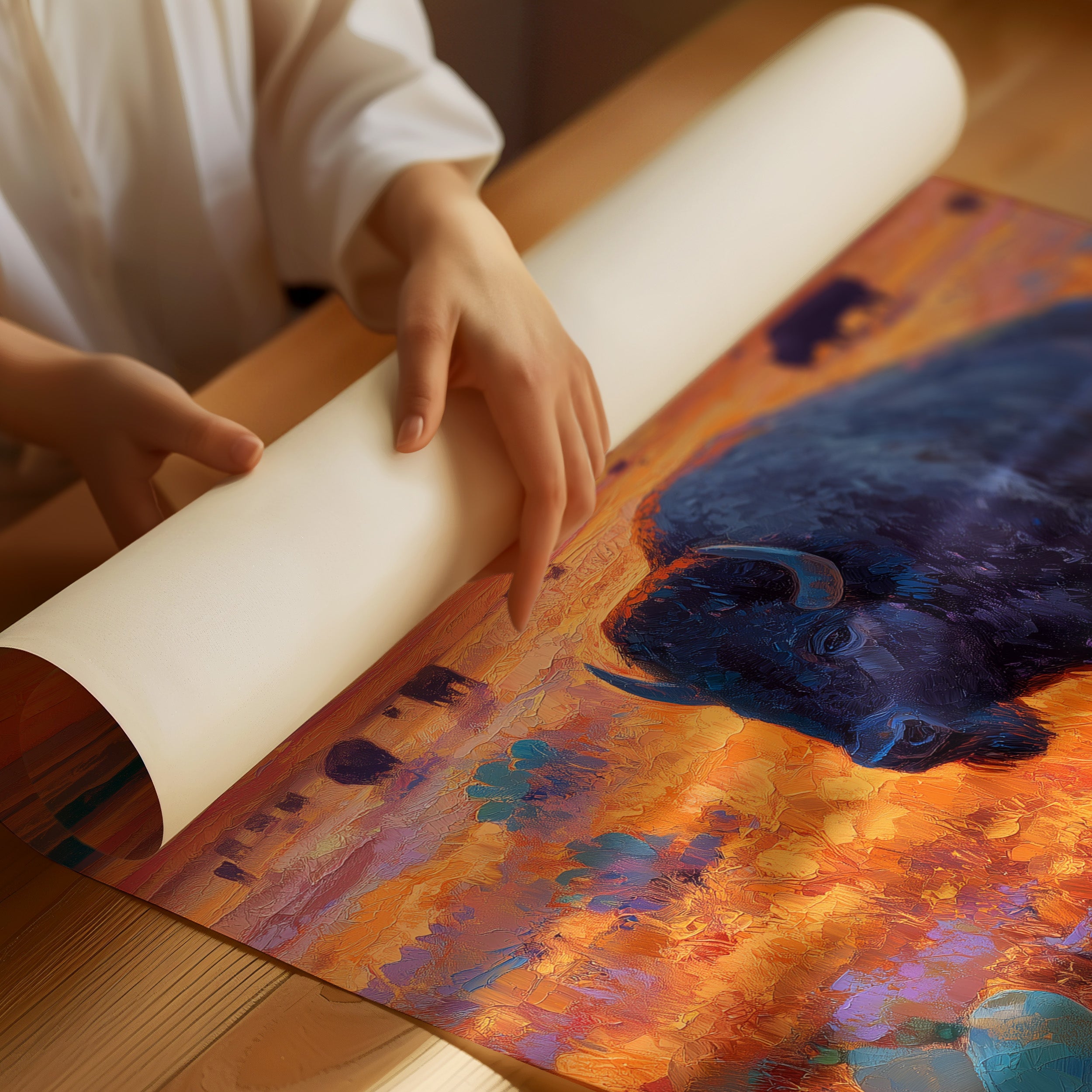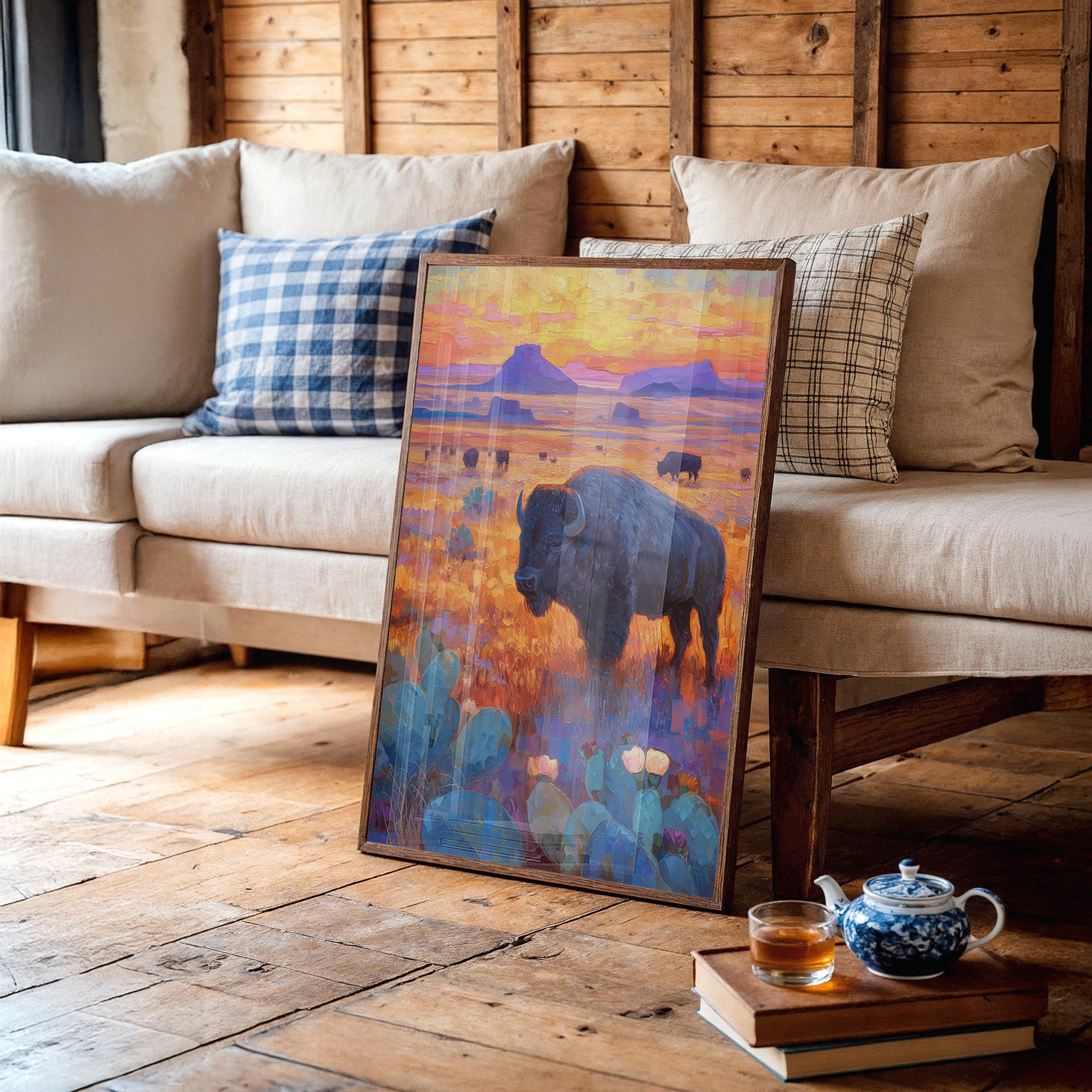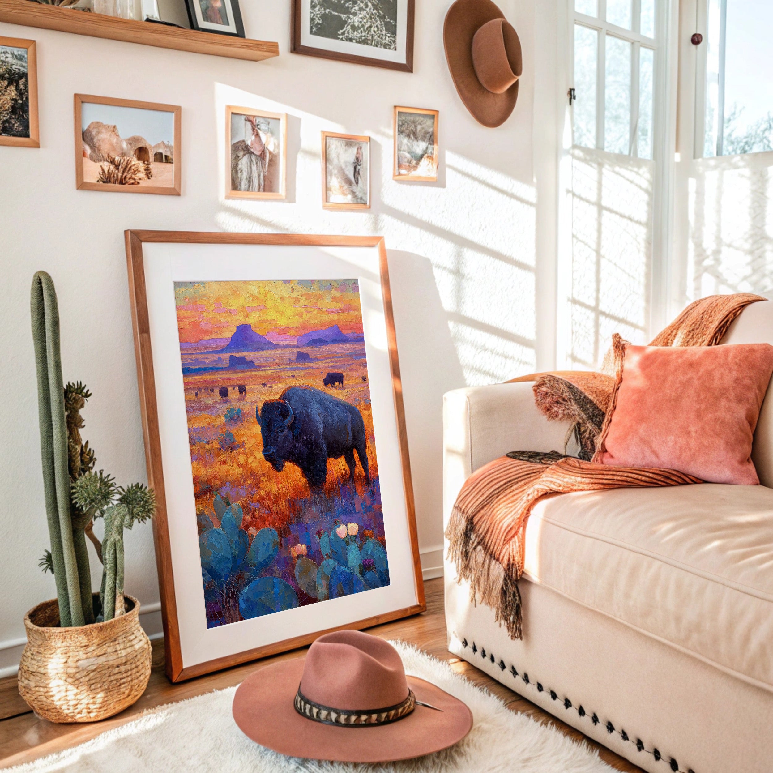 A majestic bison stands sentinel in a field ablaze with sunset colors, where blue prickly pear cacti dot the foreground like scattered gemstones. The landscape unfolds in a masterful dance of purples and oranges, with distant mesas silhouetted against a molten sky. The scene captures the raw beauty of the American West, where wildlife and wilderness merge in a celebration of natural splendor. This striking piece brings southwestern charm to any room, creating a focal point that bridges rustic and contemporary design sensibilities.
