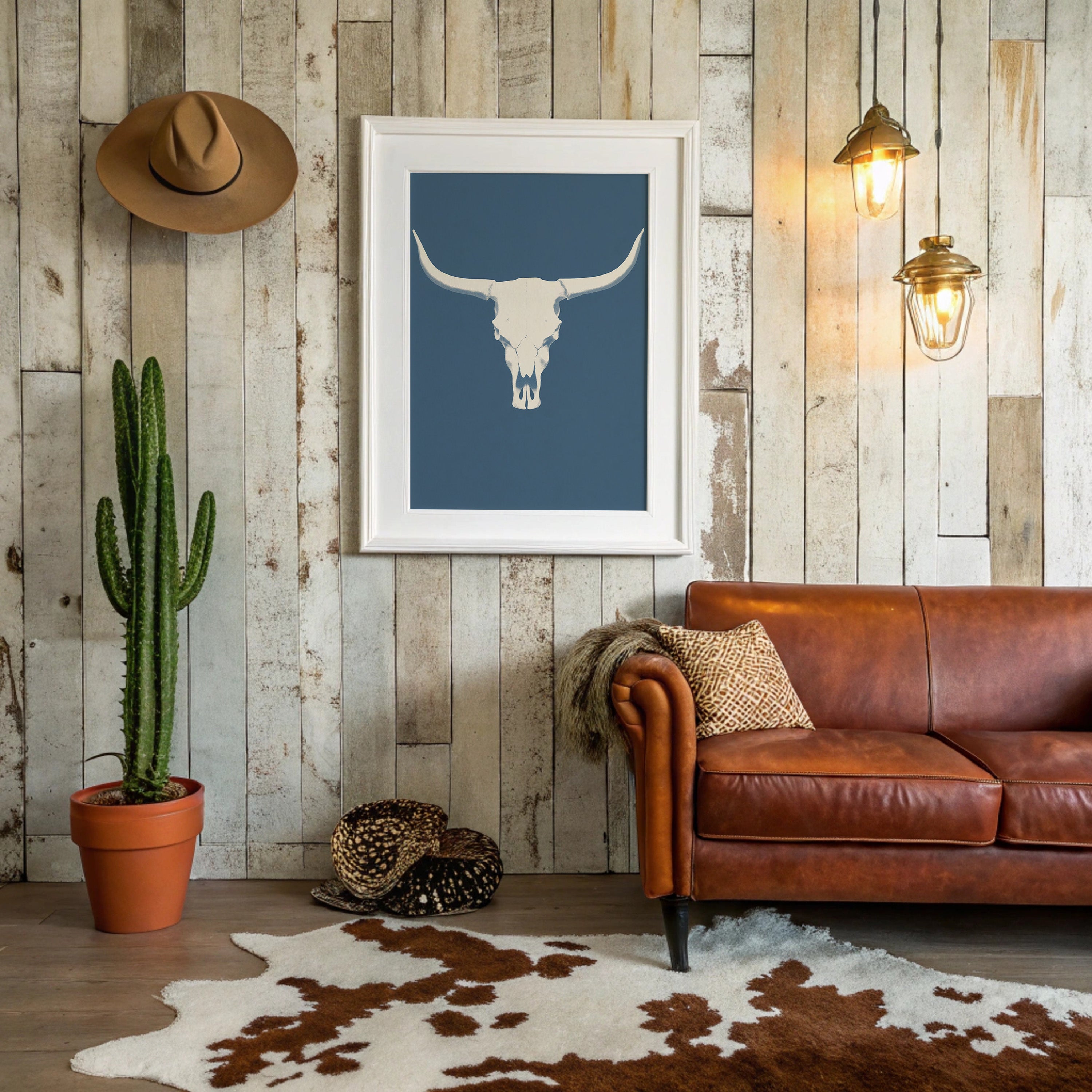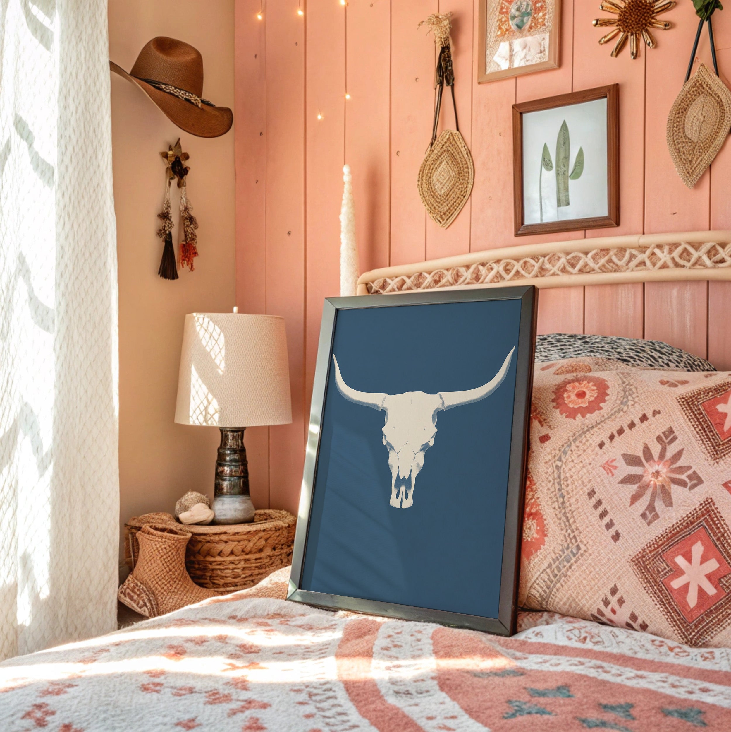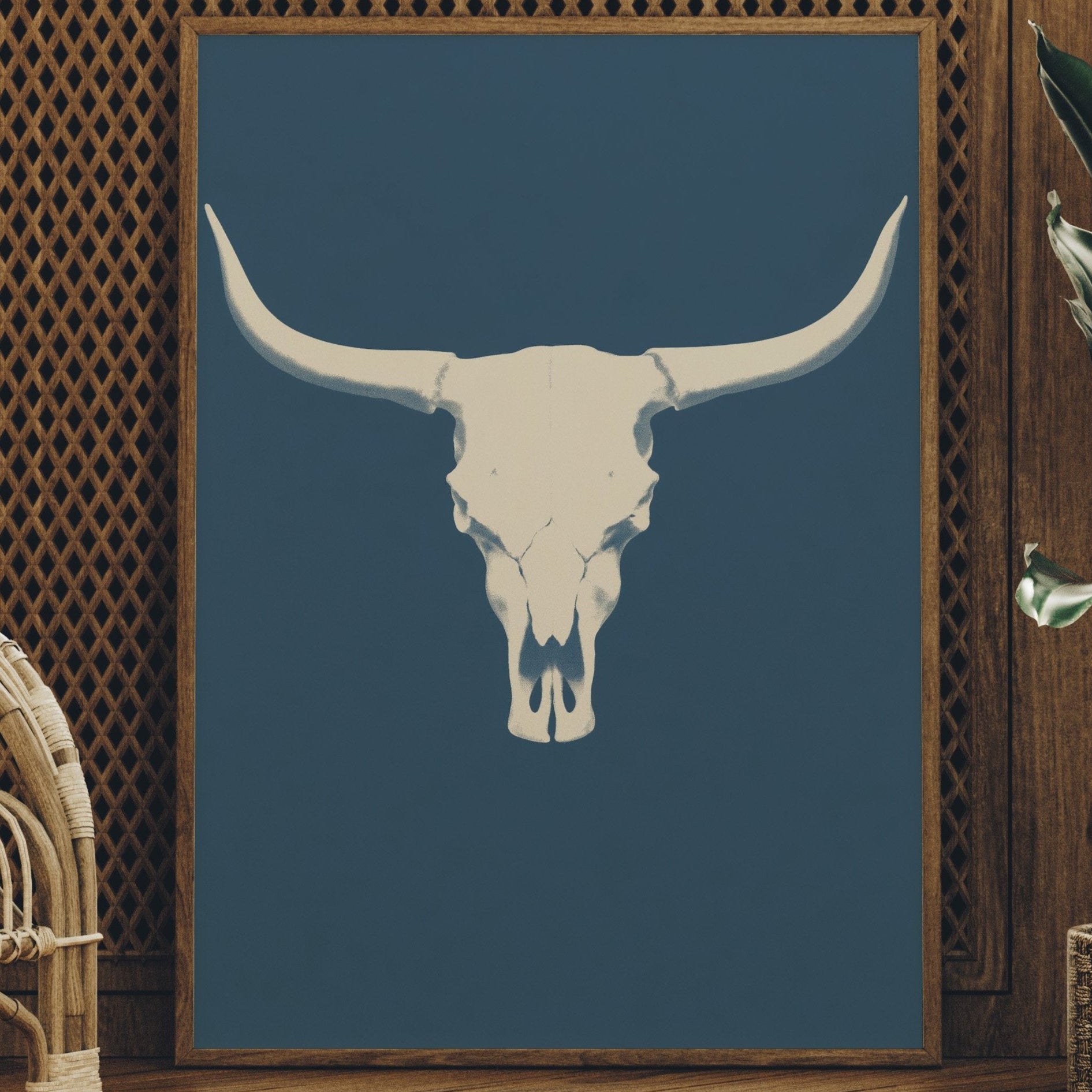 Against a deep azure backdrop, a stark white skull tells stories of wild frontiers and untamed spirits. This striking piece from our Contemporary collection marries minimalist design with raw natural symbolism. The clean lines and dramatic contrast create a powerful statement, while the skull's graceful horns sweep outward like wings taking flight. Perfect for adding a bold southwestern accent to modern spaces, this piece commands attention while maintaining sophisticated restraint. It brings an artistic edge to a home office or adds character to an industrial-style living room.