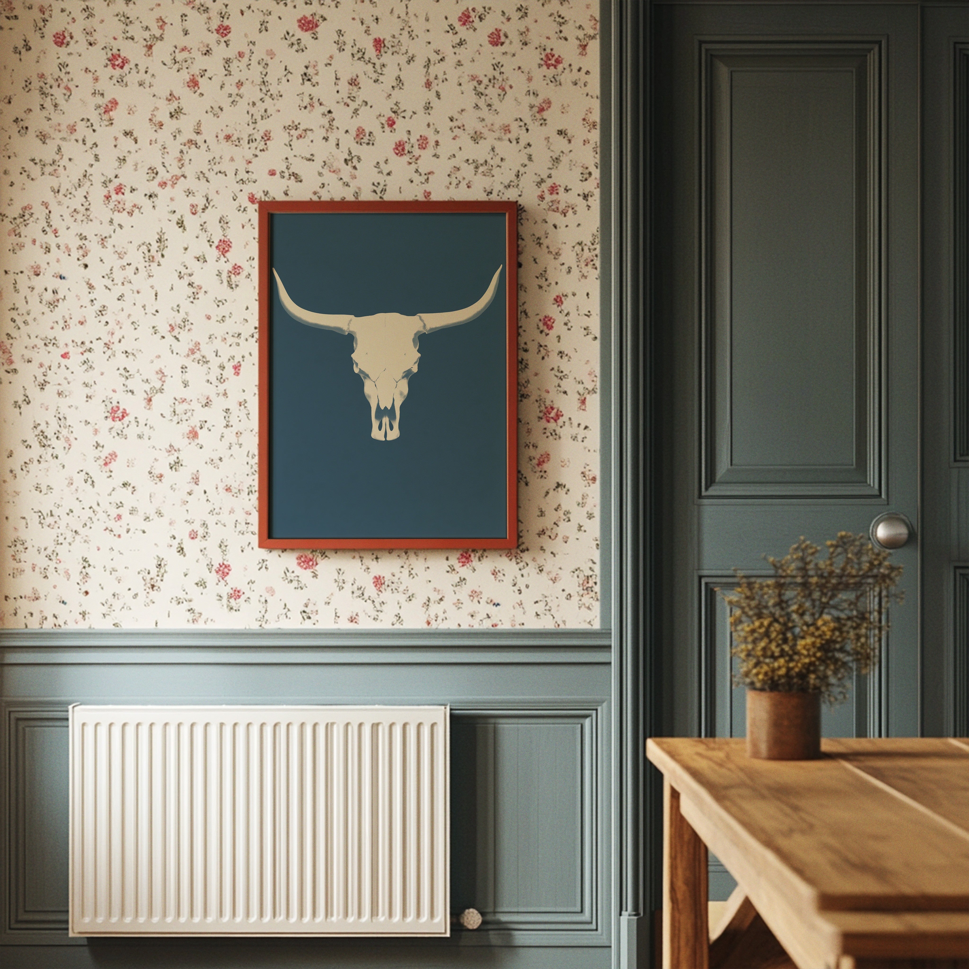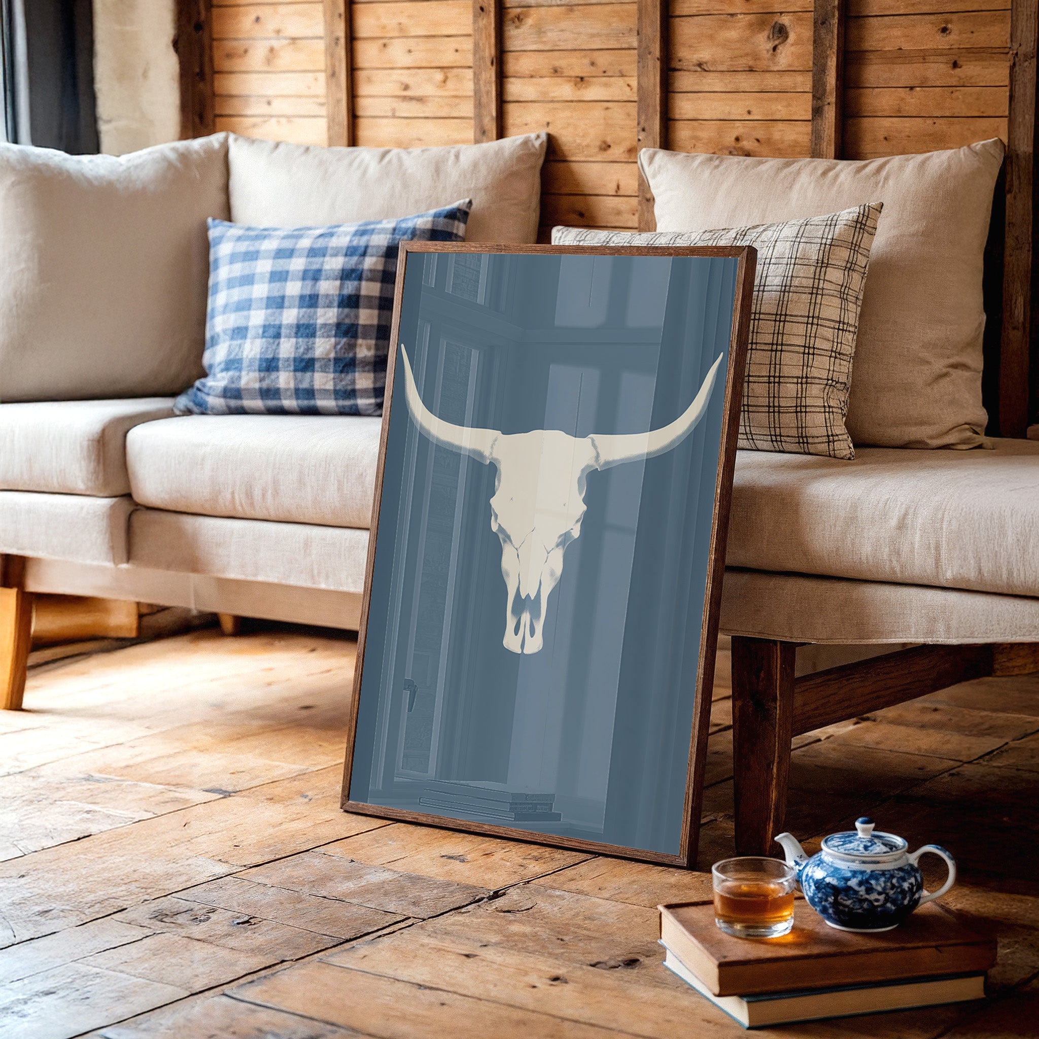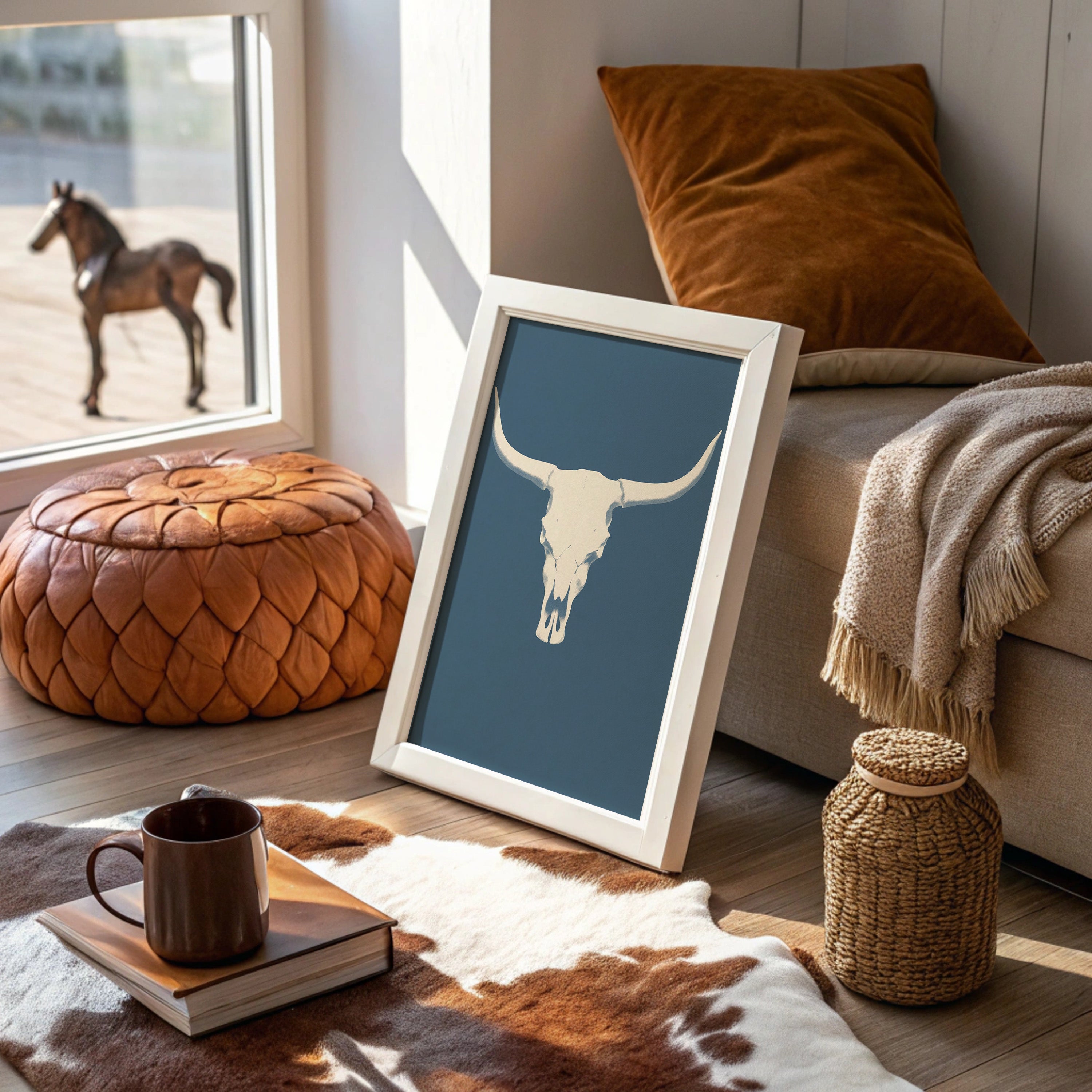 Against a deep azure backdrop, a stark white skull tells stories of wild frontiers and untamed spirits. This striking piece from our Contemporary collection marries minimalist design with raw natural symbolism. The clean lines and dramatic contrast create a powerful statement, while the skull's graceful horns sweep outward like wings taking flight. Perfect for adding a bold southwestern accent to modern spaces, this piece commands attention while maintaining sophisticated restraint. It brings an artistic edge to a home office or adds character to an industrial-style living room.