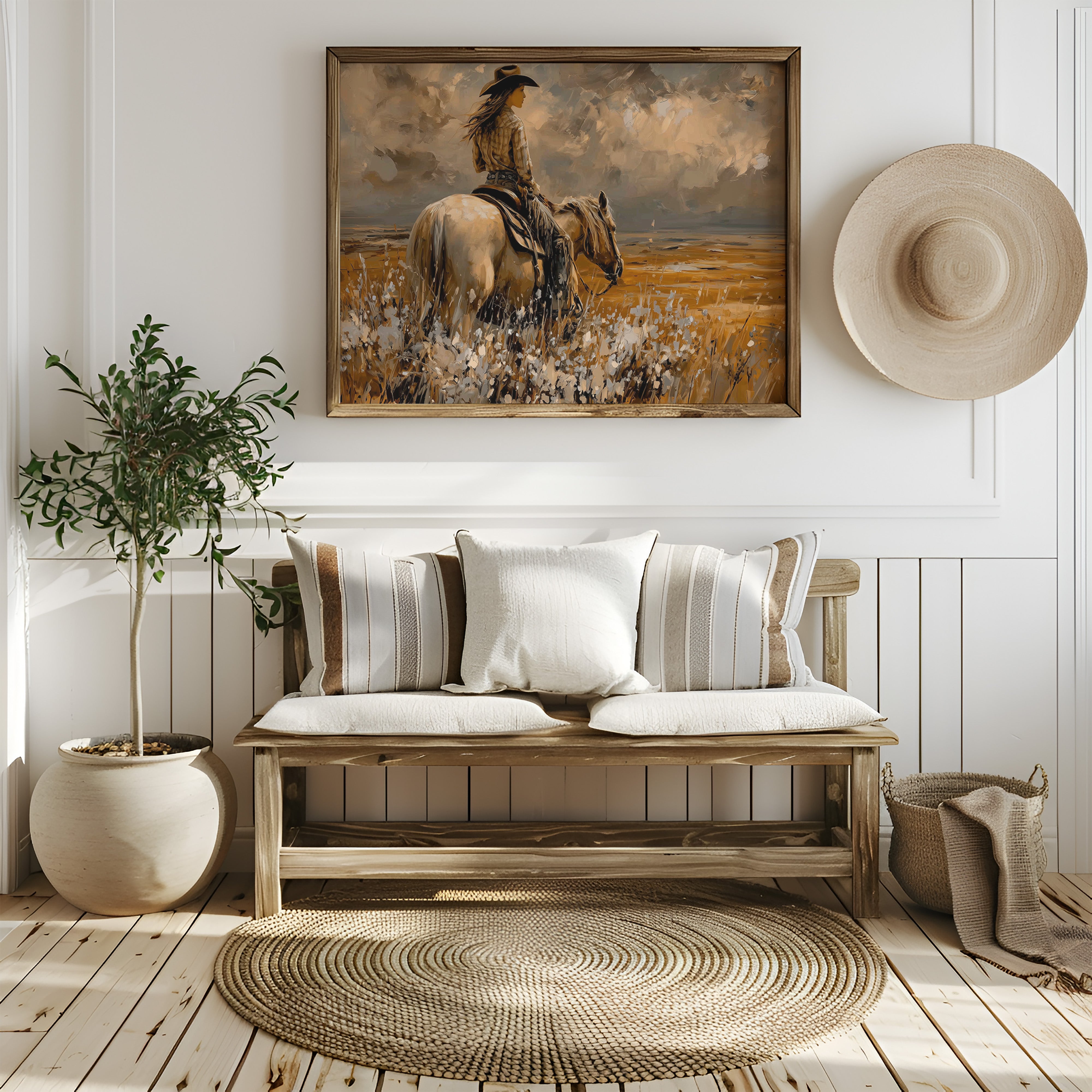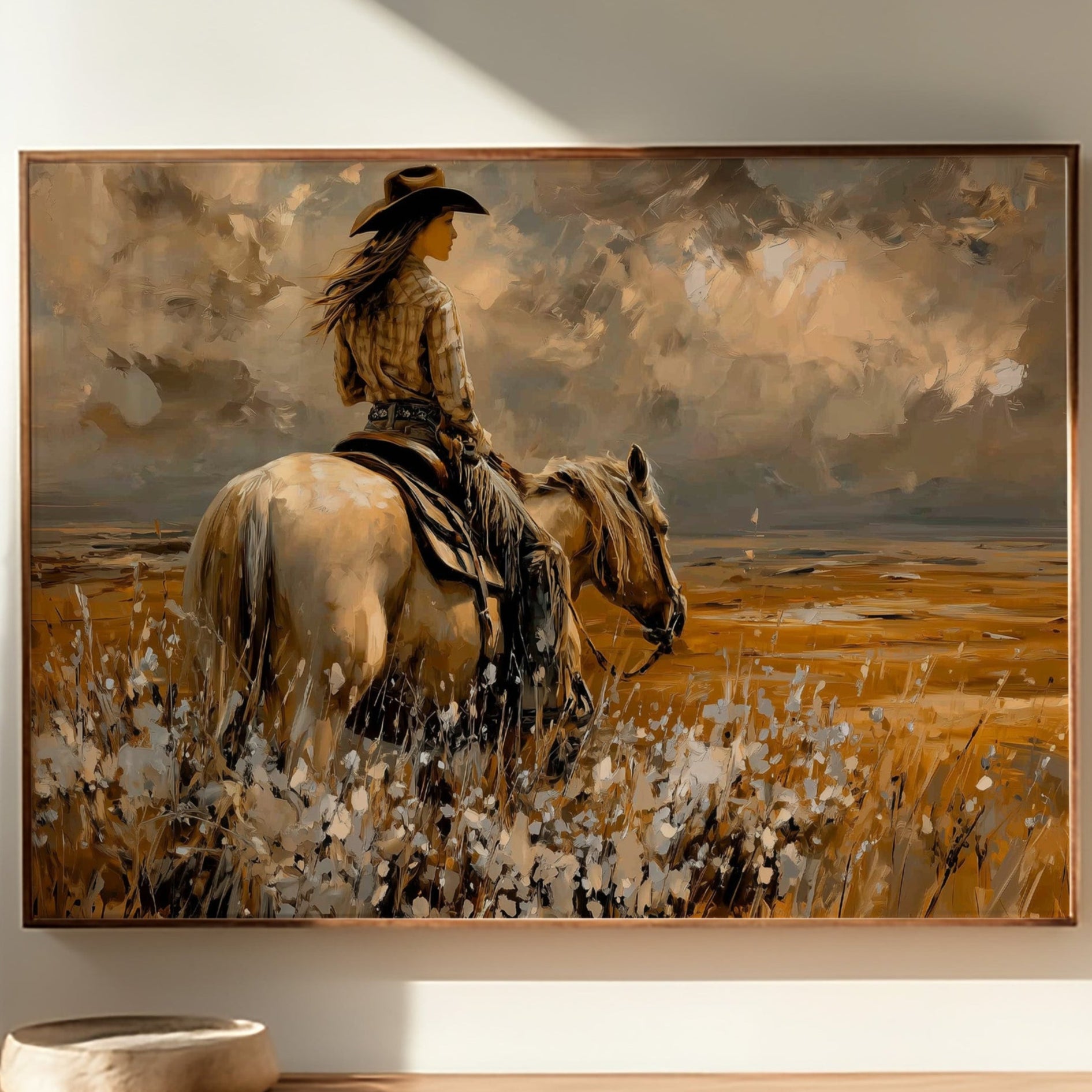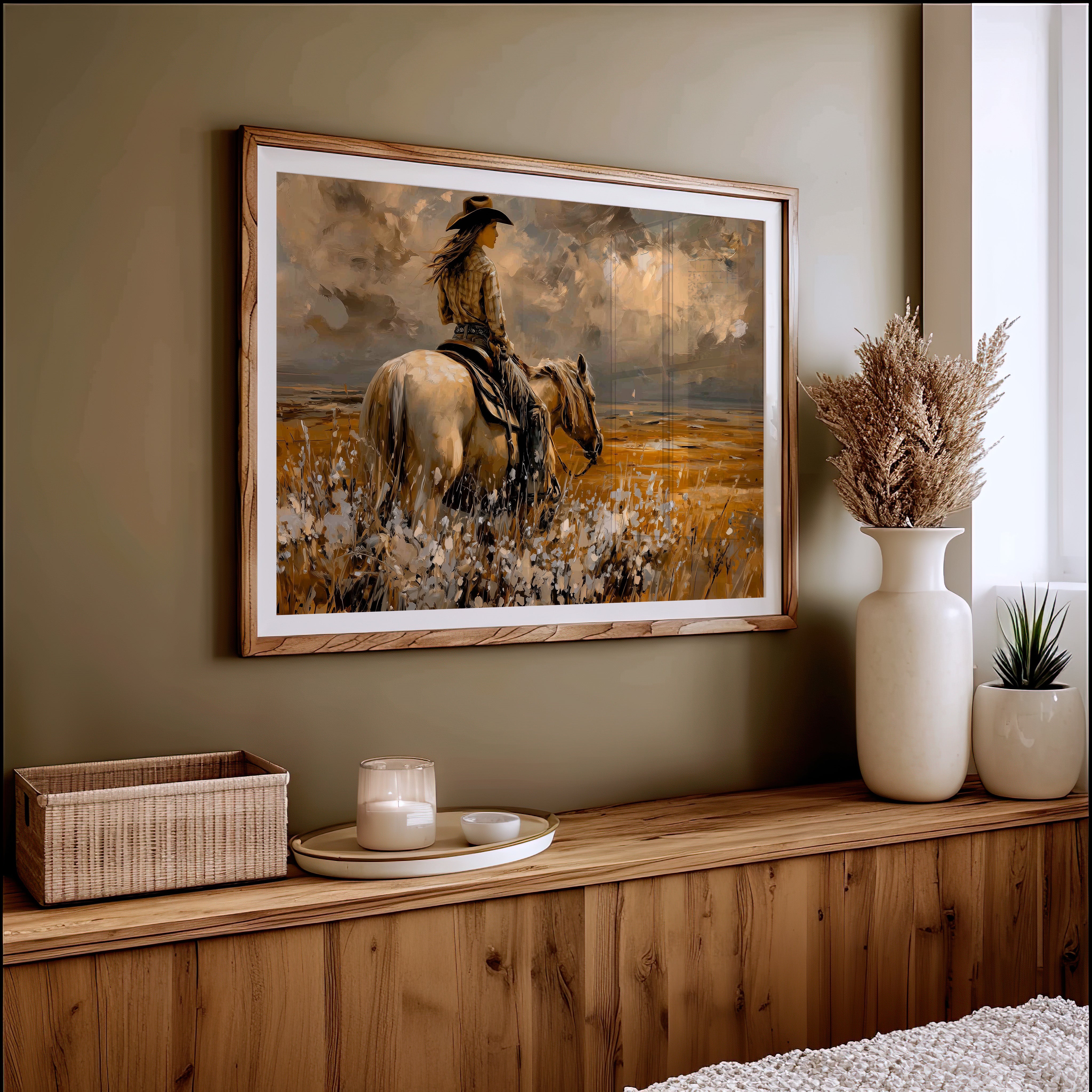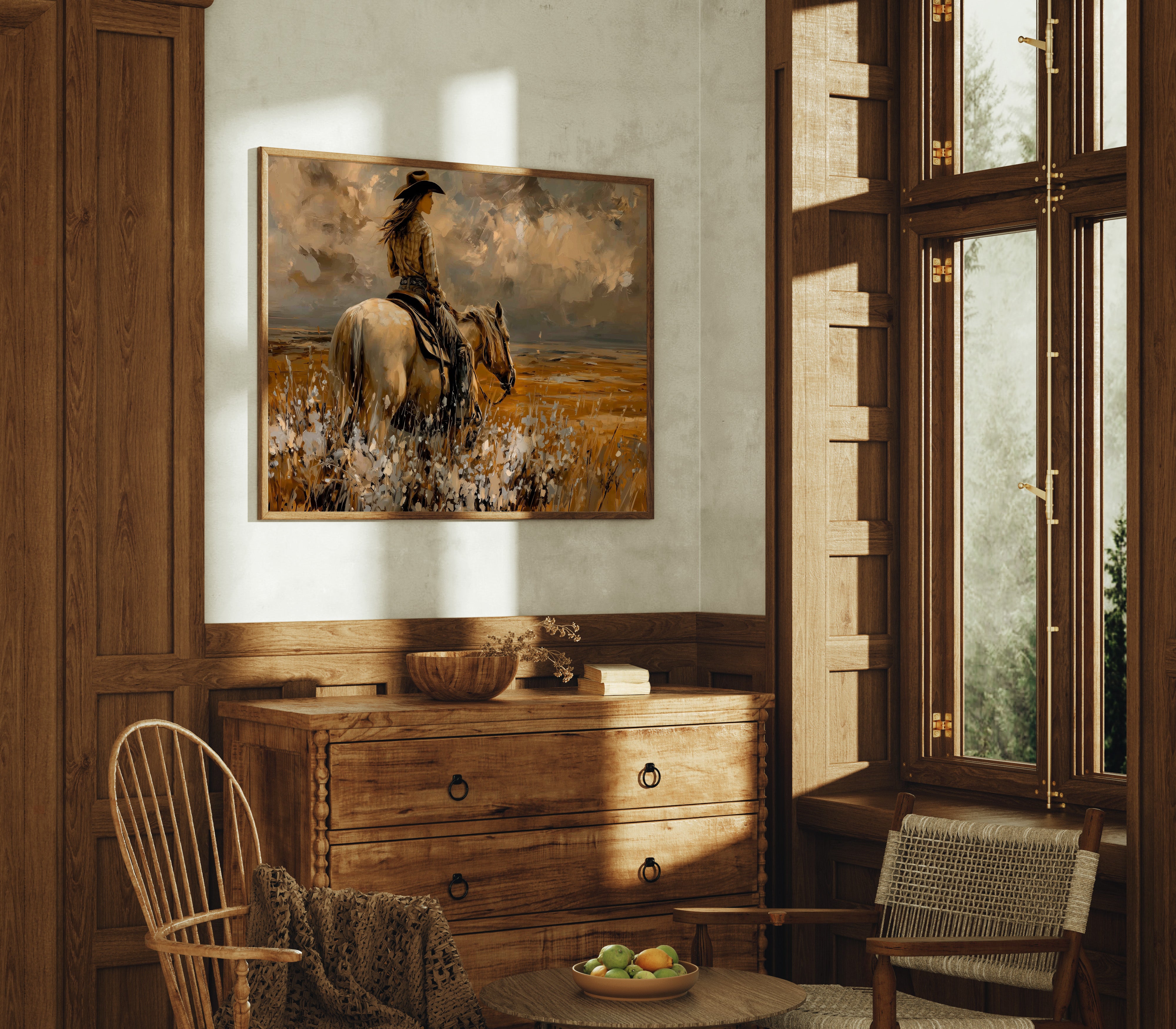 Golden light filters through gathering clouds as wildflowers bow and sway across endless plains. This contemporary western piece captures the raw beauty of American ranch life through bold brushstrokes and rich earth tones. Against a dramatic sky, a rider pauses atop a pale horse, their silhouette commanding yet peaceful among the dancing prairie grasses. The composition's warm amber palette and gestural painting style create a timeless scene where strength meets serenity. This striking piece brings untamed elegance to a living room or study, creating a focal point that speaks to both heritage and artistic sophistication. The interplay of light and shadow invites quiet contemplation of wide-open spaces and freedom.