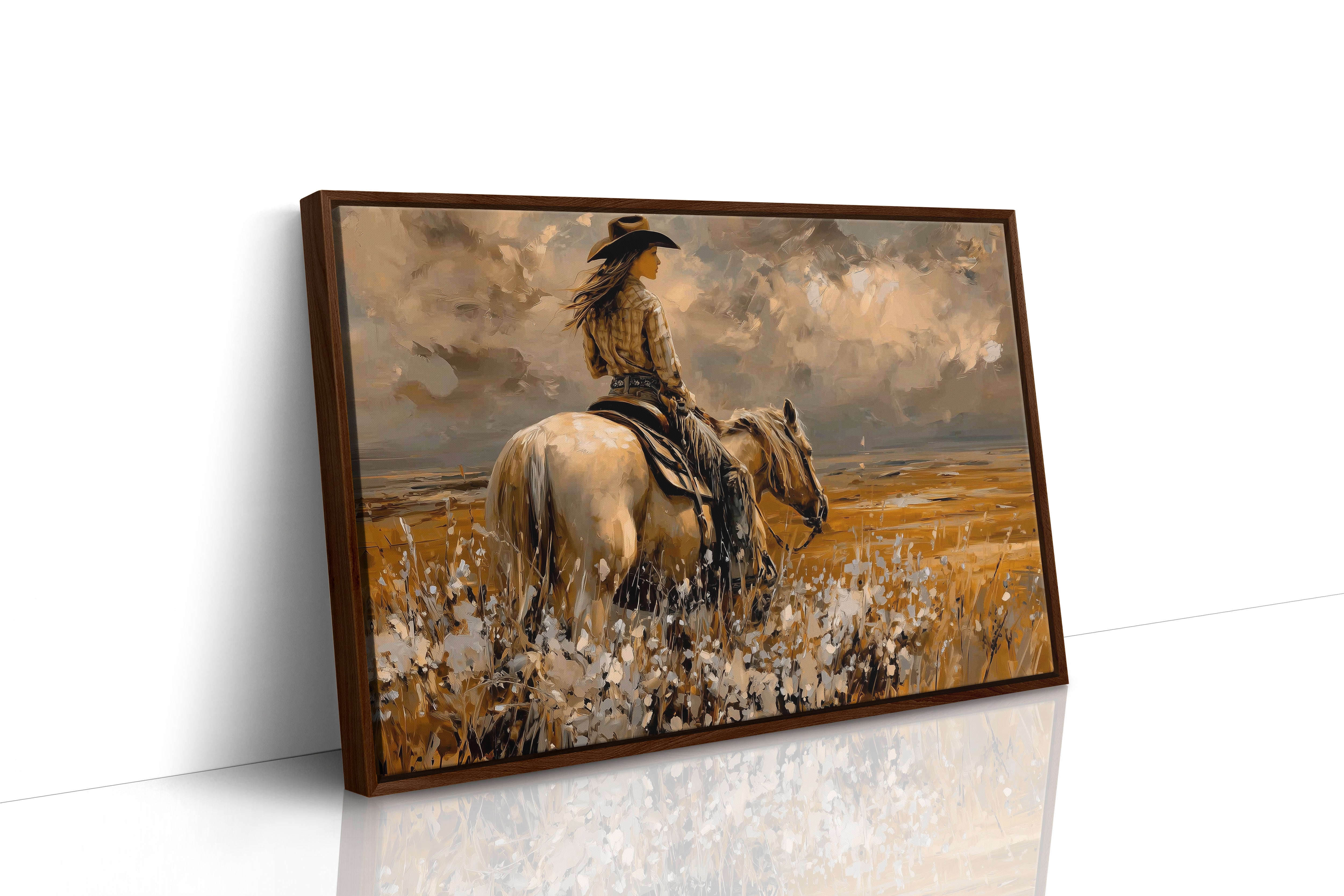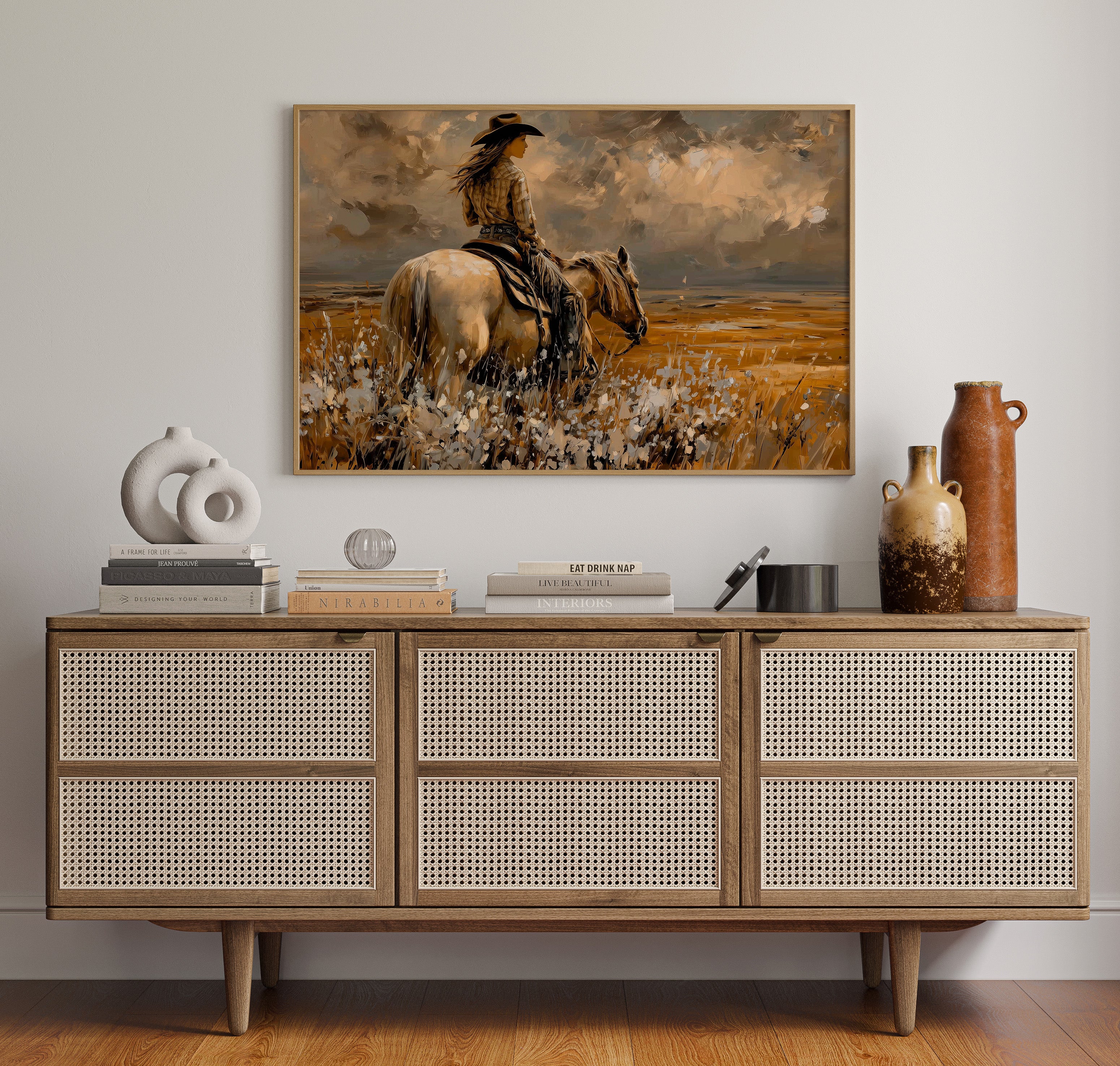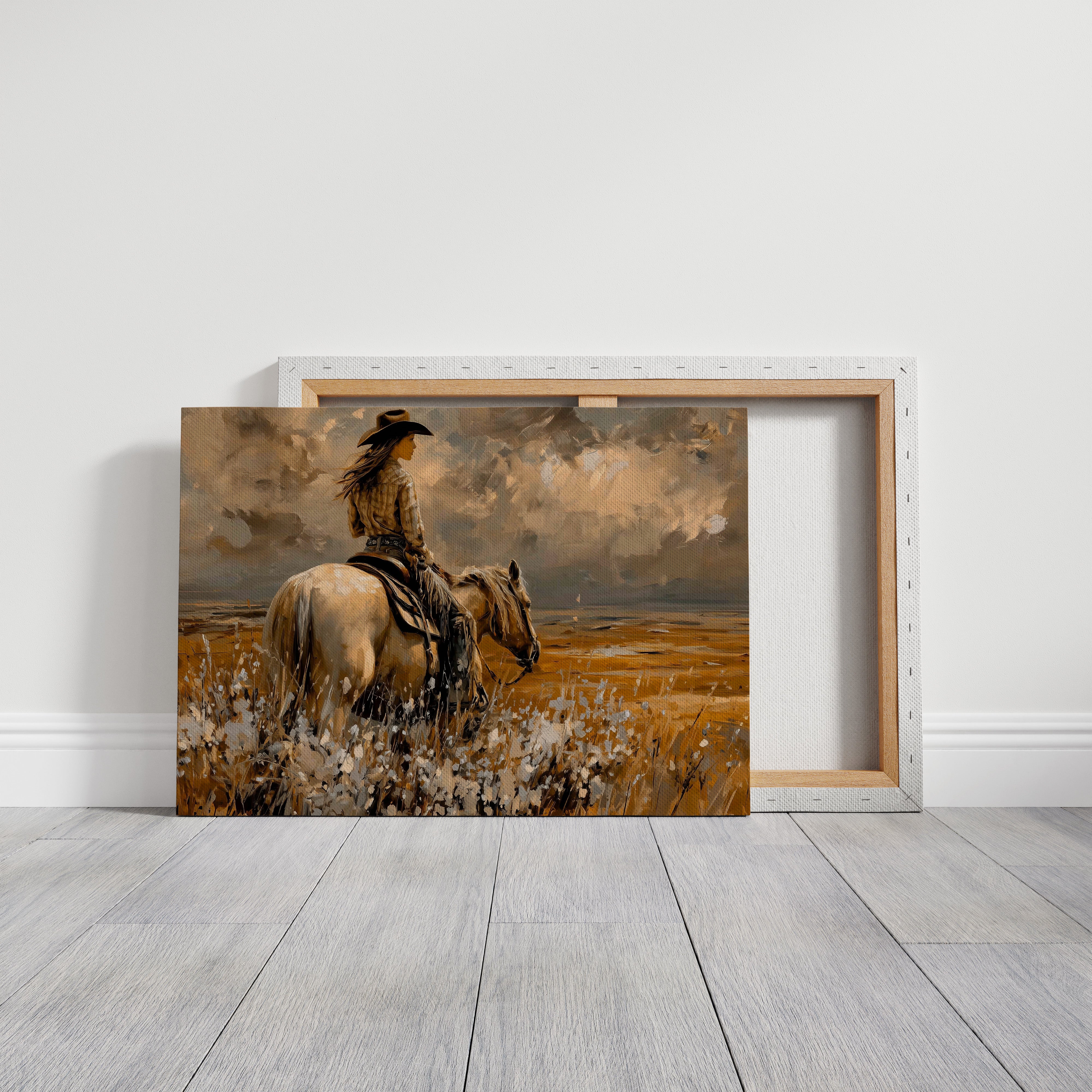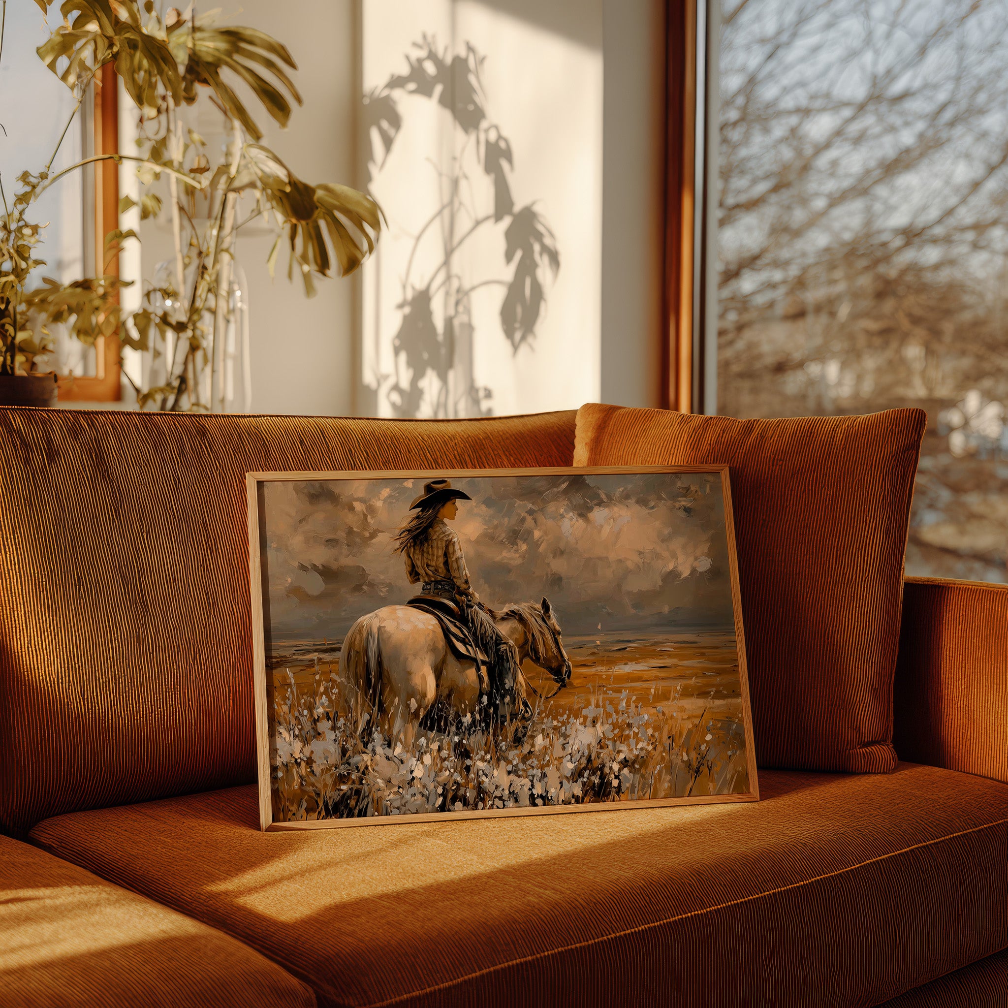 Golden light filters through gathering clouds as wildflowers bow and sway across endless plains. This contemporary western piece captures the raw beauty of American ranch life through bold brushstrokes and rich earth tones. Against a dramatic sky, a rider pauses atop a pale horse, their silhouette commanding yet peaceful among the dancing prairie grasses. The composition's warm amber palette and gestural painting style create a timeless scene where strength meets serenity. This striking piece brings untamed elegance to a living room or study, creating a focal point that speaks to both heritage and artistic sophistication. The interplay of light and shadow invites quiet contemplation of wide-open spaces and freedom.