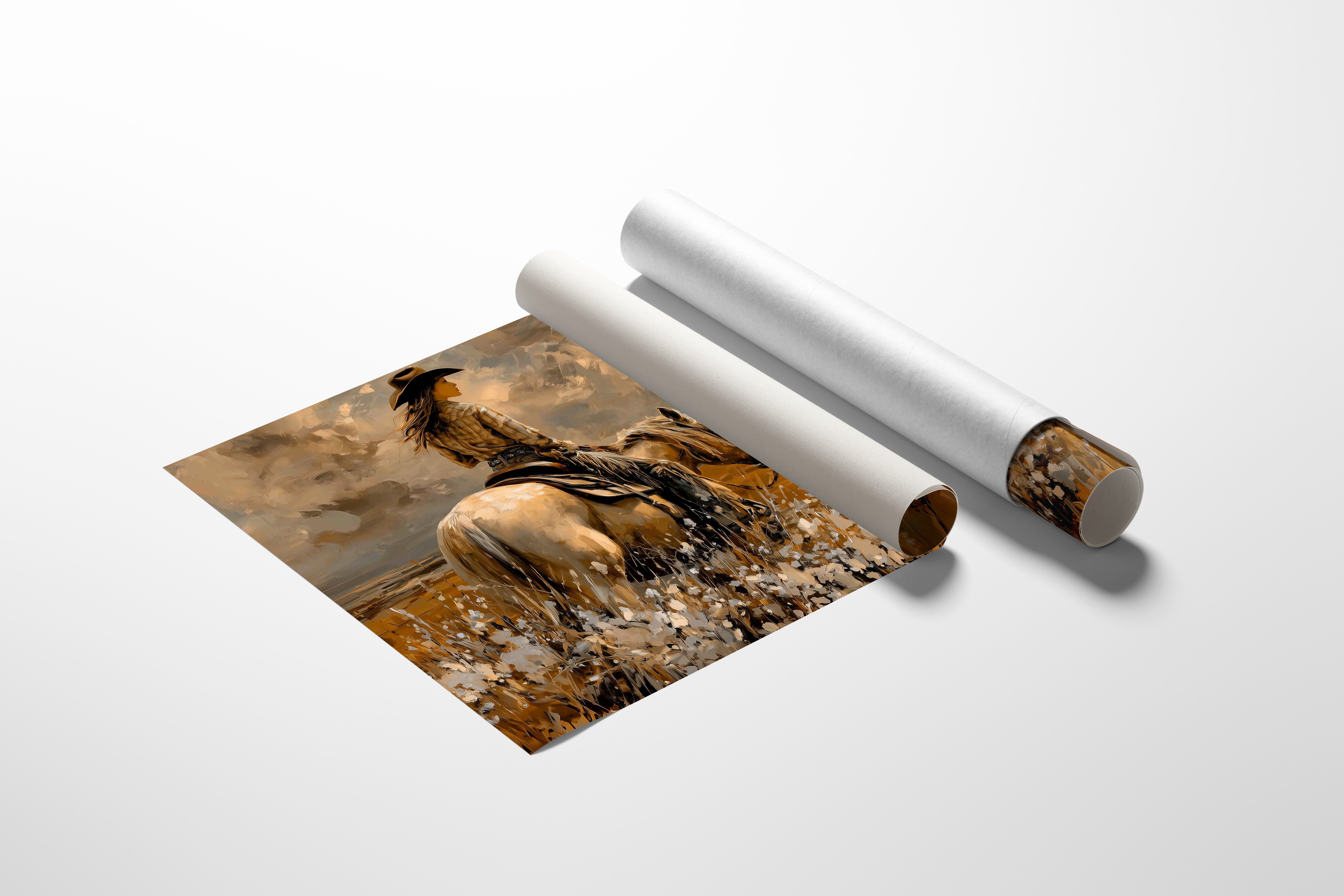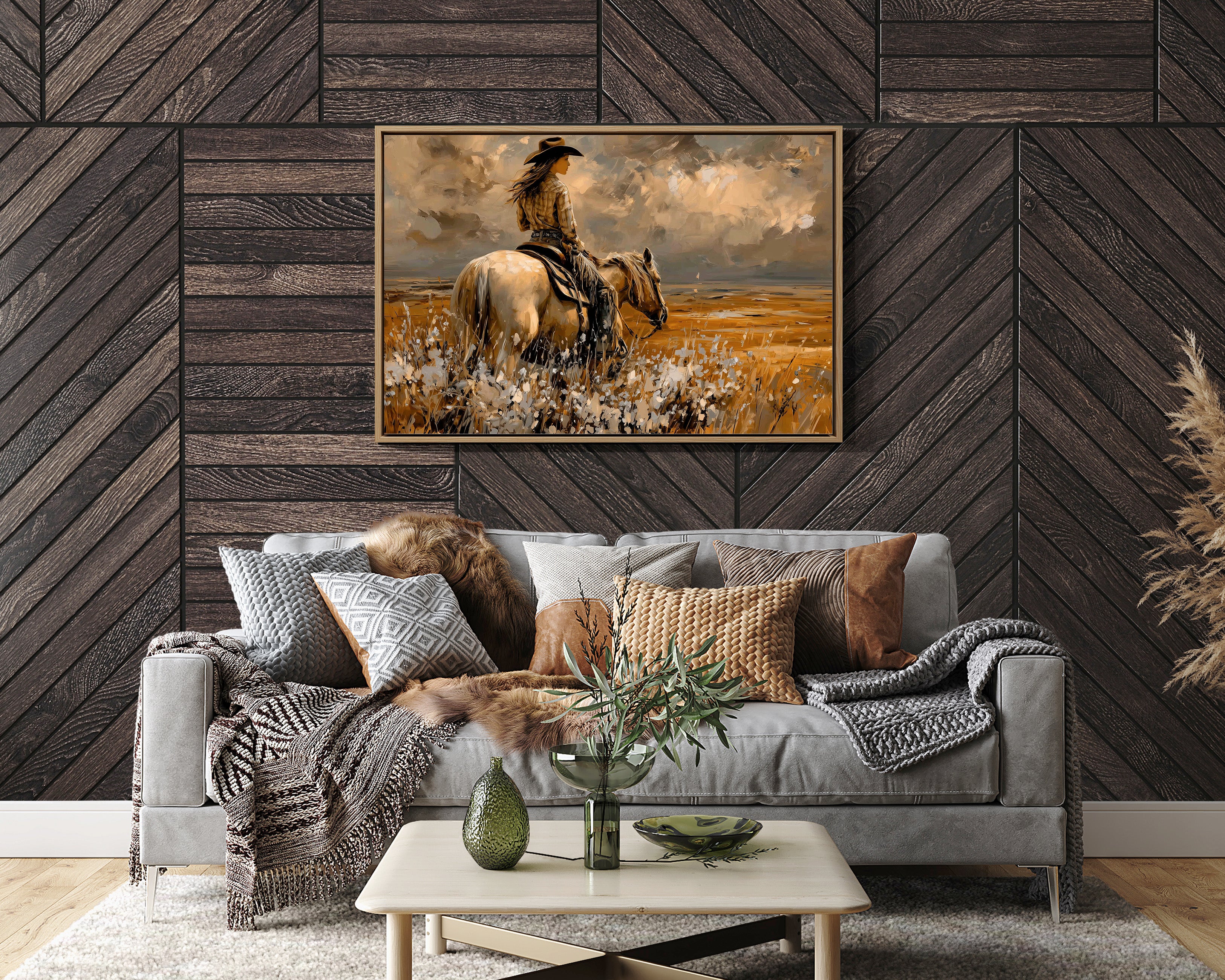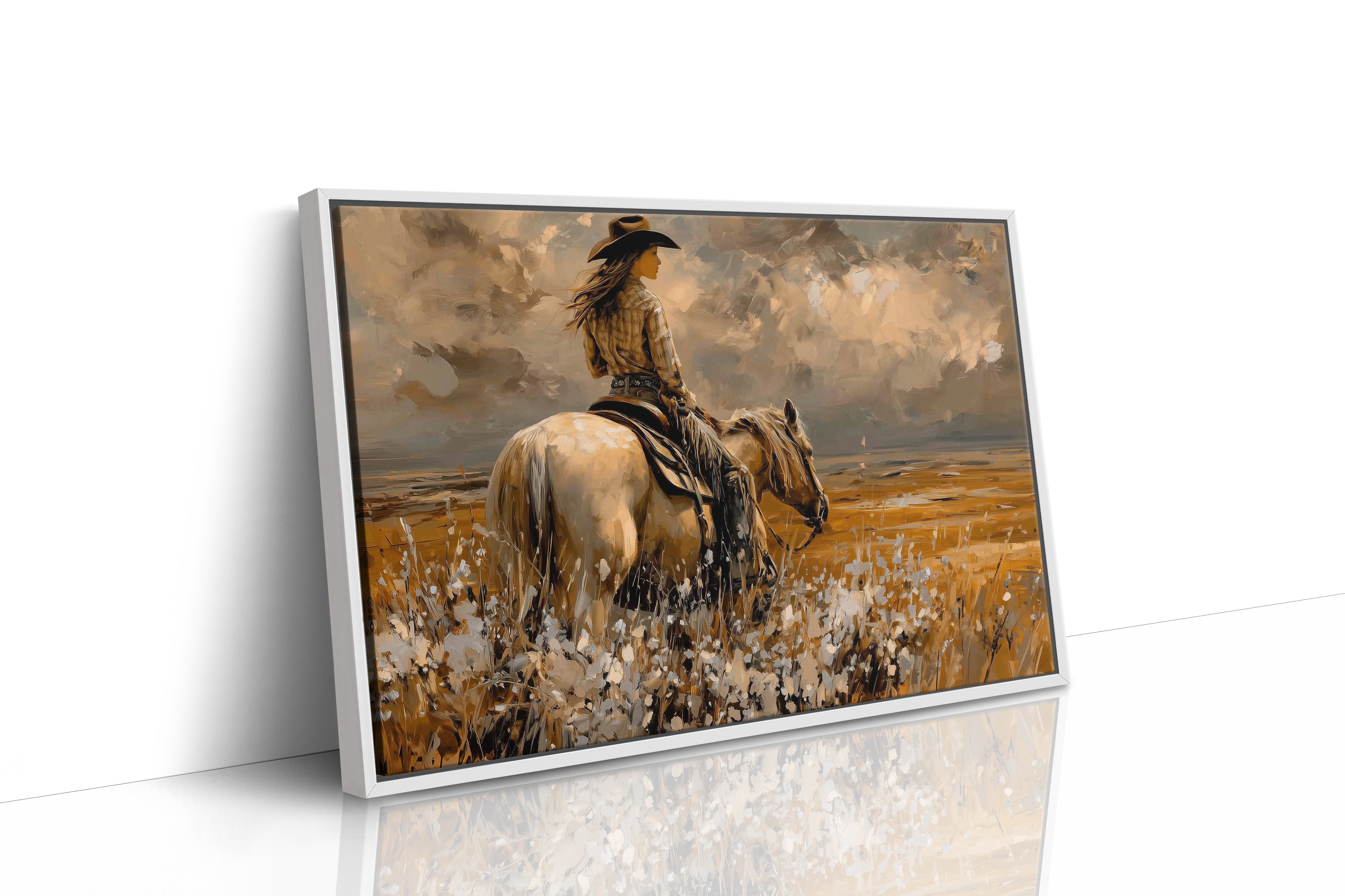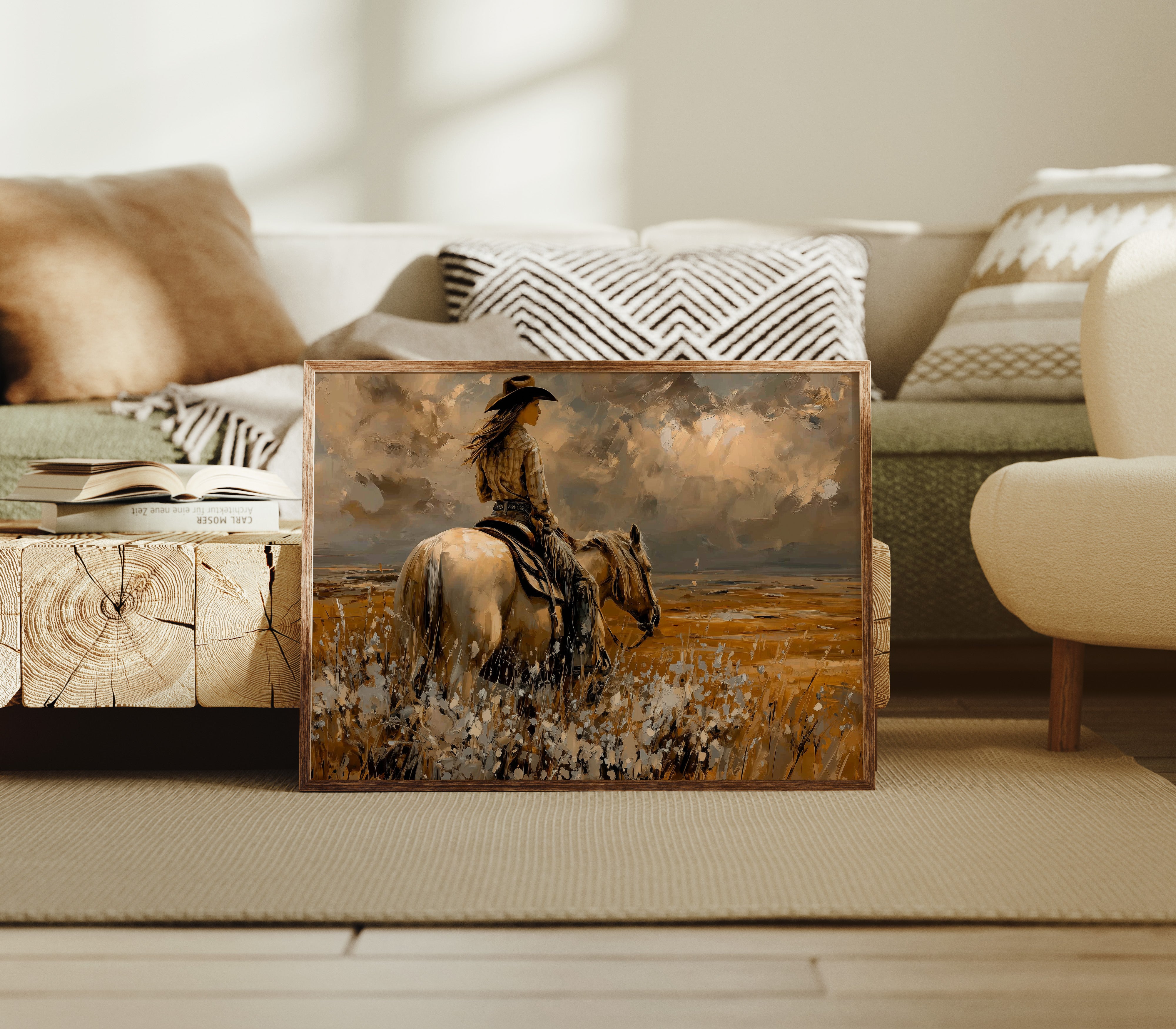 Golden light filters through gathering clouds as wildflowers bow and sway across endless plains. This contemporary western piece captures the raw beauty of American ranch life through bold brushstrokes and rich earth tones. Against a dramatic sky, a rider pauses atop a pale horse, their silhouette commanding yet peaceful among the dancing prairie grasses. The composition's warm amber palette and gestural painting style create a timeless scene where strength meets serenity. This striking piece brings untamed elegance to a living room or study, creating a focal point that speaks to both heritage and artistic sophistication. The interplay of light and shadow invites quiet contemplation of wide-open spaces and freedom.