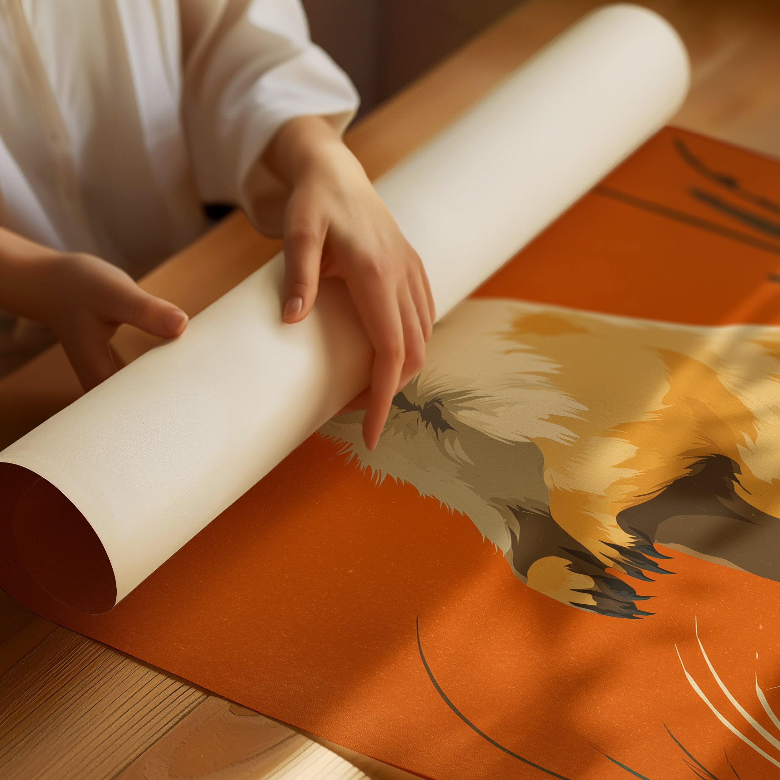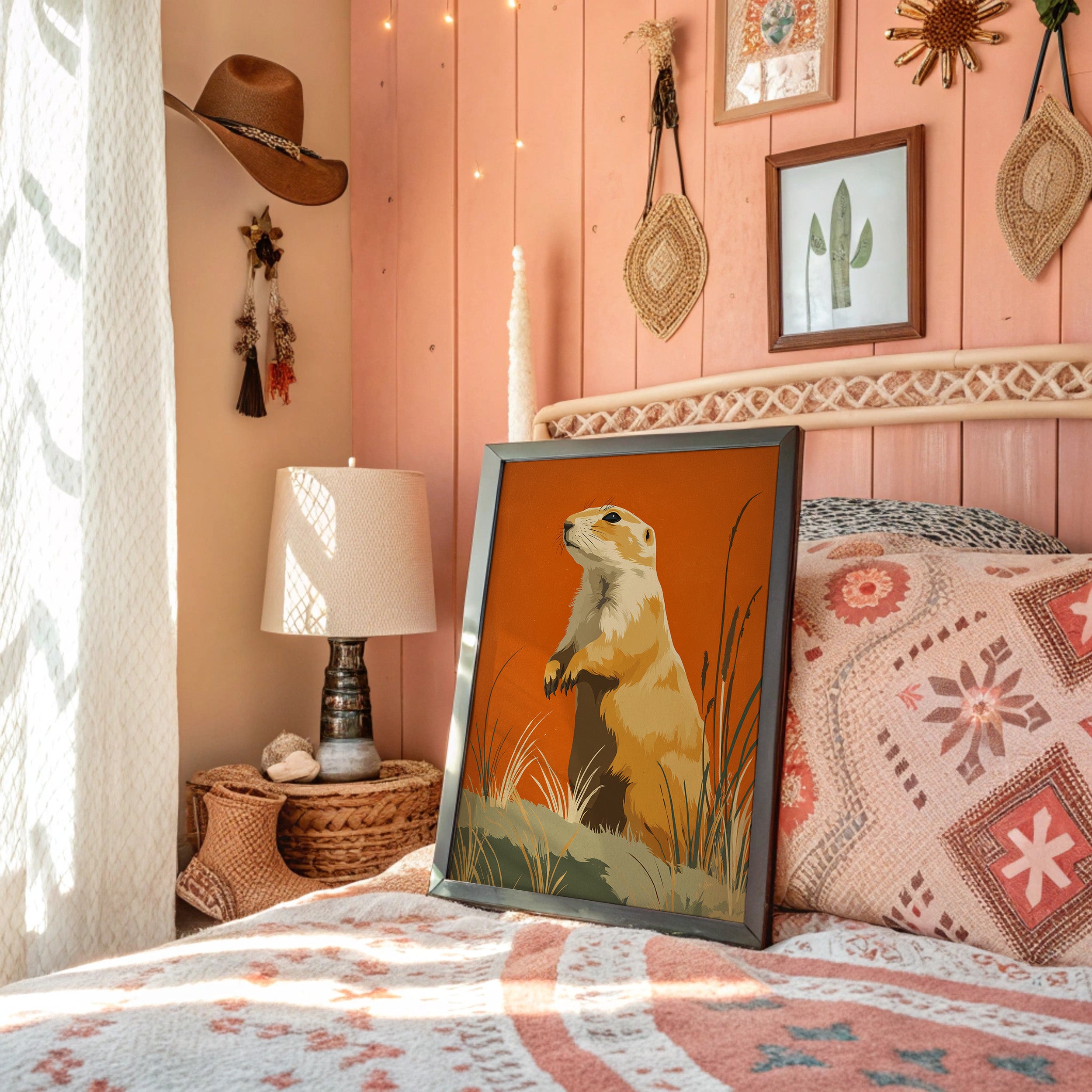 A curious prairie sentinel stands alert against a warm terracotta sky, surrounded by swaying grasses. The illustration captures both strength and gentleness, with golden fur catching light against earthy tones and delicate botanical silhouettes. This contemporary wildlife portrait brings the spirit of the American prairie into modern spaces. Perfect for adding a touch of nature-inspired sophistication to a study, living room, or any space seeking to blend rustic charm with refined style.