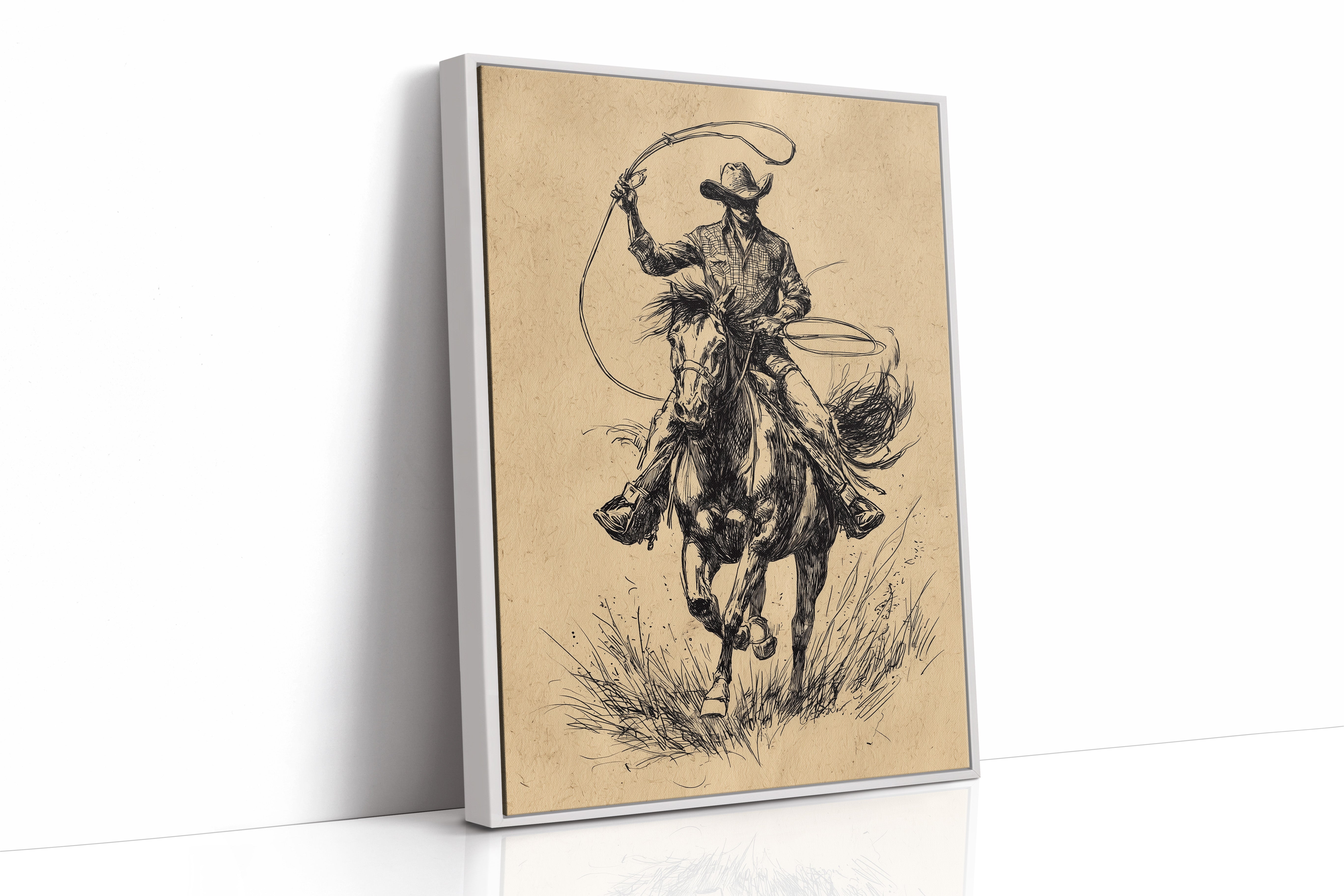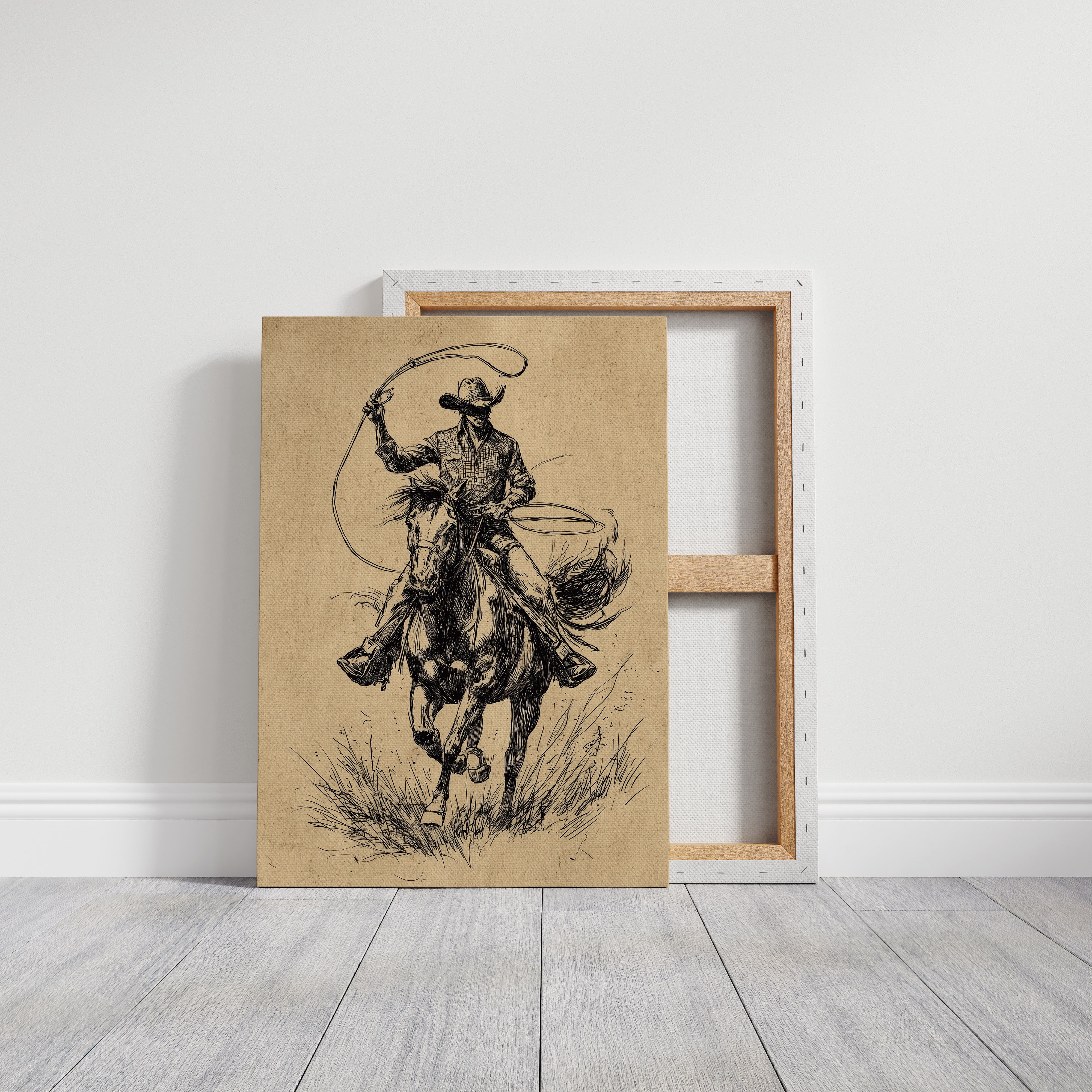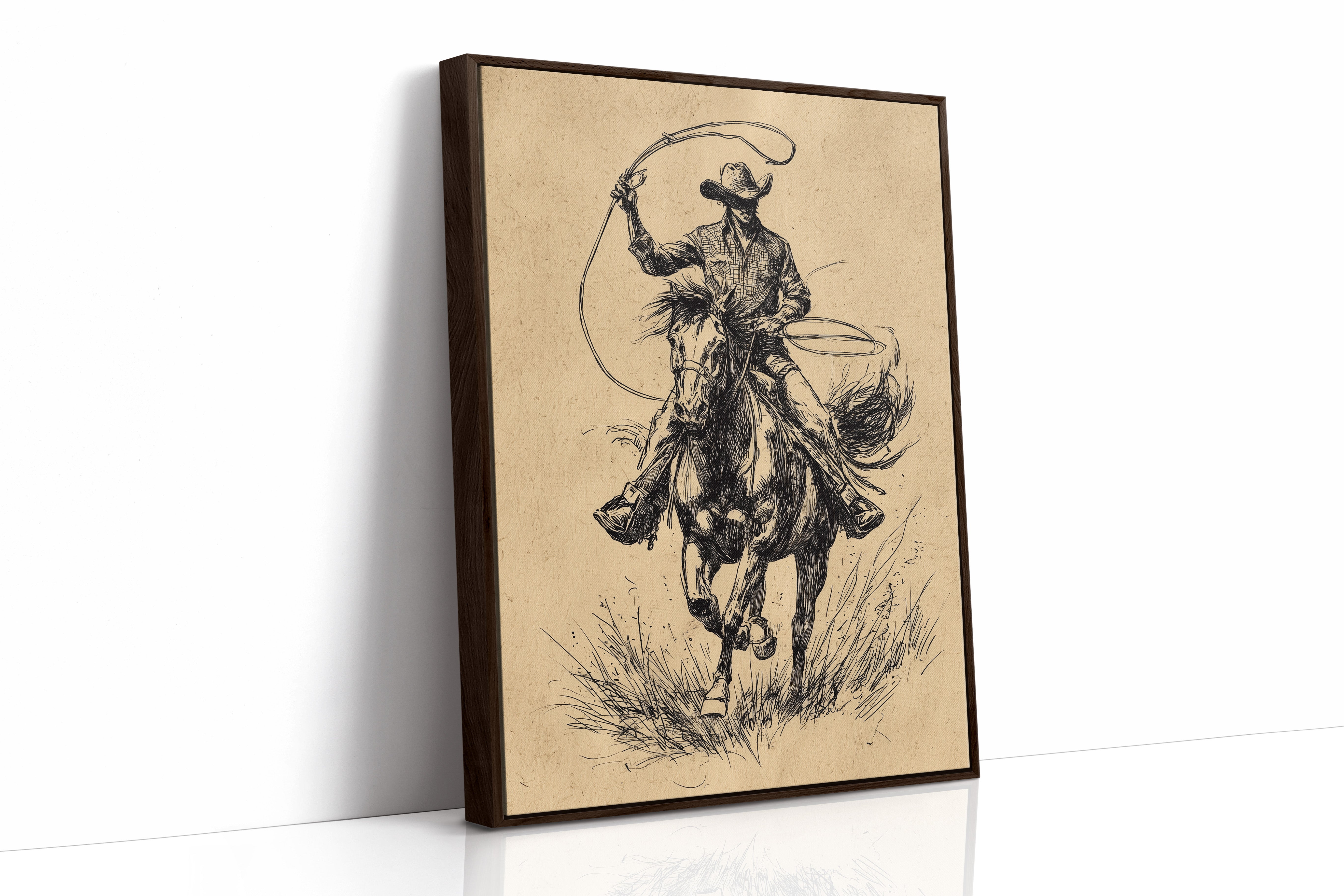 Hooves thunder across wild grass as time stands still in this dramatic sketch of raw power and grace. This piece captures the untamed spirit of the American West through bold, expressive linework. The dynamic composition draws us into a world where freedom rides on horseback - every stroke of ink capturing the intensity of the chase, from the rippling muscles of the galloping horse to the determined stance of the rider. The aged parchment tones and gestural black lines create a timeless quality that speaks to both heritage and artistry. Perfect for adding a touch of untamed elegance to a study, den, or any space celebrating the enduring romance of western culture.