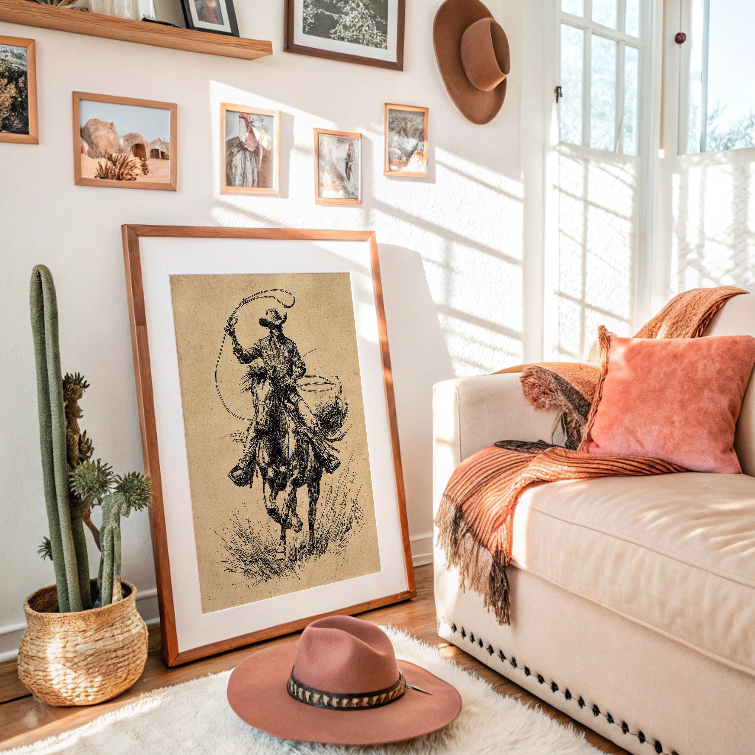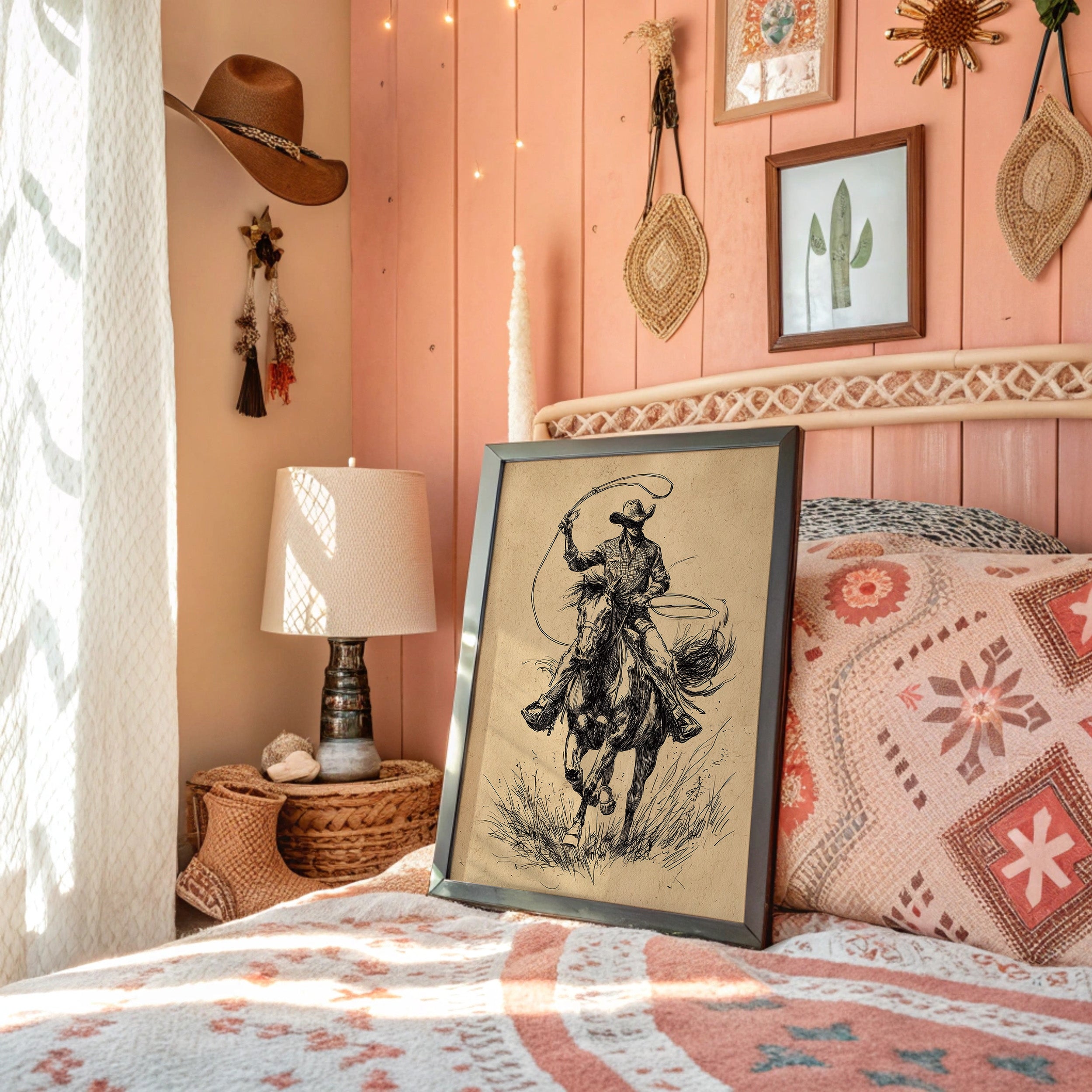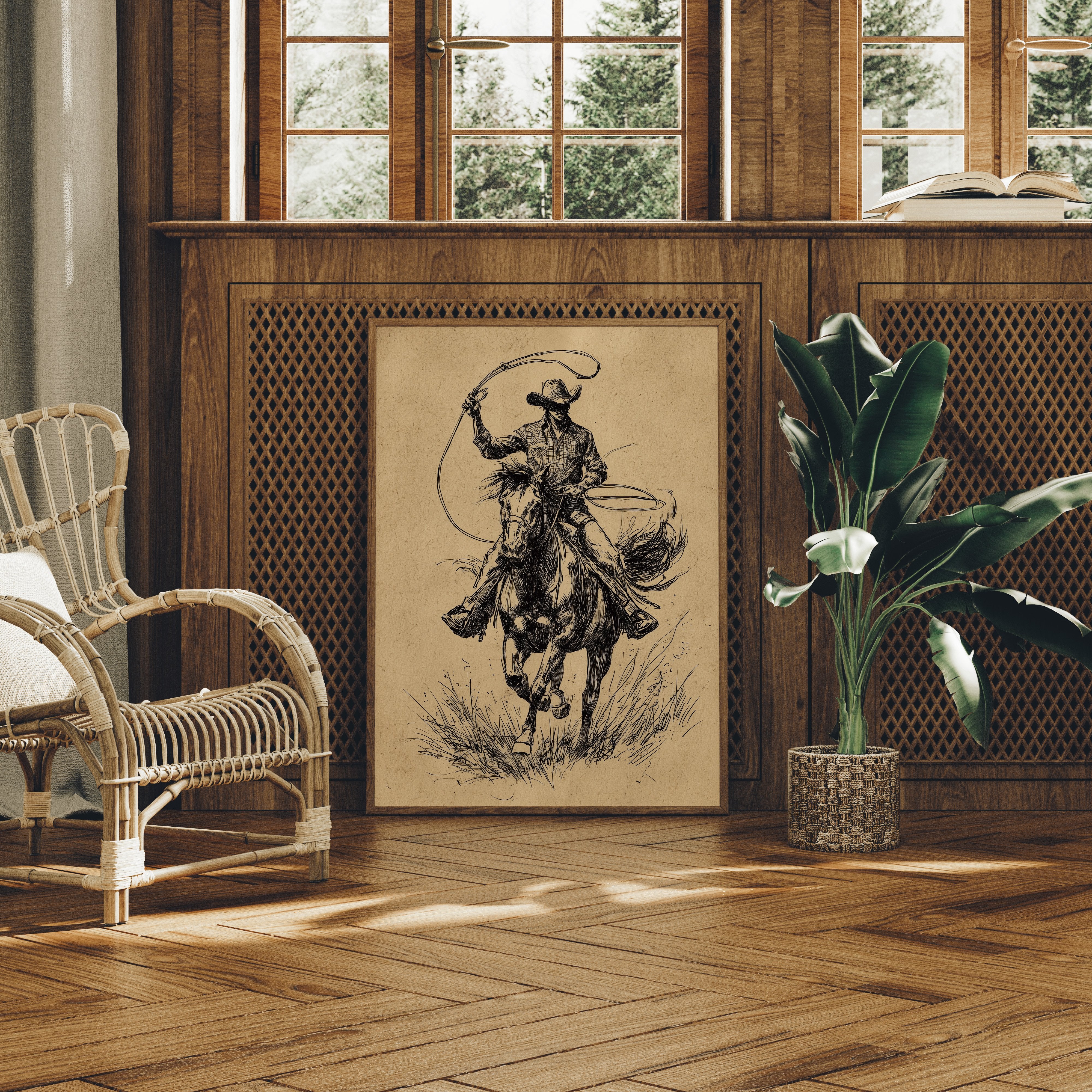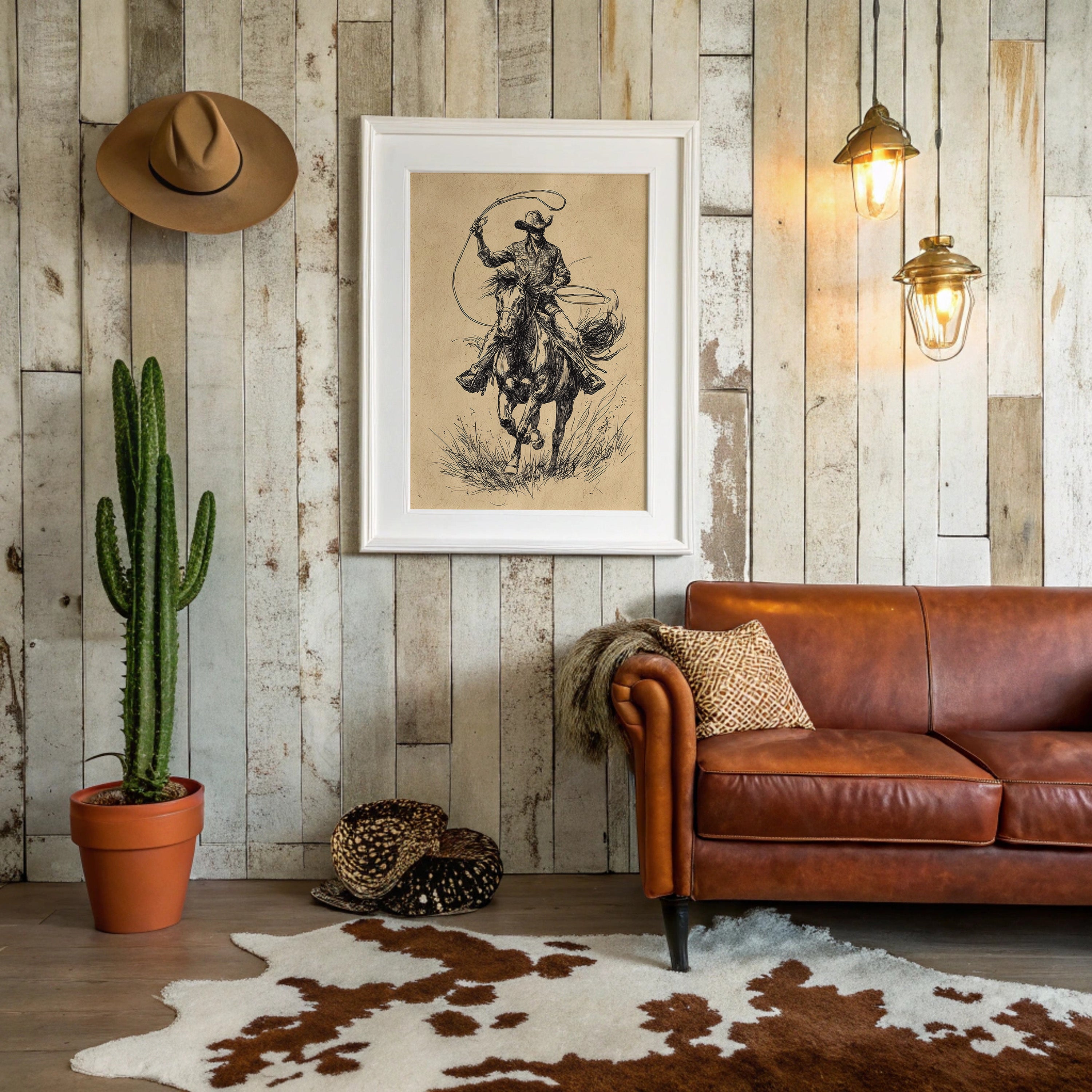 Hooves thunder across wild grass as time stands still in this dramatic sketch of raw power and grace. This piece captures the untamed spirit of the American West through bold, expressive linework. The dynamic composition draws us into a world where freedom rides on horseback - every stroke of ink capturing the intensity of the chase, from the rippling muscles of the galloping horse to the determined stance of the rider. The aged parchment tones and gestural black lines create a timeless quality that speaks to both heritage and artistry. Perfect for adding a touch of untamed elegance to a study, den, or any space celebrating the enduring romance of western culture.